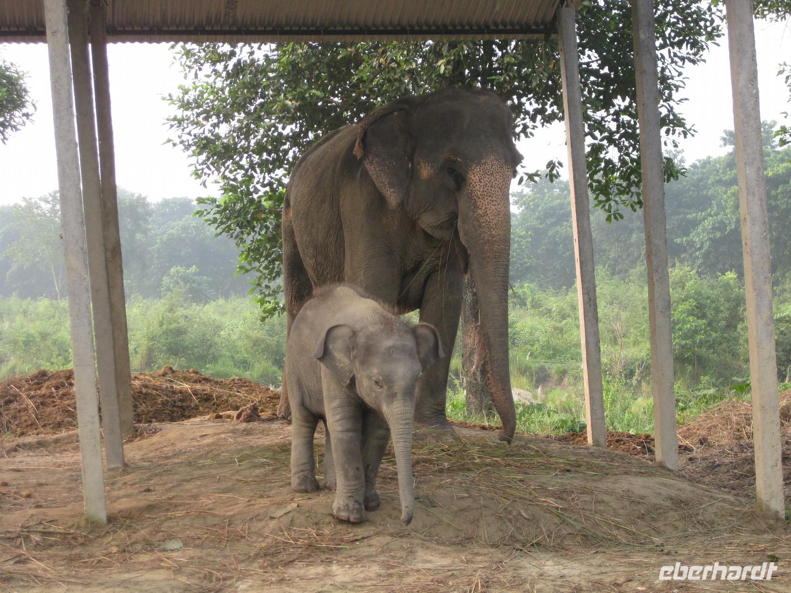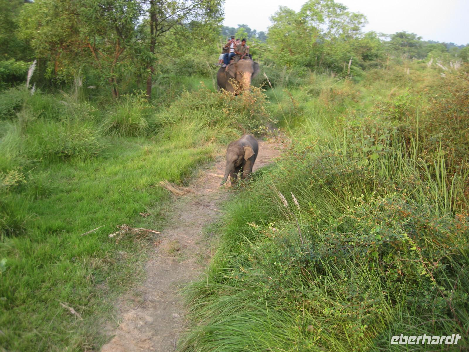 Um 16.00 Uhr treffen wir uns zu unserem Elefantenausritt durch den Dschungel. Die Elefanten mit ihren einheimischen Führern stehen bereit und freuen sich auf unseren Ausritt. Ein Elefantenbaby - 5 Monate - begleitet uns. Das ist sehr lustig. Über eine extra dafür gebaute Rampe besteigen wir die Rücken der Elefanten. Sie tragen eine Plattform aus Holz auf ihrem Rücken, auf der wir Platz nehmen. Und los geht unser Ausritt. Die Elefanten tragen uns durch hohes Gras und den Urwald. Es ist ein bisschen wie auf einem Schiff bei Wellengang. Ordentliche Fotos hinzubekommen ohne zu verwackeln ist ganz schön schwierig. Wir sehen Affen, verschiedene Vögel und Nashörner, davon eines mit einem Baby. Bei Einbruch der Dunkelheit sind wir wieder in der Lodge zurück - für alle ein tolles Erlebnis.