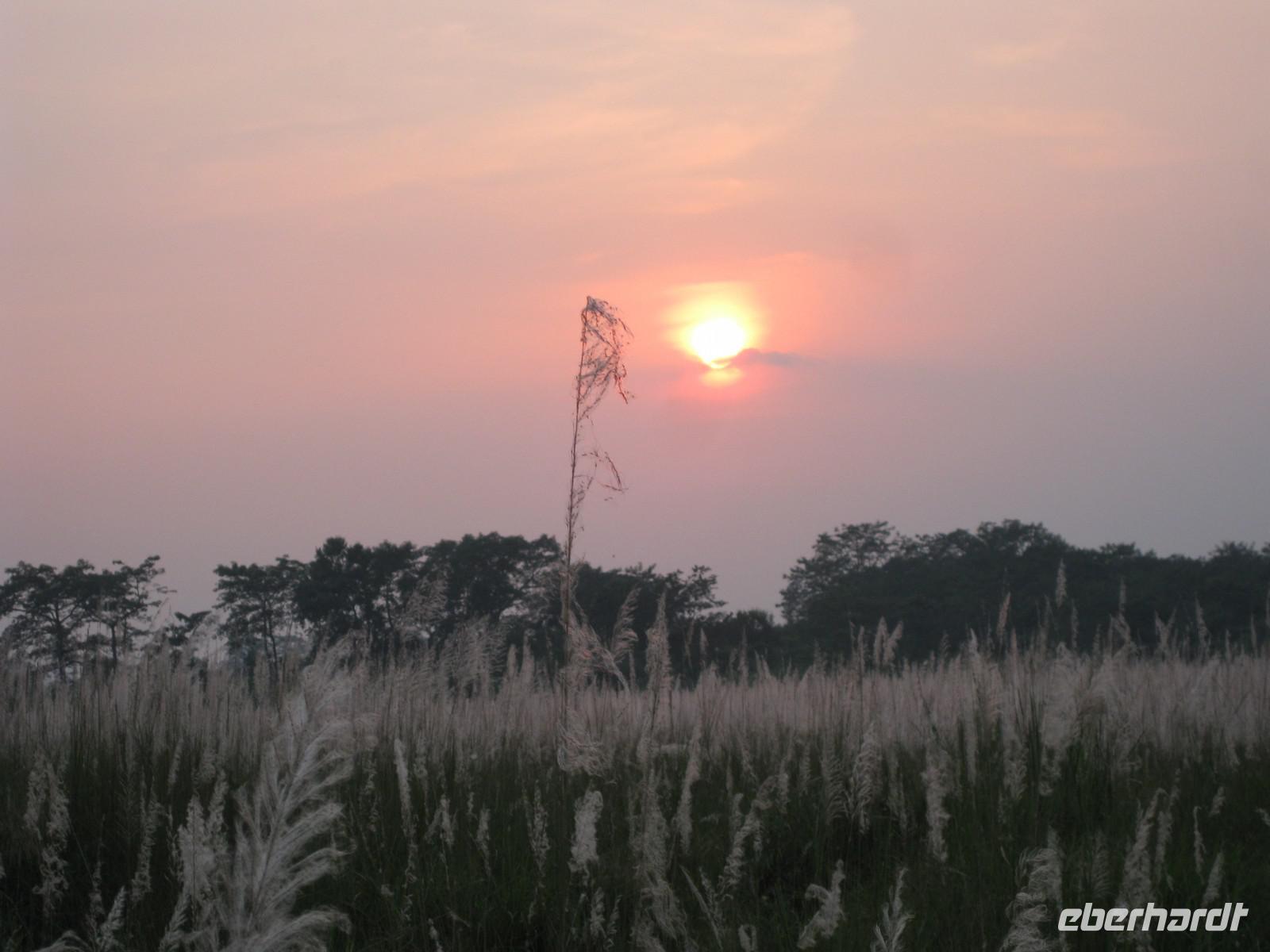 Am Nachmittag geht es zur Jeep-Safari in den Chitwan-Nationalpark. Wir besuchen eine Krokodilaufzuchtstation. Anschließend fahren wir durch den Urwald des Nationalparks. Wir sehen Rehe und ein Nashorn. Die anderen Tiere verstecken sich vor uns, denn wir kommen nicht gerade leise daher. Zum Abschluss der Safari fahren wir noch mit Booten auf dem Fluss. Wir können Vögel beobachten und sehen einen schönen Sonnenuntergang. Mit Einbruch der Dunkelheit sind wir in der Lodge zurück. Dort gibt es zum Abend noch eine Diashow über den Nationalpark.