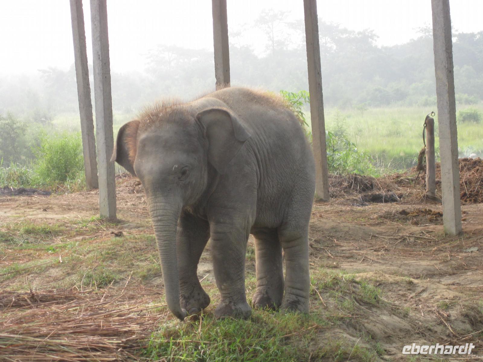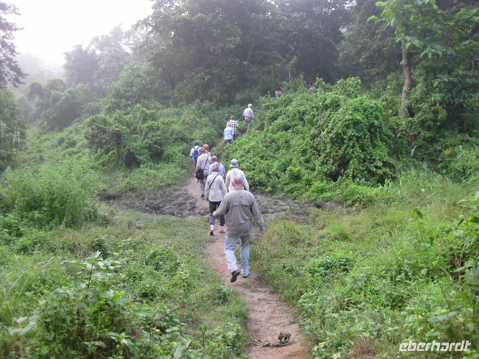 Heute starten wir schon 6.30 Uhr, denn wir wollen eine Dschungelwanderung machen. Die Führer erwarten uns schon. Wir laufen durch den Dschungel, sehen Pflanzen, die für Medizin verwendet werden und auch verschiedene Tierspuren, aber leider keine Tiere. Auf dem Rückweg zur Lodge kommen wir an der Elefantenstation vorbei. Das Elefantenbaby begrüßt uns. Wir laufen durch ein kleines Dorf und an Reisfeldern und Bananenplantagen vorbei. Das alles ist sehr interessant und gefällt uns gut. Gegen 8.00 Uhr sind wir wieder in der Lodge, pünktlich zum Frühstück zurück.