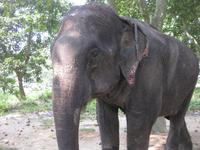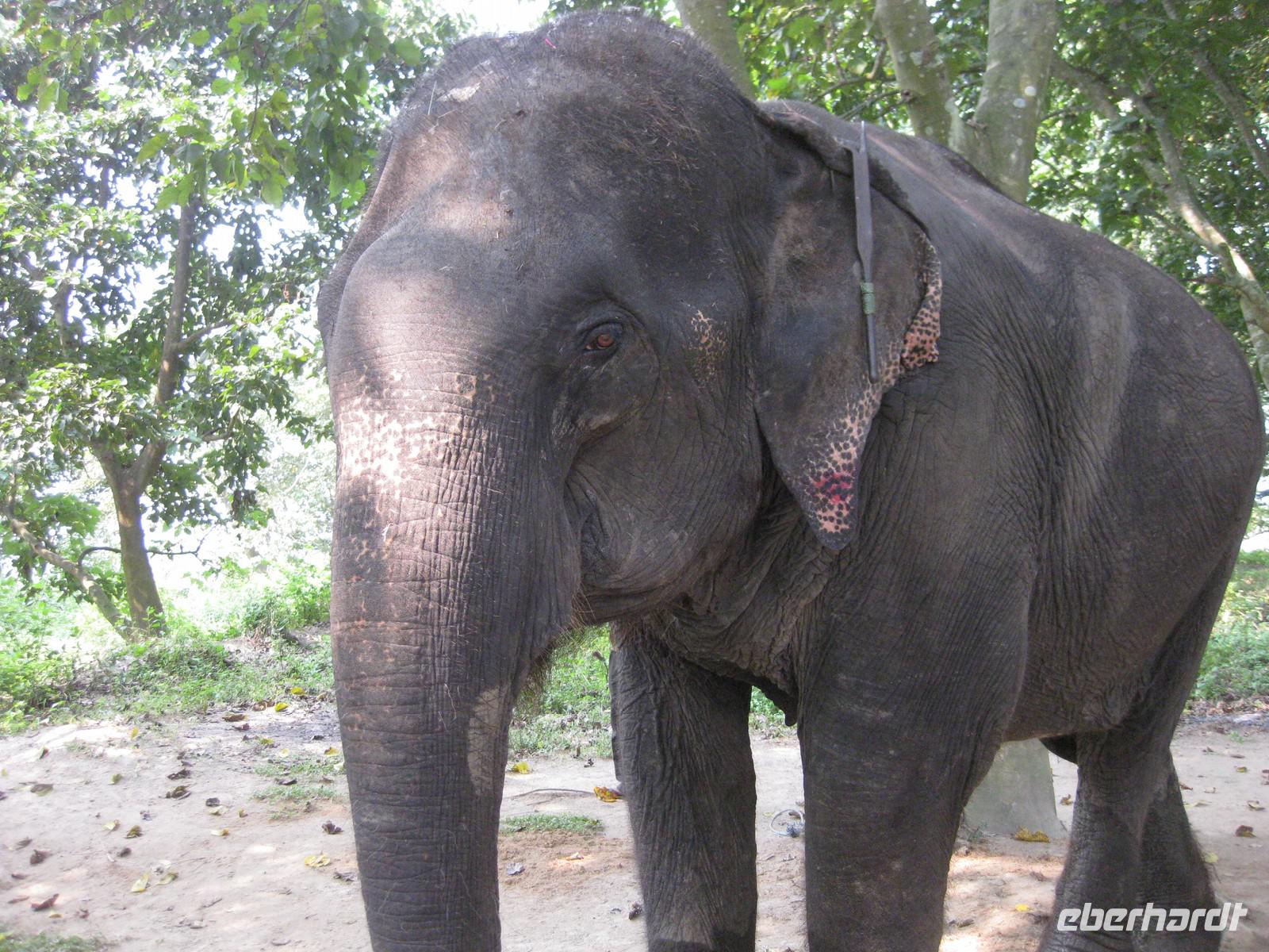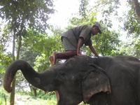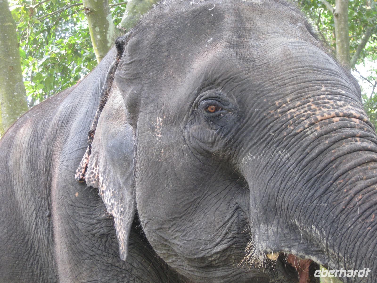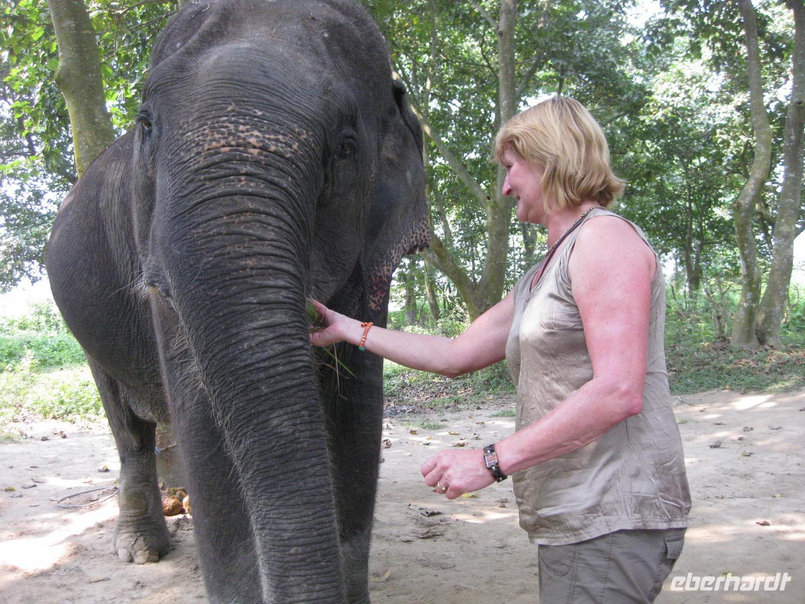 Am Vormittag besuchen wir die Elefanten noch einmal. An einem Platz im Schatten sind Bänke. Dort können wir uns hinsetzen. Ein Elefant ist mit dem Elefantenführer mit uns gekommen und wir bekommen wie in der Schule viel über die Elefanten erzählt und gezeigt. Jeder von uns darf dem Elefanten ein speziell vorbereitetes Leckerli füttern. Das ist für alle ein besonderes Erlebnis. Nach dem sehr anschaulichen „Unterricht" kommen die anderen Elefanten mit ihren Führern und auch das Baby dazu. Dann dürfen wir, wer möchte, auf die Elefanten steigen und auf ihnen reiten, diesmal nur auf dem Rücken ohne Sitzgestell. Wir anderen laufen zusammen zum Fluss wo die Elefanten gebadet werden. Wir können dabei helfen, müssen dazu aber mit in den Fluss steigen. Das ist ein besonderer Spaß. Dann geht es zurück. Wir verabschieden uns von den Elefanten.