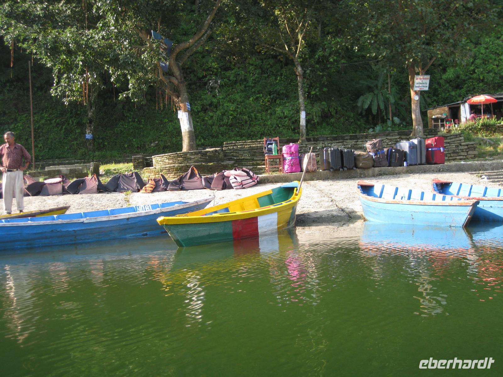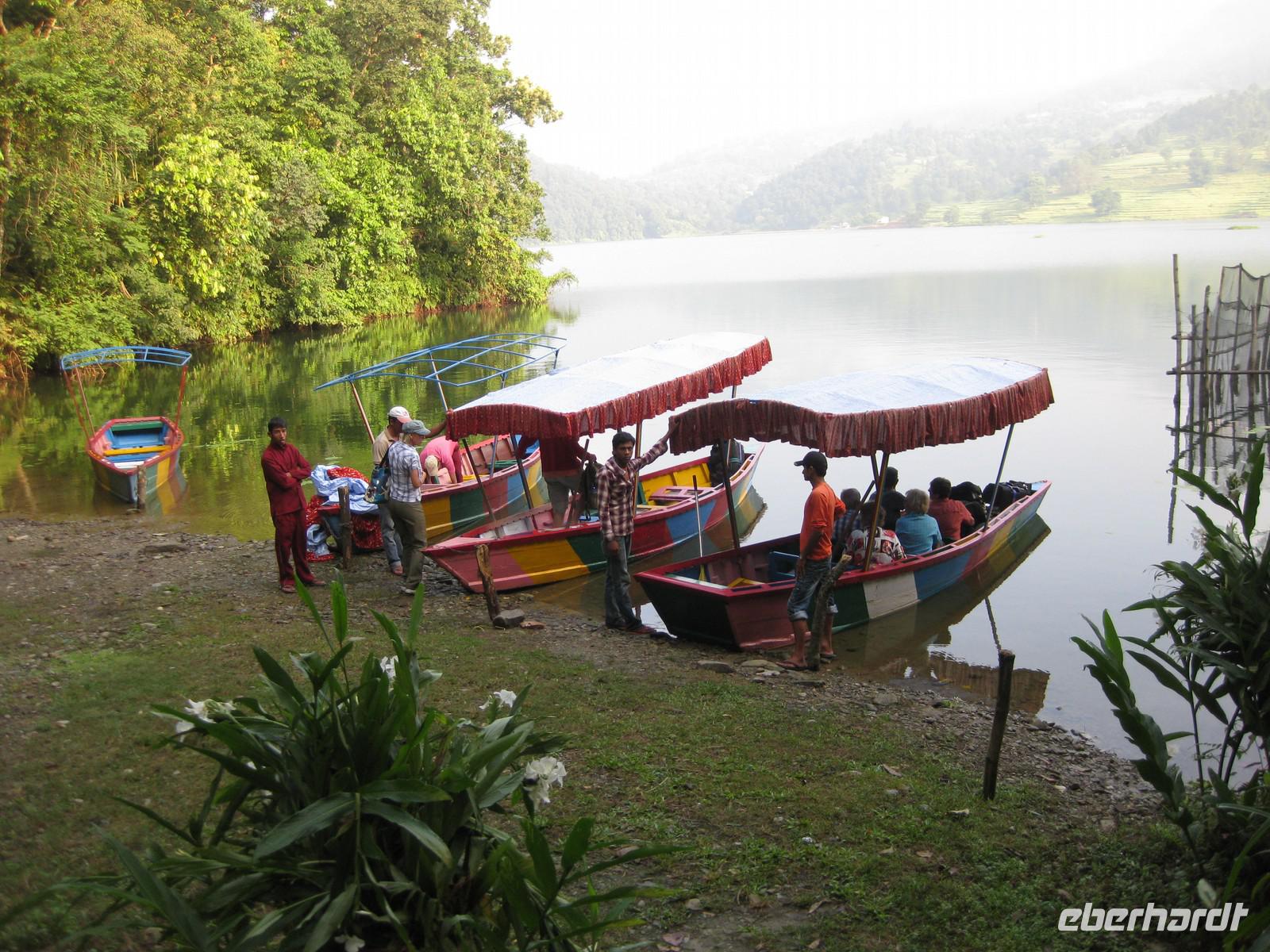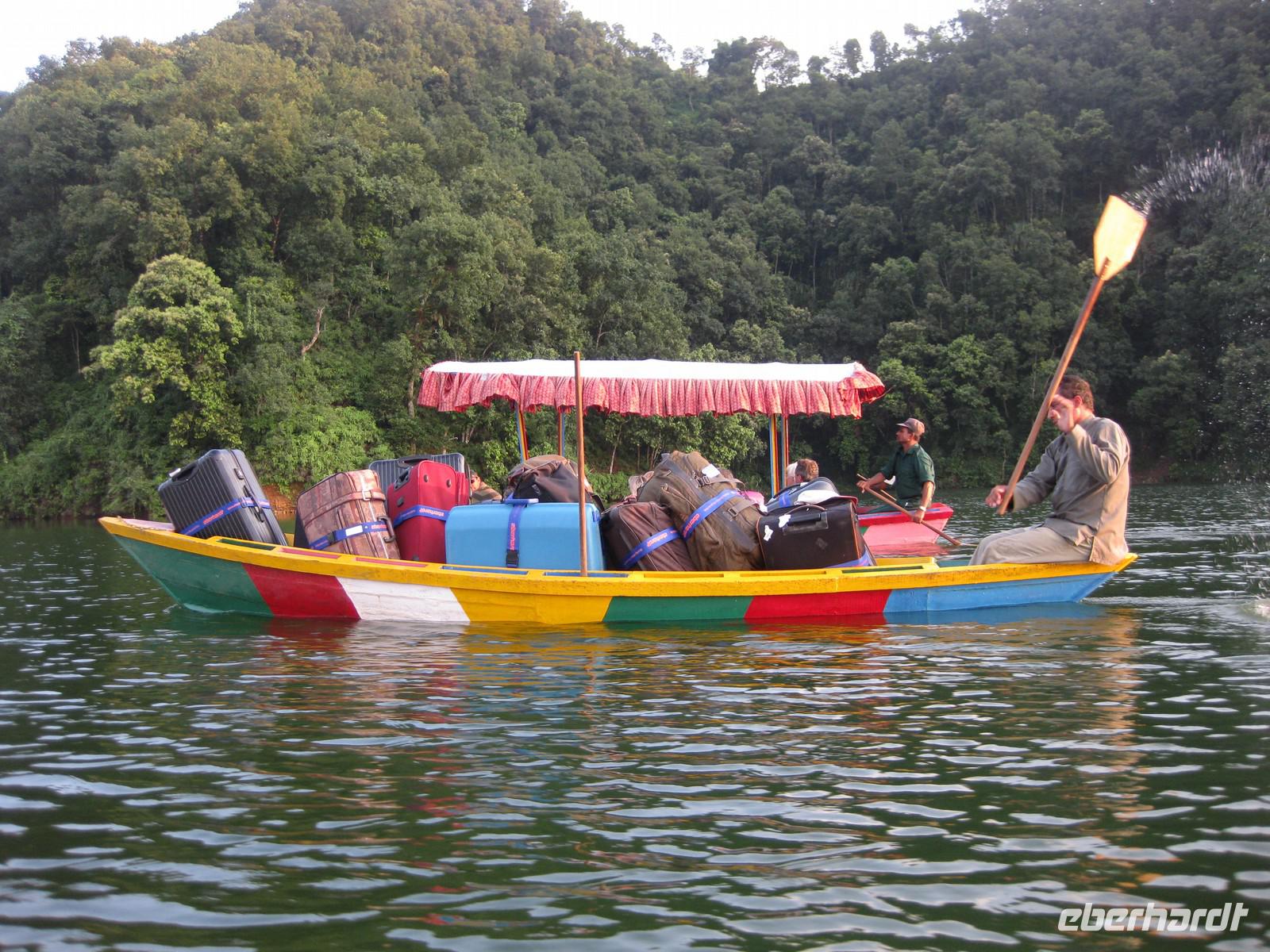 Dann fahren wir zum Begnas Lake. Hier haben wir noch ein kleines Abenteuer vor uns. Wir müssen mit dem Boot über den See fahren und unsere Koffer auch, sonst kommen wir nicht zu unserem Hotel. Erst einmal ist uns die ganze Sache nicht so geheuer. Aber dann sitzen wir in den Booten und werden von jeweils zwei Ruderern ganz sicher über den See zum Hotel gefahren. Die Koffer werden mit einem extra Boot in unserer Sichtweite ebenfalls zum Hotel gerudert. Alle kommen gut an. Wir werden sehr herzlich vom Hotel-Chef und seinem Personal empfangen und fühlen uns sofort wohl. Wir beziehen die Bungalows und haben anschließend ein tolles Abendessen mit frisch gegrilltem Fisch aus dem See.