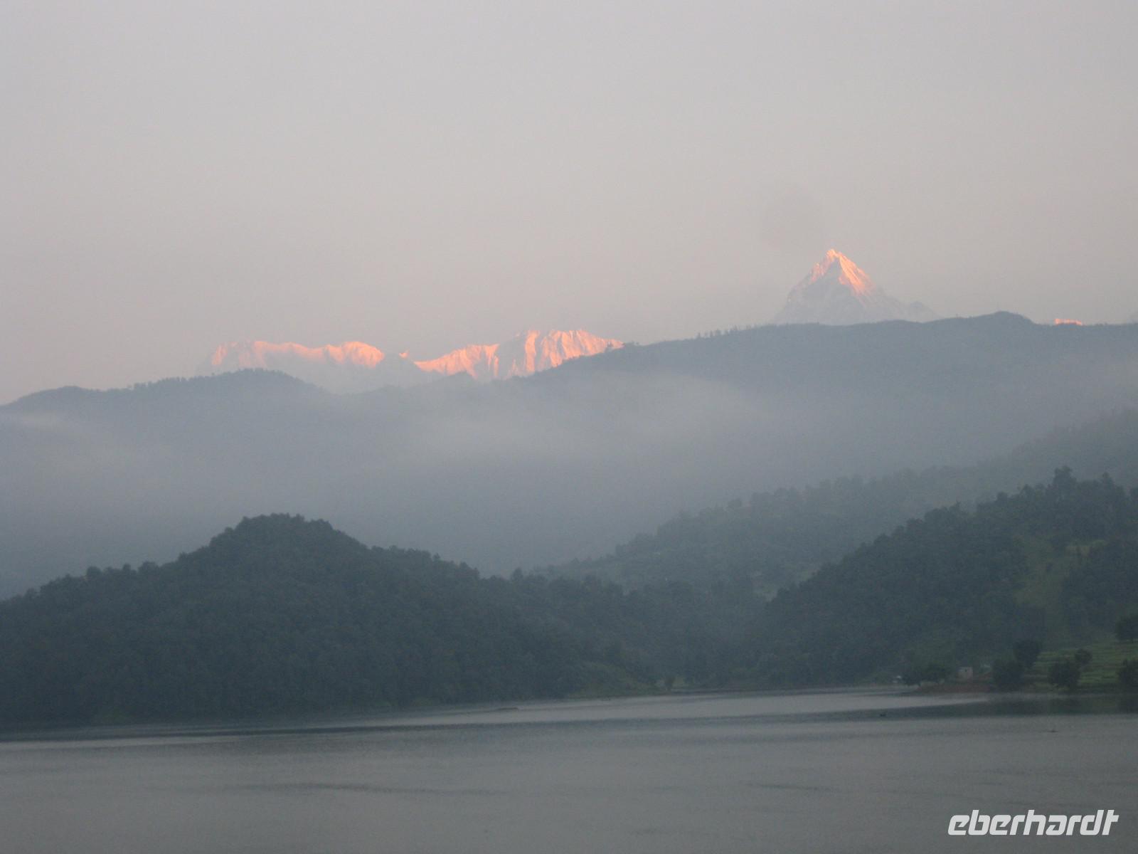 5.30 Uhr ist heute schon Aufstehen angesagt. Am Himmel sind keine Wolken zu sehen und so können wir den Sonnenaufgang beobachten, d.h. nicht den Sonnenaufgang direkt, sondern die Berge des Annapurnamassivs, wenn sie von der Sonne angestrahlt werden. Ein tolles Schauspiel. Frühstück ist wieder auf der Terrasse des Restaurants im Freien. Dann heißt es Abschied nehmen, denn wir müssen heute leider wieder zurück nach Kathmandu. Wir und unsere Koffer werden über den See gerudert. Wir steigen in unseren Bus und fahren die Strecke auf dem "Higway", die wir gekommen sind, wieder zurück. Um 16.30 Uhr erreichen wir am Nachmittag unsere Hotel "Tibet International" in Kathmandu.