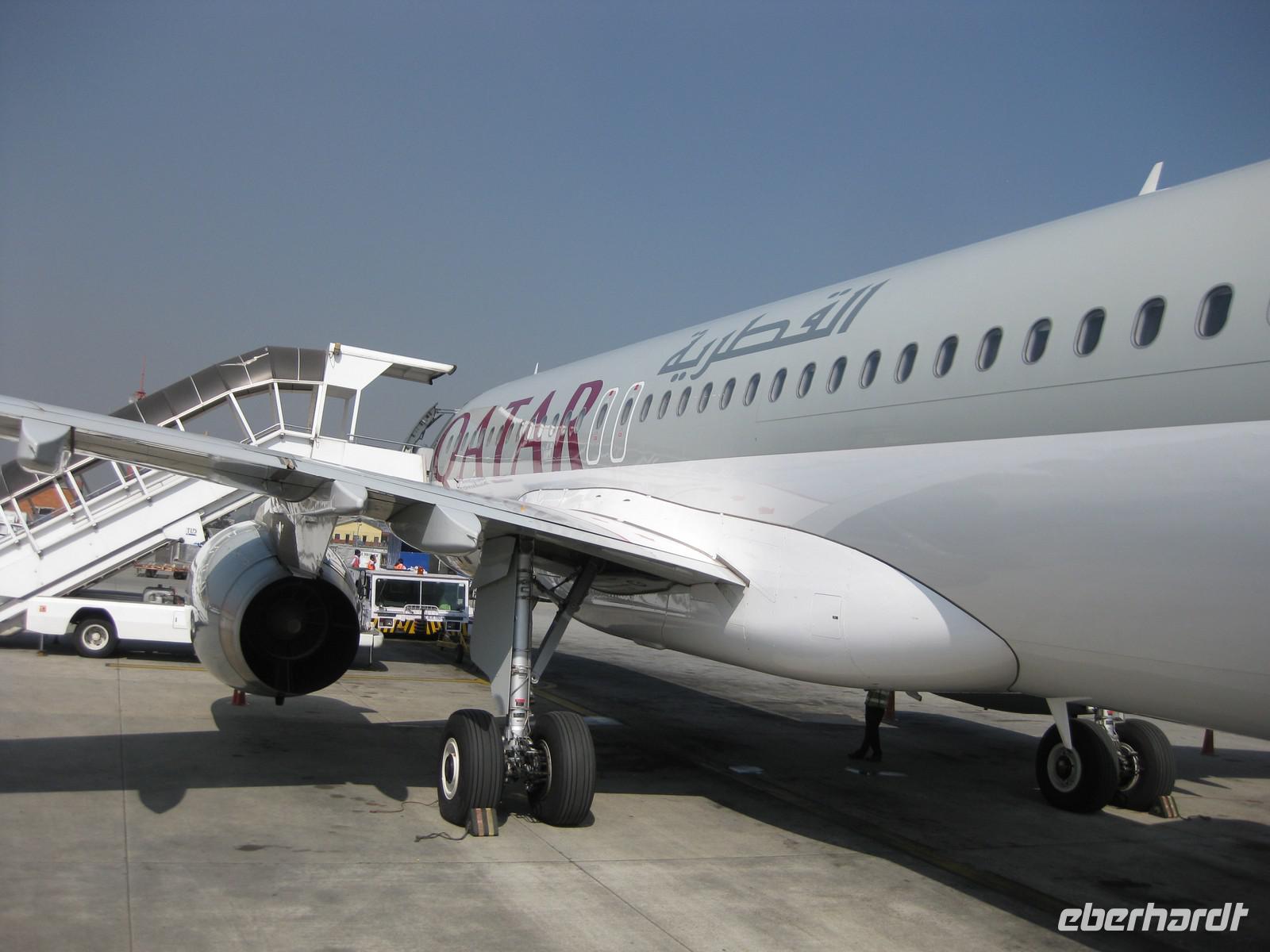 13.30 Uhr treffen wir uns auf dem Flughafen in Berlin-Tegel. Alle wurden von unseren zuverlässigen Haustürtransferen abgeholt und nach Berlin gebracht. Nach der Begrüßung begeben wir uns zum Abfluggate der Qatar-Airways und checken ein. Unser Gepäck wird bis Peking, unserem ersten Reiseziel, durch abgefertigt. Bevor wir dann einsteigen nehmen wir noch einen kleinen Snack im Restaurant „Leyseiffer" ein. Danach passieren wir die Sicherheitskontrolle und steigen in unseren Flieger. 16.05 Uhr starten wir.