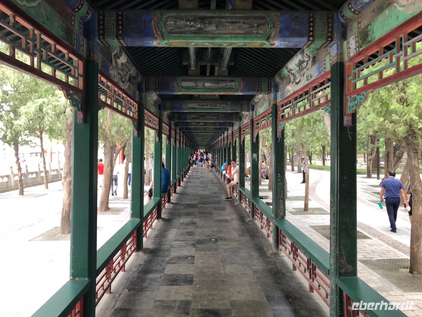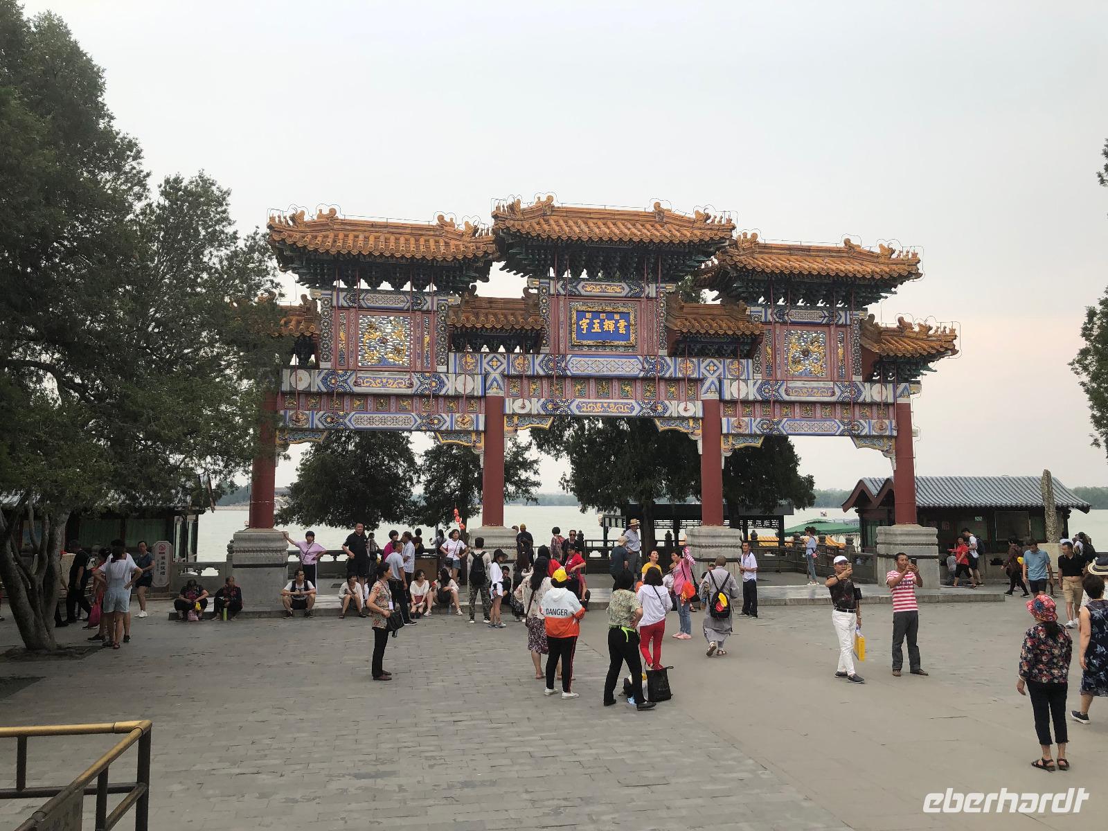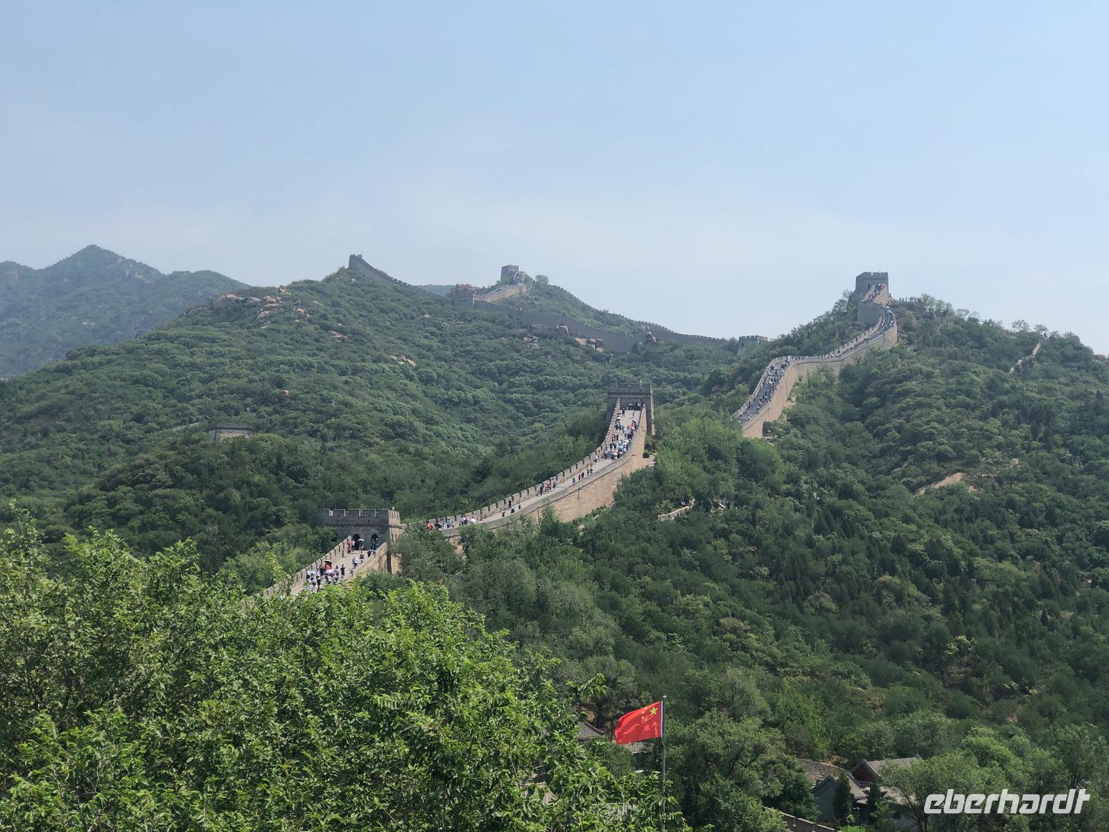 Der heutige Tag führte uns in nordwestliche Richtung aus Peking hinaus. Unser Ziel war ein restauriertes Teilstück der Großen Mauer bei Badaling, etwa 75 Kilometer von unserem Hotel entfernt. Dabei passierten wir die prosperierenden Vorstädte der Metropole Peking und sahen die vielfältigen Bautätigkeiten, welche in Zusammenhang mit der Winterolympiade 2022 standen. Reichlich anderthalb Stunden später erreichten wir den touristisch aufgearbeiteten Abschnitt der Chinesischen Mauer bei Badaling. Es gehört zu einem Teilstück von knapp 600 Kilometer Länge, welches sich in einem guten bis sehr guten Zustand befindet. Über die Gesamtlänge gibt es immer wieder neue Erkenntnisse, aus einstmals 2.500 Kilometern sind neuesten Forschungen zu Folge über 21.000 Kilometer geworden. Je nach Betrachtungswinkel und Einbeziehung natürlicher Barrieren sowie geschichtlicher Epochen. Das Teilstück, was wir besichtigten, gab uns eine gute Vorstellung davon, wie das System aus Mauern, Wachtürmen und Signalfeuern im Altertum vor kriegerischen Überfällen schützen konnte. Trotz der recht hohen Temperaturen, die heute herrschten, erklommen wir die sich den Bergkamm entlang schlängelnde, unendlich scheinende Mauer und wanderten auf ihr ein großes Stück zu Fuß entlang. Es war ein beeindruckendes Erlebnis und ein Zeugnis großen menschlichen Willens, etwas Derartiges in über zweitausendjähriger Bauzeit in die Landschaft zu setzen. Nach dem Mittag begann unsere Rückfahrt nach Peking, wir wollten als nächstes den kaiserlichen Sommerpalast besichtigen. Die sich auf 290 Hektar erstreckenden Palastanlagen, welche mehrfach zerstört und wiederaufgebaut wurden, waren einst ein Geschenk des Kaiser Qianlong an seine Mutter. Spätere Kaisergenerationen haben sich insbesondere in den schwül-heißen Sommermonaten in das Anwesen am Kunming-See zurückgezogen, welches seit 1998 Weltkulturerbe ist und darüber hinaus ein Kleinod chinesischer Architektur und Gartenbaukunst. Wir spazierten vom Osttor am Ufer des Kunming-Sees entlang, besichtigten den über 700 Meter langen Wandelgang und das Mamorboot, bevor wir den Sommerpalast wieder verließen. Letztes Ziel des heutigen Tages war der Olympische Park von 2008, mit dem berühmten „Vogelnest" (Olympiastadion), der olympischen Schwimmhalle und den ersten Neubauten für die Spiele 2022. Nach einem stärkenden Abendessen erreichten wir wieder unser Hotel und ließen den Abend gemütlich ausklingen.