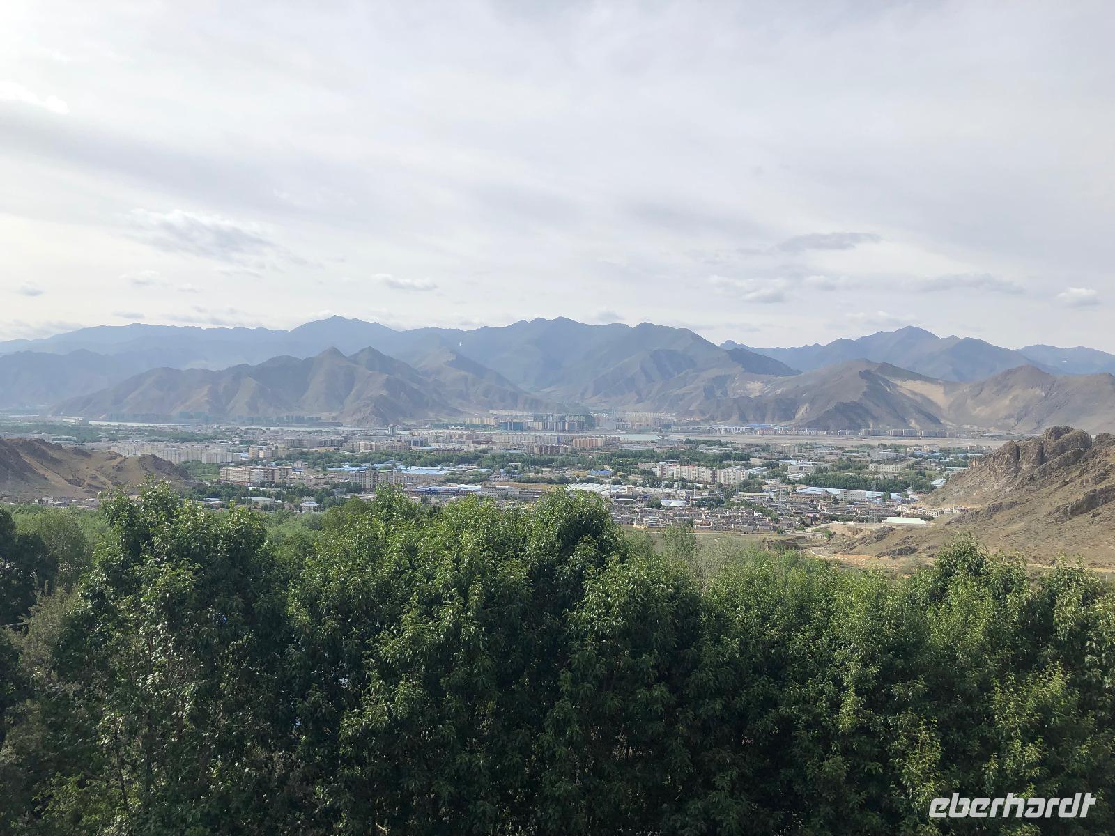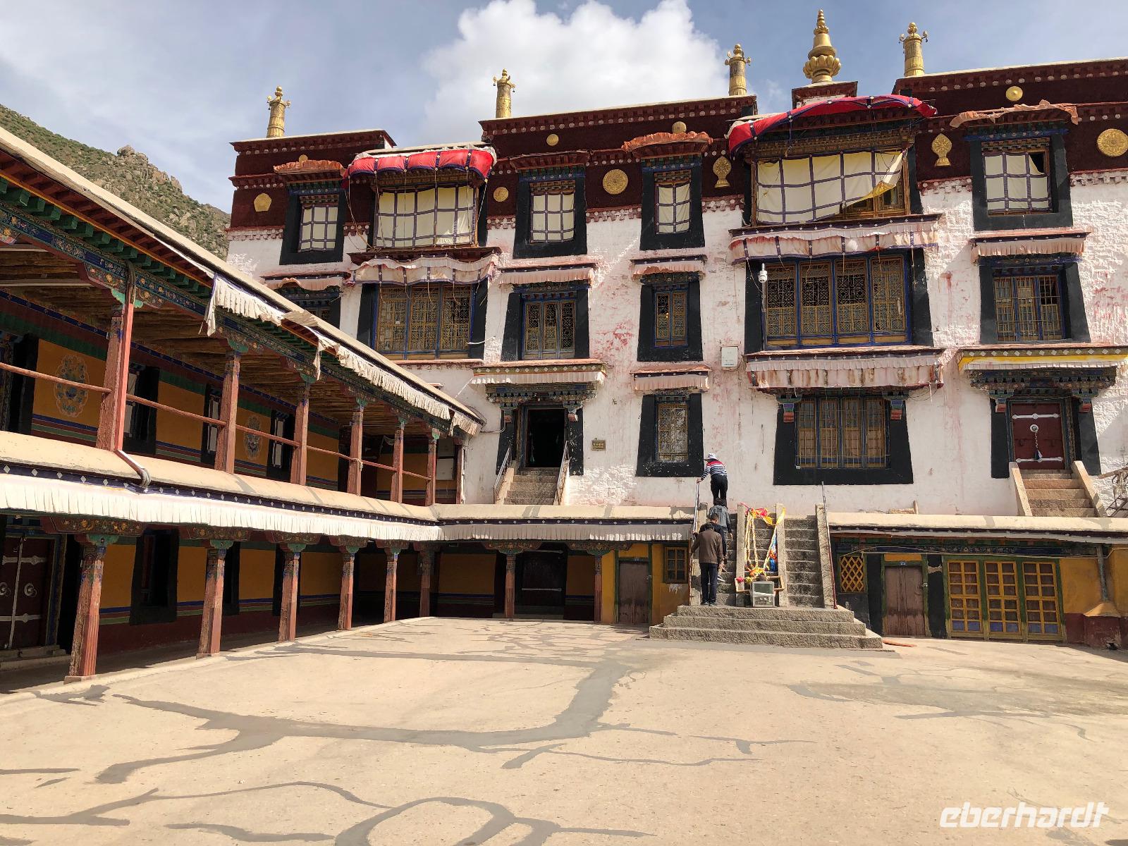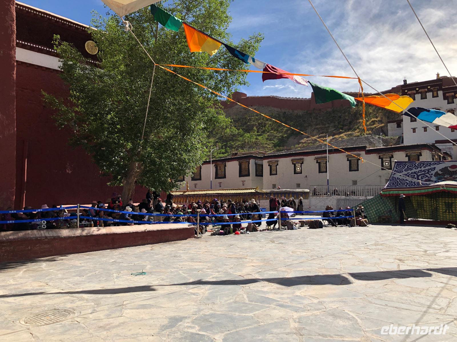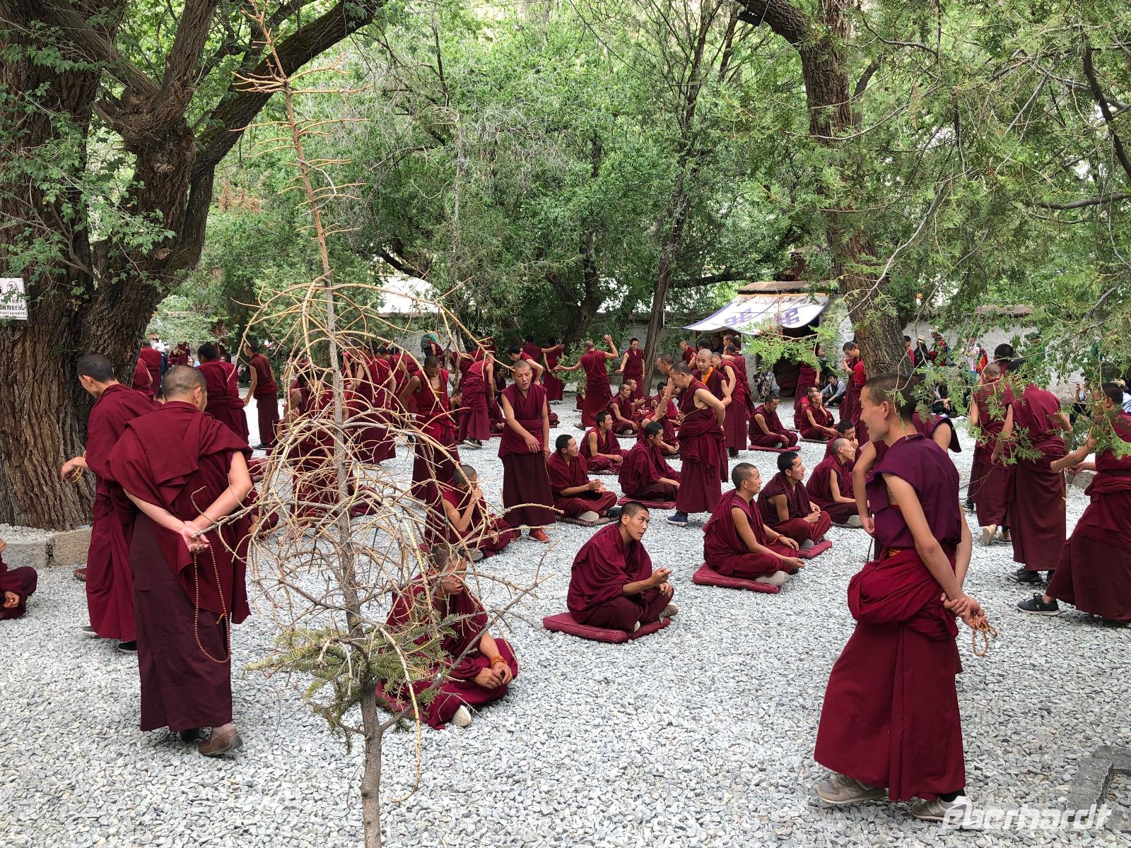 Der heutige Tag stand ganz im Zeichen einiger der berühmtesten buddhistischen Klöster Tibets. Das etwa zehn Kilometer westlich von Lhasa gelegen Kloster Drepung war unsere erste Station an diesem Tag. 1416 gegründet und lange Zeit Sitz des Dalai Lama, bevor dieser in den Potala-Palast zog, hatte es immer eine bedeutende Rolle in der tibetischen Geschichte gespielt. Dabei standen die Drepung-Mönche nicht immer auf Seiten der Tibetischen Regierung, es gab immer wieder Auflehnung gegen die Politik des Dalai Lama. Von den 10.000 Mönchen, die das Kloster einst beherbergte, sind heute nur noch etwa 450 übriggeblieben. Wir erkundeten die weitläufigen Klosteranlagen und ließen uns von „Alex" die religiöse Bedeutung der Statuen, Bilder und Reliquien ausführlich erklären. Auch wenn wir nur einen Bruchteil der Namen, Zahlen und Titel im Gedächtnis behalten konnten, ergab das Gesamtbild einen guten Einblick in die Bedeutung des Klosters. Im angrenzenden Restaurant ließen wir uns tibetische Momos, mit Gemüse gefüllte Teigtaschen, schmecken. Freundliche Tibeter am Nachbartisch hatten sie spendiert. Nach der Mittagspause besuchten wir das nahegelegene Kloster Nechung, welches bis 1959 das Orakel beherbergte, welches in wichtigen Staatsangelegenheiten vom Dalai Lama konsultiert wurde. Den Abschluss unserer Klostertour bildete das Sera-Kloster, welches nur ein paar Kilometer außerhalb Lhasa beheimatet ist. Nach wechselvoller Geschichte, mit teilweise kriegerischen Auseinandersetzungen, wurde das Kloster seit den Achtziger Jahren des letzten Jahrhunderts schrittweise wieder restauriert. Seine ehemalige Bedeutung als Sitz philosophischer Fakultäten erlangte es allerdings nie wieder, auch wenn man heute den jungen Mönchen beim täglichen Debattieren im Klosterhof zuschauen kann. Wer um 15 Uhr vor Ort ist, kann dem Spektakel beiwohnen. Nach einem kurzen Zwischenstopp in unserem Hotel spazierten wir zum Abendessen in die Altstadt. Das Lokal bot uns eine Mischung aus europäischer, tibetischer und nepalesischer Kost, was zu einem bunten Potpourri an Speisen führte. Der anschließende Bummel durch die Altstadt führte uns zu guter Letzt in die Nähe des Potala-Palastes. Da die Dunkelheit bald hereinbrach und wir uns das Schauspiel des illuminierten Palastes nicht entgehen lassen wollten, blieben wir vor Ort. Mit vielen hundert Schaulustigen und Familienausflüglern genossen wir die musikalisch untermalten Wasserspiele auf dem Platz vor dem Palast. Als dann die Lichter an der Außenfassade des Palastes endlich angingen, machte sich eine friedvolle Atmosphäre breit, der sich kaum ein Zuschauer entziehen konnte. Nach etlichen geschossenen Fotos und gedrehten Videos beendeten wir unser abendliches Intermezzo und gelangten mit den allseits verfügbaren Rikschas zum Hotel zurück. In der hell erleuchteten Beijing-Road flanierten die Tibeter und ihre Gäste, genossen den lauen Sommerabend und gaben sich der Wochenend-Zerstreuung hin.