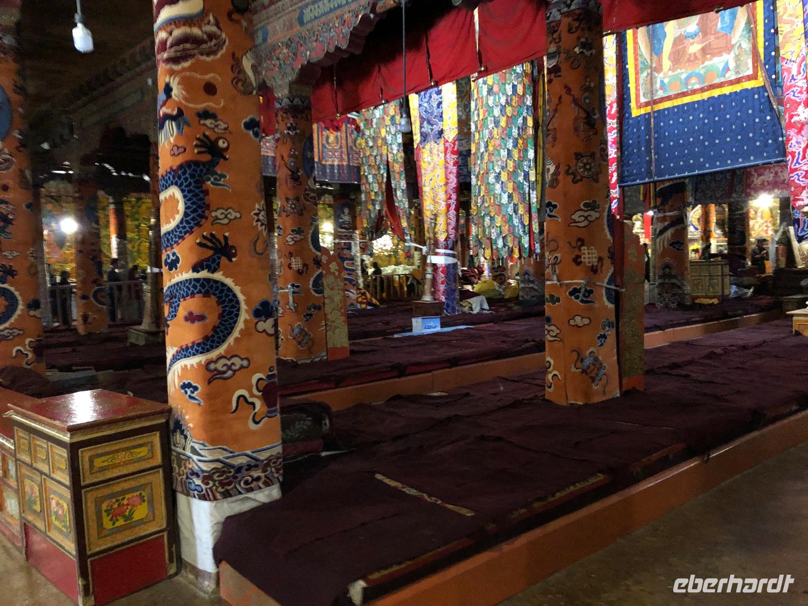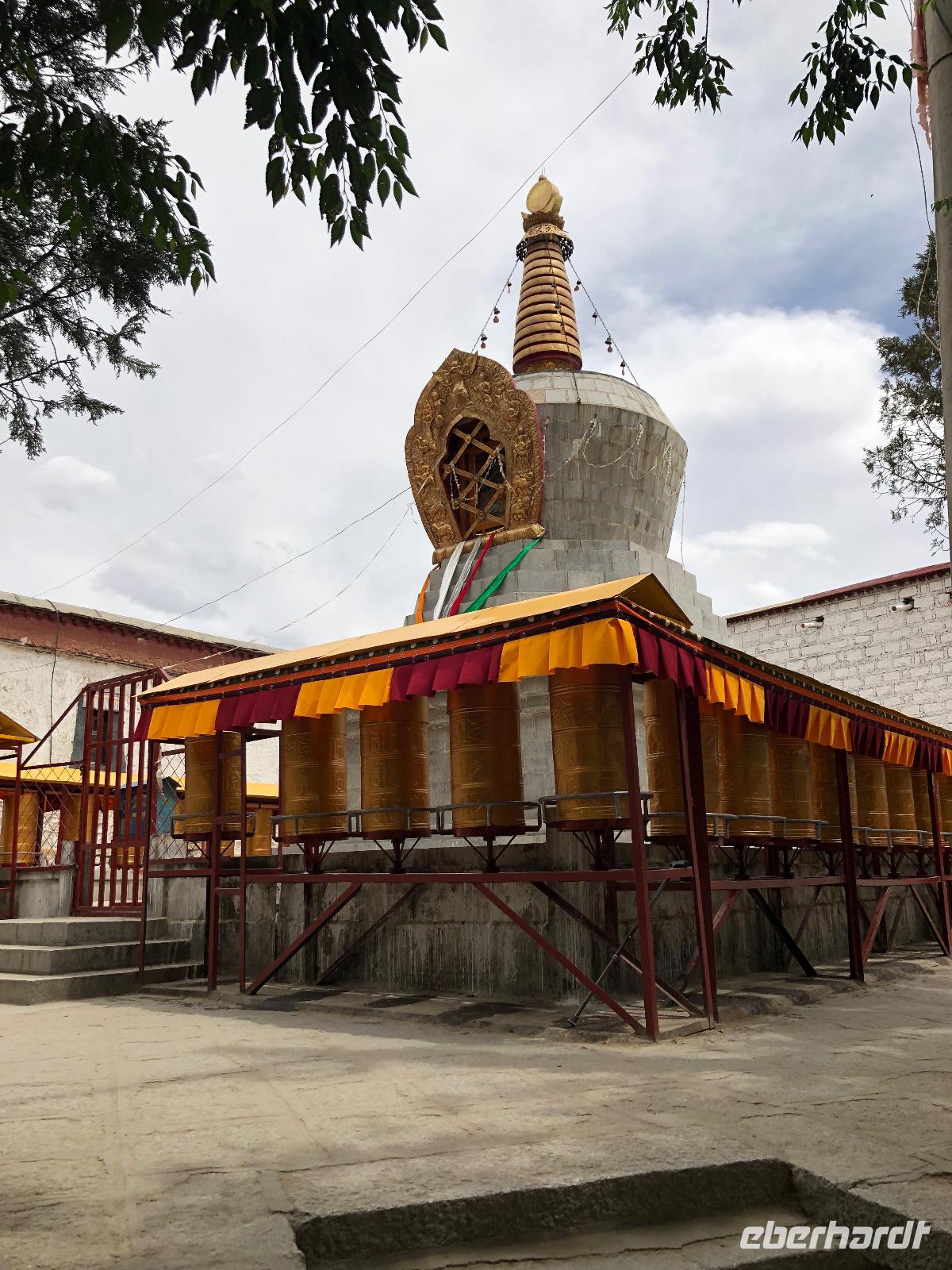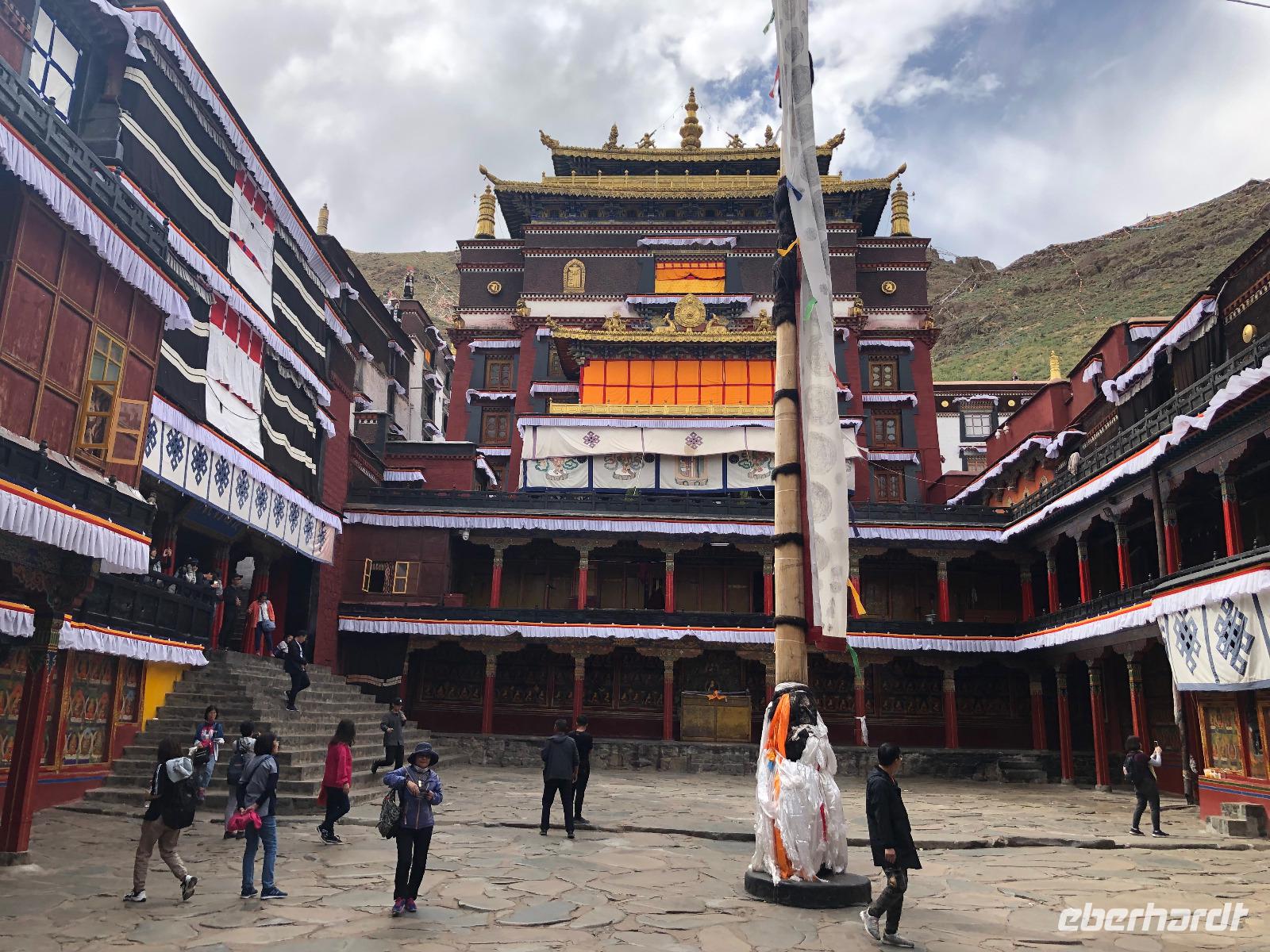 Der heutige Tag stand ganz im Zeichen einiger der berühmtesten buddhistischen Klöster Tibets. Das etwa zehn Kilometer westlich von Lhasa gelegen Kloster Drepung war unsere erste Station an diesem Tag. 1416 gegründet und lange Zeit Sitz des Dalai Lama, bevor dieser in den Potala-Palast zog, hatte es immer eine bedeutende Rolle in der tibetischen Geschichte gespielt. Dabei standen die Drepung-Mönche nicht immer auf Seiten der Tibetischen Regierung, es gab immer wieder Auflehnung gegen die Politik des Dalai Lama. Von den 10.000 Mönchen, die das Kloster einst beherbergte, sind heute nur noch etwa 450 übriggeblieben. Wir erkundeten die weitläufigen Klosteranlagen und ließen uns von „Alex" die religiöse Bedeutung der Statuen, Bilder und Reliquien ausführlich erklären. Auch wenn wir nur einen Bruchteil der Namen, Zahlen und Titel im Gedächtnis behalten konnten, ergab das Gesamtbild einen guten Einblick in die Bedeutung des Klosters. Im angrenzenden Restaurant ließen wir uns tibetische Momos, mit Gemüse gefüllte Teigtaschen, schmecken. Freundliche Tibeter am Nachbartisch hatten sie spendiert. Nach der Mittagspause besuchten wir das nahegelegene Kloster Nechung, welches bis 1959 das Orakel beherbergte, welches in wichtigen Staatsangelegenheiten vom Dalai Lama konsultiert wurde. Den Abschluss unserer Klostertour bildete das Sera-Kloster, welches nur ein paar Kilometer außerhalb Lhasa beheimatet ist. Nach wechselvoller Geschichte, mit teilweise kriegerischen Auseinandersetzungen, wurde das Kloster seit den Achtziger Jahren des letzten Jahrhunderts schrittweise wieder restauriert. Seine ehemalige Bedeutung als Sitz philosophischer Fakultäten erlangte es allerdings nie wieder, auch wenn man heute den jungen Mönchen beim täglichen Debattieren im Klosterhof zuschauen kann. Wer um 15 Uhr vor Ort ist, kann dem Spektakel beiwohnen. Nach einem kurzen Zwischenstopp in unserem Hotel spazierten wir zum Abendessen in die Altstadt. Das Lokal bot uns eine Mischung aus europäischer, tibetischer und nepalesischer Kost, was zu einem bunten Potpourri an Speisen führte. Der anschließende Bummel durch die Altstadt führte uns zu guter Letzt in die Nähe des Potala-Palastes. Da die Dunkelheit bald hereinbrach und wir uns das Schauspiel des illuminierten Palastes nicht entgehen lassen wollten, blieben wir vor Ort. Mit vielen hundert Schaulustigen und Familienausflüglern genossen wir die musikalisch untermalten Wasserspiele auf dem Platz vor dem Palast. Als dann die Lichter an der Außenfassade des Palastes endlich angingen, machte sich eine friedvolle Atmosphäre breit, der sich kaum ein Zuschauer entziehen konnte. Nach etlichen geschossenen Fotos und gedrehten Videos beendeten wir unser abendliches Intermezzo und gelangten mit den allseits verfügbaren Rikschas zum Hotel zurück. In der hell erleuchteten Beijing-Road flanierten die Tibeter und ihre Gäste, genossen den lauen Sommerabend und gaben sich der Wochenend-Zerstreuung hin.