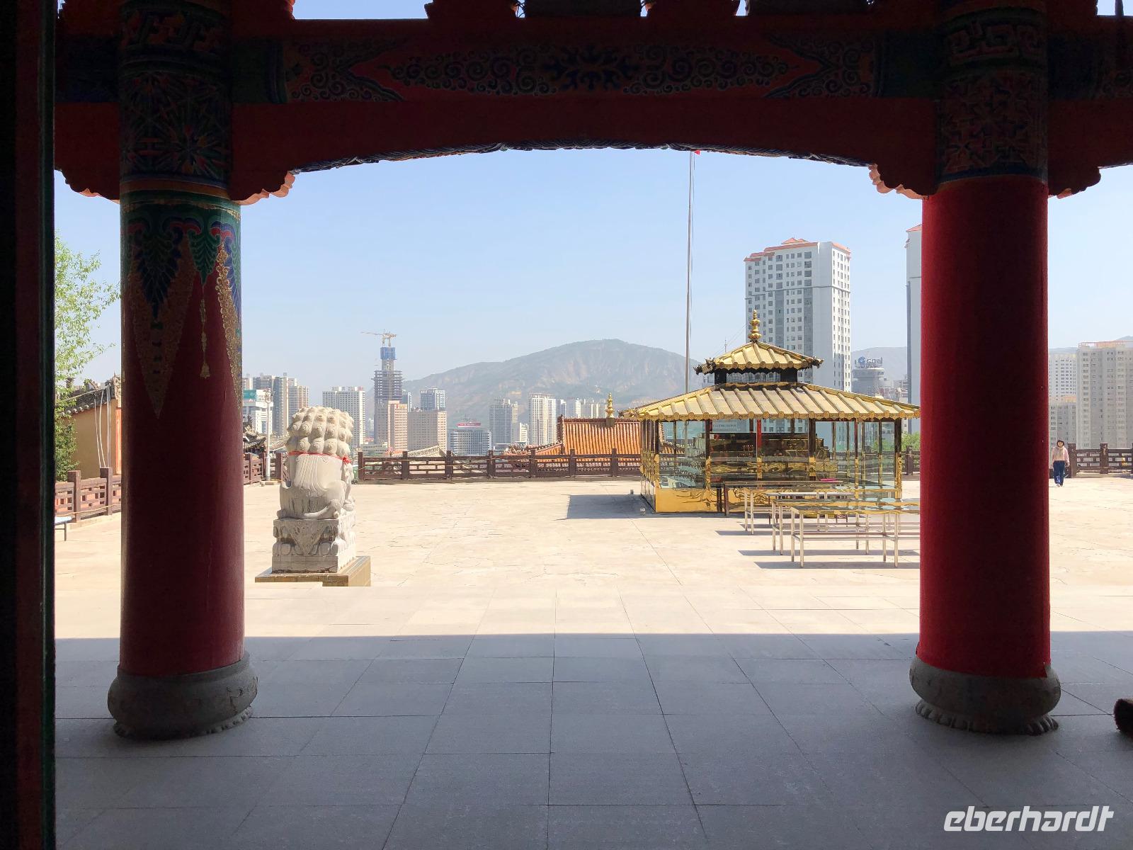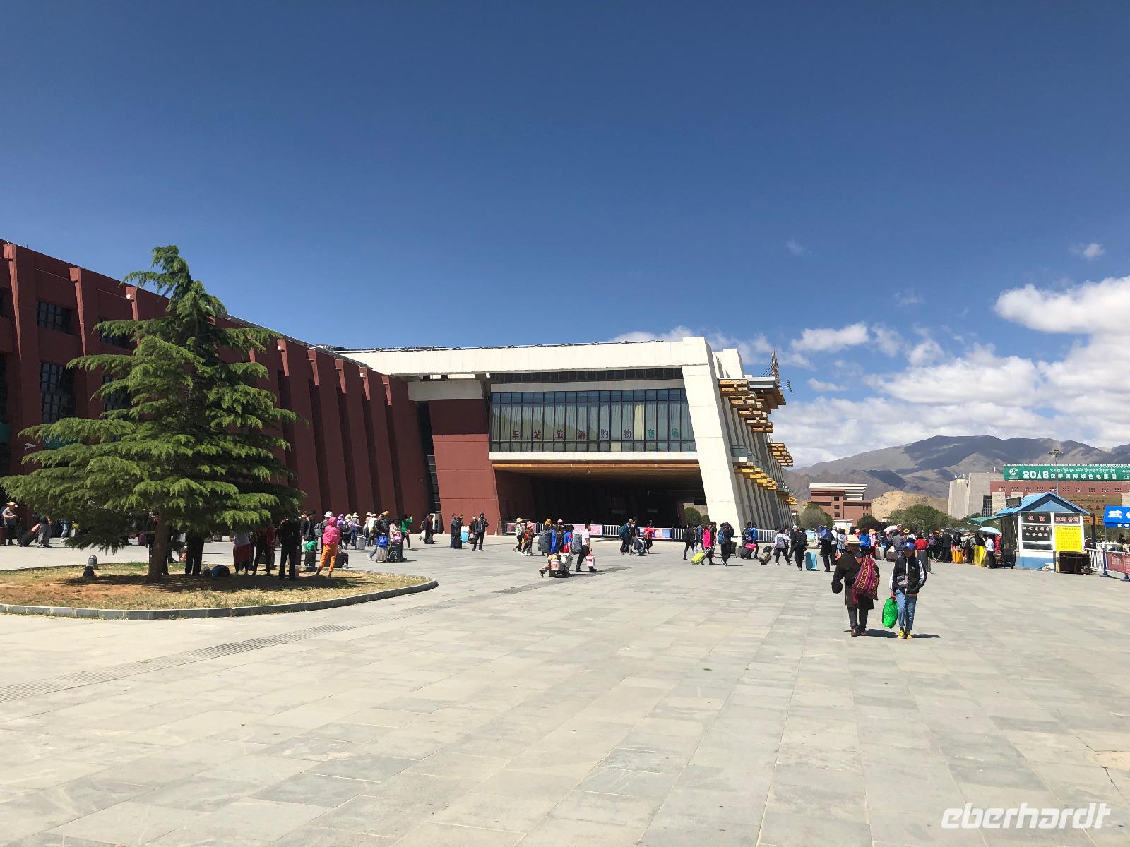 Heute hieß es Abschied nehmen von Peking und das schon sehr zeitig am Morgen. Unser Flug ins zentralchinesische Xining ging um 06.40 Uhr, so dass wir bereits um vier Uhr morgens unser Hotel verließen. Am Flughafen verabschiedeten wir unseren Reiseleiter "Martin" und stiegen pünktlich in die bereitstehende Maschine von Air China. Nach etwas über zwei Stunden ruhigen Fluges landeten wir in der 2-Millionen-Metropole Xining, dem Ausgangspunkt unseres Zugabenteuers mit der Tibet-Bahn. Wir wurden herzlich von unserem örtlichen Reiseleiter „Udo" begrüßt, welcher mit uns eine kurze Stadtrundfahrt unternahm, bevor wir den Buddhistentempel Nau Chan besichtigten. Der Tempel lag an einem Hang etwas oberhalb der Stadt, weswegen man von hier aus einen großartigen Blick auf Xining hatte. Nach einem kleinen Mittagessen und einem Zwischenstopp in einem Supermarkt, wo wir uns mit Proviant für die Zugfahrt eindeckten, ging es zum Bahnhof, wo wir in den Lhasa-Express einstiegen, welcher uns in knapp einundzwanzigstündiger Fahrt in die Tibetische Hauptstadt bringen sollte. Der Zug war, wie nicht anders zu erwarten, ausgebucht. Immerhin war es nach dem Flugzeug die zweitbeste Möglichkeit, in angemessener Zeit nach Lhasa zu gelangen. Darüber hinaus handelte es sich auch noch um die höchstgelegene Eisenbahnstrecke der Welt, was einer gewissen Faszination nicht nur bei Eisenbahnfreunden Vorschub leistete. Auch wenn wir in Abteilen der 1. Klasse untergebracht waren, merkten wir doch recht schnell, dass ein Bett in einem Eisenbahnabteil kein Hotelzimmer ersetzen konnte und die sanitären Gegebenheiten einer Dauernutzung, wie leider in einem Zug an der Tagesordnung, nicht gewachsen waren. Mit jedem zurückgelegten Kilometer kam die ansteigende Höhe hinzu, was bei Einigen zu Kopfschmerzen und Unwohlsein führte. Und dass, obwohl den Abteilen Extra-Sauerstoff zugeführt wurde. Die vorbeiziehende karge Landschaft des Tibetischen Hochplateaus, mit ihren Yak- und Schafherden, den einzelnen Gehöften und der allgegenwärtigen Bautätigkeit entschädigte dafür in vielerlei Hinsicht. Mit dem Hereinbrechen der Dunkelheit ließen wir uns dann vom monotonen Geräusch des Zuges in den Schlaf wiegen.