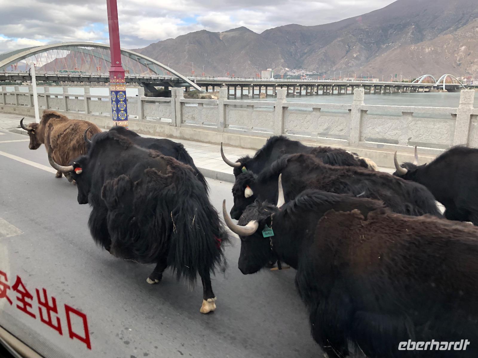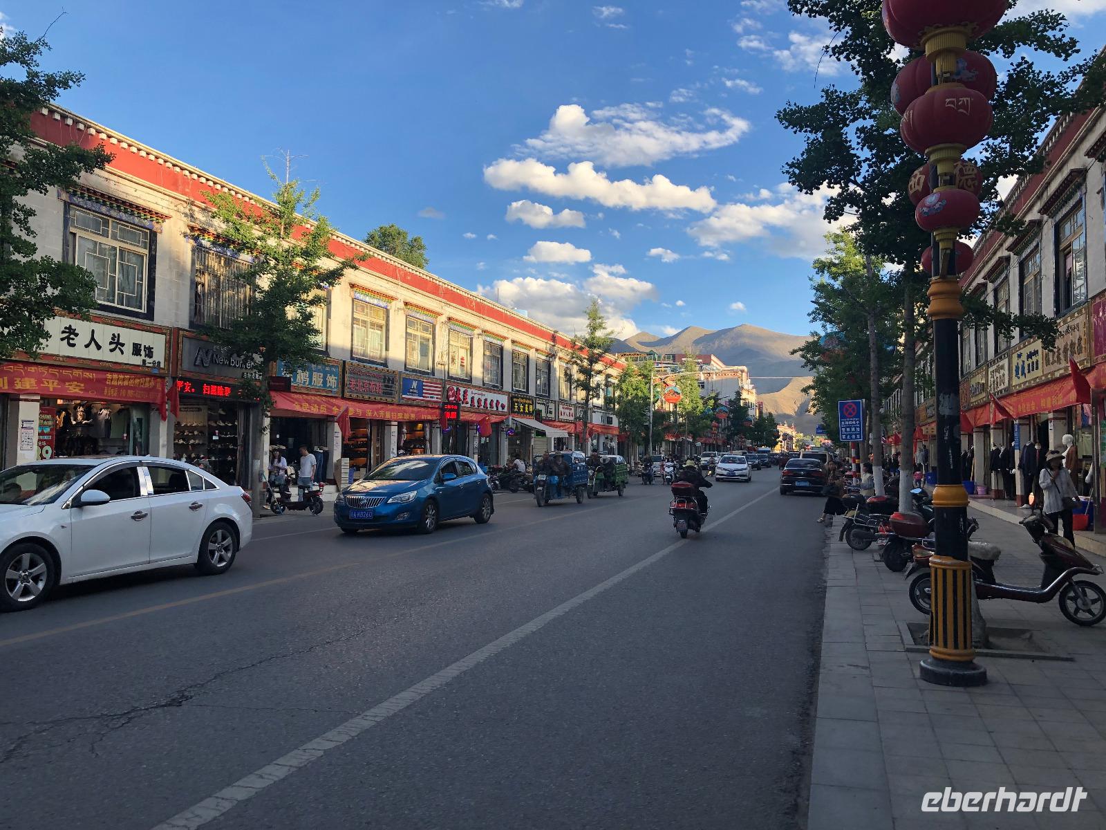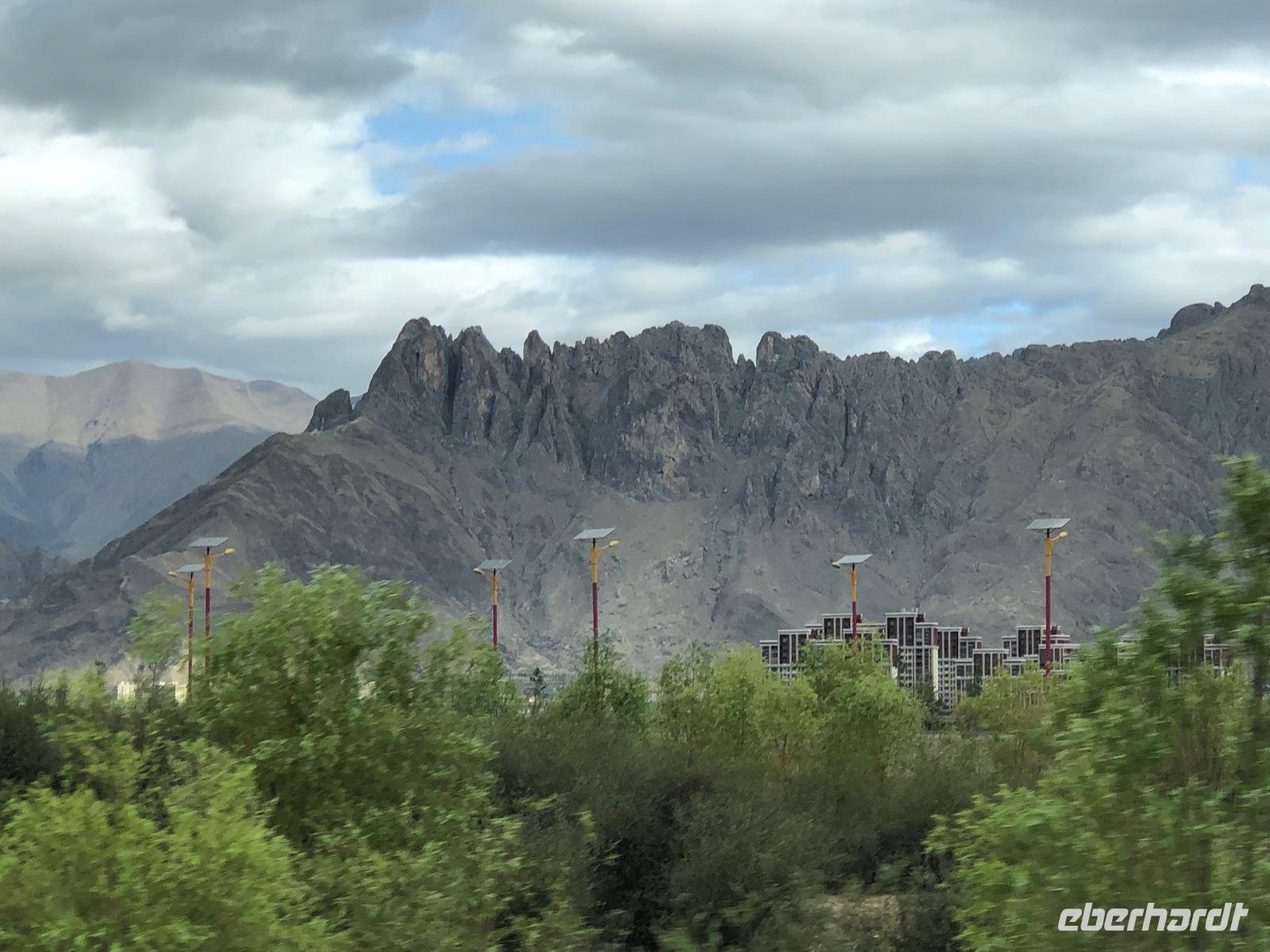 Nach dem stromlosen Erwachen (mein Zimmer war de-elektrisiert; kommt in ländlichen Bergregionen wohl mal ab und zu vor) und einer Dusche im Dunklen (gut das man seinen Körper kennt) nahmen wir ein kurzes Frühstück zu uns, bevor wir uns auf den beinahe siebenstündigen Rückweg nach Lhasa machten. Von Shigatse aus, welches ziemlich genau in der Mitte zwischen der tibetischen Hauptstadt und dem Mt. Everest gelegen ist, waren es knapp 270 Straßenkilometer. Was nach nicht sehr viel klingt, zieht sich aufgrund der allseits stattfindenden Baumaßnahmen ordentlich in die Länge. Wie wir später feststellen sollten, waren die Straßenverhältnisse im Vergleich zu Nepal hier in Tibet beinahe in allerbester Ordnung. Oder anders herum ausgedrückt: In Nepal waren sie dramatisch schlecht. Zugutehalten musste man den Infrastrukturplanern im fernen Peking, dass auch im weit entfernten Tibet wie in allen anderen Landesteilen baulich geklotzt und nicht gekleckert wurde. Das war uns bisher auf allen Baustellen in den besuchten Landesteilen aufgefallen; der bauliche Wandel vollzog sich mit unheimlicher Geschwindigkeit. Ob es neue Ringstraßen oder Bahnstrecken für Olympia 2022 waren oder monumentale Hochhausviertel im Speckgürtel von Xining und Lhasa, alles wurde innerhalb kürzester Zeit neu gebaut und in Betrieb genommen. Das galt selbstverständlich auch für Flughäfen und Bahnhöfe, wie wir uns selbst überzeugen konnten. Auf unserer Fahrt nach Lhasa passierten wir etliche Sechs- und Siebentausender und sahen neue Straßen sich in die karge und doch so beeindruckende Landschaft fressen. Flüsse, die sich während der Monsunzeit in den nächsten Wochen mit Wasser füllen würden, plätscherten jetzt noch als Bächlein durch die graubraune Gebirgslandschaft. Einzelne Schafherden und Yak-Weidegründe zogen an uns vorbei. Sie standen mit den Klöstern, Achttausendern und den bunten Gebetsfahnen gleichsam als Inbegriff unserer Vorstellung von Tibet. Das da aber wesentlich mehr war, erschloss sich dem interessierten Tibet-Besucher innerhalb kürzester Zeit. Wir unterbrachen unsere Fahrt für mehrere kurze Pausen, unter anderem auch für den Besuch einer Räucherstäbchenmanufaktur. Doch irgendwann ist auch einmal die längste Fahrt zu Ende, so dass wir am späten Nachmittag wieder Lhasa erreichten. Nach dem Zimmerbezug in unserem 4-Sterne-Hotel im Zentrum der Stadt ließen wir den Tag wieder bei einem tibetisch-nepalesischen Abendessen ausklingen. Der anschließende Spaziergang durch die gut besuchten Einkaufsstraßen zurück zum Hotel tat unseren Körpern nach dem stundenlangen Sitzen im Bus sehr gut. Nun hieß es noch Koffer packen und mental Abschied von Tibet und China nehmen. Der nächste Tag sollte uns nur ins Nachbarland und doch gefühlt ganz weit wegbringen.