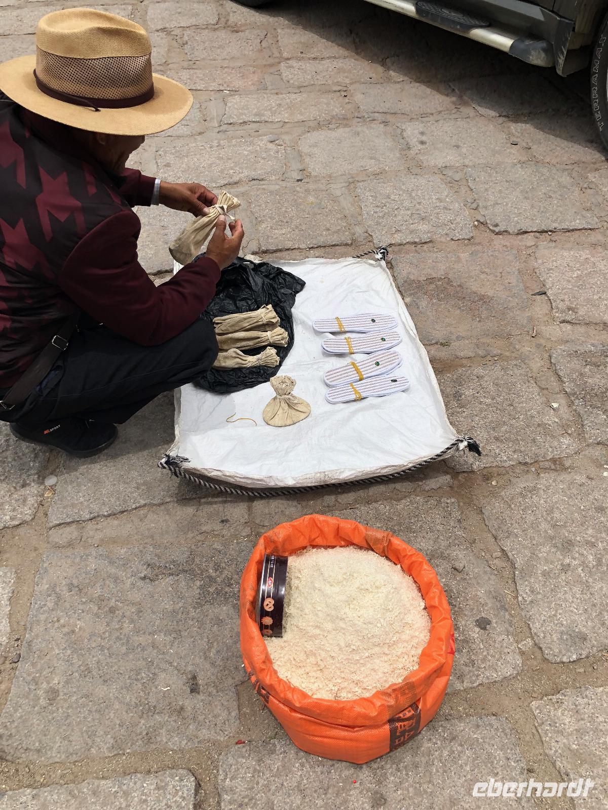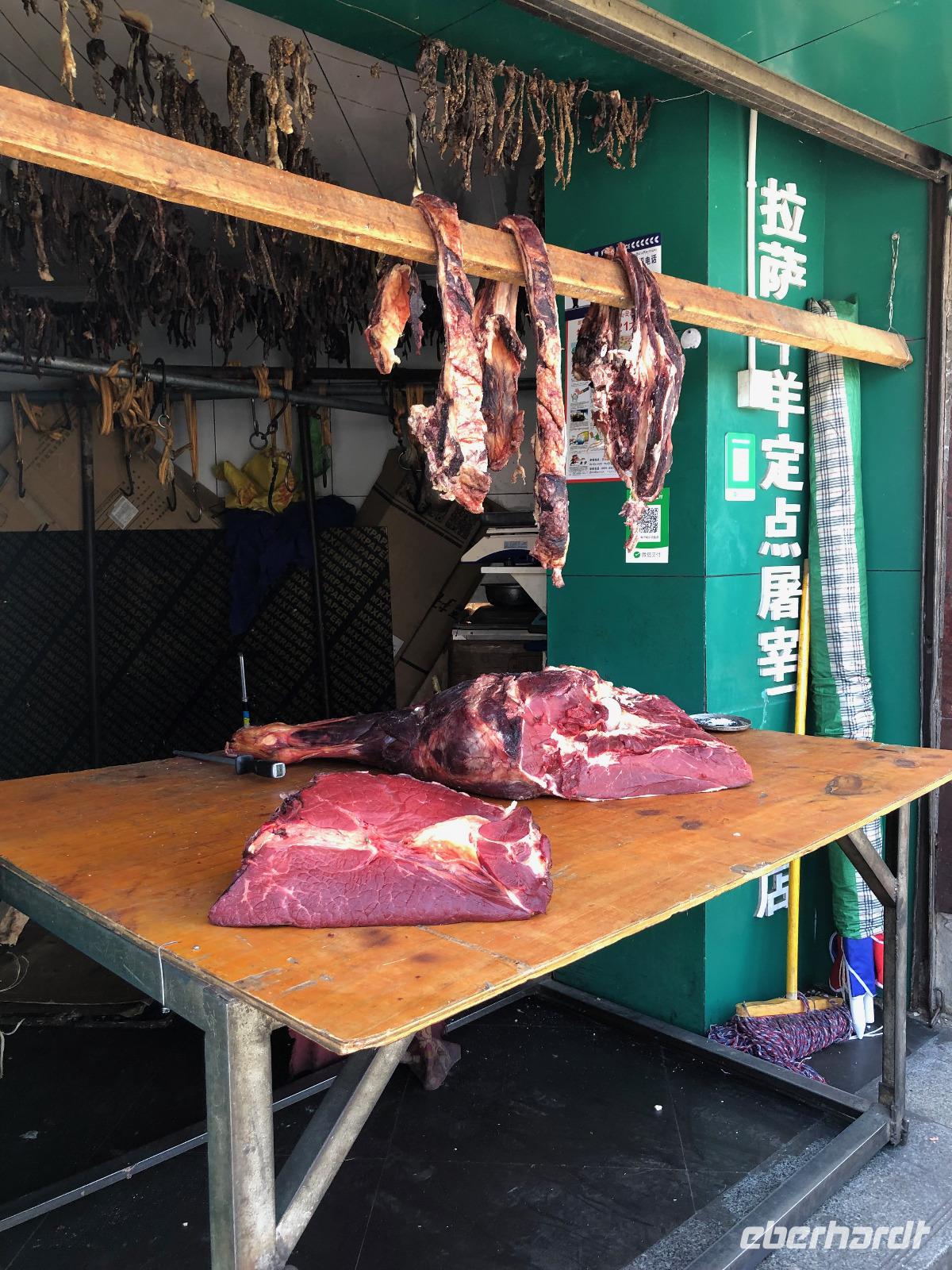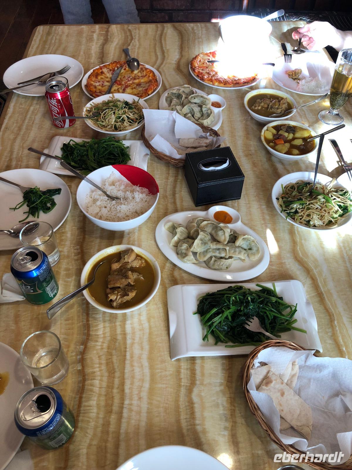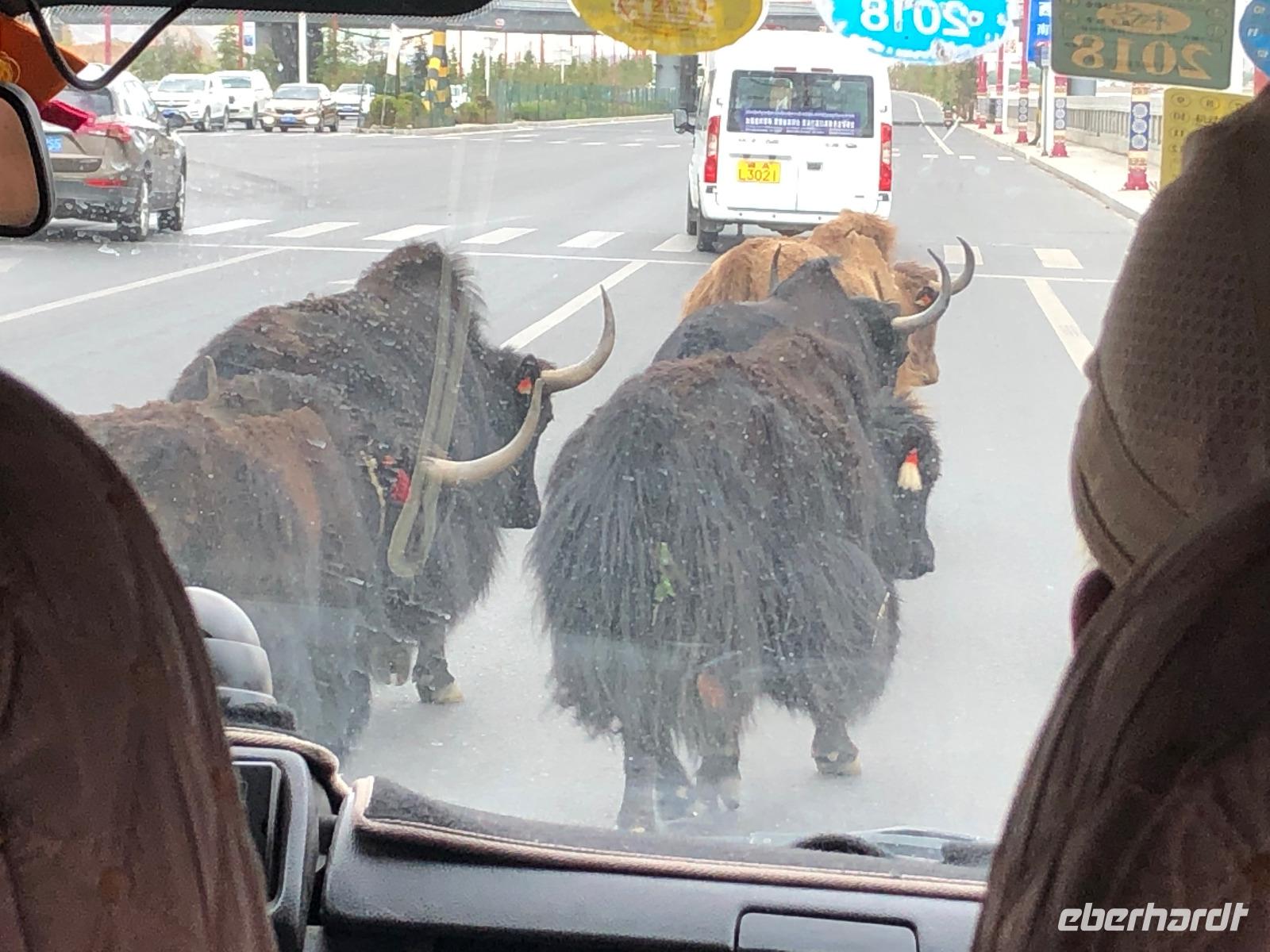 Nach dem stromlosen Erwachen (mein Zimmer war de-elektrisiert; kommt in ländlichen Bergregionen wohl mal ab und zu vor) und einer Dusche im Dunklen (gut das man seinen Körper kennt) nahmen wir ein kurzes Frühstück zu uns, bevor wir uns auf den beinahe siebenstündigen Rückweg nach Lhasa machten. Von Shigatse aus, welches ziemlich genau in der Mitte zwischen der tibetischen Hauptstadt und dem Mt. Everest gelegen ist, waren es knapp 270 Straßenkilometer. Was nach nicht sehr viel klingt, zieht sich aufgrund der allseits stattfindenden Baumaßnahmen ordentlich in die Länge. Wie wir später feststellen sollten, waren die Straßenverhältnisse im Vergleich zu Nepal hier in Tibet beinahe in allerbester Ordnung. Oder anders herum ausgedrückt: In Nepal waren sie dramatisch schlecht. Zugutehalten musste man den Infrastrukturplanern im fernen Peking, dass auch im weit entfernten Tibet wie in allen anderen Landesteilen baulich geklotzt und nicht gekleckert wurde. Das war uns bisher auf allen Baustellen in den besuchten Landesteilen aufgefallen; der bauliche Wandel vollzog sich mit unheimlicher Geschwindigkeit. Ob es neue Ringstraßen oder Bahnstrecken für Olympia 2022 waren oder monumentale Hochhausviertel im Speckgürtel von Xining und Lhasa, alles wurde innerhalb kürzester Zeit neu gebaut und in Betrieb genommen. Das galt selbstverständlich auch für Flughäfen und Bahnhöfe, wie wir uns selbst überzeugen konnten. Auf unserer Fahrt nach Lhasa passierten wir etliche Sechs- und Siebentausender und sahen neue Straßen sich in die karge und doch so beeindruckende Landschaft fressen. Flüsse, die sich während der Monsunzeit in den nächsten Wochen mit Wasser füllen würden, plätscherten jetzt noch als Bächlein durch die graubraune Gebirgslandschaft. Einzelne Schafherden und Yak-Weidegründe zogen an uns vorbei. Sie standen mit den Klöstern, Achttausendern und den bunten Gebetsfahnen gleichsam als Inbegriff unserer Vorstellung von Tibet. Das da aber wesentlich mehr war, erschloss sich dem interessierten Tibet-Besucher innerhalb kürzester Zeit. Wir unterbrachen unsere Fahrt für mehrere kurze Pausen, unter anderem auch für den Besuch einer Räucherstäbchenmanufaktur. Doch irgendwann ist auch einmal die längste Fahrt zu Ende, so dass wir am späten Nachmittag wieder Lhasa erreichten. Nach dem Zimmerbezug in unserem 4-Sterne-Hotel im Zentrum der Stadt ließen wir den Tag wieder bei einem tibetisch-nepalesischen Abendessen ausklingen. Der anschließende Spaziergang durch die gut besuchten Einkaufsstraßen zurück zum Hotel tat unseren Körpern nach dem stundenlangen Sitzen im Bus sehr gut. Nun hieß es noch Koffer packen und mental Abschied von Tibet und China nehmen. Der nächste Tag sollte uns nur ins Nachbarland und doch gefühlt ganz weit wegbringen.