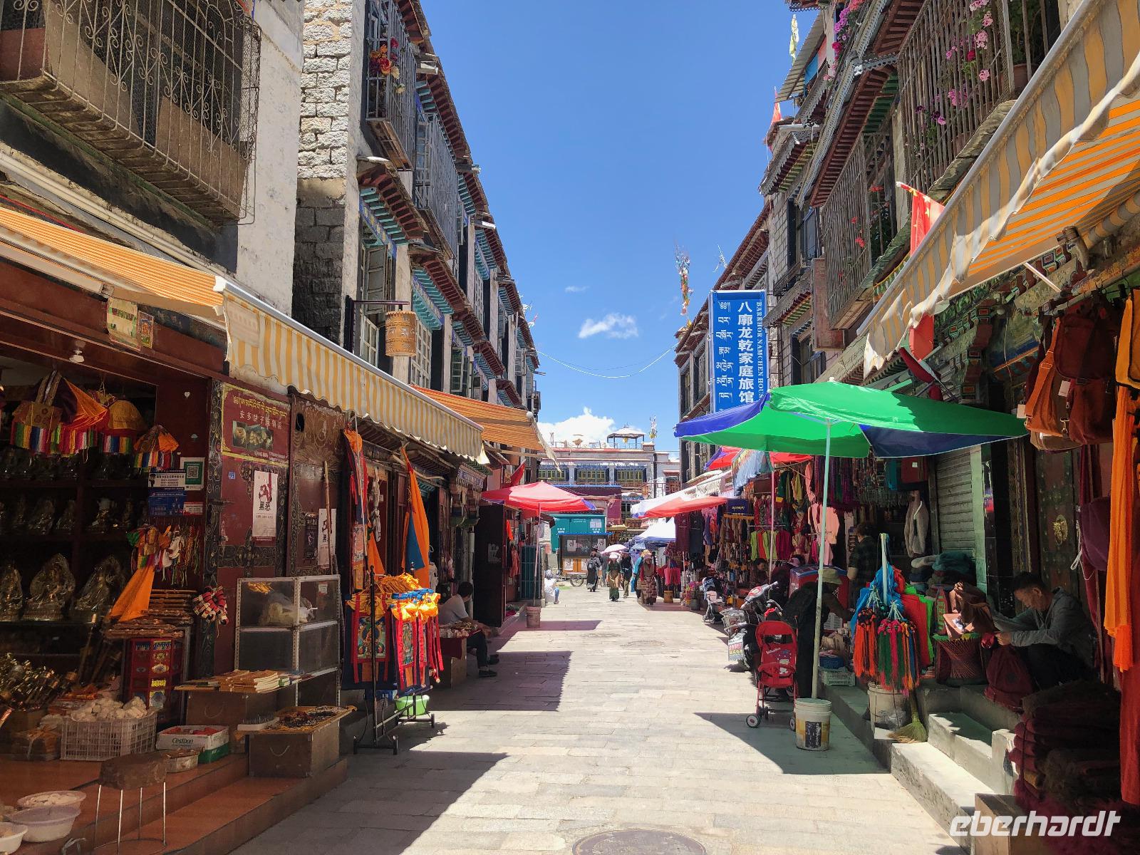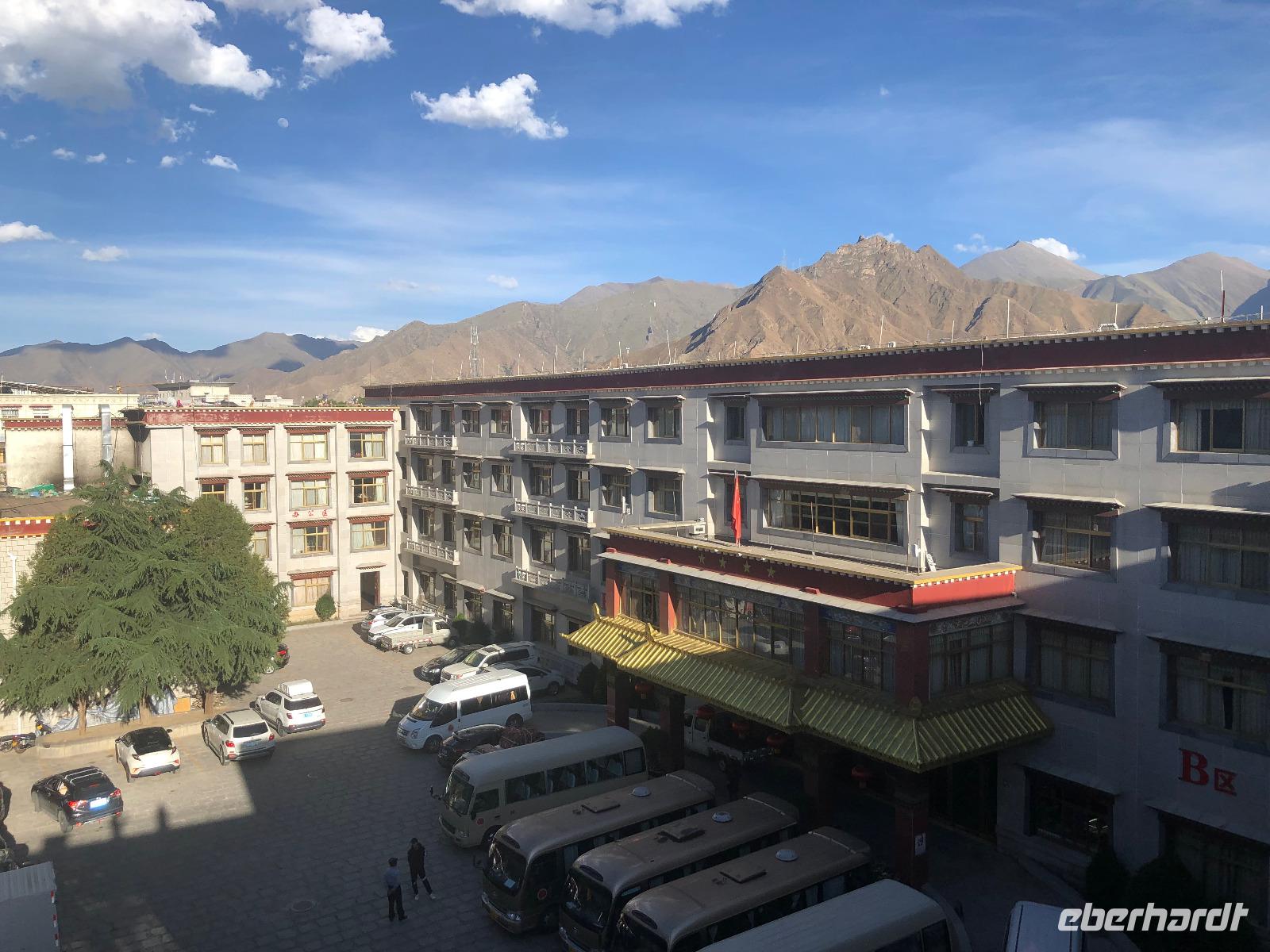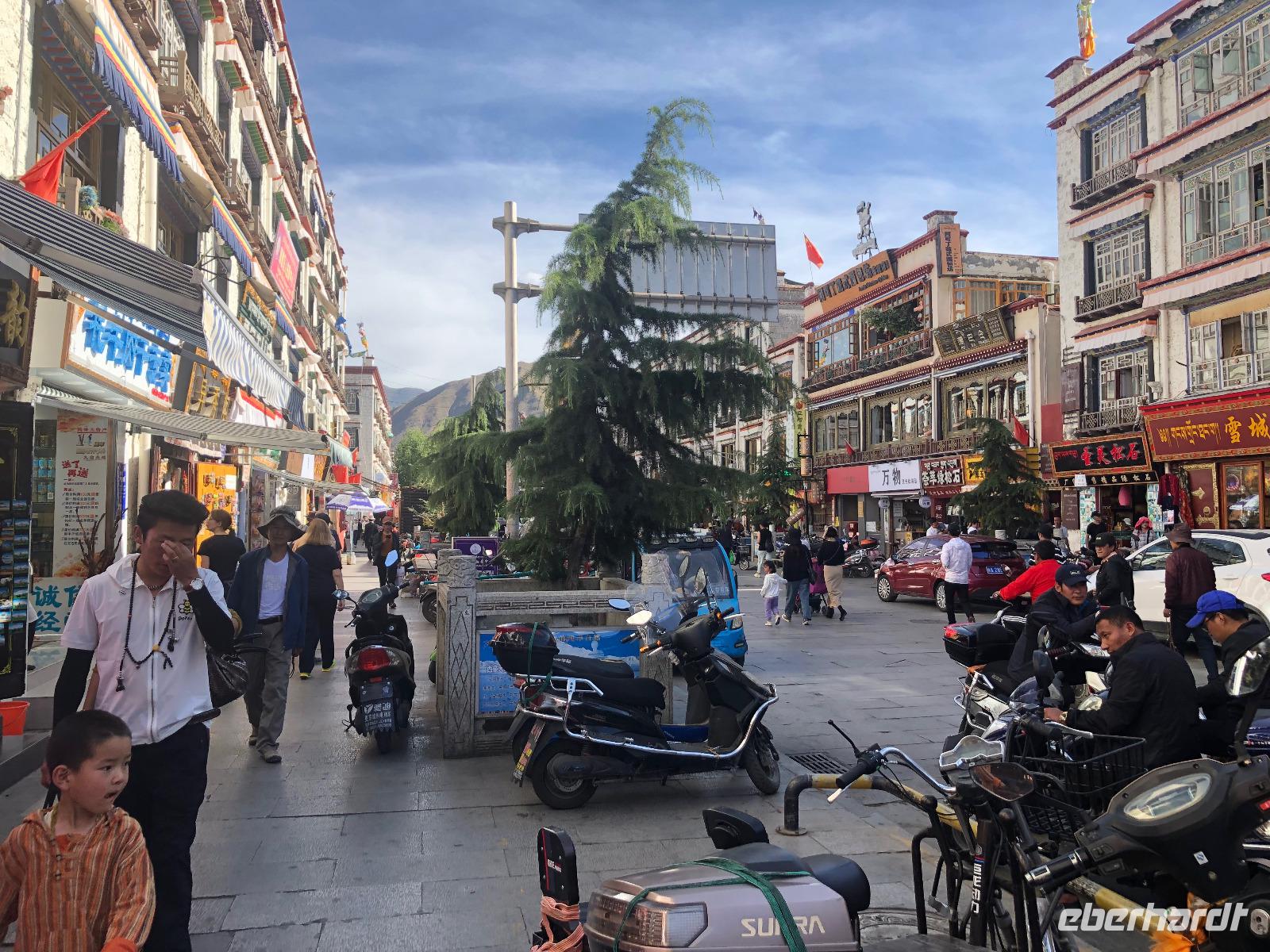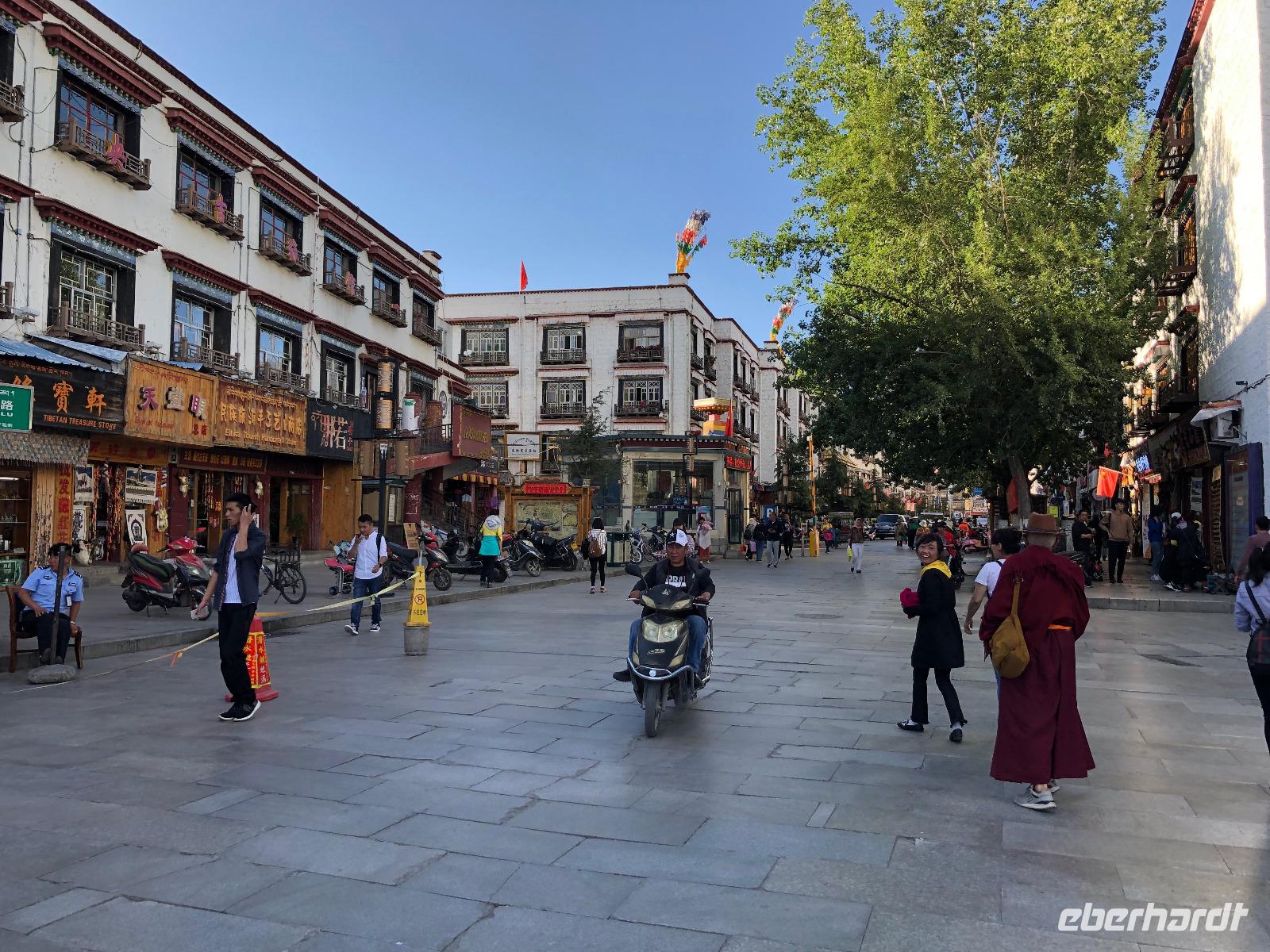 Nach einem gemeinsamen Frühstück, welches wir von den gestern gekauften und mitgebrachten Sachen zubereiteten, verkürzten wir uns die Zeit mit angenehmen Gesprächen und ließen dabei die Landschaft an unserem Zugfenster vorbeiziehen. Leider hatten wir den höchsten Punkt der Strecke in der Nacht passiert, so dass wir den Bahnhof Tanggula nicht selbst in Augenschein nehmen konnten. Dafür hatten wir aber das „Vergnügen", die Durchfahrt durch den 32 Kilometer langen Eisenbahntunnel Guanjiao erfahren zu dürfen. Auch wenn es natürlich nichts zu sehen gab... Immerhin handelte es sich um den längsten Tunnel des chinesischen Eisenbahnnetzes. Insofern konnte die Fahrt mit der Tibet-Bahn mit einigen Superlativen aufwarten. Um die Mittagszeit herum erreichten wir dann die Hauptstadt der Autonomen Region Tibet, wie das Gebiet offiziell heißt und wurden nach einer ausführlichen Passkontrolle von unserem tibetischen Reiseleiter „Alex" begrüßt. Er hieß uns mit den typischen tibetischen weißen Schals herzlich Willkommen. Bei strahlendem Sonnenschein und angenehmen 26 Grad fuhren wir im Anschluss in unser Hotel im Herzen von Lhasa, um uns von den Anstrengungen der Zugfahrt etwas zu erholen. Eine warme Dusche und saubere Toiletten sind manchmal schon Verheißung genug. Ausgeruht unternahmen wir am Nachmittag einen Spaziergang in die Altstadt von Lhasa, wo sich unter anderem der Jokhang-Tempel befand. Wir bummelten an den Geschäften um den Barkhor-Markt vorbei, sahen die Pilger ihre Runden um den Jokhang-Tempel drehen und bestaunten die Farbenpracht und Vielfalt der Auslagen bei den ansässigen Händlern. Lhasa ist heute eine Großstadt mit an vielen Stellen westlicher Prägung, die aber Tradition und Moderne noch in Einklang zu bringen weiß. Traditionelle Gewänder, insbesondere bei der älteren Bevölkerung, prägten neben dem westlichen Chic jüngerer Tibeter das Straßenbild. Die allgegenwärtige tibetische Architektur, gerade in der Altstadt, kann sich momentan noch den modernen Häuserfassaden erwehren. Aber auch nur im Zentrum, an den Stadträndern schießen die neuen, uniformen Hochhausviertel wie Pilze aus dem Boden. Lhasa wächst mit beängstigender Geschwindigkeit, man kann nur hoffen, dass es seinen Charakter nicht in kürzester Zeit verlieren wird.