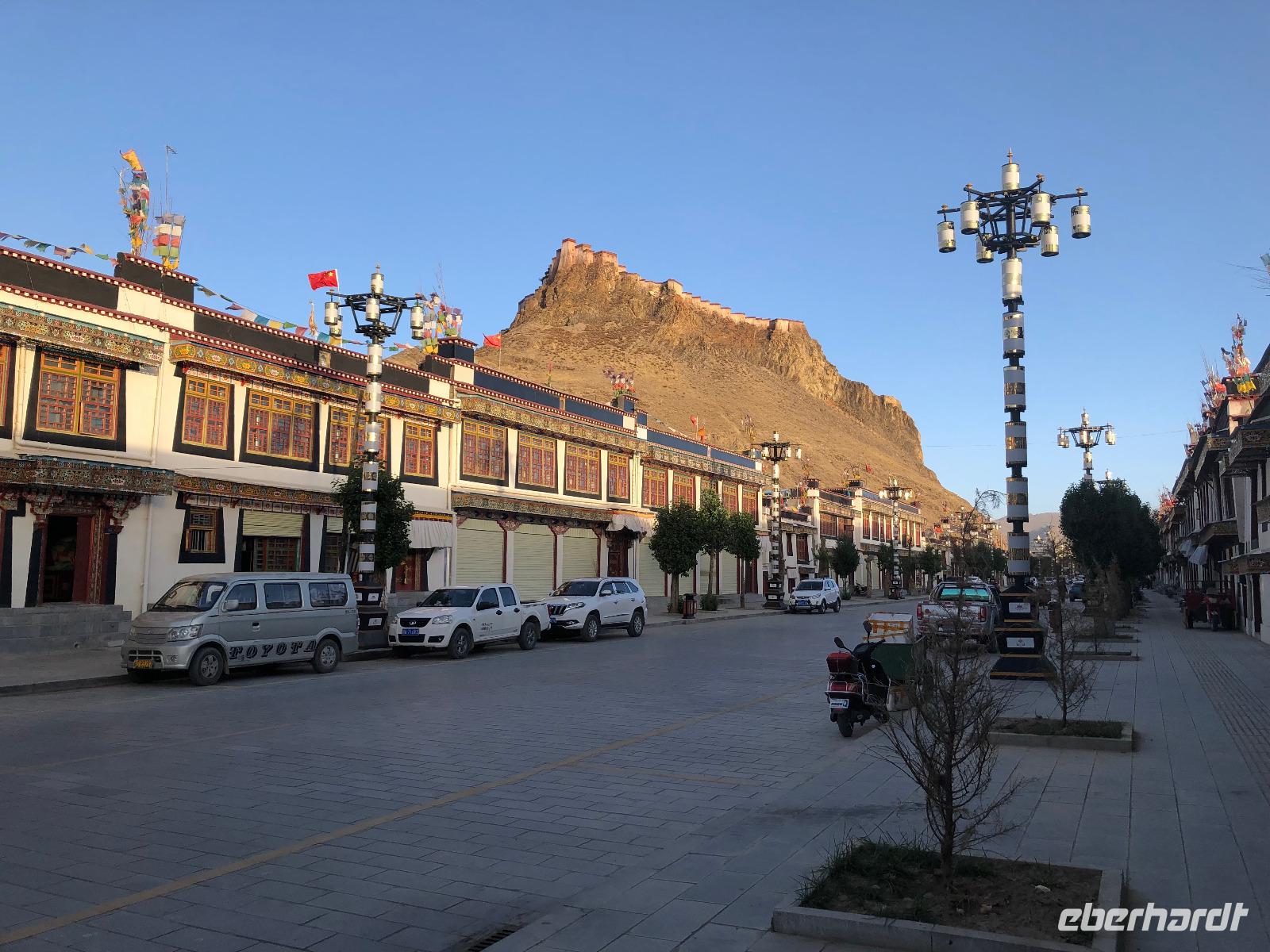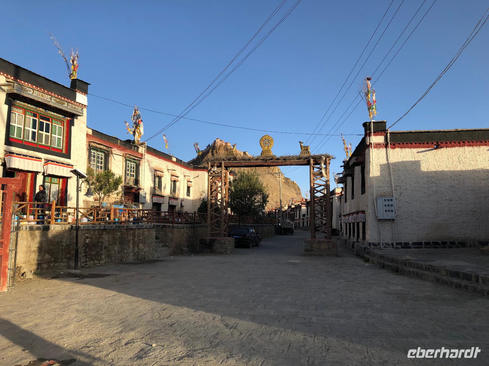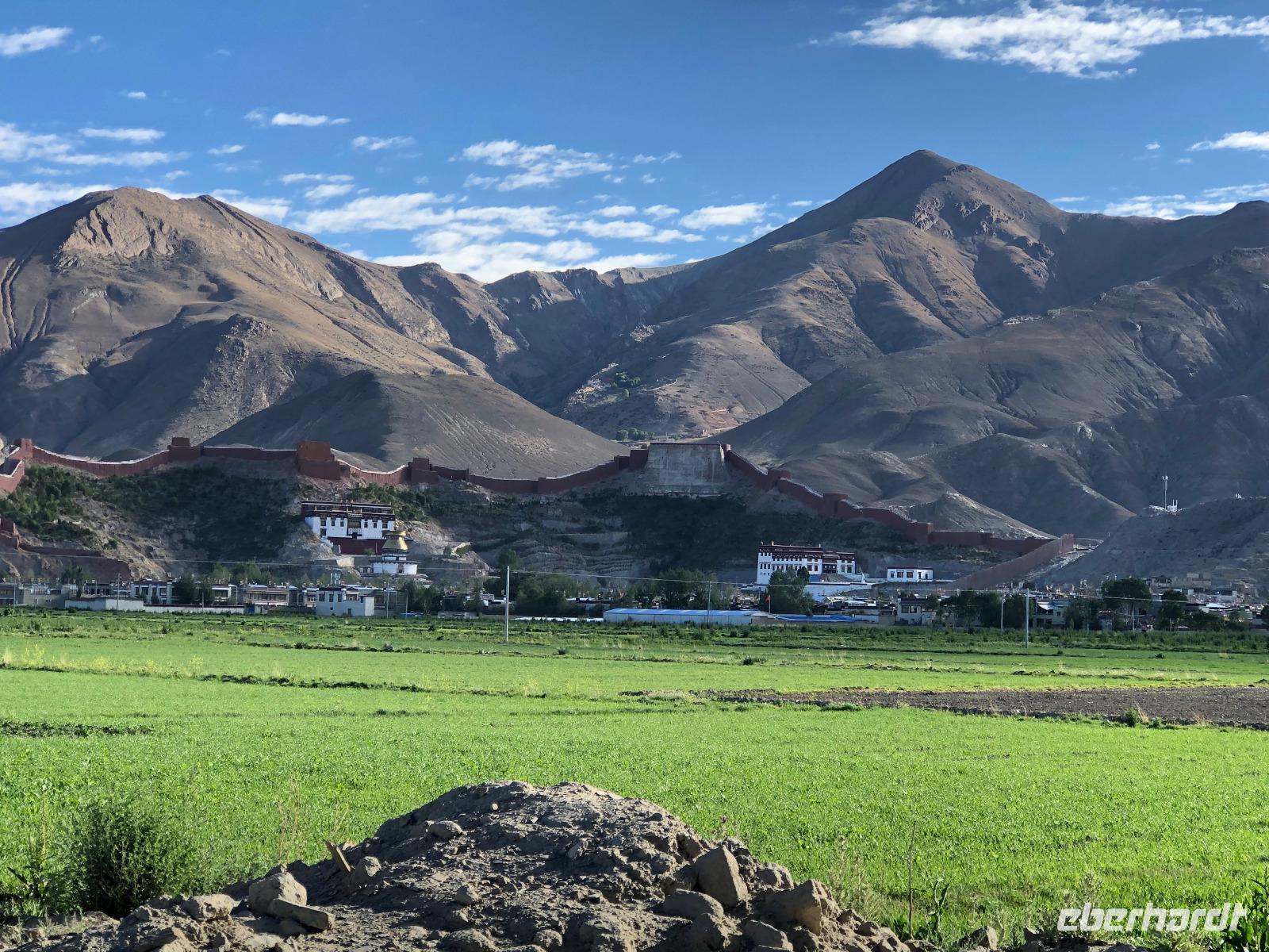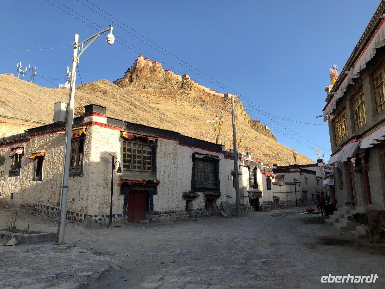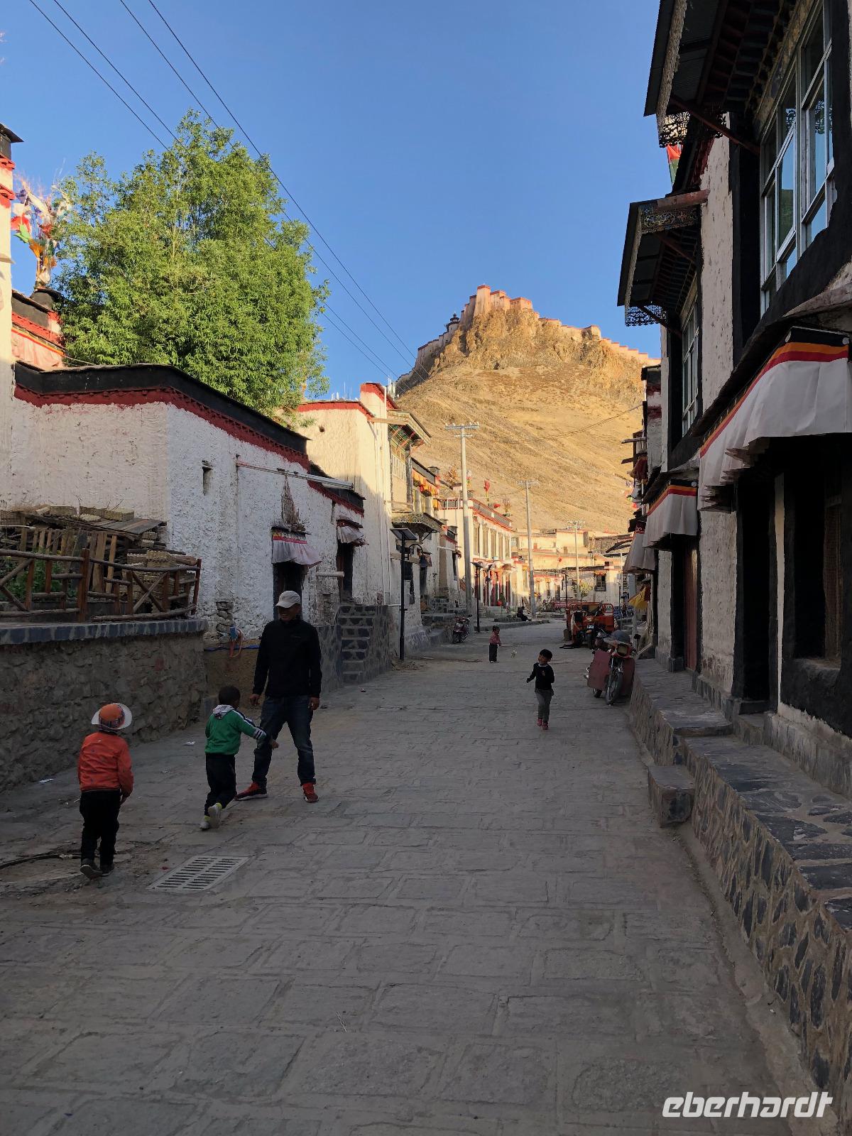 Am heutigen Reisetag sollte die atemberaubende Natur im Mittelpunkt stehen. Wir verabschiedeten uns nach dem Frühstück vorerst von Lhasa und begaben uns tiefer in die tibetische Bergwelt hinein. Nach etwas mehr als anderthalb Stunden Fahrt hielten wir im Dorf Gangdui, wo wir bei einem kleinen Spaziergang und einem Besuch bei einem Bauern das dörfliche Leben kennenlernten. Wir probieren Buttertee, erhielten viele Informationen und konnten dabei einen kleinen Einblick in die Lebensverhältnissen eines typischen tibetischen Dorfes bekommen. Zurück im Bus bekamen wir kurze Zeit später regelrechte Pilgerströme zu Gesicht, die sich an eine fünfstündige Umrundung eines in der Nähe gelegenen heiligen Berges machten. Beeindruckend, aber auch etwas befremdlich. Weiter ging es immer tiefer bzw. höher in das Gebirge hinein. Um die Mittagszeit hielten wir erneut, dieses Mal oberhalb einer Pass-Straße mit schönem Blick auf den Yaluzangbu-Fluss. Das an solchen Plätzen gern auch der eine oder andere Yuan verdient werden will, war nur folgerichtig. Insbesondere das Fotografieren stand hierbei im Vordergrund. Touristen auf/mit ruhig gestellten Yaks oder Tibetischen Mastiffs, die mit Sonnenbrillen verschönert alsbald diverse Instagram-Accounts schmücken würden. Skurril, Makaber, Tierquälerei. Verantwortungsbewusste Reisende wissen, was sie zu tun haben. Kurze Zeit später erreichten wir den 4998 hoch gelegenen Khamba-La-Pass, von wo aus wir einen wunderschönen Blick auf den knapp 500 Meter tieferliegenden türkisfarbenen Yamdrok-See hatten. Da das Wetter wunderbar und die Temperaturen angenehm waren, unternahmen wir kurzerhand einen kleinen Spaziergang am Ufer des Skorpion-Sees, wie sein Name auch übersetzt wird. Für die Tibeter gehört er zu den heiligen Seen und wir konnten uns seiner stillen Faszination ebenfalls nicht entziehen. Wir setzten unsere Fahrt in Richtung Gyantse fort und erreichten am frühen Nachmittag den Karo-La-Pass in einer Höhe von 5020 Metern. Tibetische Gebetsfahnen, eine Stupa und der Karo-Gletscher im Hintergrund waren großartige Fotomotive, auch wenn das Atmen in dieser Höhe schon anstrengend wurde. Am Simila-Stausee, den wir wenig später erreichten, flatterten unzählige bunte Gebetsfahnen, welche mit dem wunderschönen See im Hintergrund ebenfalls ein tolles Fotomotiv abgaben. Den letzten Abschnitt unserer Strecke nach Gyantse absolvierten wir dann in einem Stück, so dass wir die knapp 60.000 Einwohner zählende Kleinstadt am frühen Abend erreichten. Nach dem Zimmerbezug und einem stärkenden Abendessen spazierten wir noch in die Altstadt von Gyantse, wo wir den Einheimischen beim Würfeln zusahen, mit ein paar Kindern Fußball spielten und die ruhige und unaufgeregte Atmosphäre des Ortes und der Menschen um uns herum genossen. Die hoch über der Stadt thronende Festung war darüber hinaus im Licht der untergehenden Sonne ein weiteres schönes Fotomotiv.