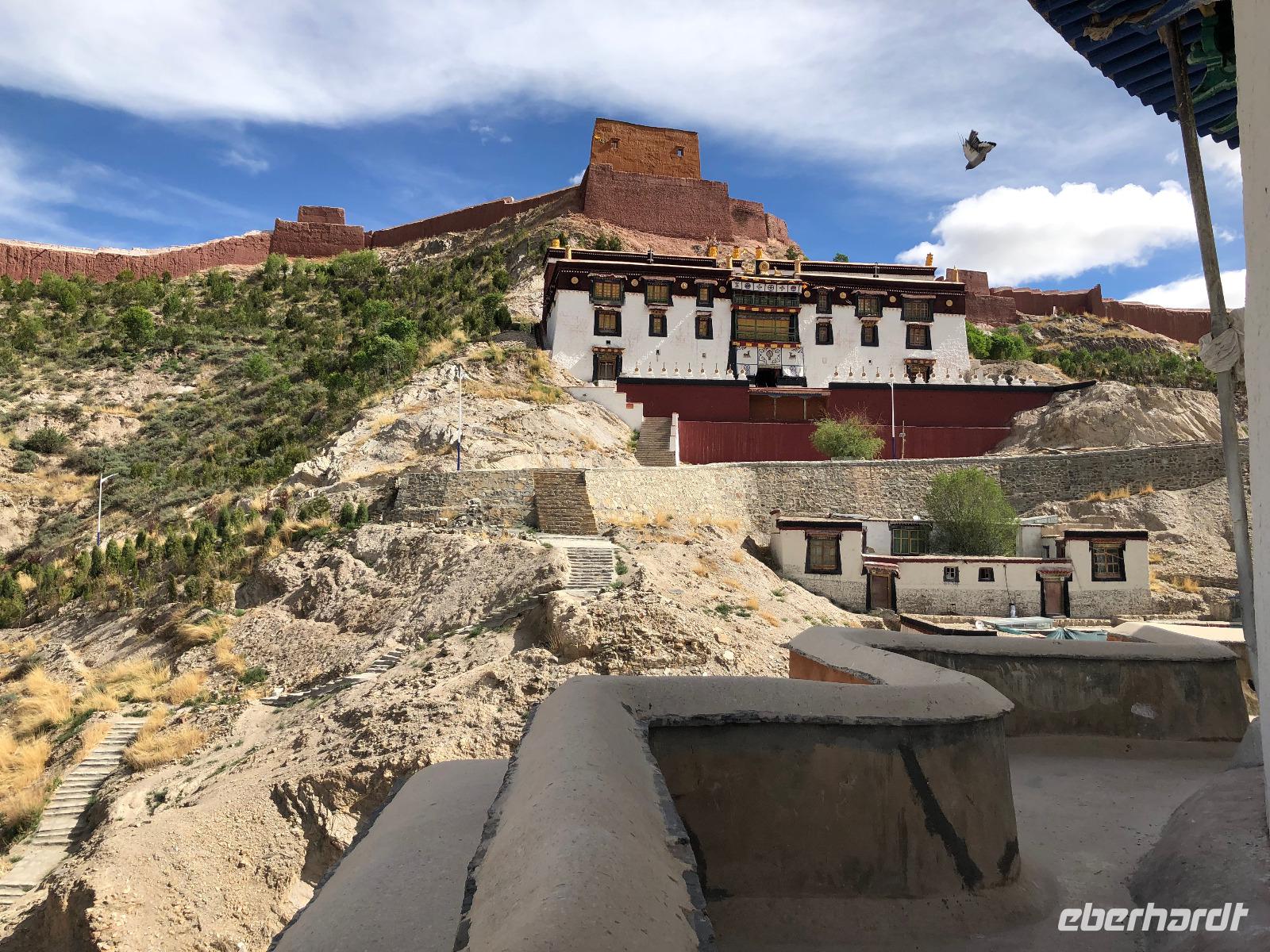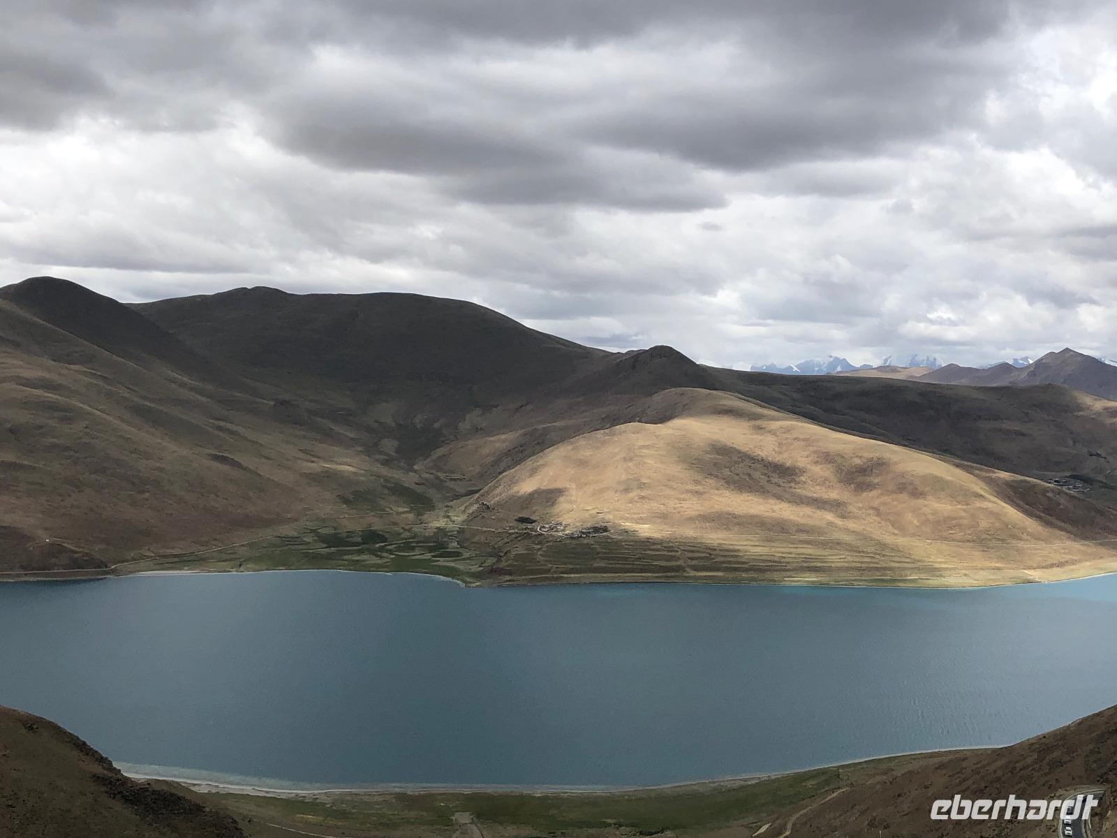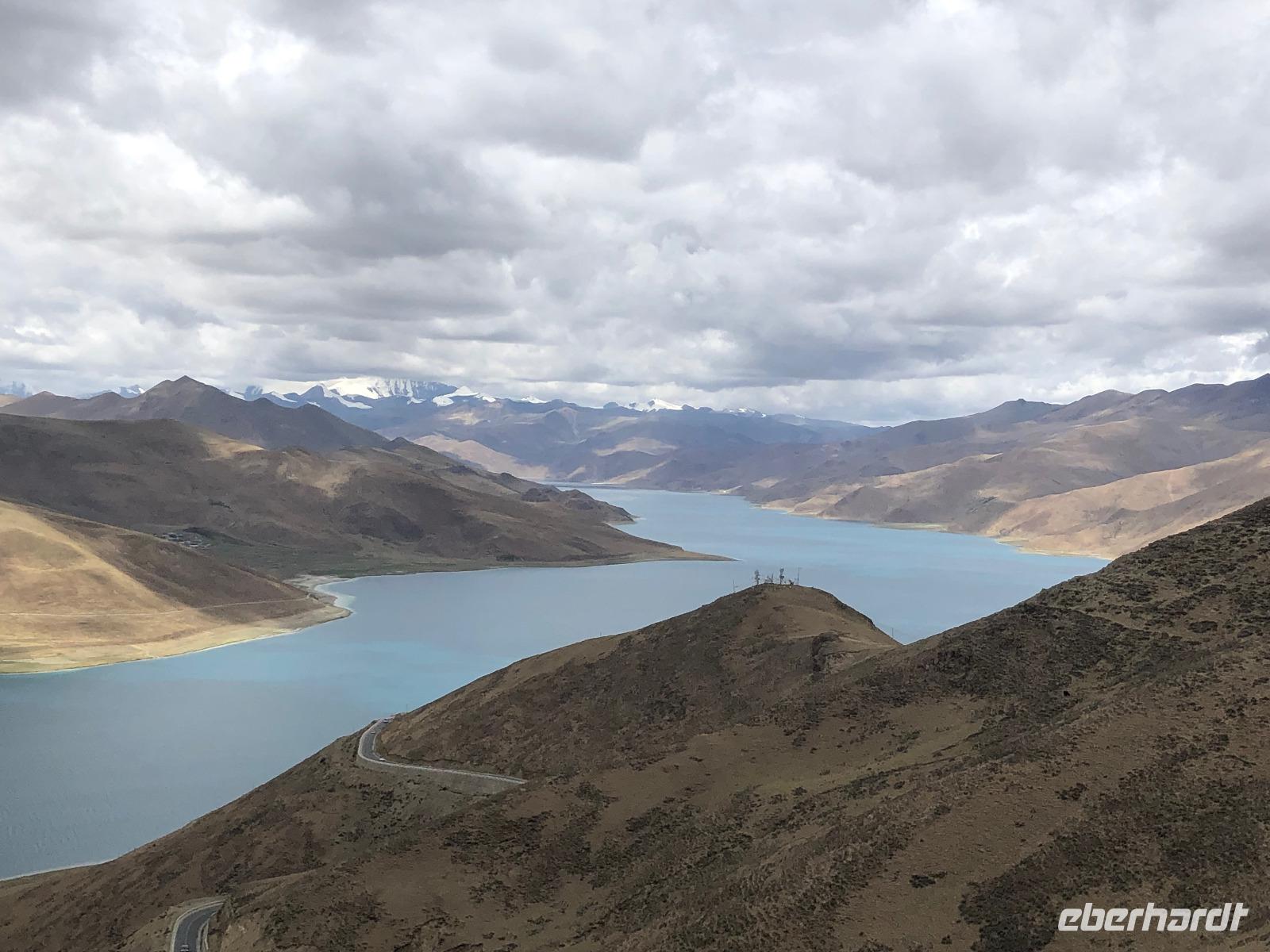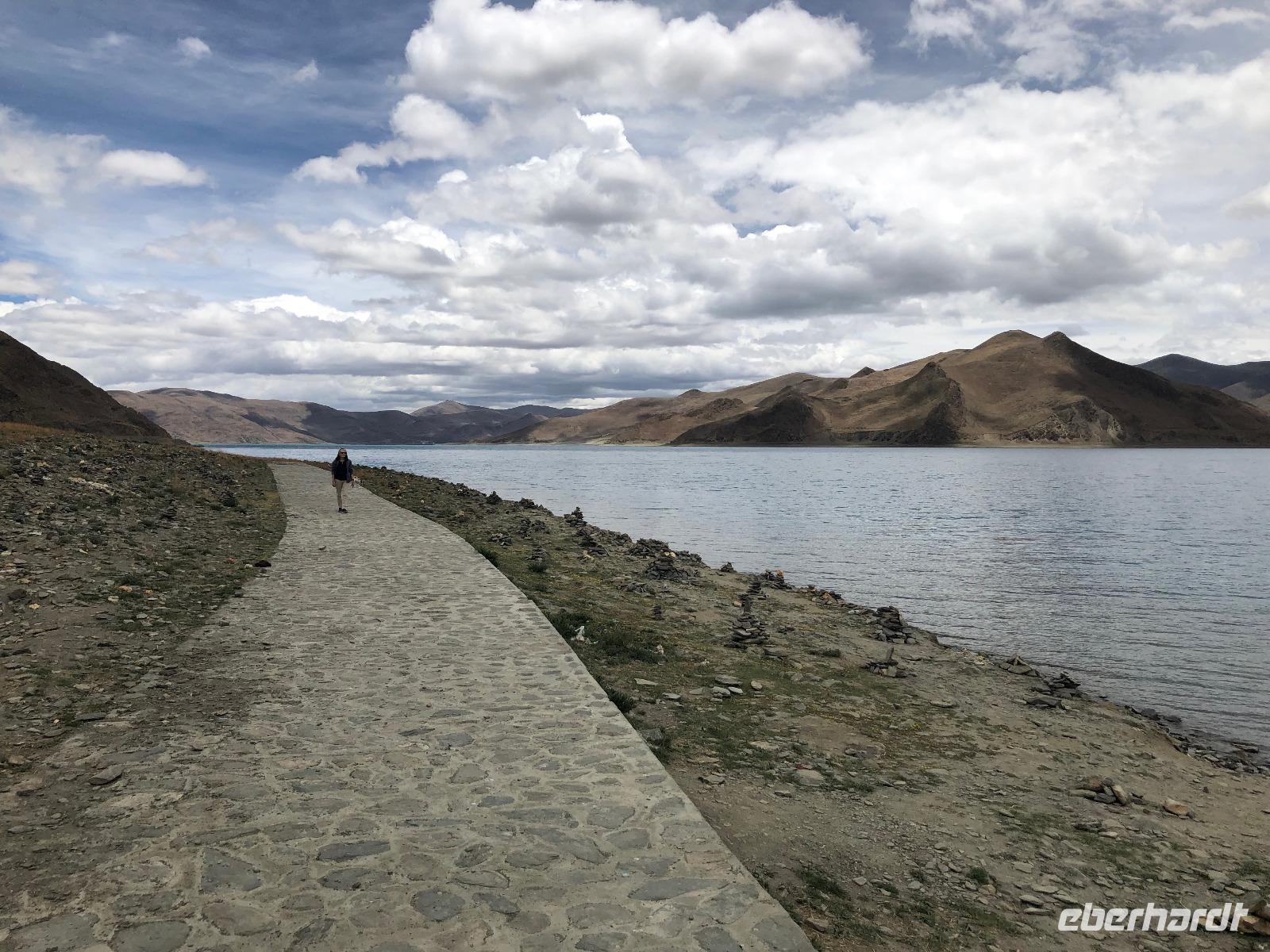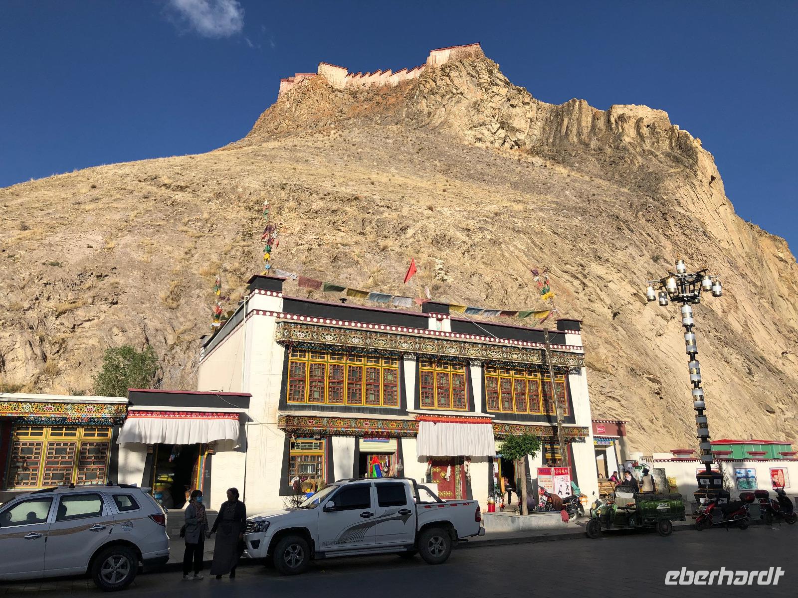 Am heutigen Reisetag sollte die atemberaubende Natur im Mittelpunkt stehen. Wir verabschiedeten uns nach dem Frühstück vorerst von Lhasa und begaben uns tiefer in die tibetische Bergwelt hinein. Nach etwas mehr als anderthalb Stunden Fahrt hielten wir im Dorf Gangdui, wo wir bei einem kleinen Spaziergang und einem Besuch bei einem Bauern das dörfliche Leben kennenlernten. Wir probieren Buttertee, erhielten viele Informationen und konnten dabei einen kleinen Einblick in die Lebensverhältnissen eines typischen tibetischen Dorfes bekommen. Zurück im Bus bekamen wir kurze Zeit später regelrechte Pilgerströme zu Gesicht, die sich an eine fünfstündige Umrundung eines in der Nähe gelegenen heiligen Berges machten. Beeindruckend, aber auch etwas befremdlich. Weiter ging es immer tiefer bzw. höher in das Gebirge hinein. Um die Mittagszeit hielten wir erneut, dieses Mal oberhalb einer Pass-Straße mit schönem Blick auf den Yaluzangbu-Fluss. Das an solchen Plätzen gern auch der eine oder andere Yuan verdient werden will, war nur folgerichtig. Insbesondere das Fotografieren stand hierbei im Vordergrund. Touristen auf/mit ruhig gestellten Yaks oder Tibetischen Mastiffs, die mit Sonnenbrillen verschönert alsbald diverse Instagram-Accounts schmücken würden. Skurril, Makaber, Tierquälerei. Verantwortungsbewusste Reisende wissen, was sie zu tun haben. Kurze Zeit später erreichten wir den 4998 hoch gelegenen Khamba-La-Pass, von wo aus wir einen wunderschönen Blick auf den knapp 500 Meter tieferliegenden türkisfarbenen Yamdrok-See hatten. Da das Wetter wunderbar und die Temperaturen angenehm waren, unternahmen wir kurzerhand einen kleinen Spaziergang am Ufer des Skorpion-Sees, wie sein Name auch übersetzt wird. Für die Tibeter gehört er zu den heiligen Seen und wir konnten uns seiner stillen Faszination ebenfalls nicht entziehen. Wir setzten unsere Fahrt in Richtung Gyantse fort und erreichten am frühen Nachmittag den Karo-La-Pass in einer Höhe von 5020 Metern. Tibetische Gebetsfahnen, eine Stupa und der Karo-Gletscher im Hintergrund waren großartige Fotomotive, auch wenn das Atmen in dieser Höhe schon anstrengend wurde. Am Simila-Stausee, den wir wenig später erreichten, flatterten unzählige bunte Gebetsfahnen, welche mit dem wunderschönen See im Hintergrund ebenfalls ein tolles Fotomotiv abgaben. Den letzten Abschnitt unserer Strecke nach Gyantse absolvierten wir dann in einem Stück, so dass wir die knapp 60.000 Einwohner zählende Kleinstadt am frühen Abend erreichten. Nach dem Zimmerbezug und einem stärkenden Abendessen spazierten wir noch in die Altstadt von Gyantse, wo wir den Einheimischen beim Würfeln zusahen, mit ein paar Kindern Fußball spielten und die ruhige und unaufgeregte Atmosphäre des Ortes und der Menschen um uns herum genossen. Die hoch über der Stadt thronende Festung war darüber hinaus im Licht der untergehenden Sonne ein weiteres schönes Fotomotiv.