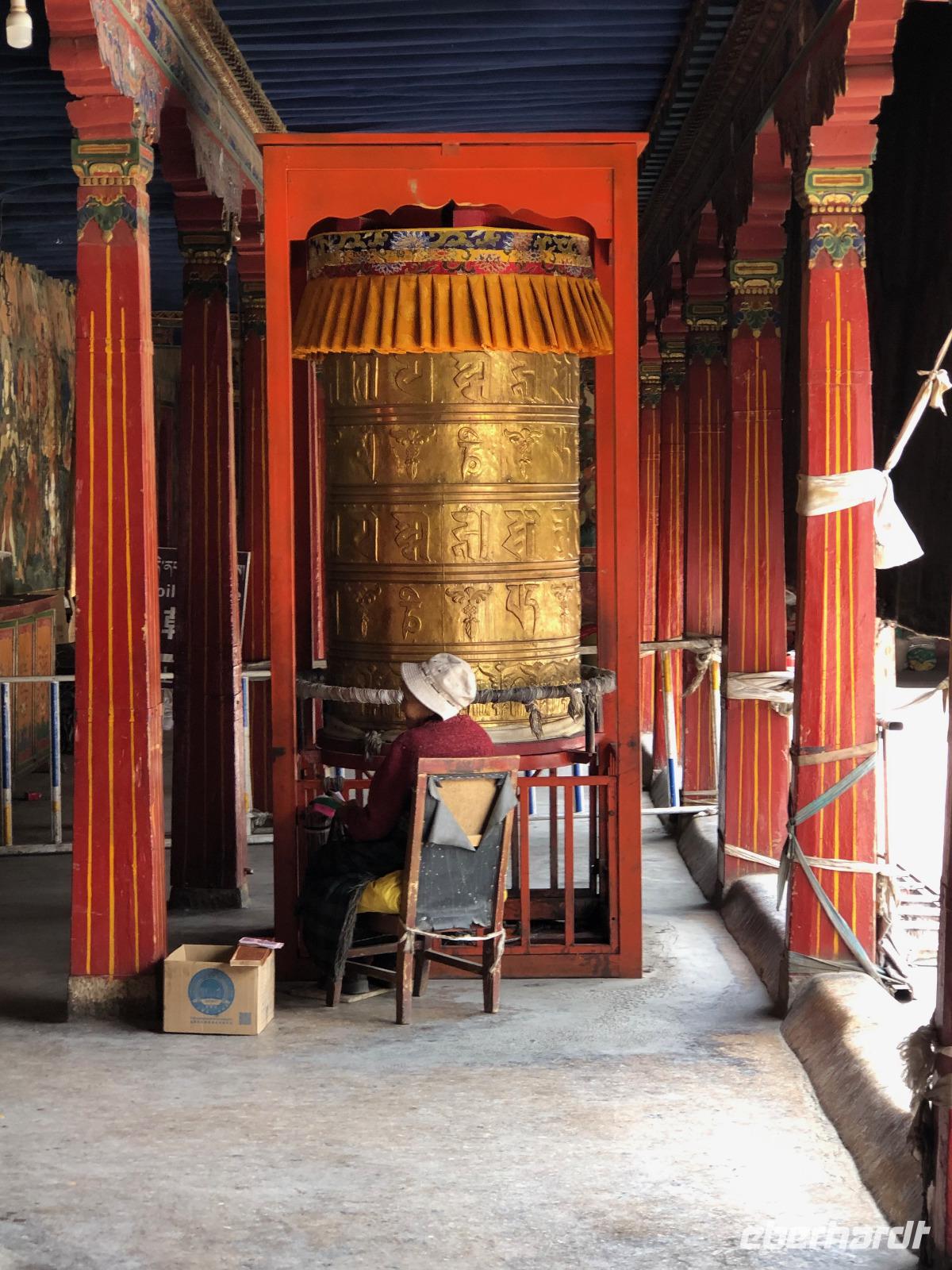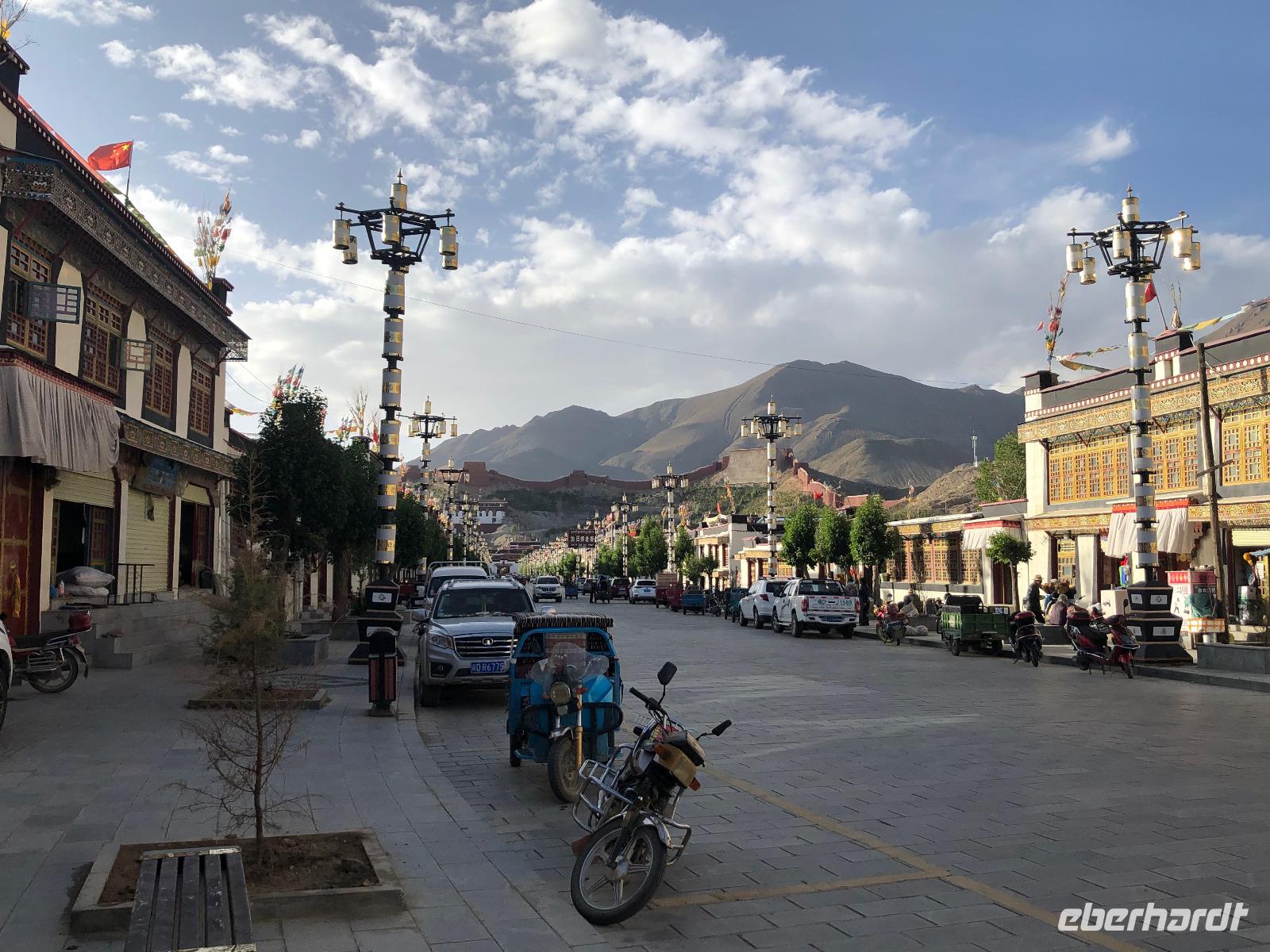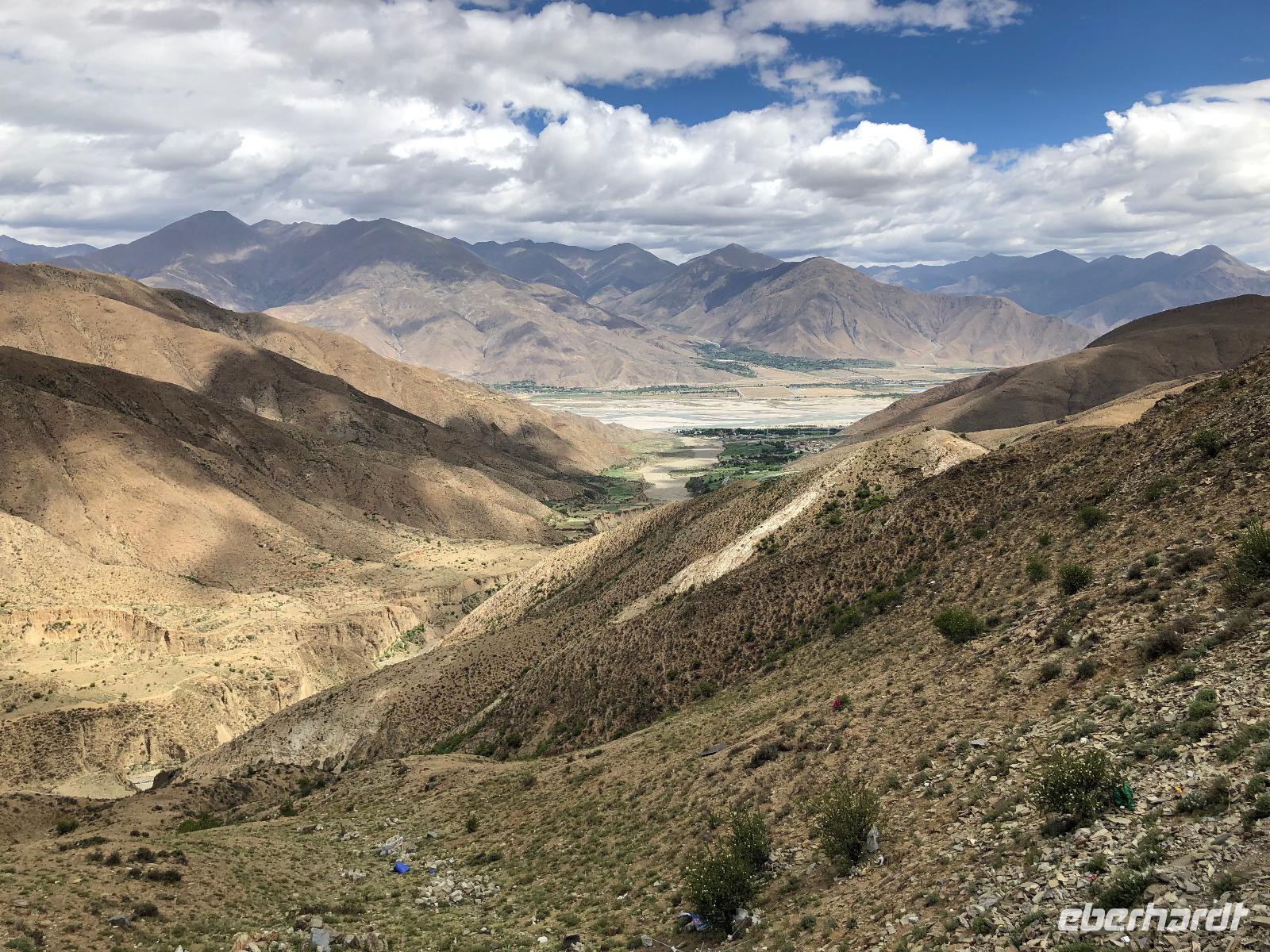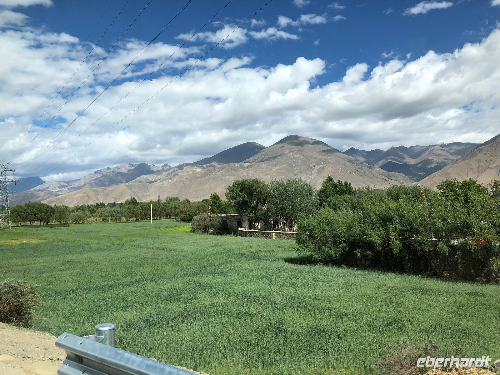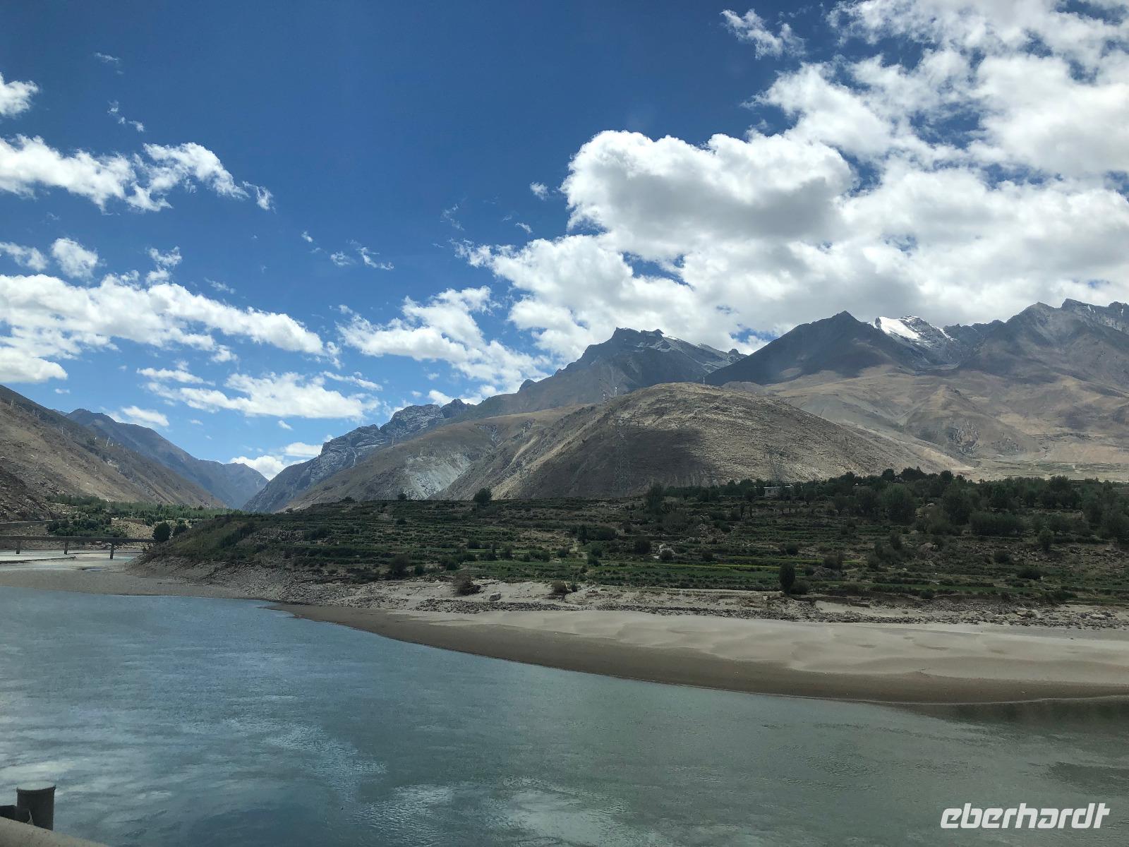 Am heutigen Reisetag sollte die atemberaubende Natur im Mittelpunkt stehen. Wir verabschiedeten uns nach dem Frühstück vorerst von Lhasa und begaben uns tiefer in die tibetische Bergwelt hinein. Nach etwas mehr als anderthalb Stunden Fahrt hielten wir im Dorf Gangdui, wo wir bei einem kleinen Spaziergang und einem Besuch bei einem Bauern das dörfliche Leben kennenlernten. Wir probieren Buttertee, erhielten viele Informationen und konnten dabei einen kleinen Einblick in die Lebensverhältnissen eines typischen tibetischen Dorfes bekommen. Zurück im Bus bekamen wir kurze Zeit später regelrechte Pilgerströme zu Gesicht, die sich an eine fünfstündige Umrundung eines in der Nähe gelegenen heiligen Berges machten. Beeindruckend, aber auch etwas befremdlich. Weiter ging es immer tiefer bzw. höher in das Gebirge hinein. Um die Mittagszeit hielten wir erneut, dieses Mal oberhalb einer Pass-Straße mit schönem Blick auf den Yaluzangbu-Fluss. Das an solchen Plätzen gern auch der eine oder andere Yuan verdient werden will, war nur folgerichtig. Insbesondere das Fotografieren stand hierbei im Vordergrund. Touristen auf/mit ruhig gestellten Yaks oder Tibetischen Mastiffs, die mit Sonnenbrillen verschönert alsbald diverse Instagram-Accounts schmücken würden. Skurril, Makaber, Tierquälerei. Verantwortungsbewusste Reisende wissen, was sie zu tun haben. Kurze Zeit später erreichten wir den 4998 hoch gelegenen Khamba-La-Pass, von wo aus wir einen wunderschönen Blick auf den knapp 500 Meter tieferliegenden türkisfarbenen Yamdrok-See hatten. Da das Wetter wunderbar und die Temperaturen angenehm waren, unternahmen wir kurzerhand einen kleinen Spaziergang am Ufer des Skorpion-Sees, wie sein Name auch übersetzt wird. Für die Tibeter gehört er zu den heiligen Seen und wir konnten uns seiner stillen Faszination ebenfalls nicht entziehen. Wir setzten unsere Fahrt in Richtung Gyantse fort und erreichten am frühen Nachmittag den Karo-La-Pass in einer Höhe von 5020 Metern. Tibetische Gebetsfahnen, eine Stupa und der Karo-Gletscher im Hintergrund waren großartige Fotomotive, auch wenn das Atmen in dieser Höhe schon anstrengend wurde. Am Simila-Stausee, den wir wenig später erreichten, flatterten unzählige bunte Gebetsfahnen, welche mit dem wunderschönen See im Hintergrund ebenfalls ein tolles Fotomotiv abgaben. Den letzten Abschnitt unserer Strecke nach Gyantse absolvierten wir dann in einem Stück, so dass wir die knapp 60.000 Einwohner zählende Kleinstadt am frühen Abend erreichten. Nach dem Zimmerbezug und einem stärkenden Abendessen spazierten wir noch in die Altstadt von Gyantse, wo wir den Einheimischen beim Würfeln zusahen, mit ein paar Kindern Fußball spielten und die ruhige und unaufgeregte Atmosphäre des Ortes und der Menschen um uns herum genossen. Die hoch über der Stadt thronende Festung war darüber hinaus im Licht der untergehenden Sonne ein weiteres schönes Fotomotiv.