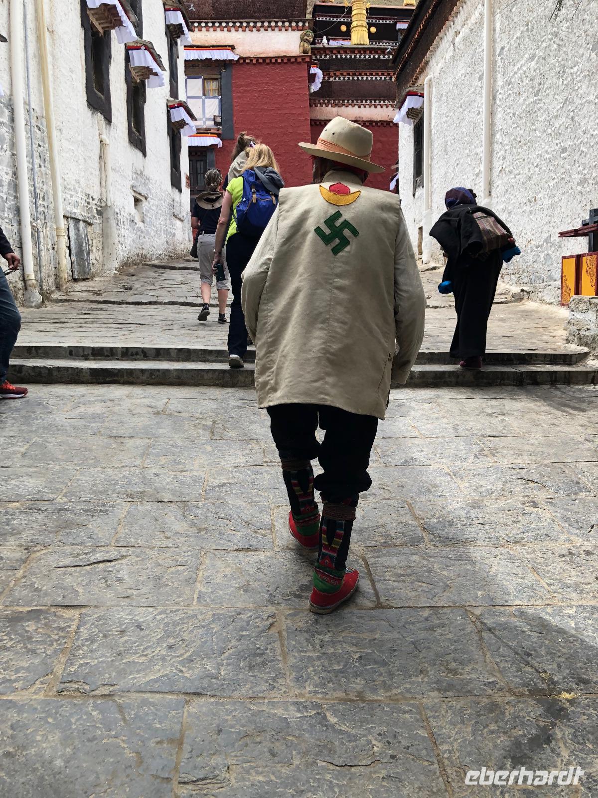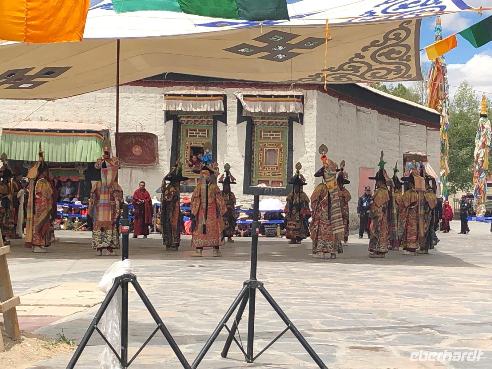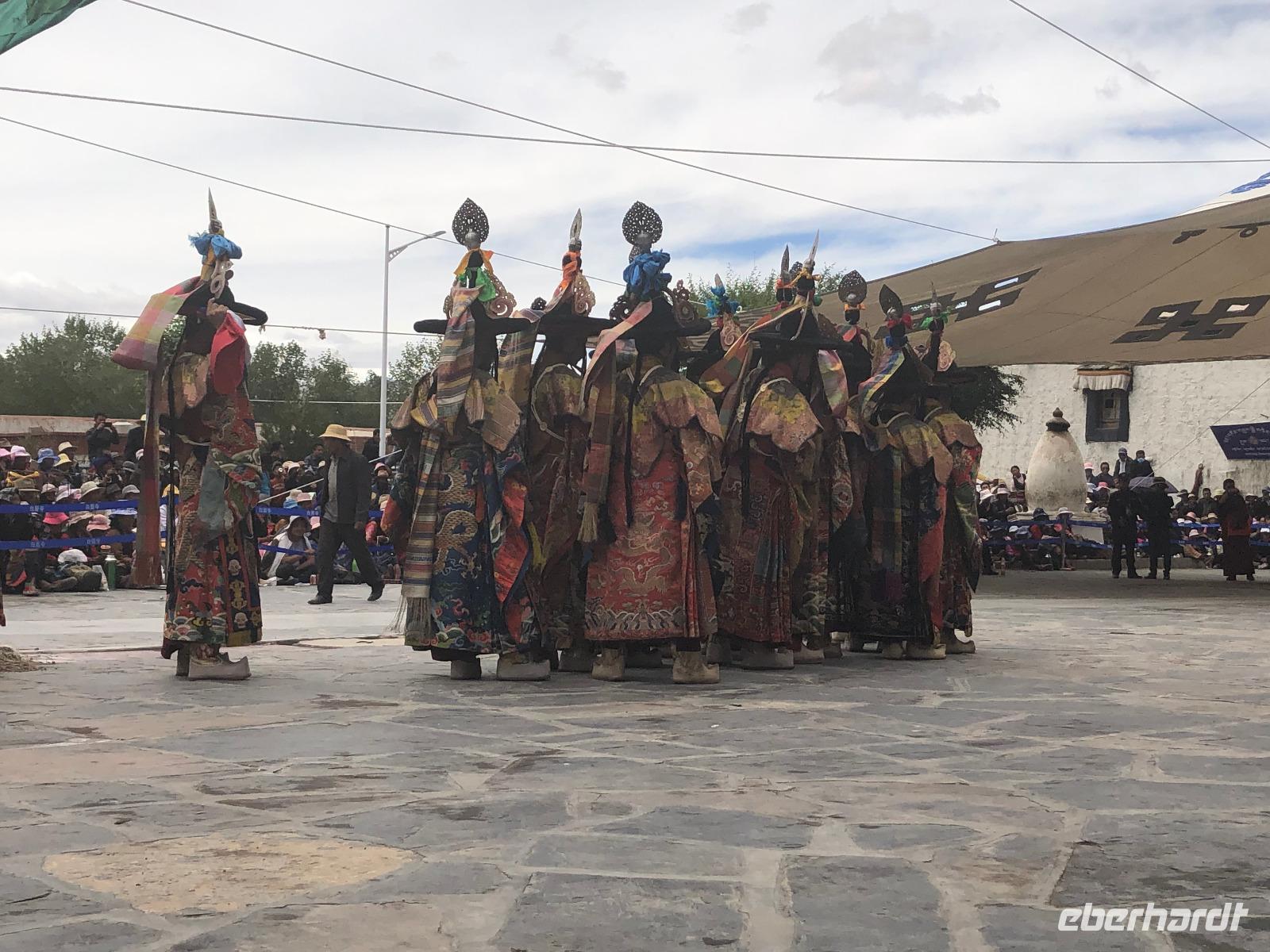 Bevor wir an diesem Tag unsere Reise nach Shigatse fortsetzten, besuchten wir das nahe gelegene buddhistische Palchoe-Kloster mit seiner berühmten Kumbum-Stupa oder Pagode der 10000 Buddhas, die figürlich oder als Wandmalereien in der Pagode verehrt werden. Darüber hinaus genießt das Kloster eine besondere Bedeutung im tibetischen Buddhismus, vereint es doch drei Glaubensrichtungen auf engstem Raum. Als wir die große Versammlungshalle betraten, schlug uns wie in allen Klöstern Tibets der unverwechselbare Geruch nach brennender Yak-Butter entgegen, welche als Brennstoff für die vielen kleinen Lampen verwendet wird. Seit Jahrhunderten praktiziert, manifestiert sie sich als Patina für alle Zeiten in den Wänden und Gemäuern der Kapellen, Schreine und Pagoden. Doch Yak-Butter wird nicht nur von den Gläubigen als Opfergabe verwandt, sie hat auch in der regionalen Küche eine große Bedeutung. Als Hauptbestandteil für den allgegenwärtig getrunkenen Buttertee, dem tibetischen Nationalgetränk, ist sie so etwas wie ein Grundnahrungsmittel. Für europäische Geschmäcker ist sie mindestens gewöhnungsbedürftig, wird aber jedem Gast zur Begrüßung gereicht. Unser Besuch im Kloster sollte sich als besonders glücklich erweisen, denn an diesem Tag gab es eine Aufführung eines Cham-Tanzes, eines tibetischen Maskentanzens, der Unheil und Geister abwehren soll. Das ganze Kloster war in Vorbereitung auf dieses Ereignis auf den Beinen und Pilger aus allen Richtungen füllten allmählich den Platz vor der großen Versammlungshalle, wo die Tänze stattfanden. Wir konnten bei einer kleinen Kostümprobe zugegen sein und selbst eine Maske anprobieren. Die anschließenden rituellen Tänze dauerten Stunden und folgten dabei einer festgelegten Choreographie, begleitet vom monotonen Geräusch der Stieltrommeln und Paarbecken. Fasziniert vom Auftritt der Maskentänzer, aber allmählich unter Zeitdruck mussten wir am frühen Nachmittag unsere Tour fortsetzen, denn unser Etappenziel hieß Shigatse, Heimat des bedeutenden Tashilhunpo-Klosters und ehemaliger Sitz des Panchen Lama. Nach knapp zweistündiger Fahrt erreichten wir die zweitgrößte Stadt Tibets und folgten der Ausschilderung zum Kloster. 1447 gegründet, war es ab dem 17. Jahrhundert Sitz des Panchen Lama. Aufgrund seiner exponierten Bedeutung wurde das Kloster im Laufe der Zeit ständig erweitert und nimmt heute eine Fläche von knapp 300.000 Quadratmeter ein. Wir besichtigten unter anderem die Maitreya-Halle mit der 26 Meter hohen sitzenden Buddha-Statue, die aus 250 Kilogramm Gold und mehr als 100 Tonnen Kupfer und Messing hergestellt wurde. Weitere Besichtigungspunkte waren das Grabmal des 4. und 10. Panchen Lama sowie der Kelsang-Tempel. Nach dieser ausgiebigen Klostertour hatten wir uns ein stärkendes Abendessen verdient, welches wir im Songtsen Tibetan Restaurant einnahmen. Leckeres tibetisches Essen, natürlich wieder mit einer Yak-Fleisch-Variation, ließ uns schnell wieder zu Kräften kommen, so dass wir anschließend noch ein wenig im Hotel zusammensaßen und ein verspätetes Bergfest feierten. Angestoßen wurde mit chinesischem Reisschnaps, aus Gründen der Völkerverständigung gesellte sich eine deutsche Flasche Jägermeister dazu. Auf knapp 4000 Meter Höhe sollte man vorsichtig mit Alkohol umgehen, wir tranken ihn deshalb aus rein medizinischen Gründen. Zur Vor- und Nachsorge von Verdauungsproblemen und Bauchgrimmen.