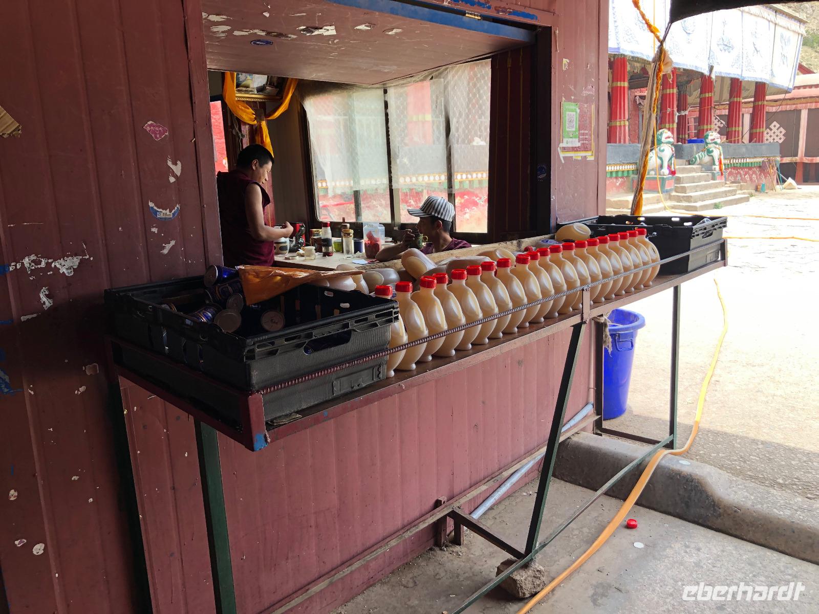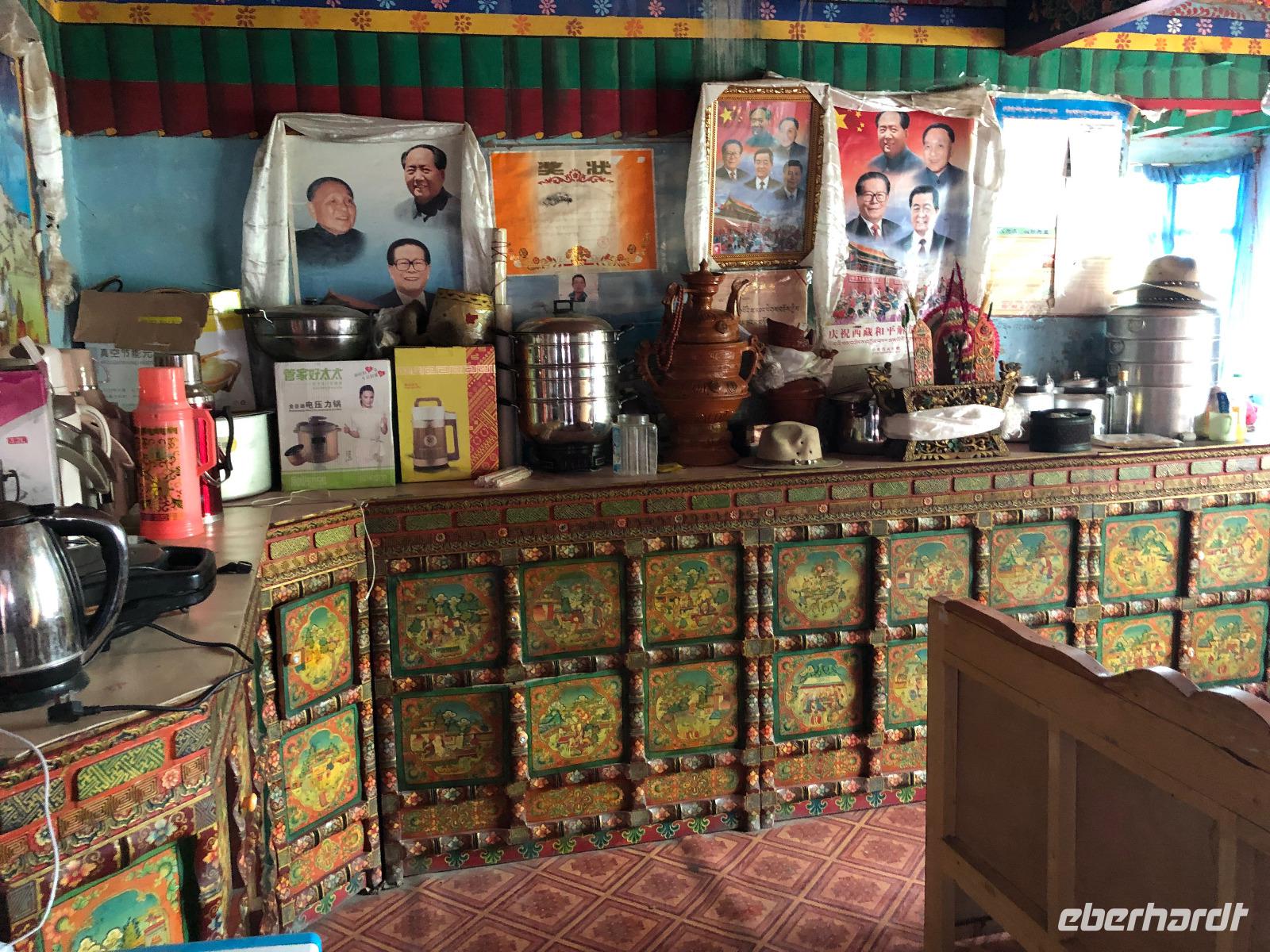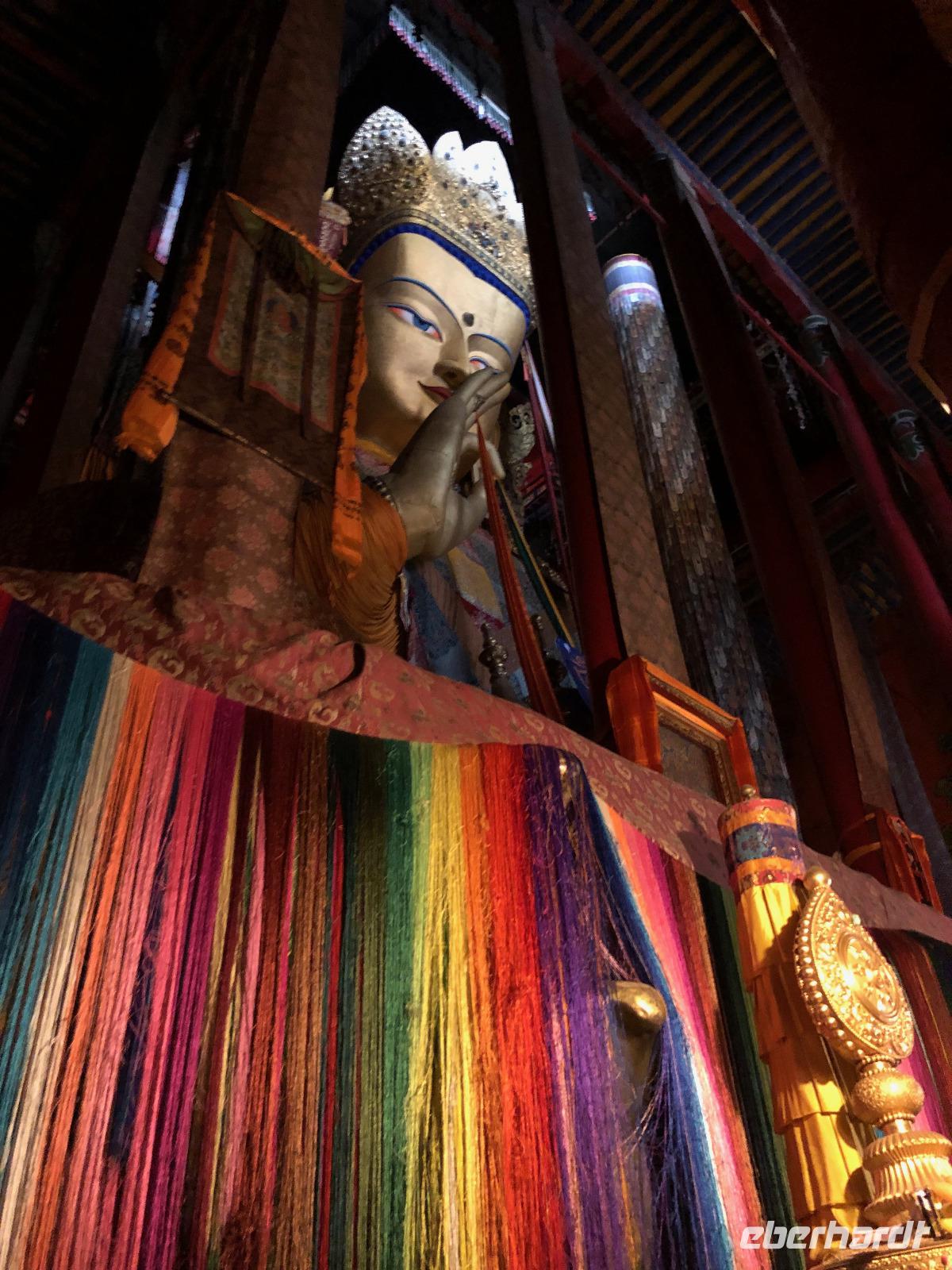 Bevor wir an diesem Tag unsere Reise nach Shigatse fortsetzten, besuchten wir das nahe gelegene buddhistische Palchoe-Kloster mit seiner berühmten Kumbum-Stupa oder Pagode der 10000 Buddhas, die figürlich oder als Wandmalereien in der Pagode verehrt werden. Darüber hinaus genießt das Kloster eine besondere Bedeutung im tibetischen Buddhismus, vereint es doch drei Glaubensrichtungen auf engstem Raum. Als wir die große Versammlungshalle betraten, schlug uns wie in allen Klöstern Tibets der unverwechselbare Geruch nach brennender Yak-Butter entgegen, welche als Brennstoff für die vielen kleinen Lampen verwendet wird. Seit Jahrhunderten praktiziert, manifestiert sie sich als Patina für alle Zeiten in den Wänden und Gemäuern der Kapellen, Schreine und Pagoden. Doch Yak-Butter wird nicht nur von den Gläubigen als Opfergabe verwandt, sie hat auch in der regionalen Küche eine große Bedeutung. Als Hauptbestandteil für den allgegenwärtig getrunkenen Buttertee, dem tibetischen Nationalgetränk, ist sie so etwas wie ein Grundnahrungsmittel. Für europäische Geschmäcker ist sie mindestens gewöhnungsbedürftig, wird aber jedem Gast zur Begrüßung gereicht. Unser Besuch im Kloster sollte sich als besonders glücklich erweisen, denn an diesem Tag gab es eine Aufführung eines Cham-Tanzes, eines tibetischen Maskentanzens, der Unheil und Geister abwehren soll. Das ganze Kloster war in Vorbereitung auf dieses Ereignis auf den Beinen und Pilger aus allen Richtungen füllten allmählich den Platz vor der großen Versammlungshalle, wo die Tänze stattfanden. Wir konnten bei einer kleinen Kostümprobe zugegen sein und selbst eine Maske anprobieren. Die anschließenden rituellen Tänze dauerten Stunden und folgten dabei einer festgelegten Choreographie, begleitet vom monotonen Geräusch der Stieltrommeln und Paarbecken. Fasziniert vom Auftritt der Maskentänzer, aber allmählich unter Zeitdruck mussten wir am frühen Nachmittag unsere Tour fortsetzen, denn unser Etappenziel hieß Shigatse, Heimat des bedeutenden Tashilhunpo-Klosters und ehemaliger Sitz des Panchen Lama. Nach knapp zweistündiger Fahrt erreichten wir die zweitgrößte Stadt Tibets und folgten der Ausschilderung zum Kloster. 1447 gegründet, war es ab dem 17. Jahrhundert Sitz des Panchen Lama. Aufgrund seiner exponierten Bedeutung wurde das Kloster im Laufe der Zeit ständig erweitert und nimmt heute eine Fläche von knapp 300.000 Quadratmeter ein. Wir besichtigten unter anderem die Maitreya-Halle mit der 26 Meter hohen sitzenden Buddha-Statue, die aus 250 Kilogramm Gold und mehr als 100 Tonnen Kupfer und Messing hergestellt wurde. Weitere Besichtigungspunkte waren das Grabmal des 4. und 10. Panchen Lama sowie der Kelsang-Tempel. Nach dieser ausgiebigen Klostertour hatten wir uns ein stärkendes Abendessen verdient, welches wir im Songtsen Tibetan Restaurant einnahmen. Leckeres tibetisches Essen, natürlich wieder mit einer Yak-Fleisch-Variation, ließ uns schnell wieder zu Kräften kommen, so dass wir anschließend noch ein wenig im Hotel zusammensaßen und ein verspätetes Bergfest feierten. Angestoßen wurde mit chinesischem Reisschnaps, aus Gründen der Völkerverständigung gesellte sich eine deutsche Flasche Jägermeister dazu. Auf knapp 4000 Meter Höhe sollte man vorsichtig mit Alkohol umgehen, wir tranken ihn deshalb aus rein medizinischen Gründen. Zur Vor- und Nachsorge von Verdauungsproblemen und Bauchgrimmen.
