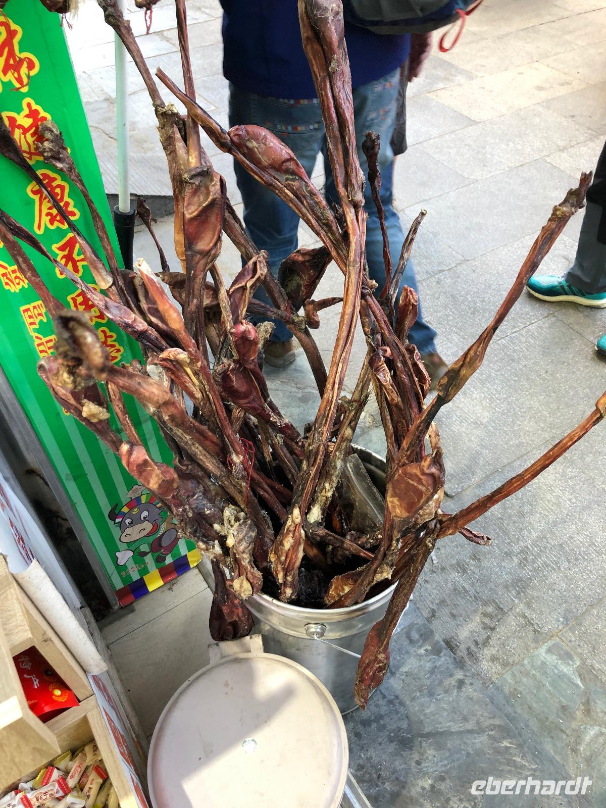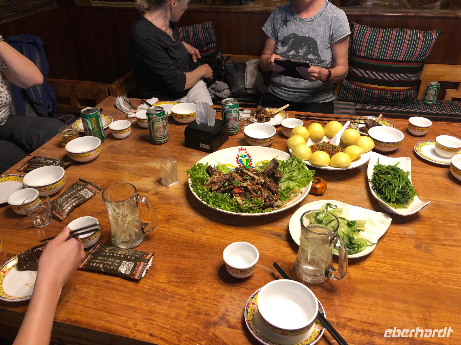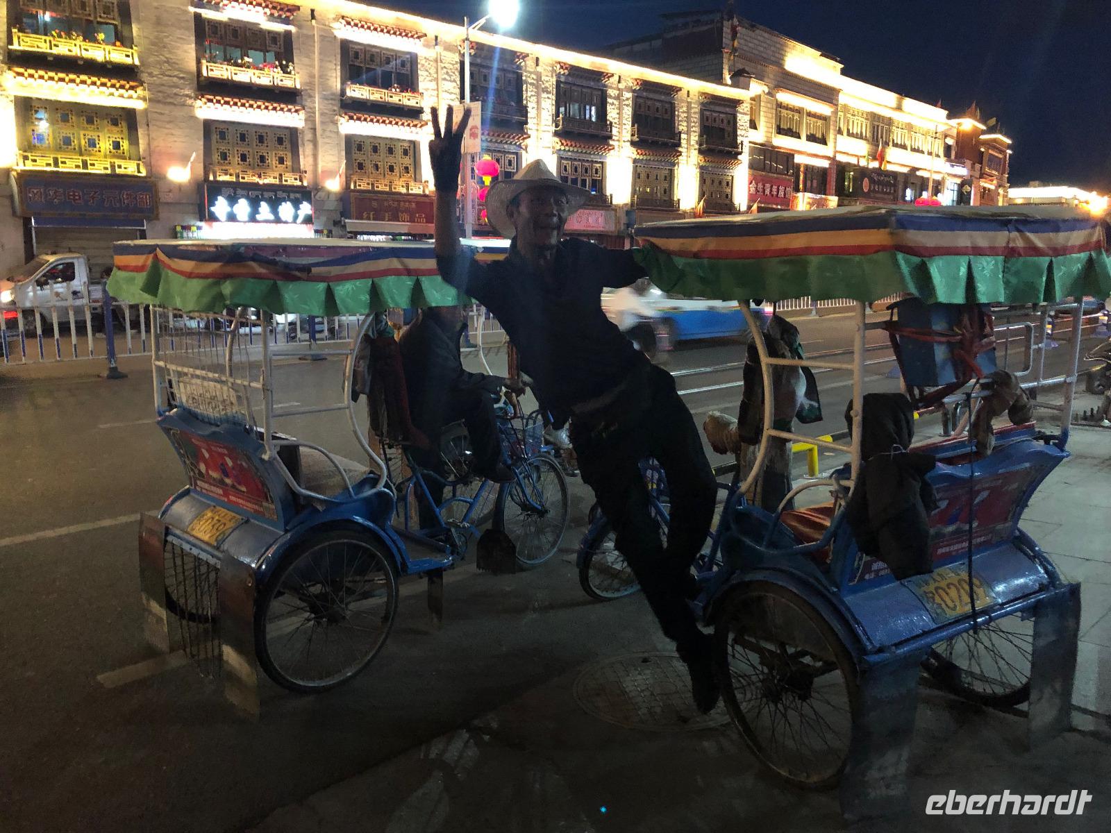 Unser vorerst letzter Tag in Lhasa sollte weitere Highlights eines Tibet-Besuches beinhalten. Nach dem Frühstück galt unser Augenmerk dem Jokhang-Tempel, unweit unseres Hotels gelegen und das Zentralheiligtum der Tibeter. Dem tibetischen Glauben nach sollte man mindestens einmal im Leben zum Jokhang gepilgert sein. Bei unserem Besuch sahen wir deshalb allenthalben Pilger, die sich im Uhrzeigersinn die das Heiligtum umschließende Barkhor-Straße entlang bewegten. Nicht wenige von ihnen immer wieder niederkniend und dabei vorwärtsrutschend. Was für uns ungewohnt aussah, war für die Einheimischen ganz normal. Diese wiederum bestaunten die hellhäutigen, teilweise blonden Ausländer und baten ein ums andere Mal um ein Foto oder eine Unterschrift in dieser ach so komischen deutschen Sprache. Weiter ging unsere Tour zu einem der wohl weltweit bekanntesten Bauwerke, dem majestätischen Potala-Palast im Herzen von Lhasa. Das einstige Zentrum der politischen und religiösen Macht Tibets war gleichzeitig Sitz der Dalai Lama. Es unterteilt sich in einen Weißen und einen Roten Palast. Der „weiße", für Touristen zugängliche Teil beherbergte einst die Regierungsräumlichkeiten, während der „rote" Teil religiösen Zwecken diente und sich hier die Wohnräume des Dalai Lama befanden. Wir mussten uns strengen Sicherheitskontrollen unterziehen, bevor wir in das Gebäude hineindurften. Um den Millionen Besuchern, die jährlich den Palast besichtigen, einigermaßen geordneten Zugang zu verschaffen, ist der Aufenthalt auf eine Stunde beschränkt. Die Zeit wird allerdings erst ab Betreten des Weißen Palastes „gestoppt", da etliche Stufen hinauf in das dreizehnstöckige Gebäude zu bewältigen sind. Und das kostet Zeit. Nach einer kleinen Mittagsmahlzeit galt unsere Aufmerksamkeit dem Sommerpalast des Dalai Lama, dem Norbulingka. Gegründet im Jahre 1755 vom 7. Dalai Lama wurde er bis zum Jahre 1959, als der 14. Dalai Lama ins Exil nach Indien ging, als Sommerpalast genutzt. Er liegt nur unweit des Potala, des Winterpalastes und das gesamte 36 Hektar große Gelände gilt als größte tibetische Parkanlage und grüne Lunge Lhasas. Alle drei Objekte, die wir heute besuchten, gehören seit dem Jahre 1994 zum UNESCO-Weltkulturerbe, seit den 2000er Jahren auch gemeinsam als Ensemble. Den Abschluss unseres Tages bildete ein tibetisch-nepalesisches Abendessen, welches wir in angenehmer Atmosphäre bei tibetischer Folklore zu uns nahmen. Gekochtes Yak-Fleisch, gegrillte Lamm-Rippchen, eine Art gedünstete Buchteln mit einer würzigen Getreidefüllung, Yams-Wurzelgemüse, Mangold, Wasserspinat und viele weitere lokale Köstlichkeiten stillten unseren Hunger. Der anschließende Heimweg wurde nach Gusto zu Fuß oder mit einer der unzähligen Rikschas zurückgelegt.