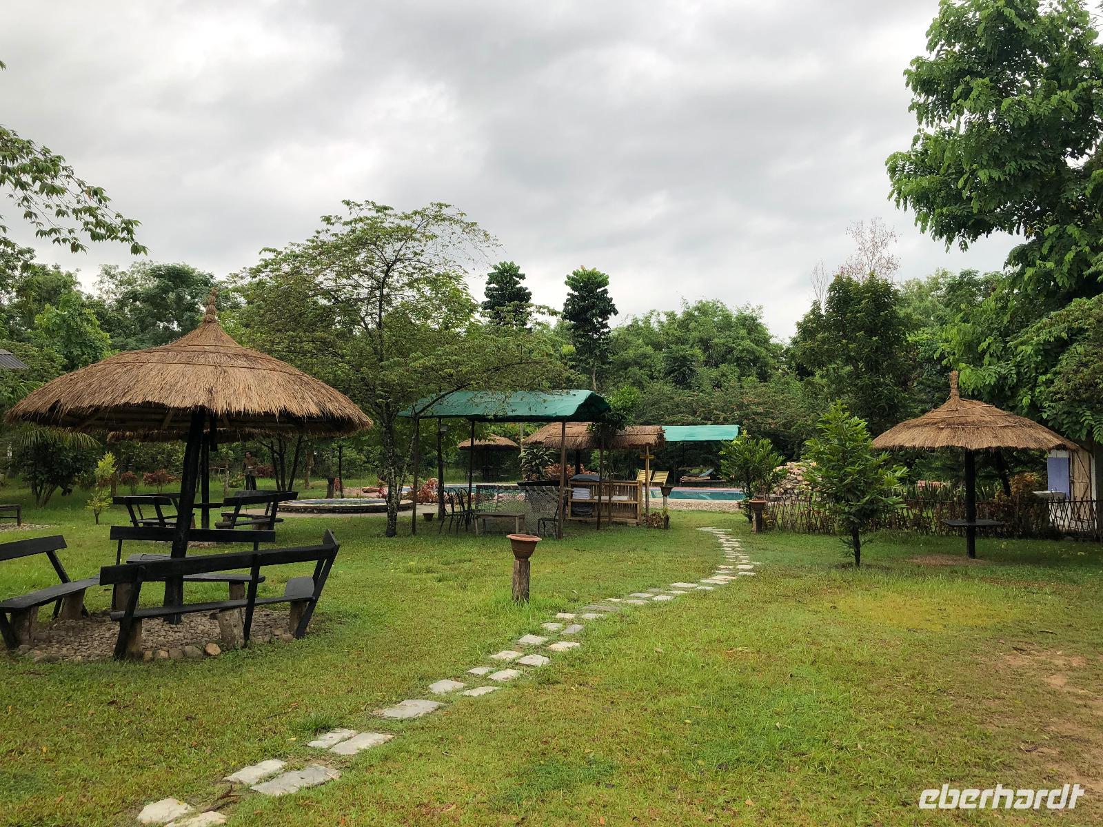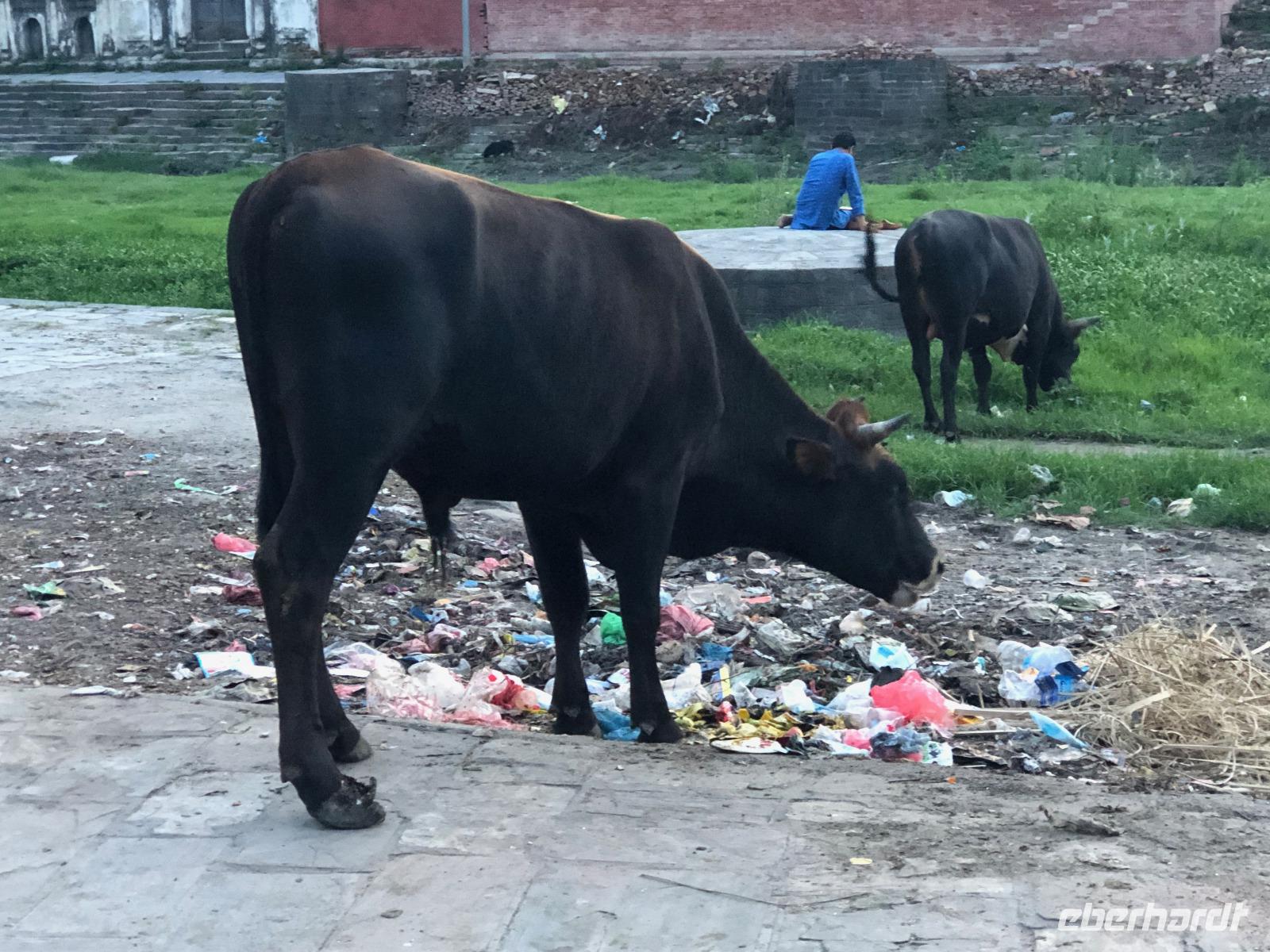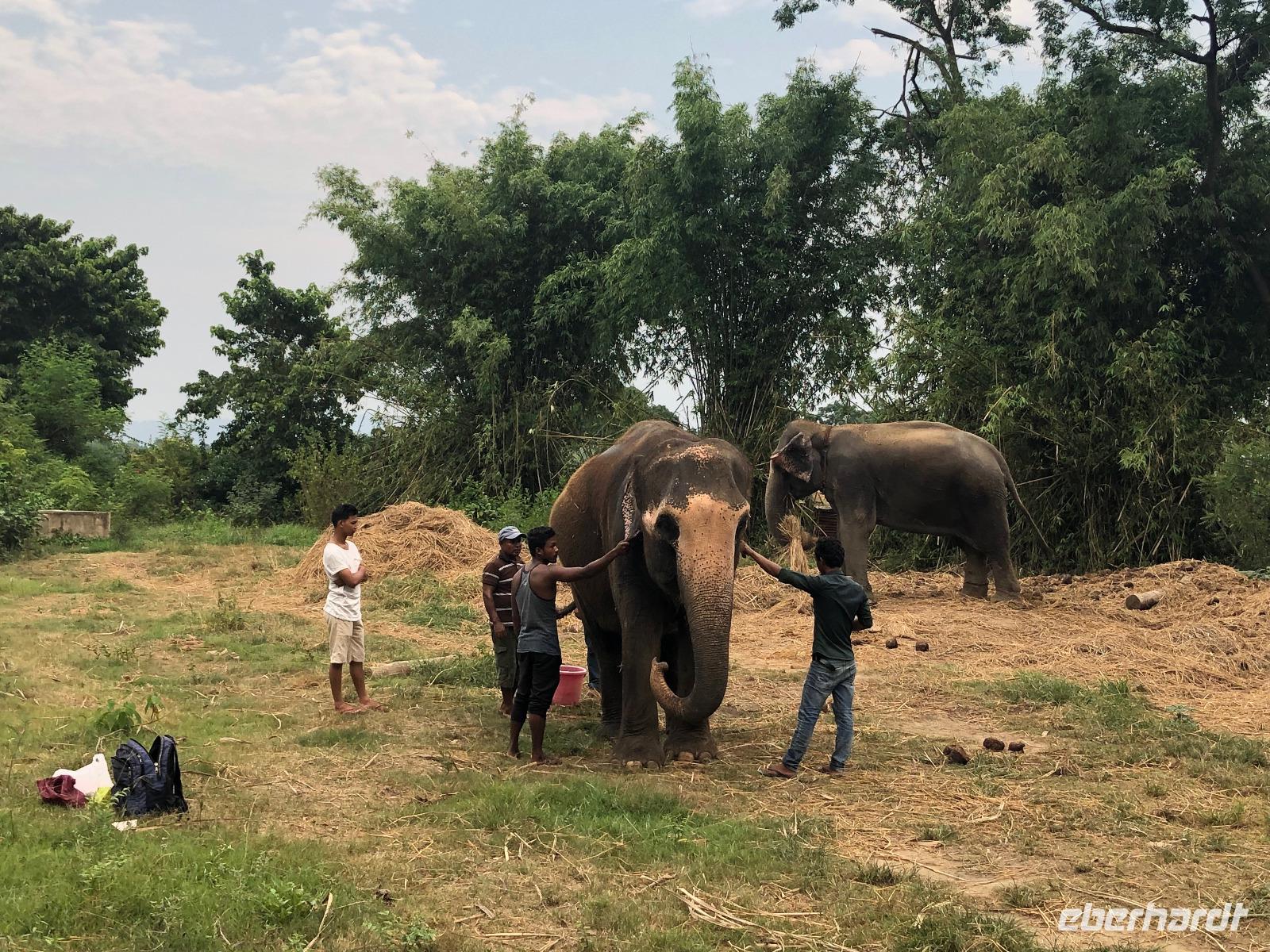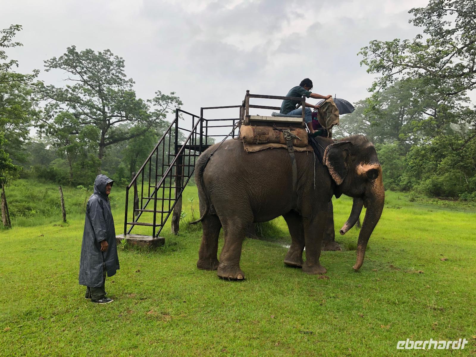 Ein zeitiger Weckruf läutete ein vielseitiges Tagesprogramm ein, welches unter anderem aus einem Elefantenritt und einer Jeep-Safari bestehen sollte. Doch der wolkenverhangene Himmel, der uns an diesem Morgen begrüßte, verhieß nichts Gutes. Da wir aber grundsätzlich positiv an jeden Tag herangingen und unsere Hoffnungen auf ein Wegziehen regenträchtiger Wolken ruhten, bereiteten wir uns mit großer Vorfreude auf den in Kürze beginnenden Elefantenritt vor. Mit dem Jeep gelangten wir zum Rendezvous-Punkt, wo wir zu jeweils Viert auf den Rücken der hier wartenden Dickhäuter stiegen. Wenn man glaubt, schon auf einem Pferd hoch zu sitzen, sollte man unbedingt mal auf den Rücken eines Elefanten steigen. Das ist wie ein Blick aus einem Fenster im zweiten Stock eines Mehrfamilienhauses. Man sieht zwar die Nachbarn noch, tut sich aber mit dem Händeschütteln schwer, weil einfach der Arm zu kurz ist. So sitzt es sich auf einem Elefanten. Mit dem Beginn der Elefantensafari in das Dickicht des nahegelegenen Waldes setzte der Regen ein. Wir waren zwar mit entsprechenden Jacken und ähnlichem Ölzeug versorgt, mussten aber feststellen, dass sich Wasser im Laufe der Zeit nicht von solch unbedeutenden Hindernissen am Durchnässen menschengemachter textiler Generika hindern ließ. Unsere Elefanten störte das Wetter nicht und mit stoischer Ruhe bahnten sie sich ihren Weg durch Wiesen, Wälder und finsteres Unterholz, immer auf der Suche nach dem nächsten Leckerbissen in Form von Gräsern und Ästen. Das wir bei diesem Wetter kaum Tiere zu sehen bekommen würden, ahnten wir alle. Da war die Freude schon groß, wenn es mal ein kleines Reh oder einen Pfau zu sehen gab. Der Rest unserer Beobachtungen konzentrierte sich auf das Versickern der himmlischen Sturzfluten in den Fasern unserer Hightech-Kleidung. Wasser bahnt sich immer seinen Weg, in unserem Fall vom Kopf den Rücken hinab durch die Underwear direkt in die Schuhe. Halleluja, wer hat in seinem Leben noch nicht von einem „Ich-reite-Klatschnass-einen Elefanten"-Ritt geträumt. Doch wohl alle, oder? Da der gemeine indische Hausgebrauchs-Standard-Elefant kein Schaltgetriebe hatte, genossen wir im Vorwärtsgang I eine zweistündige gemächliche Rundreise durch die (Regen)Wälder des Chitwan-Nationalparks. Der rasant steigende Nässegrad unserer Kleidung stand diametral zur Einsicht, dass die „Festung Trockenheit" damit endgültig gefallen war. Solange wir nicht ertranken, nahmen wir ab jetzt das um uns wütende Element klaglos an. Beinahe wie Aphrodite, die Schaumgeborene, traten wir wenig später aus den Fluten, respektive vom Rücken unserer Elefanten und suchten Schutz unter der löchrigen Plane eines uralten Indiana-Jones-Jeeps. Kulisse ist alles, Komfort dagegen nichts. Uns gefiel es. Wenig später erreichten wir unsere Unterkunft, wo trockene Unterhosen, Flip-Flops und ein großes Badehandtuch auf uns warteten. Nach der individuellen Trockenlegung trafen wir uns alle zum ausgiebigen Frühstück in der Dining-Hall, immer noch begleitet von herniederprasselnden Wassermassen. In uns wuchs die Erkenntnis, dass der vielbesungene Monsun sein (Wasser)Werk am heutigen Tag beginnen wollte. In der Hoffnung auf nachlassende Regenfälle verbrachten wir die Zeit mit chillen, rumdösen, Schwätzchen halten, Buch lesen und Musik hören. Quasi ein Leben für Müßiggänger. Doch von Stunde zu Stunde wurde uns immer bewusster, dass wir unser heutiges Tagesprogramm auf keinen Fall wie geplant durchführen würden können. Der Regen ließ nicht nach, im Gegenteil, nach kurzen Phasen Nieselregens folgte unisono immer ein brachialer Platzregen. Wir machten deshalb aus der Not eine Tugend, versammelten uns zu Spiel und Spaß in der Meeting-Area und probierten von den regionalen schöngeistigen Getränken. Ein nepalesisches Kartenspiel lernten wir dabei auch. Man nehme vier Spieler, dreizehn Karten, orakelt die eigenen Stiche, Pik ist immer Trumpf und vier Karten sind ein Punkt... das ist in etwa die „Ganz-Kurz-Dödel-Fassung" für Spieler wie mich, die am Anfang alles verstanden, am Ende aber immer verloren. Spaß hat es trotzdem gemacht. Das am Ende des Tages immer alles gut wird (nicht nur in Rosamunde-Pilcher-Filmen), konnten wir mit großem Erstaunen auch in dieser Wildnis feststellen. Der Regen ließ allmählich nach, ach was sage ich, er hörte sogar auf; es gab eine wunderbare Folklore-Show der jugendlichen Dorfbewohner, welche uns mit indigenen Tänzen und Musik bestens unterhielten, wobei mittanzen ausdrücklich erwünscht war. Und zu aller guter Letzt labten wir uns an einem köstlichen BBQ-Buffet, welches dem ach so feuchten Tag eine rauchige-röstaromatische Abschlussnote gab. Chitwan - the humid beautiful land!