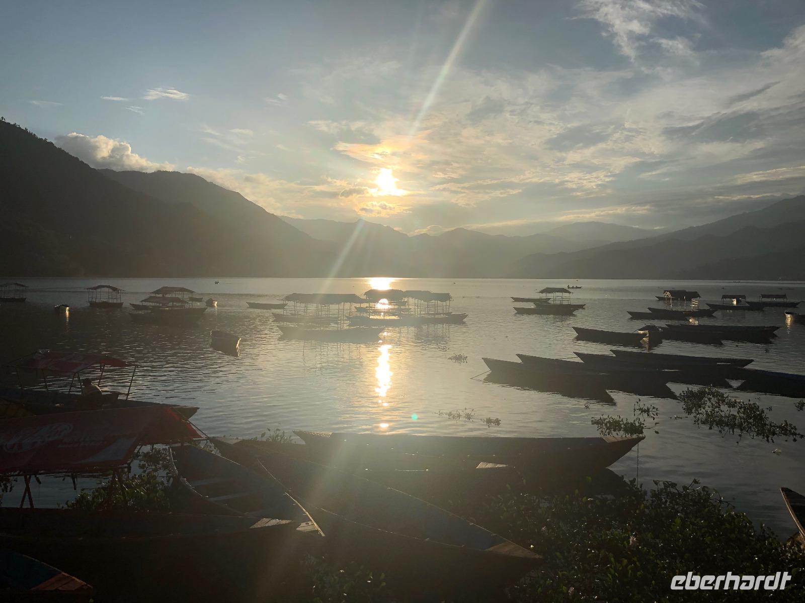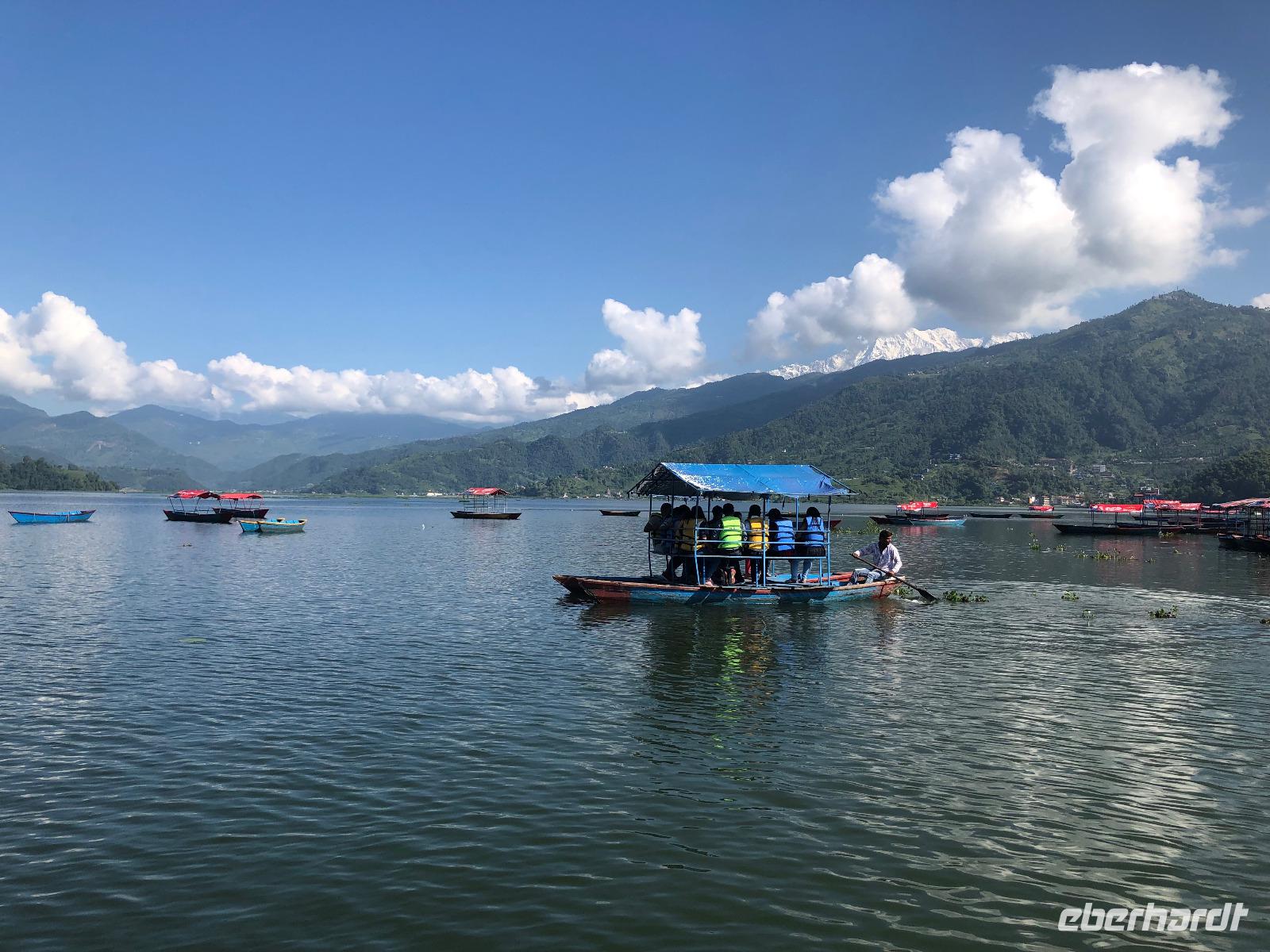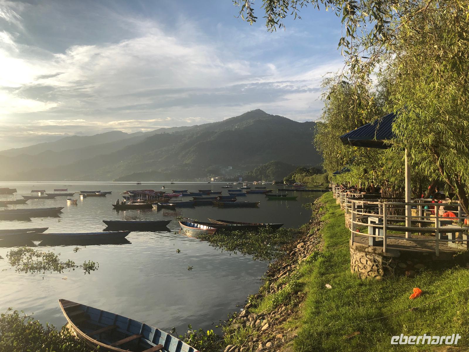 Wurden wir gestern von dunklen Regenwolken empfangen, strahlte uns heute der schönste Sonnenschein entgegen. So eine extreme Wechselwirkung gibt es wahrscheinlich nur in tropischen Regionen. Uns gefiel es, denn dadurch konnten wir problemlos die dem Wasser zum Opfer gefallenen Aktivitäten des gestrigen Tages nachholen. Nach dem Frühstück schwangen wir uns gemeinsam mit einem Park-Ranger wieder auf den alten Jeep, Modell Indiana-Jones, und fuhren in den Nationalpark zur Tier-Safari. Das war kein leichtes Unterfangen, wie wir bald merken sollten, denn ein Nationalpark war kein zoologischer Garten, wo sich die Tiere den Blicken der Besucher kaum entziehen konnten. Hier dagegen mussten wir suchen, Spuren lesen, auf Glück hoffen und den Geräuschen des Dschungels lauschen, um vielleicht das eine oder andere tierische Lebewesen zu Gesicht zu bekommen. Hoch oben auf der Wunschliste standen Bengalische Tiger, Panzernashörner, wilde Elefanten, Lippenbären und Krokodile. In der Reihenfolge waren wir variabel, nur gesehen hätten wir sie sehr gern. Und das möglichst heute, hier und innerhalb der nächsten zwei Stunden. Denkste, Touri! Das Leben ist kein Wunschkonzert, auch nicht in Nepal. Ganz leer im optischen Sinne sind wir dann doch nicht ausgegangen, unser Sichtkontakt beschränkte sich aber auf einige Rehe, Pfauen, einen pensionierten Elefanten, ein paar Early Birds sowie, gepriesen sei der Herr, ein überaus stattliches Panzernashorn und ein eher weniger stattliches Alligatörchen. Letzteres konnten wir am schilfigen Ufer des Rapti-Flusses ausmachen, als wir mit einem hölzernen Boot dem schlammigen Flusslauf folgten. Es war also durchaus eine erfolgreiche Safari, auch wenn sich das tierische Spektakulum in Grenzen hielt. Zurück in der Lodge erfuhren wir bei einem Elefantenbriefing interessante Fakten zu den hier lebenden Dickhäutern und konnten diese mit diversen Elefantenleckereien (Bananen und in Stroh gewickelte Reisknödel waren hier der Hit) auch selbst füttern. Selfie mit Elefant inklusive. Danach hieß es packen, denn wir wollten den Nationalpark gegen Mittag verlassen und uns nach Pokhara in Zentralnepal begeben. 150 Kilometer nepalesische „Bundesstraße", also knapp fünf Stunden Vollgas, Mut zur Lücke und Kurvenschneiderei. Aber unser Fahrer war Profi und wir hatten vollstes Vertrauen zu ihm. Er hat es bis zum letzten Tag auch immer gerechtfertigt. Wir fuhren also von der indischen Grenzregion zurück zu den Ausläufern der Achttausender, in unserem Fall zur weithin bekannten Annapurna-Kette, zu deren Füßen die zweitgrößte Stadt Nepals, Pokhara, liegt. Am zeitigen Abend bezogen wir unser Quartier im wunderschönen Shangri-La Village Ressort. Wer wollte, konnte anschließend eine kurze Entdeckerrunde am Phewa-See entlang unternehmen, bevor wir uns das Abendessen im Hotelrestaurant schmecken ließen.