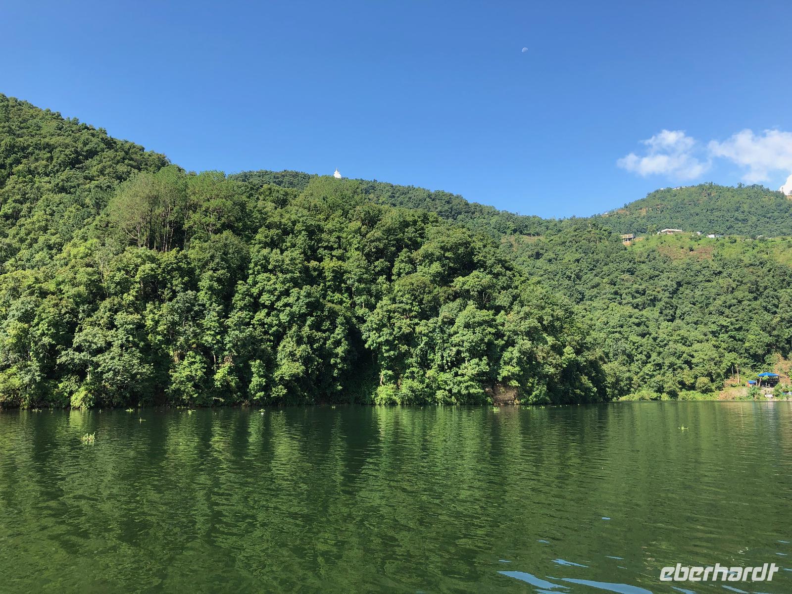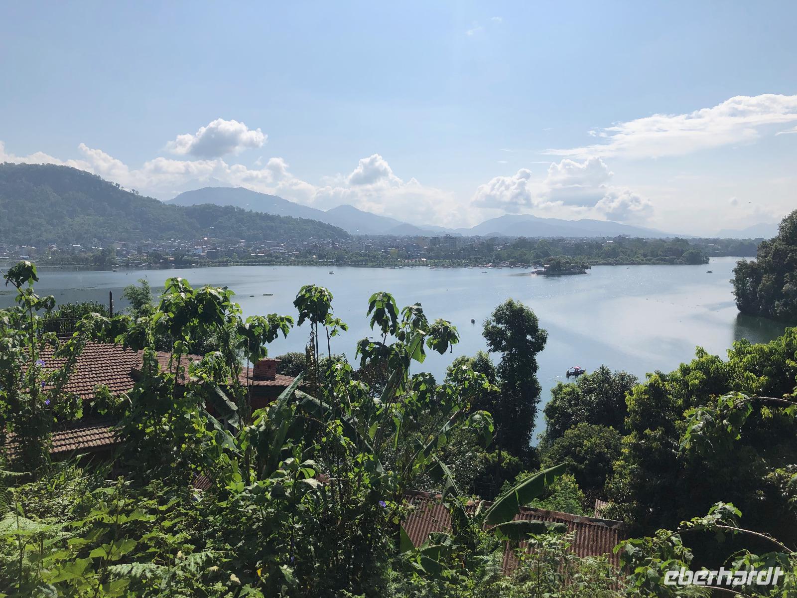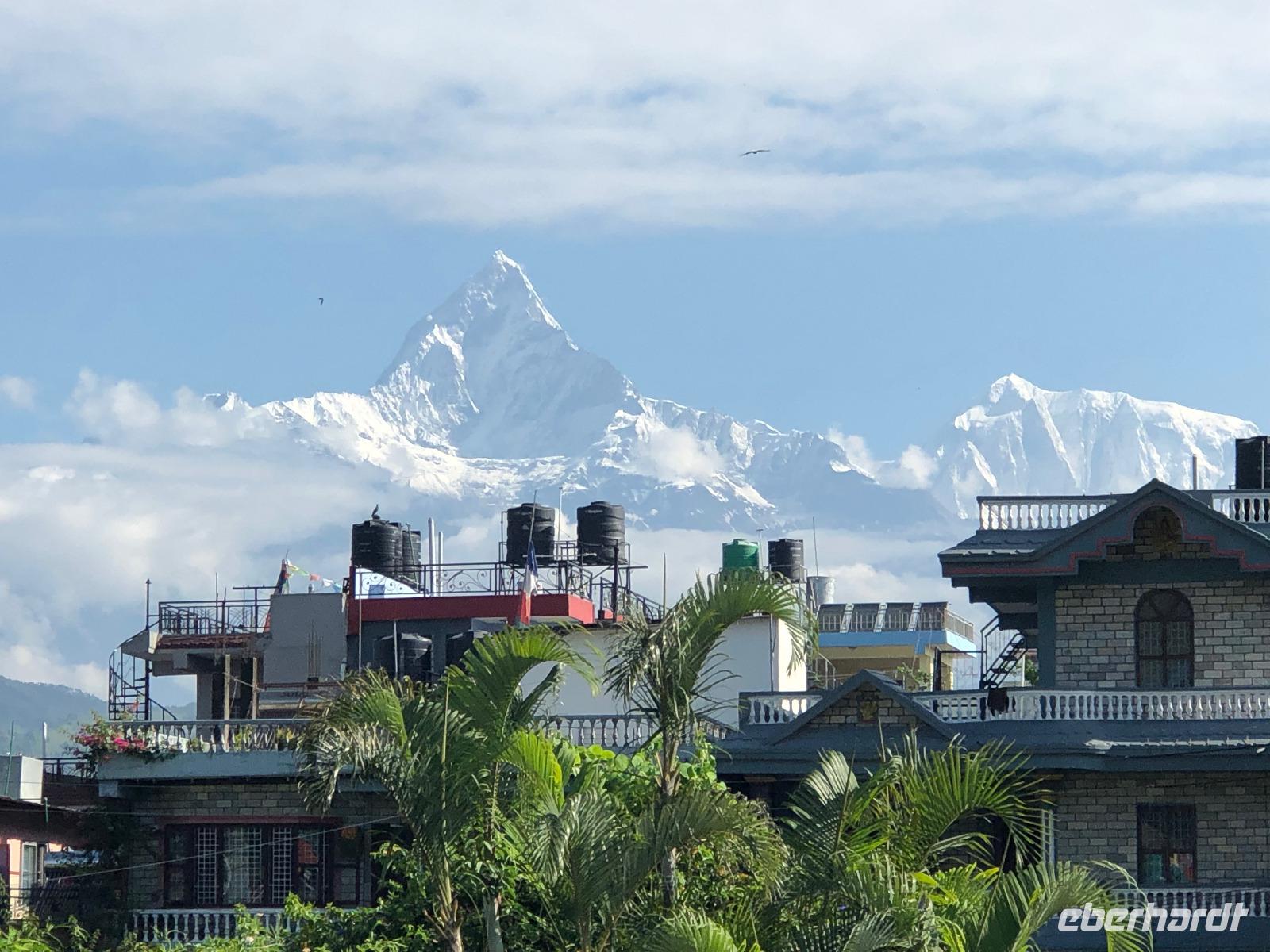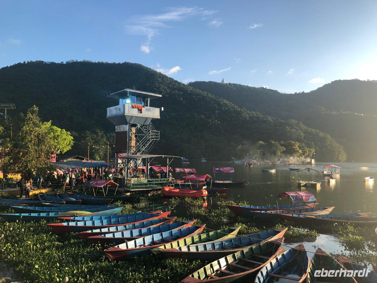 Wurden wir gestern von dunklen Regenwolken empfangen, strahlte uns heute der schönste Sonnenschein entgegen. So eine extreme Wechselwirkung gibt es wahrscheinlich nur in tropischen Regionen. Uns gefiel es, denn dadurch konnten wir problemlos die dem Wasser zum Opfer gefallenen Aktivitäten des gestrigen Tages nachholen. Nach dem Frühstück schwangen wir uns gemeinsam mit einem Park-Ranger wieder auf den alten Jeep, Modell Indiana-Jones, und fuhren in den Nationalpark zur Tier-Safari. Das war kein leichtes Unterfangen, wie wir bald merken sollten, denn ein Nationalpark war kein zoologischer Garten, wo sich die Tiere den Blicken der Besucher kaum entziehen konnten. Hier dagegen mussten wir suchen, Spuren lesen, auf Glück hoffen und den Geräuschen des Dschungels lauschen, um vielleicht das eine oder andere tierische Lebewesen zu Gesicht zu bekommen. Hoch oben auf der Wunschliste standen Bengalische Tiger, Panzernashörner, wilde Elefanten, Lippenbären und Krokodile. In der Reihenfolge waren wir variabel, nur gesehen hätten wir sie sehr gern. Und das möglichst heute, hier und innerhalb der nächsten zwei Stunden. Denkste, Touri! Das Leben ist kein Wunschkonzert, auch nicht in Nepal. Ganz leer im optischen Sinne sind wir dann doch nicht ausgegangen, unser Sichtkontakt beschränkte sich aber auf einige Rehe, Pfauen, einen pensionierten Elefanten, ein paar Early Birds sowie, gepriesen sei der Herr, ein überaus stattliches Panzernashorn und ein eher weniger stattliches Alligatörchen. Letzteres konnten wir am schilfigen Ufer des Rapti-Flusses ausmachen, als wir mit einem hölzernen Boot dem schlammigen Flusslauf folgten. Es war also durchaus eine erfolgreiche Safari, auch wenn sich das tierische Spektakulum in Grenzen hielt. Zurück in der Lodge erfuhren wir bei einem Elefantenbriefing interessante Fakten zu den hier lebenden Dickhäutern und konnten diese mit diversen Elefantenleckereien (Bananen und in Stroh gewickelte Reisknödel waren hier der Hit) auch selbst füttern. Selfie mit Elefant inklusive. Danach hieß es packen, denn wir wollten den Nationalpark gegen Mittag verlassen und uns nach Pokhara in Zentralnepal begeben. 150 Kilometer nepalesische „Bundesstraße", also knapp fünf Stunden Vollgas, Mut zur Lücke und Kurvenschneiderei. Aber unser Fahrer war Profi und wir hatten vollstes Vertrauen zu ihm. Er hat es bis zum letzten Tag auch immer gerechtfertigt. Wir fuhren also von der indischen Grenzregion zurück zu den Ausläufern der Achttausender, in unserem Fall zur weithin bekannten Annapurna-Kette, zu deren Füßen die zweitgrößte Stadt Nepals, Pokhara, liegt. Am zeitigen Abend bezogen wir unser Quartier im wunderschönen Shangri-La Village Ressort. Wer wollte, konnte anschließend eine kurze Entdeckerrunde am Phewa-See entlang unternehmen, bevor wir uns das Abendessen im Hotelrestaurant schmecken ließen.