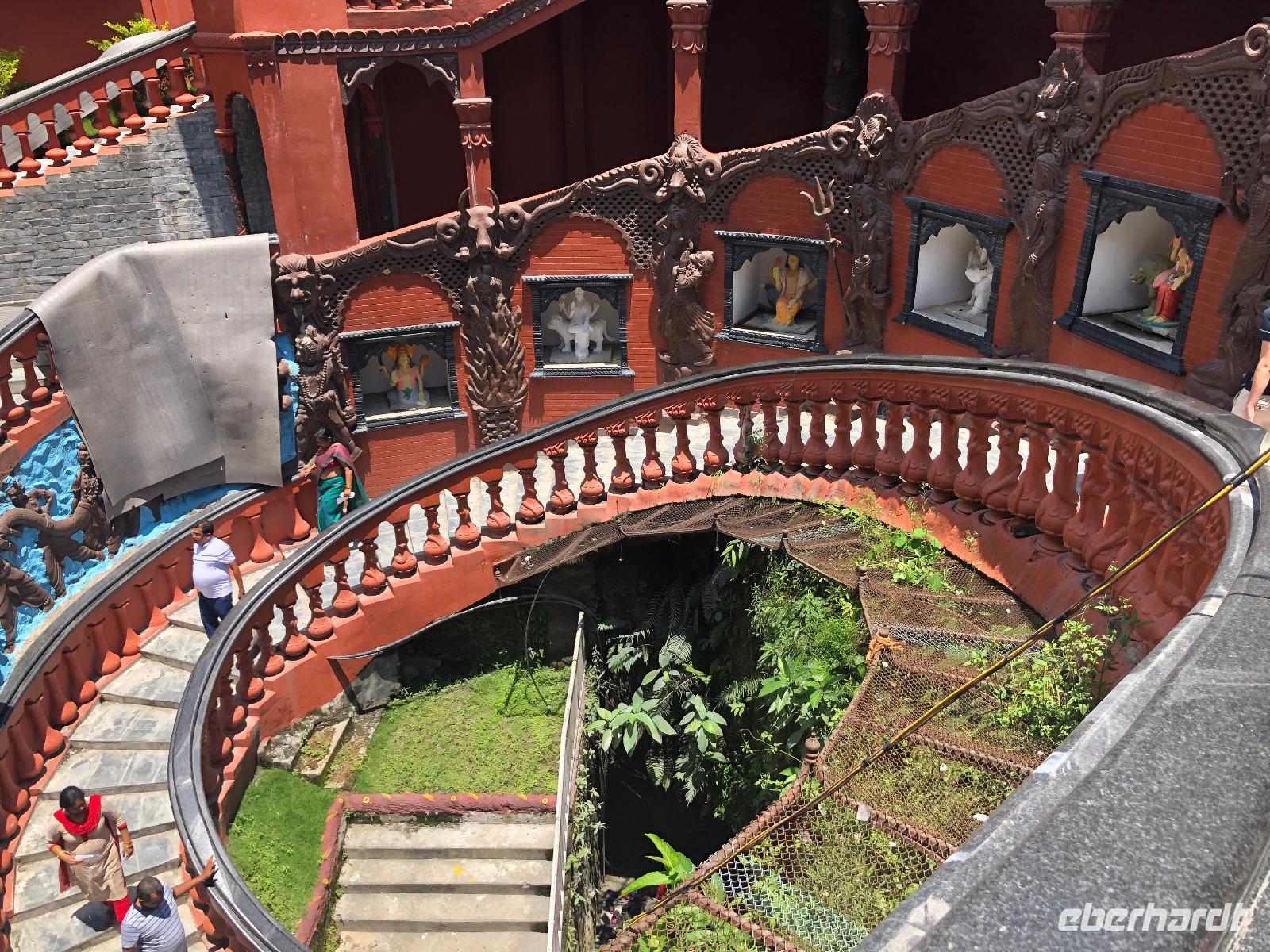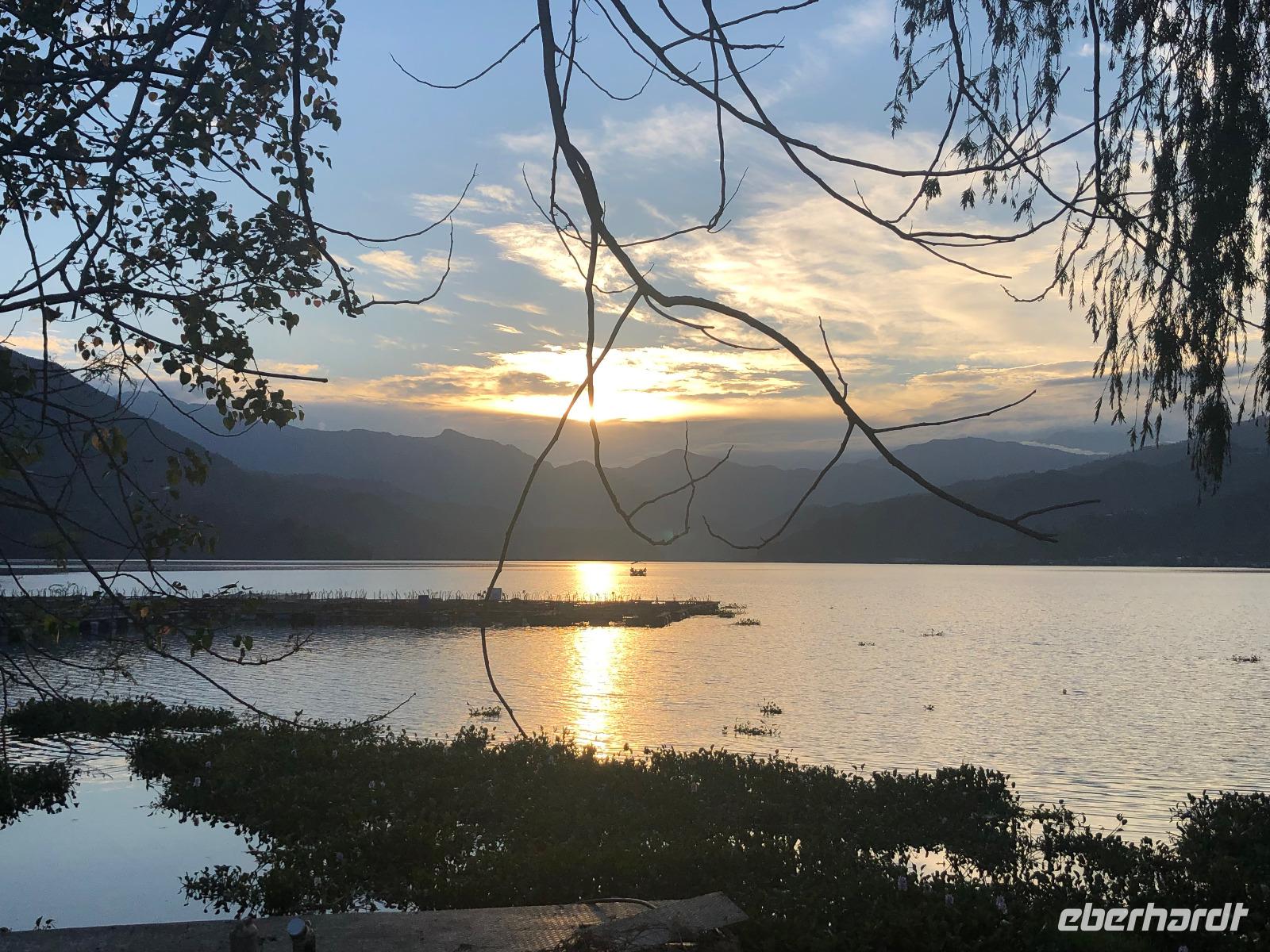 Der frühe Vogel fängt den Wurm! Das hätte das Motto des heutigen Tages werden können, wenn... Wenn die Wolken mitgespielt hätten. Um 04.00 Uhr in der Früh erging der Weckruf durch die Stuben der Hotelanlage und Dutzende hoffnungsvolle Touristen aus aller Welt machten sich auf den Weg nach Sarangkot, dem Hot-Spot der „Sonnenaufgang-über-der-Annapurna-Kette"-Fetischisten, welche bereits zahlreich versammelt waren, als wir den Aussichtspunkt nach halbstündiger Fahrt erreichten. Pünktlich um 05.13 Uhr ging an diesem Tag die Sonne am Horizont auf, doch von dem malerischen Spektakel, von dem wir alle geträumt hatten, war leider nicht viel zu sehen. Die Spitzen der Bergkette waren von einer dichten Wolkenschicht verhangen, so dass wir vom Anblick des Annapurna im Licht der aufgehenden Sonne weiterhin nur träumen konnten. Oder uns einschlägige Fotoliteratur beschaffen mussten. Ungeachtet dessen war es trotzdem ein Erlebnis, das gewaltige Bergmassiv zum Greifen nahe vor Augen zu haben. Immerhin gehörten Annapurna I und II zu den 16 höchsten Bergen der Erde. Da blieb eine gewisse Ehrfurcht nicht ganz aus. Zumal wir wenig später beim Frühstück im Hotel die Annapurna-Kette in schönster Deutlichkeit zu Gesicht bekommen sollten. Die Wolken hatten wohl etwas Mitleid mit uns und lüfteten für kurze Zeit den Schleier. Grandios. Und keinesfalls gewöhnlich und alltäglich. Zumindest nicht in dieser Jahreszeit, die vom Monsun geprägt hätte sein sollen. Der aber in diesem Jahr auf sich warten ließ, sehr zu unserer Freude. Nach dem Frühstück gingen wir zum Tagesprogramm über, beginnend mit einer Fahrt zum und auf dem malerischen Phewa-See. Mit einem Tretboot steuerten wir die Tal-Barahi-Insel an, um uns hier den hinduistischen Ajima-Tempel anzuschauen. Zumindest von außen, denn Nicht-Hindus bekamen keinen Eintritt. Danach landeten wir am gegenüberliegenden Ufer an, wo uns ein hitzetechnisch anstrengender Aufstieg zur World Peace Pagode erwartete. Man musste etwa 300 Meter über viele Stufen in die Höhe steigen, wurde aber dafür unterwegs mit herrlichen Ausblicken auf Pokhara, den Phewa-See und die Annapurna-Kette belohnt. Oben angekommen, erkundeten wir die Biswo Shanti Stupa, wie Sie auch genannt wird, bei einem Rundgang. Bei einem Durchmesser von 105 Metern ragt sie 35 Meter in die Höhe und beherbergt in vier Nischen vier Buddhas aus unterschiedlichen Ländern. Obwohl die Sonne noch lange nicht im Zenit stand, war es bereits unerträglich heiß, so dass wir unser Programm mit dem Besuch der Devi's Falls (Patale Chhango) sowie der Besichtigung der gegenüberliegenden Gupteshwor Mahadev Cave fortsetzten. War der Wasserfall noch einigermaßen beeindruckend, war es der anschließende Höhlenbesuch überhaupt nicht. Feucht, Dunkel, Baumaßnahmen, Gerüste und ein sich endlos hinein und wieder herausquälender Strom von Besuchern ließen kein Erstaunen, dafür eher Enttäuschung aufkommen. Dafür wurden wir im Anschluss mit der Begehung einer Hängebrücke über den Seti-River „entschädigt", war diese doch ob ihrer Länge und Höhe sowie der unerwarteten Festigkeit (Stahlkonstruktion!) erstaunlich genug. Nach einer doppelten Überquerung begaben wir uns zur Pokhara Lakeside am Phewa-See, um hier eine kleine Mittagsmahlzeit zu uns zu nehmen. Beim anschließenden Verdauungsspaziergang wechselte noch das eine und andere Souvenir den Besitzer, bevor wir uns auf den Rückweg in unser Hotel machten. Knapp 20.000 Schritte unter sehr hochsommerlichen Temperaturen verlangten ihren Tribut. Wer wollte, konnte sich im Pool erfrischen oder im hoteleigenen Spa-Bereich von den Anstrengungen erholen. Nach einem nepalesisch-indischen Dinnerbuffet ließen wir den Abend noch bei einem guten Gläschen nepalesischem Rum gemütlich ausklingen.