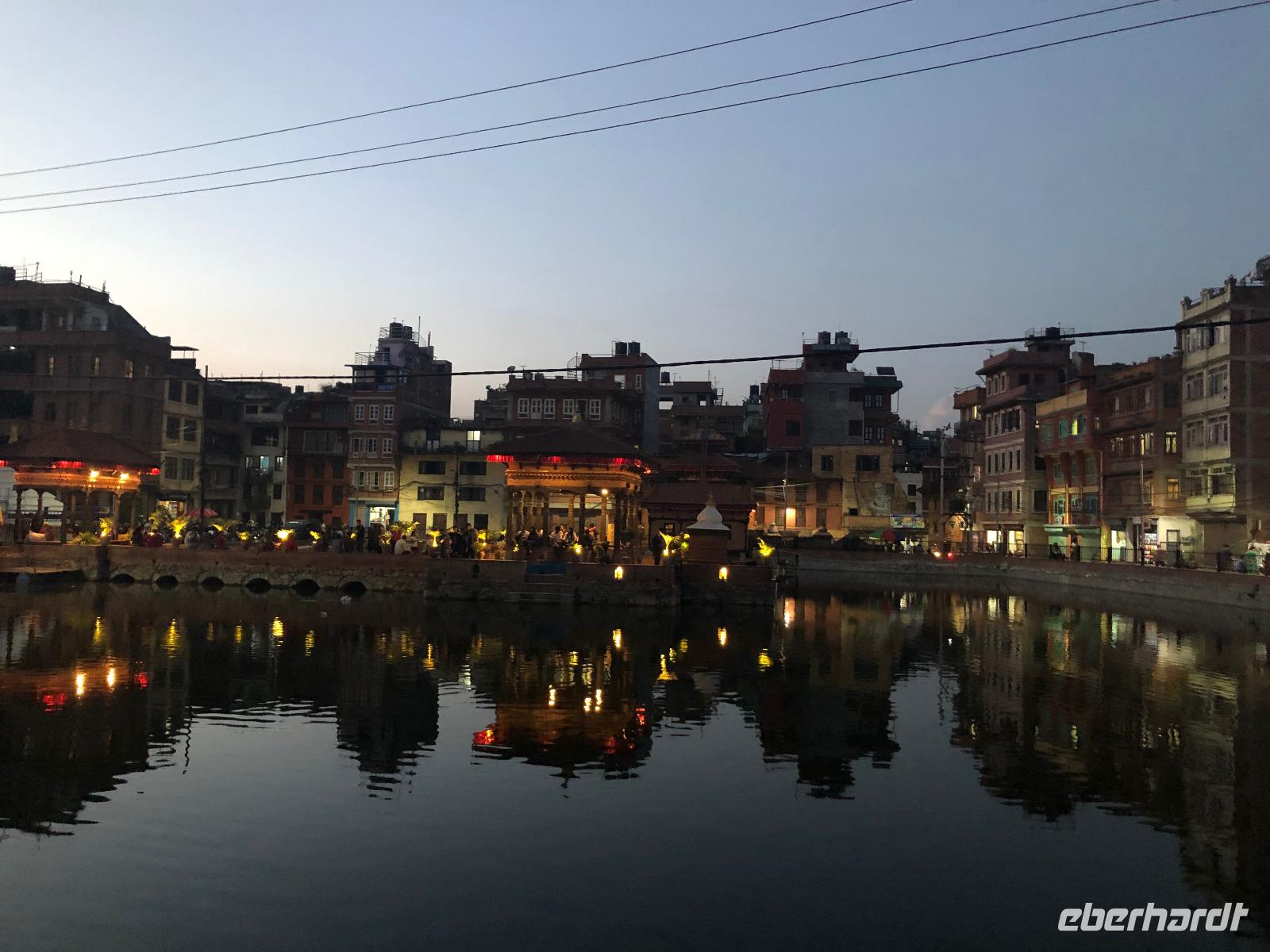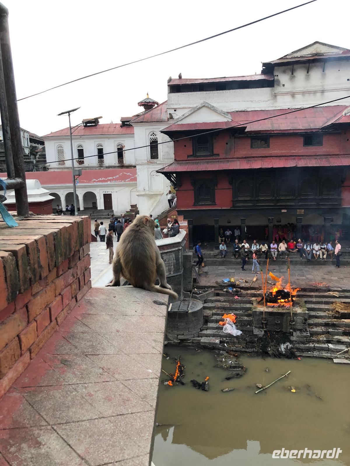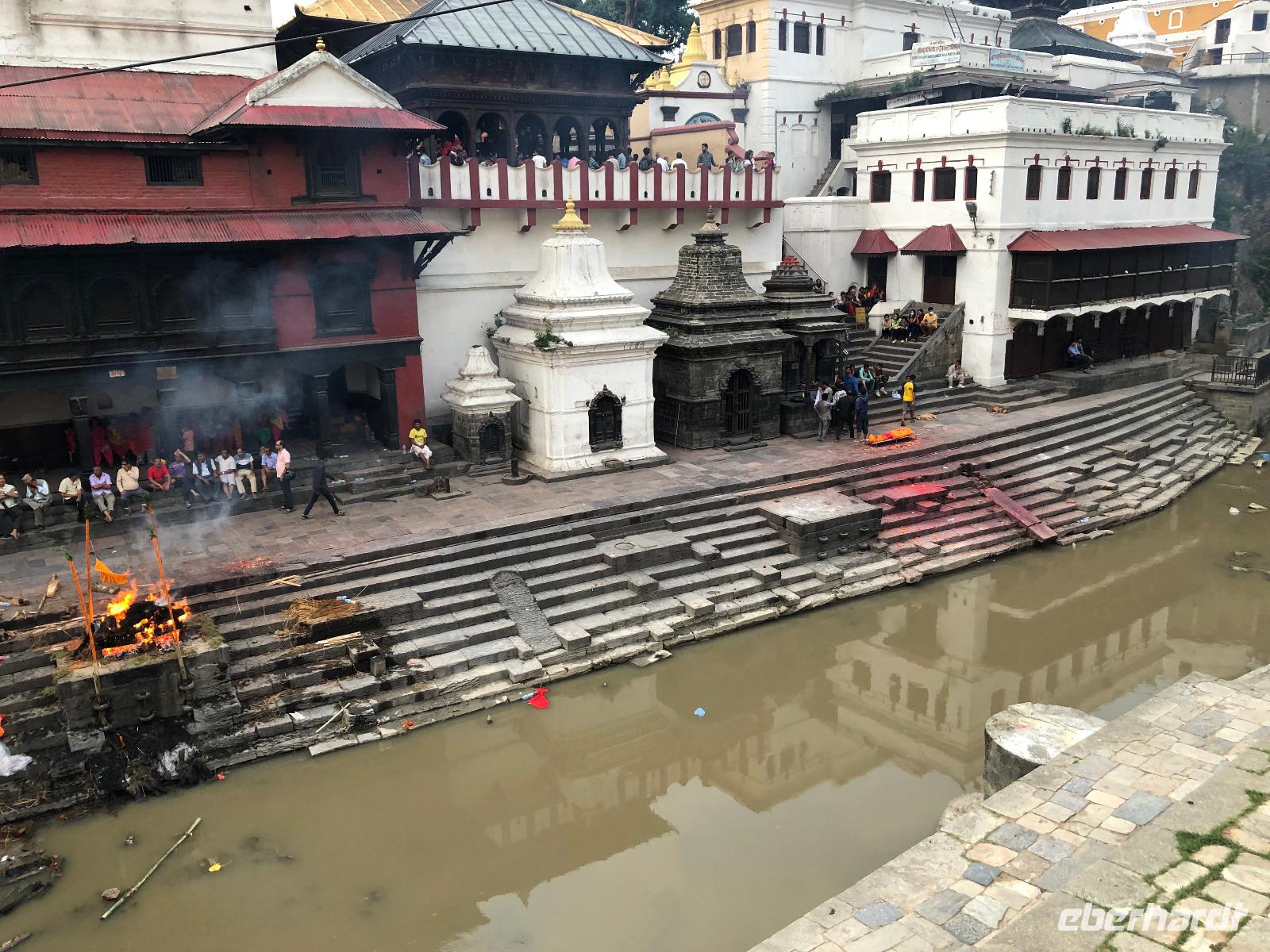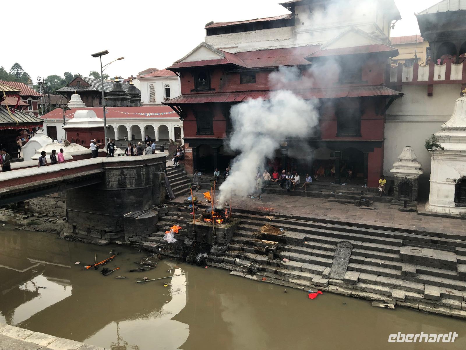 Der vorletzte Tag unserer Reise auf das Dach der Welt begann um 06.30 Uhr morgens. Es stand wieder eine Ortsveränderung an, dieses Mal ging es von Pokhara zurück nach Kathmandu. In Kenntnis der Straßenverhältnisse und unter dem Einfluss zweier weiterer Programmpunkte in der nepalesischen Hauptstadt mussten wir also relativ früh aufbrechen. 200 Kilometer Autofahrt bedeuteten nur in Deutschland mal eben zwischen Frühstück und Gänsebraten unterwegs zu sein. In Nepal und einigen anderen Ländern waren das beinahe Tagestouren. Glücklicherweise, zumindest für unser Vorhaben, gab es an diesem Tag landesweite Streikaufrufe, so dass wir mit etwas weniger Verkehr ein klein wenig schneller vorankamen. Unterbrochen nur durch zwei, drei Pausen erreichten wir so unsere Ziel bereits am frühen Nachmittag, was uns etwas Zeit zur Ruhe im Shangri-La Hotel Kathmandu und zur Vorbereitung auf den morgen stattfindenden Heimflug gab. Erfreulicherweise konnten wir so auch der ganz großen Hitze ausweichen, die uns bisher auf Schritt und Tritt verfolgt hatte. Gegen 18.00 Uhr, als die Temperaturen langsam wieder erträglich wurden, begaben wir uns nach Pashupatinath, eine der wichtigsten Tempelstätten des Hinduismus. Man verehrt hier Shiva als Gott des Lebens (Pashupati), gleichzeitig gibt es hier noch rituelle Verbrennungsstätten, wo Verwandte ihre toten Angehörigen verbrennen lassen konnten. Obwohl es dafür seit einigen Jahren ein nahegelegenes Krematorium gab, ist es für viele Hindus nach wie vor erstrebenswert, die Einäscherung am Ufer des Bagmati-Flusses in der Tempelanlage machen zu lassen. Die Asche und weitere Überreste der Verbrennung werden nach der etwa vier Stunden dauernden Zeremonie, die einem strengen Reglement unterliegt, einfach in den Fluss geschoben. Wir konnten einer solchen Verbrennung beiwohnen, auch wenn wir aus Zeitgründen nur einen kleinen Ausschnitt davon visuell mitnehmen konnten. Nach einem obligaten 1-Dollar-Foto mit einem Sadhu-Priester verließen wir die Anlage wieder. Den Abschluss des heutigen Tages wie auch der gesamten Reise bildete ein Folklore-Abend in einem nepalesischen Restaurant, wo neben einheimischer Küche traditionelle Tänze dargeboten wurden. Es war für uns alle ein schöner Tagesausklang und Schlusspunkt unter eine besondere Reise in eine ganz besondere Region dieser Welt.