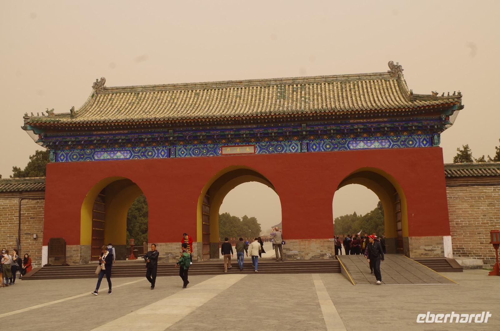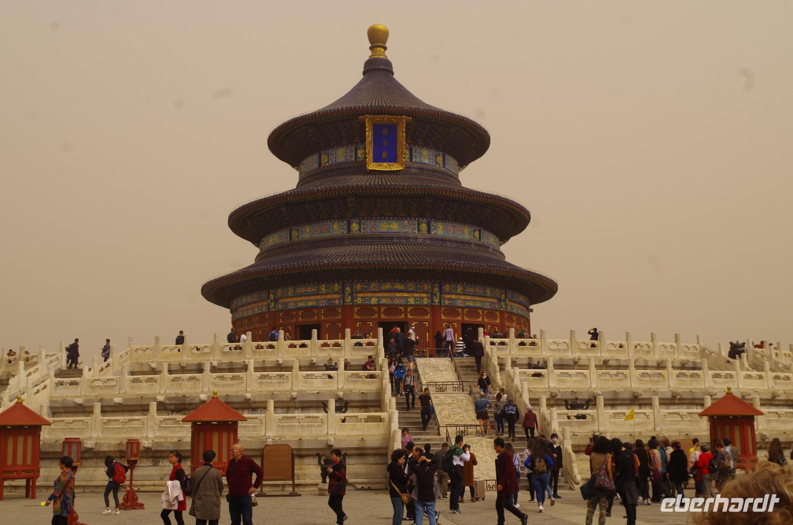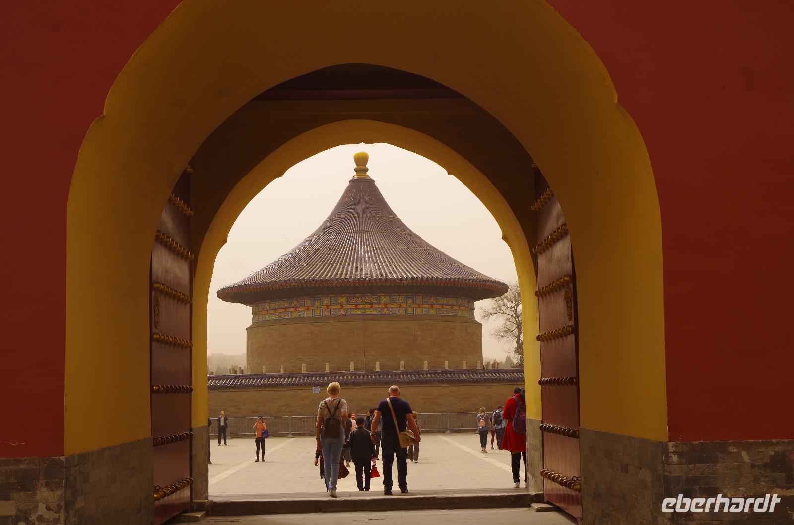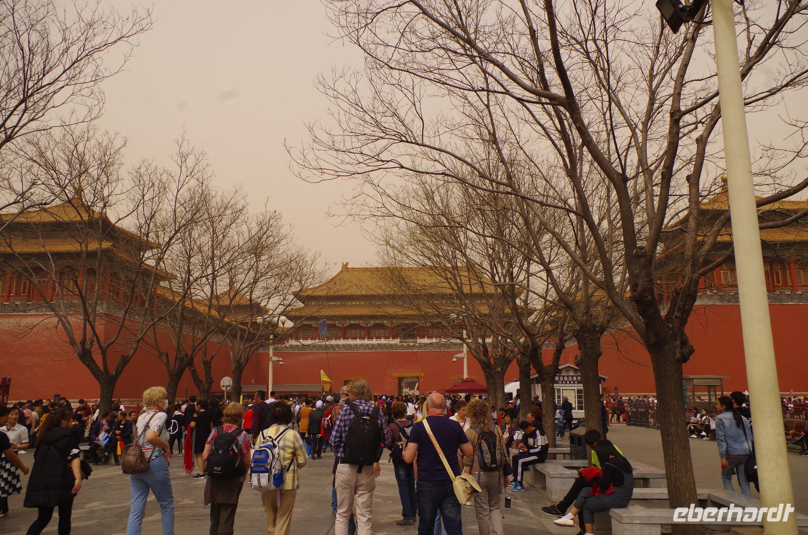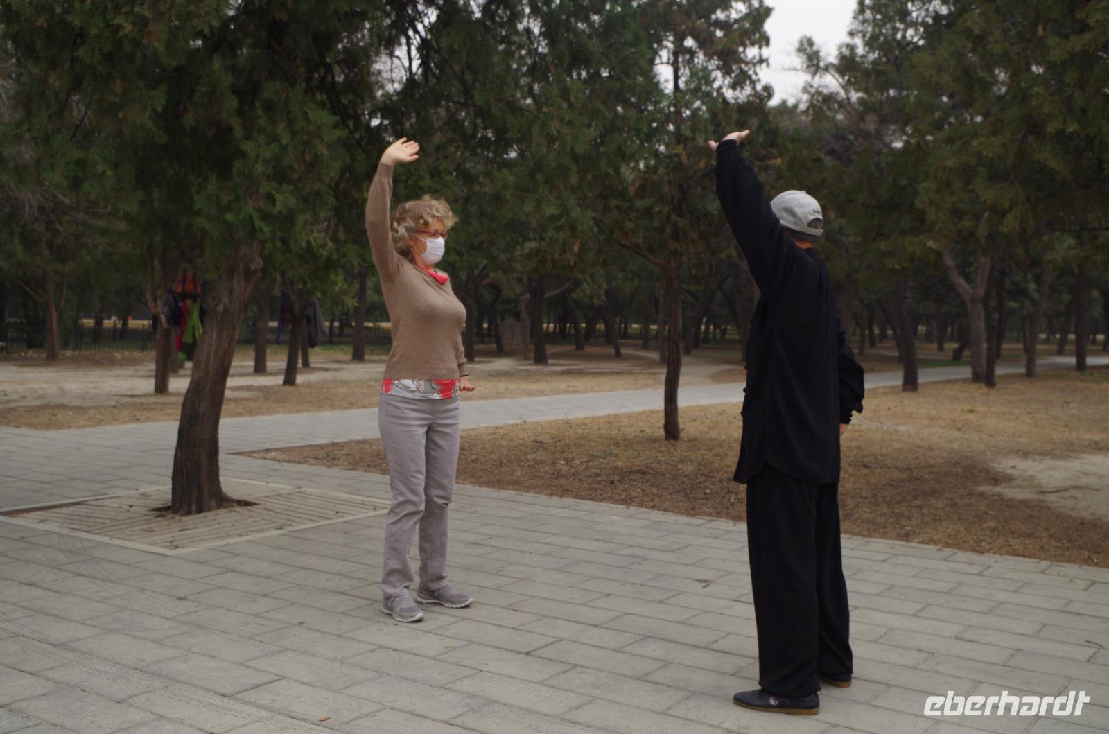 Heute morgen verlassen wir unser Hotel und fahren in Richtung des weltbekannten Himmelstempel. Bevor wir diesen jedoch besichtigen, haben wir einen exklusiven Tai Chi-Kurs mit wahren Meistern dieses Sports. Mit viel Gelächter und komischen Figuren, die für alle zu bewerkstelligen waren und doch sehr erheiternde Endergebnisse ergaben, übten wir uns in diesem Sport. Der Sandsturm machte uns ein wenig zu schaffen, doch angenehme Temperaturen und ohne Regen verspricht der Tag dennoch sehr schön zu sein. Wir betreten die Tempelanlage des Himmelsaltars und sehen die Halle, in welcher die Kaiser der Ming- und Qing-Dynastien jährlich 4 mal für eine gute Ernte beteten. Neben der Halle der Ernteopfer umfasst die Anlage mit Ihren 290 Hektar Fläche auch die Echo-Mauer, vor der wir alle gern einmal geklatscht haben und das Echo bis zu dreimal zu uns zurückhallte, und den Runden Himmelsaltar, auf dem man in der Mitte einmal ein Gebet an die chinesischen Götter senden kann. Wer weiß, ob Sie uns gehört haben. (Meine Lieben, nachdem unsere Reise nun vorbei ist und alle wieder wohlbehalten in heimatlichen Gefilden angekommen sind, kann ich euch meinen Wunsch ja verraten: Ich hatte mir gewünscht, eine tolle Reise mit tollen Menschen zu erleben und dass alle gesund und munter durch die noch bevorstehenden Tage kommen. Das ist uns hervorragend gelungen! Dankeschön.). Im Anschluss sollte uns eine der wohl sagen-umwobensten Bauwerke ganz Chinas seine Tore öffnen. Wir fuhren zum Tiananmen-Platz/ Platz des Himmels, den wir bereits am Vorabend in schönster Beleuchtung gesehen hatten und schlenderten diesmal über den fast 1km langen Platz, vorbei am Mausoleum Mao Tsetungs und dem Denkmal der Helden des Volkes wurde uns erneut die unendliche Größe Chinas bewusst. Josef informierte uns darüber, dass bei Versammlungen auf diesem Platz gut eine Million Menschen zusammenkommen können. Eine schier unvorstellbare Größe. Anschließend spazierten wir durch das Tor des Himmlischen Friedens unter Mao Tsetungs Bildnis hindurch und traten ein in die Verbotene Stadt. Seit der Fertigstellung im Jahre 1420, nach einer nur 14-jährigen Bauzeit, war diese Anlage Sitz der Kaiser der Ming- und Qing-Dynastie bis 1911. Auf einer Gesamtfläche von 720.000 km² stehen 890 Paläste und zahlreiche Pavillons mit insgesamt 8.886 Räumen. Harmonie wurde in der Anlage sehr groß geschrieben, denn so folgt man dem Hauptpfad entlang der geraden Achse von der Halle der erhaltenen Harmonie zur Halle der zentralen Harmonie weiter zur Halle der erhabenen Harmonie, in welcher letztlich der Drachenthron stand, auf welchem die chinesischen Kaiser saßen, und worin die wichtigsten Zeremonien wie Krönungen, Trauungen und Verleihung von Titeln an hohe Beamte stattfanden. Nach einer wohlverdienten Stärkung in einem nahegelegenen Café, ging es anschließend zu einer Akrobatik-Show, die uns alle in Staunen versetzt. Junge Damen, die mit Schirmen und Diabolos und waghalsige Akrobaten, die in schwindelerregenden Höhen Sprünge und Klettereien vollziehen, die uns teils um das Wohlergehen der Herren bangen lässt, lassen uns das ein oder andere „Oh" oder „Ah" entfleuchen. Höhepunkt der Show sind 7 Akrobaten, die auf Motorrädern in einem Kugel-Stahlkäfig rundherum und kopfüber aneinander vorbeirauschen. Welch beeindruckendes Schauspiel! Kulinarisch werden wir am heutigen Abend mit der berühmten Peking-Ente verwöhnt, bevor wir geschafft aber tief beeindruckt auf unsere Kissen sinken.