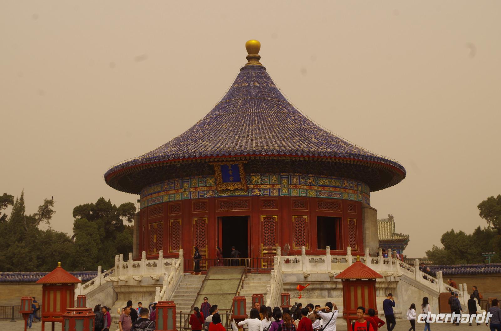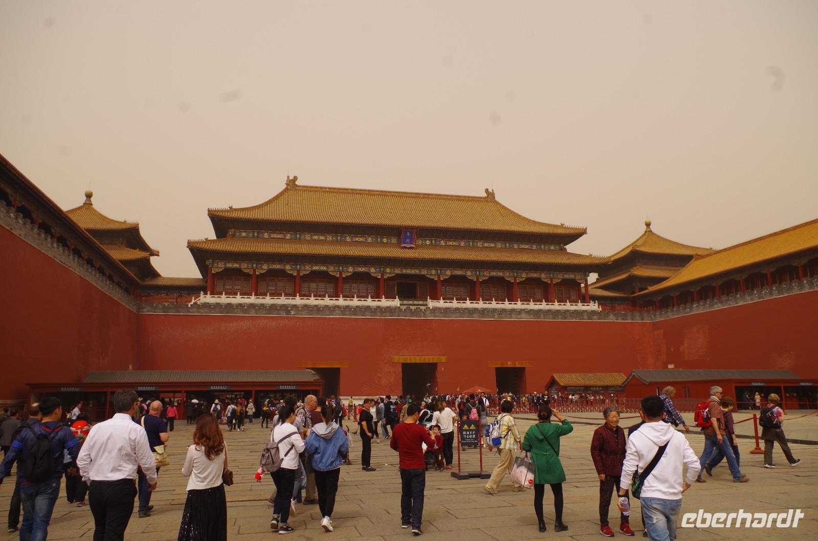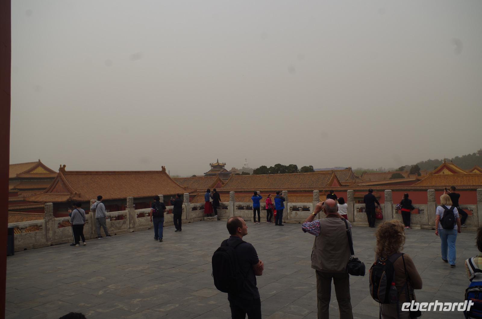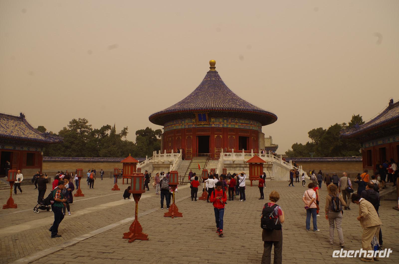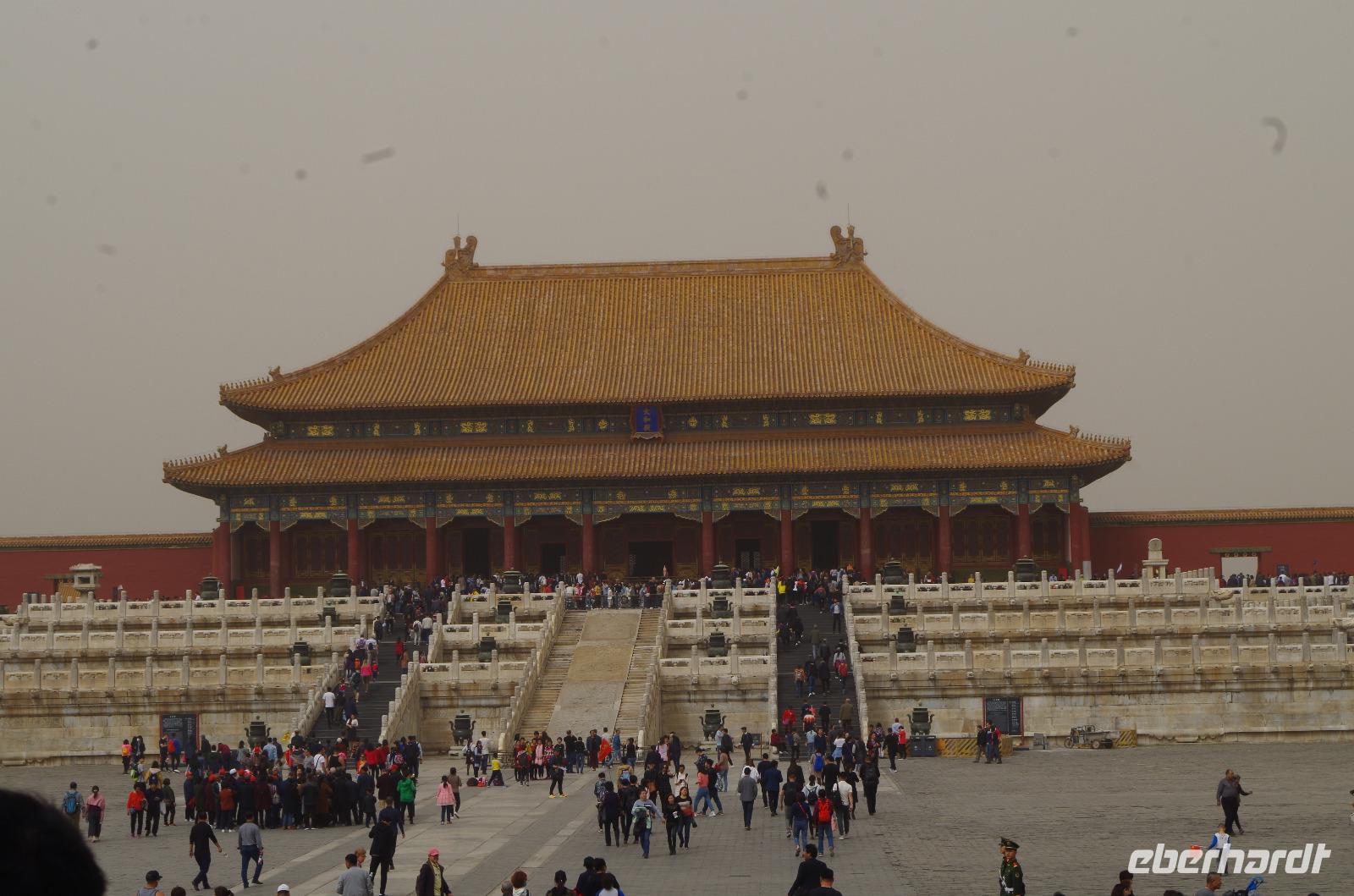 Heute morgen verlassen wir unser Hotel und fahren in Richtung des weltbekannten Himmelstempel. Bevor wir diesen jedoch besichtigen, haben wir einen exklusiven Tai Chi-Kurs mit wahren Meistern dieses Sports. Mit viel Gelächter und komischen Figuren, die für alle zu bewerkstelligen waren und doch sehr erheiternde Endergebnisse ergaben, übten wir uns in diesem Sport. Der Sandsturm machte uns ein wenig zu schaffen, doch angenehme Temperaturen und ohne Regen verspricht der Tag dennoch sehr schön zu sein. Wir betreten die Tempelanlage des Himmelsaltars und sehen die Halle, in welcher die Kaiser der Ming- und Qing-Dynastien jährlich 4 mal für eine gute Ernte beteten. Neben der Halle der Ernteopfer umfasst die Anlage mit Ihren 290 Hektar Fläche auch die Echo-Mauer, vor der wir alle gern einmal geklatscht haben und das Echo bis zu dreimal zu uns zurückhallte, und den Runden Himmelsaltar, auf dem man in der Mitte einmal ein Gebet an die chinesischen Götter senden kann. Wer weiß, ob Sie uns gehört haben. (Meine Lieben, nachdem unsere Reise nun vorbei ist und alle wieder wohlbehalten in heimatlichen Gefilden angekommen sind, kann ich euch meinen Wunsch ja verraten: Ich hatte mir gewünscht, eine tolle Reise mit tollen Menschen zu erleben und dass alle gesund und munter durch die noch bevorstehenden Tage kommen. Das ist uns hervorragend gelungen! Dankeschön.). Im Anschluss sollte uns eine der wohl sagen-umwobensten Bauwerke ganz Chinas seine Tore öffnen. Wir fuhren zum Tiananmen-Platz/ Platz des Himmels, den wir bereits am Vorabend in schönster Beleuchtung gesehen hatten und schlenderten diesmal über den fast 1km langen Platz, vorbei am Mausoleum Mao Tsetungs und dem Denkmal der Helden des Volkes wurde uns erneut die unendliche Größe Chinas bewusst. Josef informierte uns darüber, dass bei Versammlungen auf diesem Platz gut eine Million Menschen zusammenkommen können. Eine schier unvorstellbare Größe. Anschließend spazierten wir durch das Tor des Himmlischen Friedens unter Mao Tsetungs Bildnis hindurch und traten ein in die Verbotene Stadt. Seit der Fertigstellung im Jahre 1420, nach einer nur 14-jährigen Bauzeit, war diese Anlage Sitz der Kaiser der Ming- und Qing-Dynastie bis 1911. Auf einer Gesamtfläche von 720.000 km² stehen 890 Paläste und zahlreiche Pavillons mit insgesamt 8.886 Räumen. Harmonie wurde in der Anlage sehr groß geschrieben, denn so folgt man dem Hauptpfad entlang der geraden Achse von der Halle der erhaltenen Harmonie zur Halle der zentralen Harmonie weiter zur Halle der erhabenen Harmonie, in welcher letztlich der Drachenthron stand, auf welchem die chinesischen Kaiser saßen, und worin die wichtigsten Zeremonien wie Krönungen, Trauungen und Verleihung von Titeln an hohe Beamte stattfanden. Nach einer wohlverdienten Stärkung in einem nahegelegenen Café, ging es anschließend zu einer Akrobatik-Show, die uns alle in Staunen versetzt. Junge Damen, die mit Schirmen und Diabolos und waghalsige Akrobaten, die in schwindelerregenden Höhen Sprünge und Klettereien vollziehen, die uns teils um das Wohlergehen der Herren bangen lässt, lassen uns das ein oder andere „Oh" oder „Ah" entfleuchen. Höhepunkt der Show sind 7 Akrobaten, die auf Motorrädern in einem Kugel-Stahlkäfig rundherum und kopfüber aneinander vorbeirauschen. Welch beeindruckendes Schauspiel! Kulinarisch werden wir am heutigen Abend mit der berühmten Peking-Ente verwöhnt, bevor wir geschafft aber tief beeindruckt auf unsere Kissen sinken.