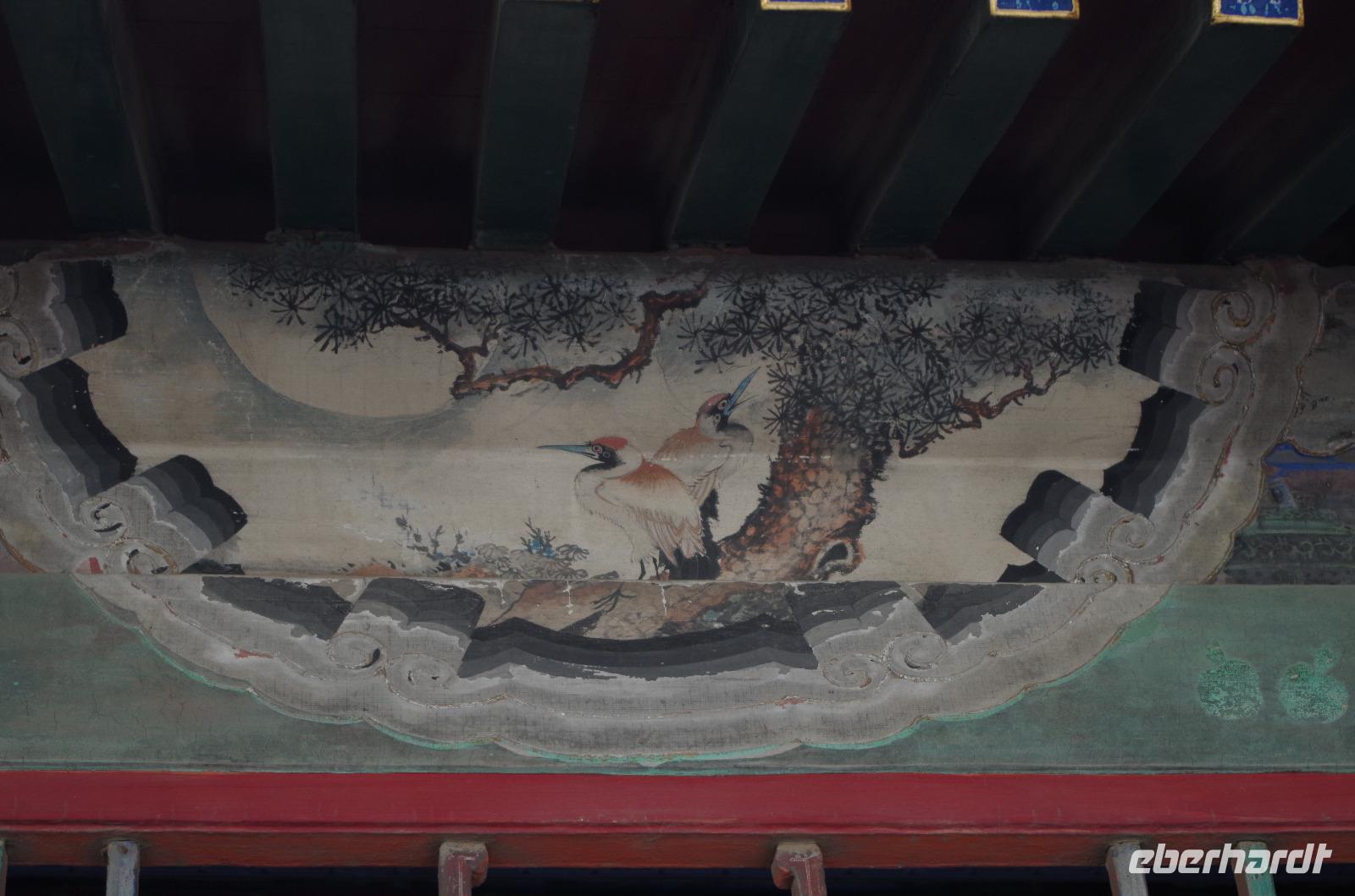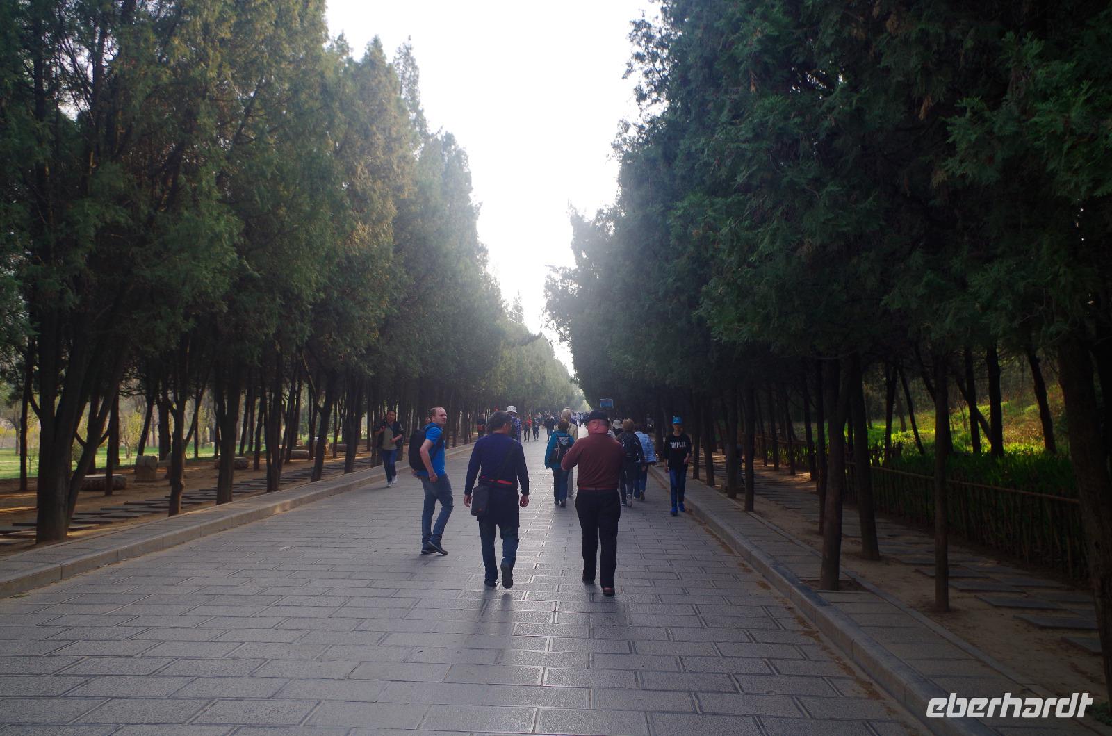 Bei strahlend blauem Himmel und angenehmen Temperaturen machen wir uns auf den Weg in das Reich der Mitte. Bei unserem Informationsabend vor der Reise hatten einige von uns bereits die Möglichkeit einander etwas kennen zu lernen und nun sah man bekannte und neue Gesichter am Frankfurter Flughafen. Nach etwa 9 Stunden Flugzeit landen wir am nächsten Morgen in Peking - Chinas riesiger Hauptstadt, Weltmetropole und Heimat von ca. 25 Millionen Chinesen. Unser Reiseleiter „Josef" (Herr Xia Jun) nimmt uns freundlich in Empfang und gemeinsam fahren wir per Reisebus in „Beijing" - die Hauptstadt des Ostens - hinein. Bei den riesigen Bauwerken, dem eiligen Verkehr und der Vielzahl an ersten Eindrücken ist die anfängliche Müdigkeit rasch verflogen und die Abenteuerlust steigt. Nach dem Check-In im Hotel spazieren wir durch die umliegende Nachbarschaft zu unserem ersten Versuch mit Stäbchen zu essen. Mahlzeiten in China werden förmlich zelebriert, stellen wir fest, denn anstelle, dass jeder einzelne seinen eigenen Teller bekommt, plazieren wir uns um einen runden und sogar drehbaren Tisch und große Schüsseln voller Leckereien und untypischer Rezepturen erscheinen vor uns. Zu Reis gibt es viele Fleisch- und Gemüsegerichte und eine typische Suppe darf natürlich auch nicht fehlen. Anschließend fahren wir zum Sommerpalast (Yihe Yuan), der einstigen Sommerresidenz des chinesischen Kaisers der Qing-Dynastie (1644-1911) und besichtigen die im 18. Jahrhundert errichtete Anlage, die während der Kulturrevolution in den 1960er Jahren einiges an Zerstörung erleiden musste, doch nun nach und nach restauriert wird. Um den Qing-Kaisern Entspannung und Vergnügen zu bereiten sind sämtliche Hallen mit für unsere Ohren eigentümlichen Namen versehen. So besichtigen wir neben der „Halle des Wohlwollens und der Langlebigkeit" auch die „Halle der Freude und der Langlebigkeit" und den „Pavillon des göttlichen Wohlgeruchs" sowie die „Halle der zerstreuenden Wolken", bevor wir den „Langen Wandelgang" zum „Paiyun Tor" entlanggehen. Die um den Palast und den Kunming-See führende Parkanlage verzückt uns mit zahlreichen Pflanzen- und Baumarten und auch dem ein oder anderen tierischen Bewohner laufen wir über den Weg. Ein großes Schiff, welches ganz aus Marmor erbaut ist, rundet die malerische Anlage ab. Wir fahren zurück in die Stadt und nach einem ausgiebigen Abendessen heißt es „endlich" Gute Nacht und bis morgen.
