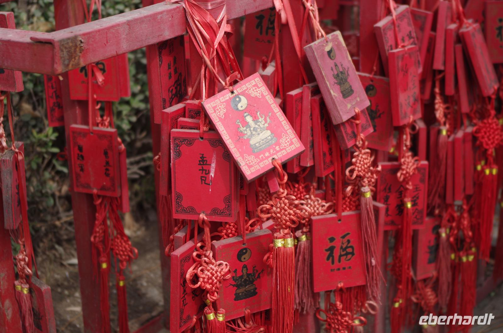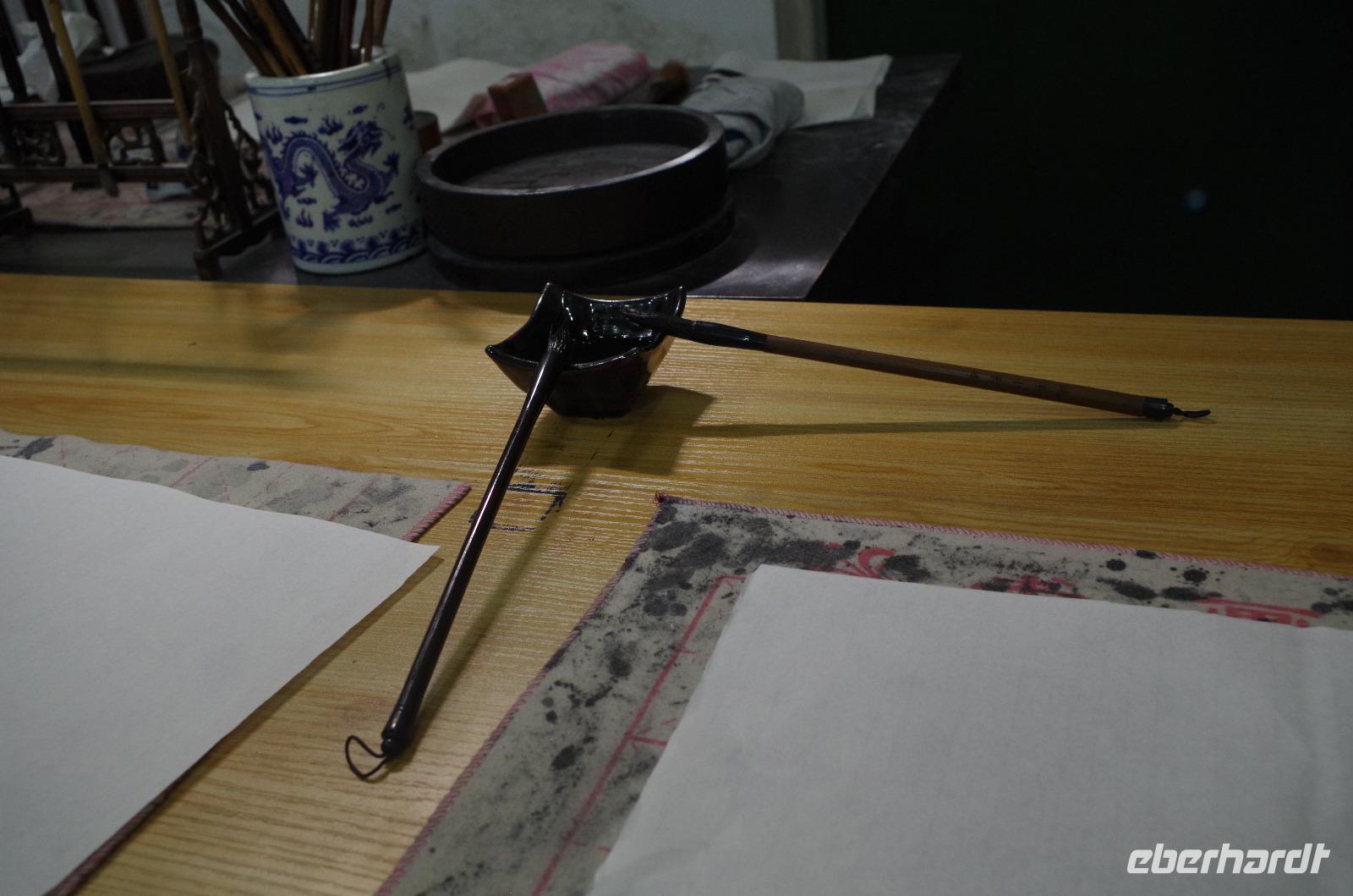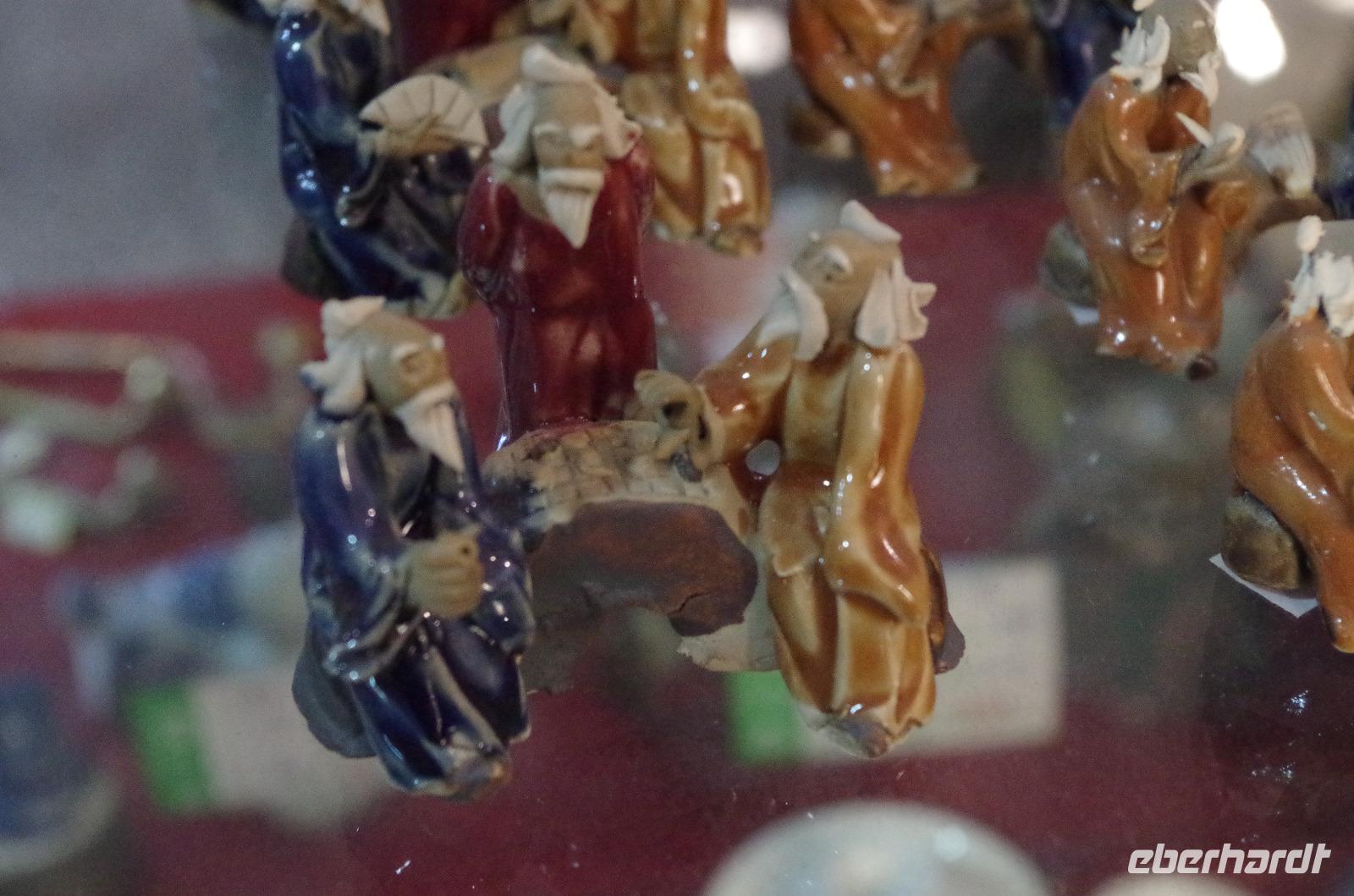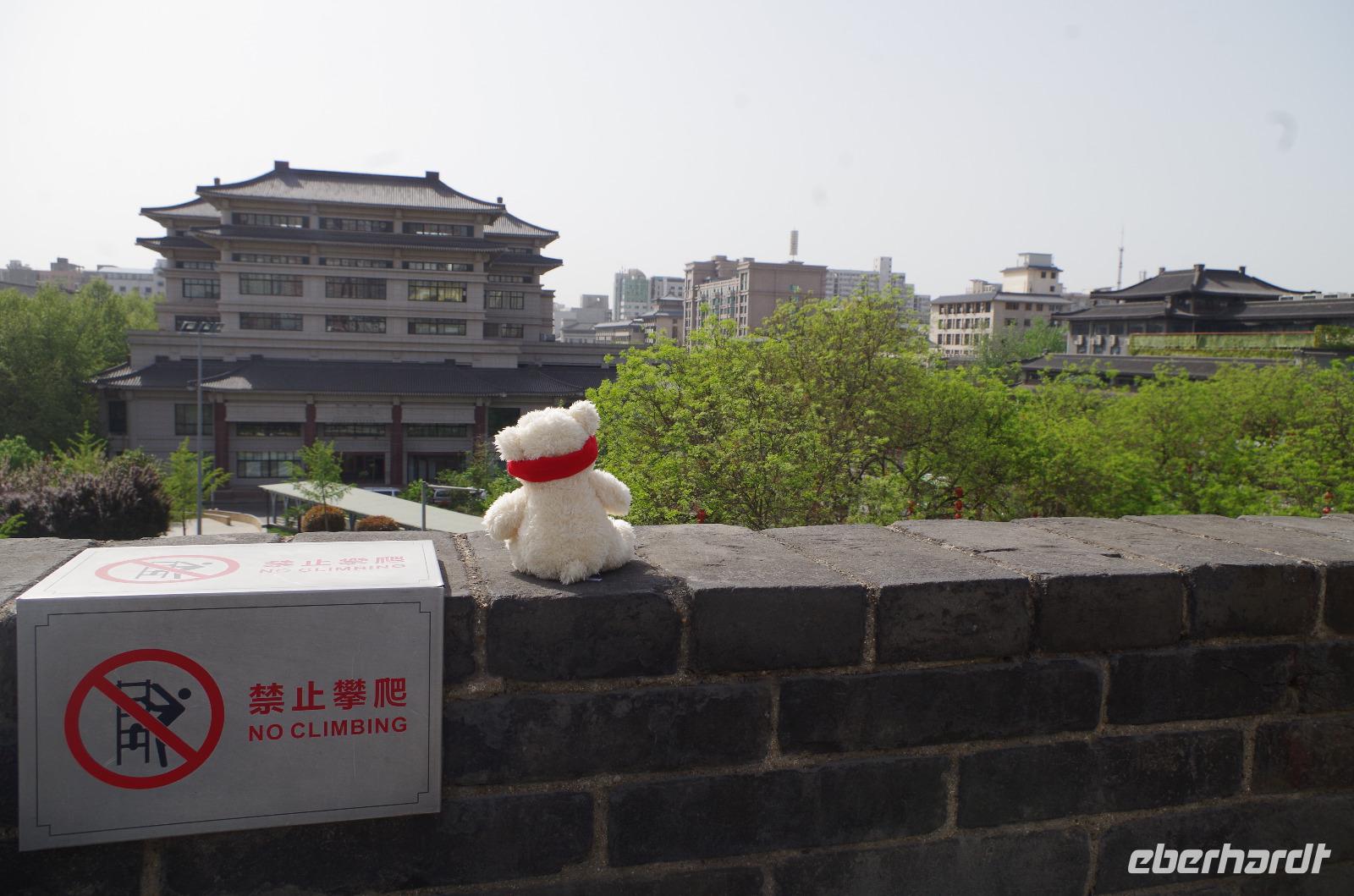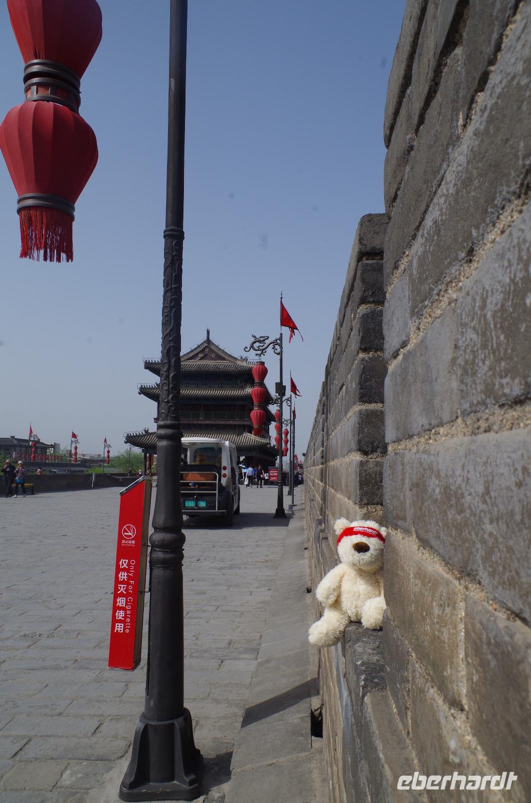 Unseren letzten Tag in Xi'an verbringen wir zunächst im hiesigen Museum. Gemeinsam mit Herr Wang und unserem Reiseleiter Josef sehen wir hier die Entwicklung aus 3.000 Jahren Geschichte in der Region. Von Utensilien des täglichen Bedarfs wie Töpfen und Schüsseln bis hin zu Teilen ehemaliger Befestigungsanlagen, Schmuckgegenständen und Statuen für Grabbeigaben ist in diesem Museum sehr viel zu sehen. Hat man die große Wildganspagode gestern besucht, so folgt heute die kleine. In der umliegenden Tempelanlage stehen neben zahlreichen teils über 100 Jahre alten Bäumen einige kleinere Bauten und auch eine Kalligraphie-Schule findet sich hier. Diese Gelegenheit packen wir natürlich beim Schopf und versuchen uns am Schreiben eines Schriftzeichens auf Reispapier mit Pinsel und Tinte. Die Endergebnisse konnten sich wirklich sehen lassen und wir konnten unsere Werke auch mit nach Hause nehmen. So kann jetzt „Glück - ?" in unseren Häusern einziehen. Wir fahren weiter um den alten Glockenturm von Xi'an zu sehen. Dieser steht inmitten eines großen Kreisverkehrs und ist nur unterirdisch zu erreichen. Ganz in der Nähe befindet sich das muslimische Viertel und wir können hier über den Basar spazieren und uns an den kulinarischen Spezialitäten probieren, die hier links und rechts angeboten werden. Ob ausgewogene Fruchtsalate, fritierte Meeresfrüchte oder Süßigkeiten wie Zuckerwatte oder Eiscreme sind zu günstigen Preise zu erhalten und versüßen uns den sonnigen Tag. Anschließend begeben wir uns in das „Chinatown" in Xi'an. Hier sind traditionelle Theaterkünstler auf der Straße und wir wagen uns in das Gedränge und vorbei an süßen und scharfen Speiseständen und unter zahlreichen roten Lampions hindurch, bevor wir die alte Stadtmauer von Xi'an besteigen. Von hier genießen wir einen tollen Blick über die eingeschlossene Altstadt, die sich schachbrettartig vor uns ausbreitet. Auch das Eberhardt-Reisebärchen hat hier oben seinen Spaß und schaut von der Stadtmauer auf Xi'an hinab. Von hier verabschieden wir uns von Xi'an und begeben uns zum Flughafen außerhalb der Stadt. Wir verabschieden uns von Herr Wang, der uns die letzten Tage so toll geführt hat und besteigen zum ersten Mal eine chinesische Maschine für unsere Weiterreise nach Guilin. Hier angekommen werden wir von „Lisa" - der Zweiten, in Empfang genommen und fahren gemeinsam in die Stadt hinein und zu unserem Hotel für eine angenehme Nacht.