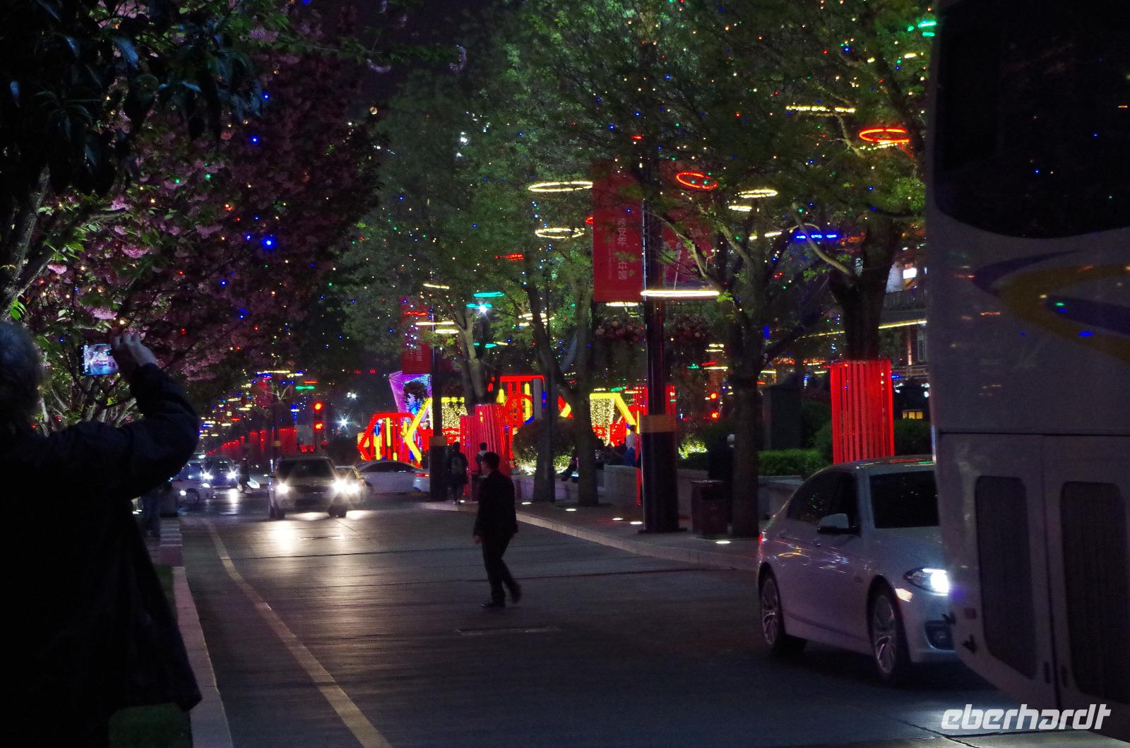 Mit einem kleinen Frühstück nach eigener Wahl starten wir heute in den Tag. Heute herrschen zum ersten Mal während der Reise kühlere Temperaturen und wir ziehen uns alle etwas wärmer an bevor wir durch die nun geschäftige Altstadt Wuzhens schlendern. Josef zeigt uns hier einige tolle Plätze und auch eine alte Soja-Produktionsstätte. Wir machen einen Stopp am Tempel zu Ehren General Wu Zans aus der Tang-Dynastie, der erfolgreich den Bauernaufstand niederkämpfte. In den zahlreichen kleinen Lädchen haben wir mit unserem Auftreten teils die Kassiererinnen etwas durcheinander gebracht und anschließend freudestrahlend die Geschäfte verlassen mit neunen Andenken für Daheim. Ab jetzt ist schließlich Platz für weitere Postkarten im Koffer. Wir haben Glück, da heute eine Festlichkeit in Wuzhen ist und wir erneut Akrobatik-Artisten bei Ihrer Show bestaunen können. Das doch etwas kühle Wetter treibt uns heute jedoch etwas schneller voran, sodass wir zurück zum Bus gehen und weiter nach Suzhou fahren, wo wir in unser Hotel fahren und viele von uns die Gelegenheit nutzen und eine heiße Dusche nehmen um die Kälte aus den Knochen zu bekommen. Nach dem Abendessen nutzen wir noch die Möglichkeit und machen einen kleinen Spaziergang durch die Altstadt und über eine kleine Einkaufspassage entlang des Kaiserkanals, der in der abendlichen Beleuchtung erstrahlt und viele besonders junge Chinesen zum Verweilen einlädt.