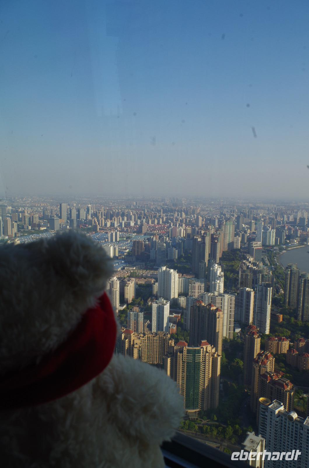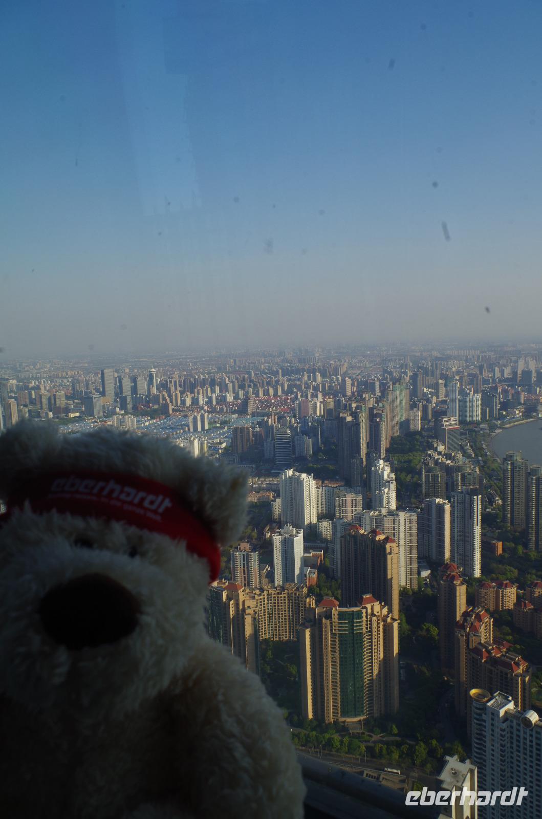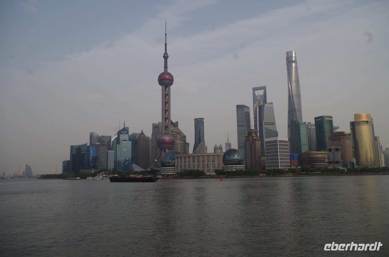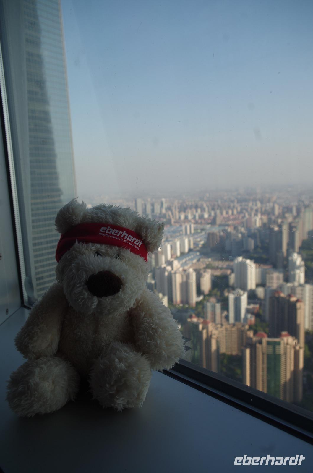 Der letzte Morgen auf chinesischem Boden und so heißt es nach Frühstück und Kofferpacken zum letzten Mal Check-out aus dem Hotel und beladen der Koffer im Bus. Mit zwei weiteren Reiselustigen, die sich heute unserer Gruppe anschlossen spazieren wir zunächst durch das direkt hinter unserem Hotel liegende japanische Viertel und gewinnen so ein Bild von China abseits touristischer Pfade. Besonders das angelegte Charlie Chaplin-Haus mit einer Statue des Schauspielers davor ist eine schöne Kleinigkeit, die uns alle schmunzeln lässt. Anschließend fahren wir ins Shanghai-Museum, welches die Geschichte der Region in Schrift, Bild und Plastik erzählt. Über Mittag verbringen wir etwas Zeit auf der Nanjing-Geschäftsstraße. Hier reihen sich noble Boutiquen an weltweit verbreitete Markenketten und in den Nebengässchen finden sich kleine Händler, die Ihre Waren feilbieten. Letztlich soll es noch hoch hinaus gehen. Wir fahren mit einem der schnellsten Fahrstühle auf den Jin Mao-Turm inmitten Shanghais hinauf, der mit seinen 420,5m Höhe zu den höchsten Bauwerken der Welt zählt. Im 88 Stockwerk haben wir auf der Aussichtsplattform eine tolle Aussicht und auch unser Eberhardt-Reisebärchen entpuppt sich als schwindelfrei. Inmitten des Turms kann man in die Lobby des Grand Hyatt Shanghai-Hotels hinabschauen, welches mit seinen 555 Räumen auf 35 Stockwerken einst das höchstgelegene Hotel der Welt war. Zum Abend müssen wir den Turm natürlich wieder verlassen und laufen vom Turm noch einmal zum Bund. Gerade bei Sonnenuntergang haben wir einen phantastischen Blick auf die Skyline von Shanghai mit Blick auf das französische Viertel. Ein letztes gemeinsames Abendessen verwöhnt uns noch einmal mit zahlreichen chinesischen Spezialitäten und Chris hat für uns eine kleine Überraschung vorbereitet. So können wir einmal mit typisch chinesischem Reisschnaps mit 55 Vol.% anstoßen und eine kleine Süßigkeit aus Wallnuss und Erdnuss kosten. Ein letztes Mal steigen wir zu Herr Zhu in den Bus, der uns zum Transrapid-Zug bringt. Mit dem Transrapid fahren wir anschließend zum Flughafen von Shanghai und verabschieden uns nach dem Check-In unter vielen „Danke" und „Toll gemacht!" von Josef, der uns die letzten Tage und rund um die Uhr in allen Situationen umsorgt hat. Die letzten Yuan werden am Flughafen noch ausgegeben und um Mitternacht heben wir ab in Richtung Deutschland. In Frankfurt heißt es dann auch Abschied nehmen von Chris und den anderen Reisenden. Diese Reise werden wir so schnell nicht vergessen und mit vielen Eindrücken vom Milliarden-Menschen-Land China und mit den Koffern voll Andenken erreichen wir unseren Heimathafen.