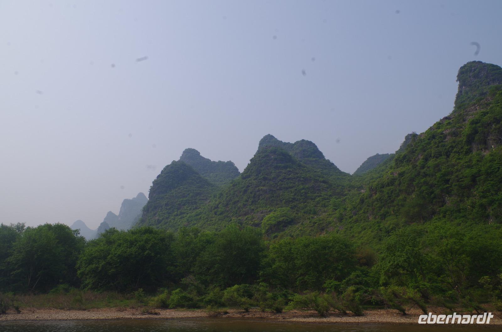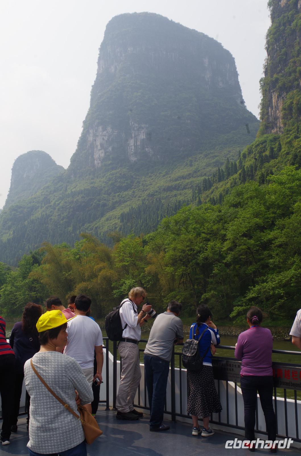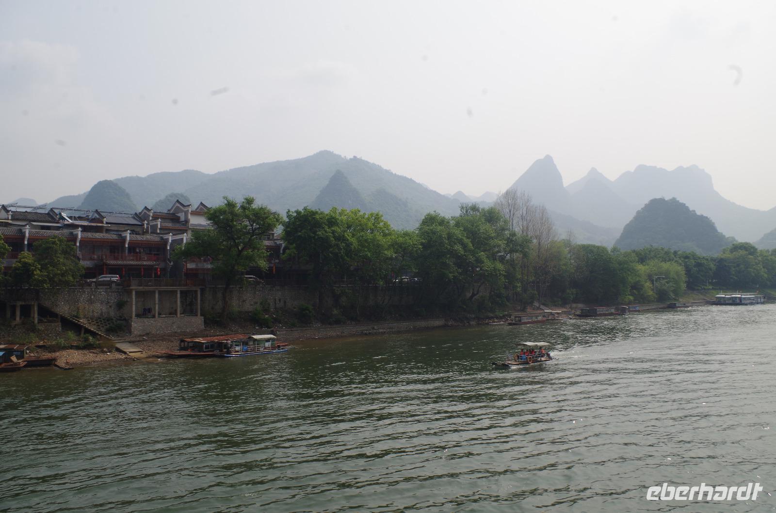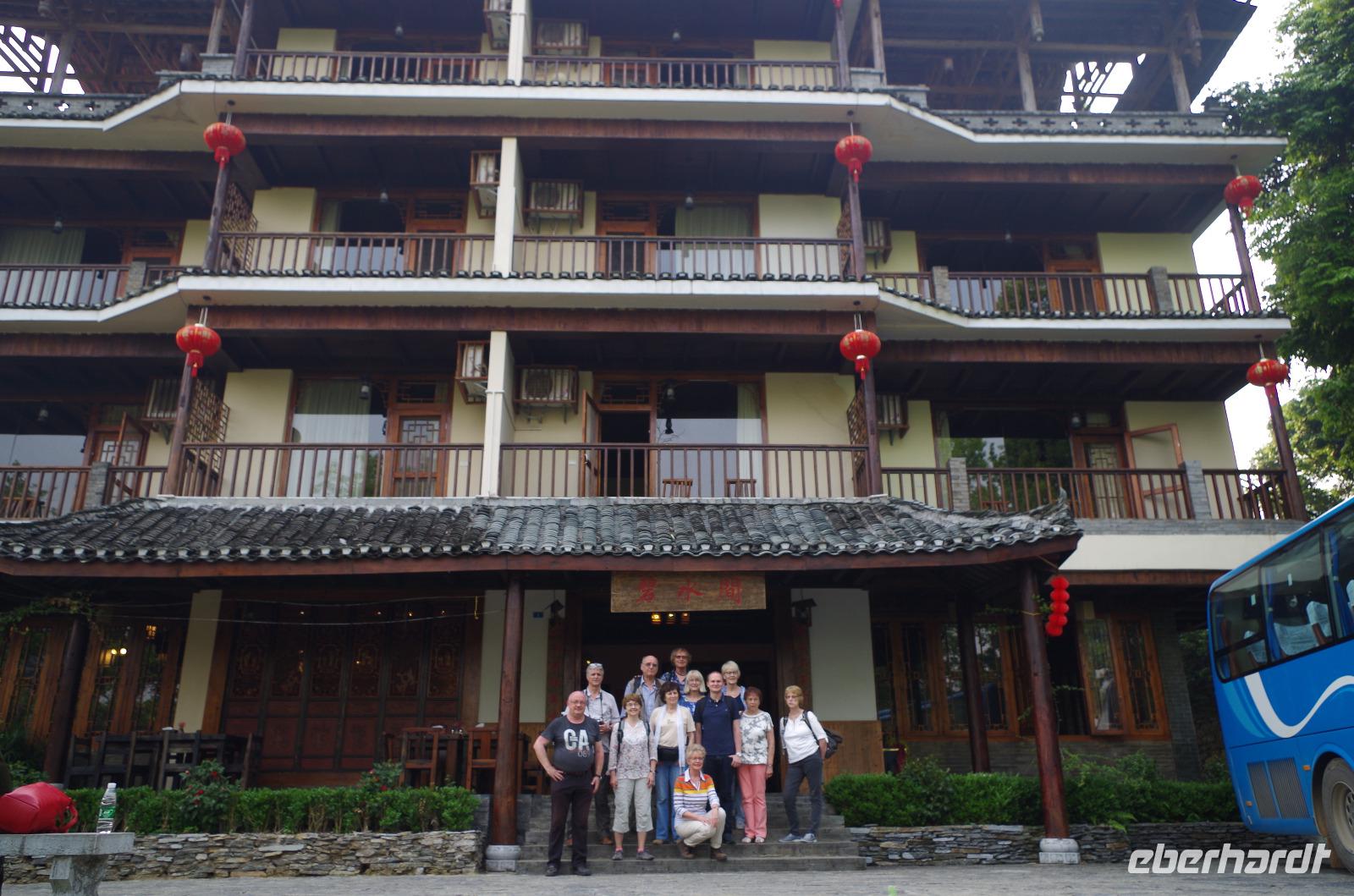 Nach dem Frühstück verlassen wir Guilin und fahren zum Bootsanleger, von wo aus wir den Li-Fluss befahren und hinein in die Gegend der zahlreichen Karstberge eintauchen, die wie aus dem Nichts vor uns aufragen. Auf dem __-Schein der chinesischen Währung sind diese Berge sogar verewigt und wir erfahren nun aus erster Hand, was an dieser Region so besonders ist. Die Berge mit Ihren unterirdischen Höhlen, von welchen wir den ein oder anderen Eingang erspähen, versetzen uns vom Oberdeck des Schiffs in Staunen und so fahren wir in einer Kolonne aus mehreren Schiffen, die hin und wieder kräftig ins Horn blasen auf dem Li-Fluss und durch die Bergwelt hindurch. Hin und wieder erfahren wir von Josef und Lisa etwas über sehr markante Berge und Formationen und auch die vorbeiziehende Tierwelt von Wasserbüffeln, Enten, Adlern und sogar Ziegen versüßen uns neben dem ein oder anderen Wasserfall die Fahrt. Angekommen in Yangshuo und vom Anleger an passieren wir einen großen Basar, auf welchem zahlreiche Souvenirs zu finden sind. Wir fahren mit zwei kleinen Elektrowagen hinein in das Naturgebiet in Yangshuo und mit einem besonderen Hopp-on/Hopp-off-Bus fahren wir in das Gebiet hinein. Wir spazieren hier durch ein kleines Bauerndorf und laufen so Hund, Hahn, Gans und Schwein über den Weg. Heute meint es das Wetter besonders gut mit uns, denn etwa 30°C und strahlender Sonnenschein lassen die umliegenden Felder strahlend grün erstrahlen und die Erdbeeren bereits jetzt reifen. Wir fahren weiter zum Fuß des Mondbergs und erhaschen einen Blick auf die einmalige Formation, bei welcher durch Natureinflüsse ein im Durchmesser 50m breites Loch entstand. Da die Temperaturen den meisten von uns doch etwas zusetzen, machen wir eine Pause in einem nahen Café und kühlen uns mit Softgetränken, Café und Bier etwas ab. Der nun etwas abenteuerliche Part ist die Busfahrt zum heutigen Hotel. Die kleine Lodge abseits der bekannten Pfade ist jedoch jede Anstrengung wert gewesen und in der kleinen Lodge mit dem sehr freundlichen Personal hat man sich direkt heimisch gefühlt. Der kleine Garten mit Hollywood-Schaukel und Blick auf den Fluss lädt zum Verweilen ein; und so bleiben wir hier für eine Nacht.