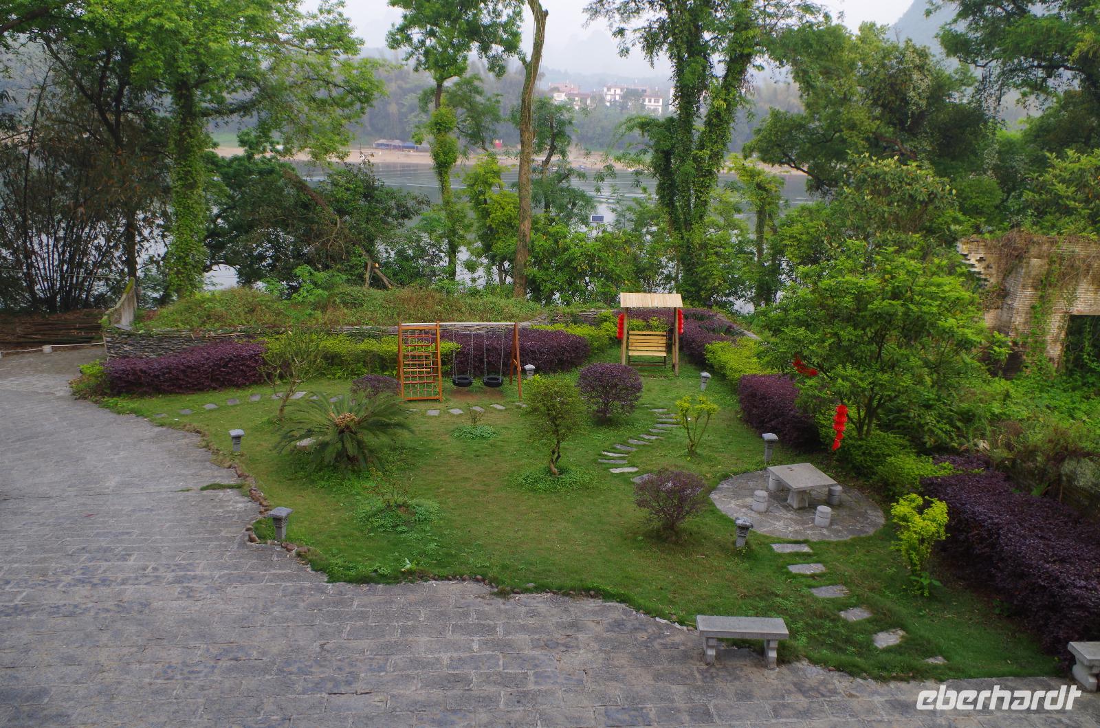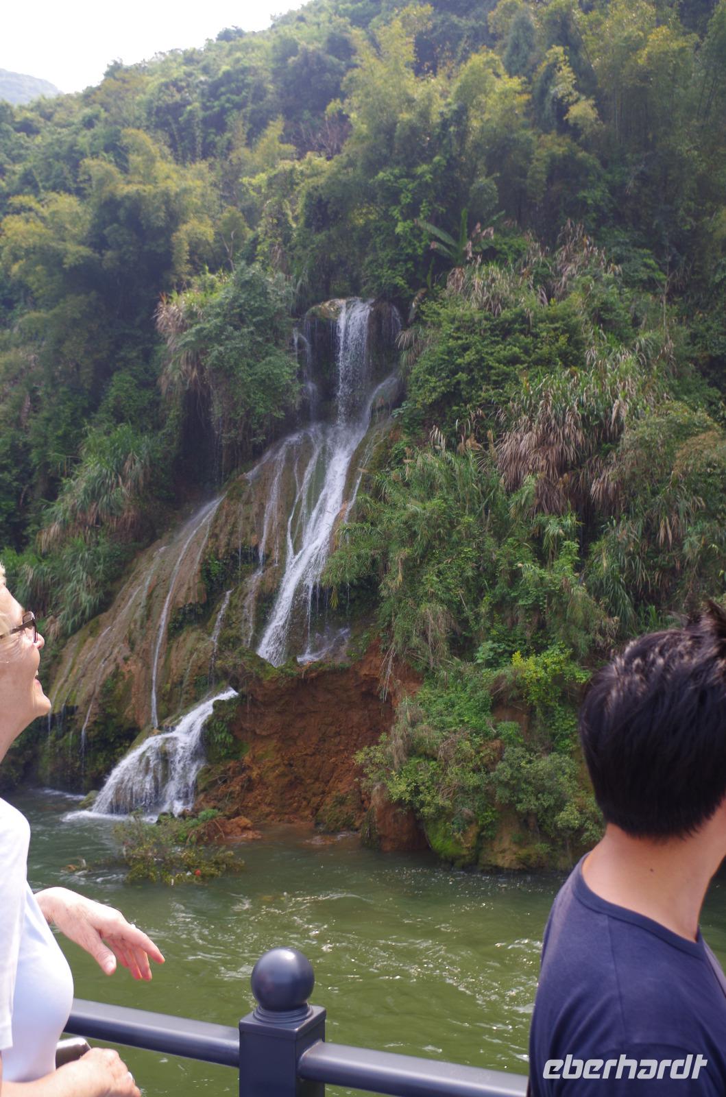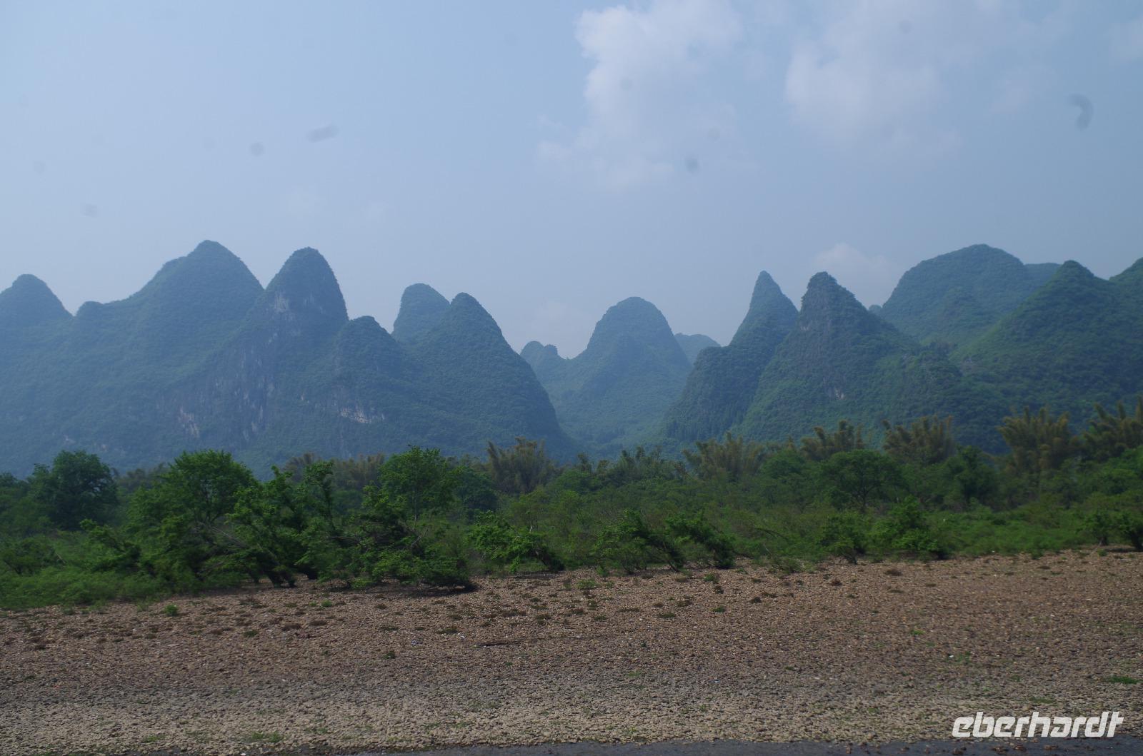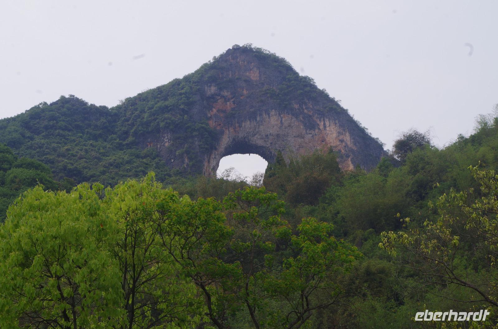 Nach dem Frühstück verlassen wir Guilin und fahren zum Bootsanleger, von wo aus wir den Li-Fluss befahren und hinein in die Gegend der zahlreichen Karstberge eintauchen, die wie aus dem Nichts vor uns aufragen. Auf dem __-Schein der chinesischen Währung sind diese Berge sogar verewigt und wir erfahren nun aus erster Hand, was an dieser Region so besonders ist. Die Berge mit Ihren unterirdischen Höhlen, von welchen wir den ein oder anderen Eingang erspähen, versetzen uns vom Oberdeck des Schiffs in Staunen und so fahren wir in einer Kolonne aus mehreren Schiffen, die hin und wieder kräftig ins Horn blasen auf dem Li-Fluss und durch die Bergwelt hindurch. Hin und wieder erfahren wir von Josef und Lisa etwas über sehr markante Berge und Formationen und auch die vorbeiziehende Tierwelt von Wasserbüffeln, Enten, Adlern und sogar Ziegen versüßen uns neben dem ein oder anderen Wasserfall die Fahrt. Angekommen in Yangshuo und vom Anleger an passieren wir einen großen Basar, auf welchem zahlreiche Souvenirs zu finden sind. Wir fahren mit zwei kleinen Elektrowagen hinein in das Naturgebiet in Yangshuo und mit einem besonderen Hopp-on/Hopp-off-Bus fahren wir in das Gebiet hinein. Wir spazieren hier durch ein kleines Bauerndorf und laufen so Hund, Hahn, Gans und Schwein über den Weg. Heute meint es das Wetter besonders gut mit uns, denn etwa 30°C und strahlender Sonnenschein lassen die umliegenden Felder strahlend grün erstrahlen und die Erdbeeren bereits jetzt reifen. Wir fahren weiter zum Fuß des Mondbergs und erhaschen einen Blick auf die einmalige Formation, bei welcher durch Natureinflüsse ein im Durchmesser 50m breites Loch entstand. Da die Temperaturen den meisten von uns doch etwas zusetzen, machen wir eine Pause in einem nahen Café und kühlen uns mit Softgetränken, Café und Bier etwas ab. Der nun etwas abenteuerliche Part ist die Busfahrt zum heutigen Hotel. Die kleine Lodge abseits der bekannten Pfade ist jedoch jede Anstrengung wert gewesen und in der kleinen Lodge mit dem sehr freundlichen Personal hat man sich direkt heimisch gefühlt. Der kleine Garten mit Hollywood-Schaukel und Blick auf den Fluss lädt zum Verweilen ein; und so bleiben wir hier für eine Nacht.