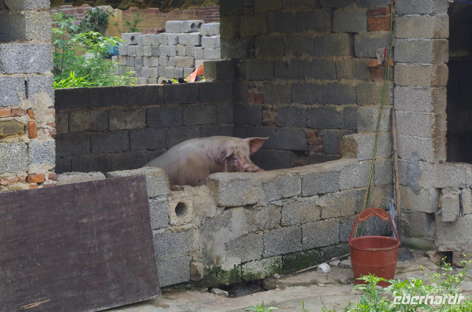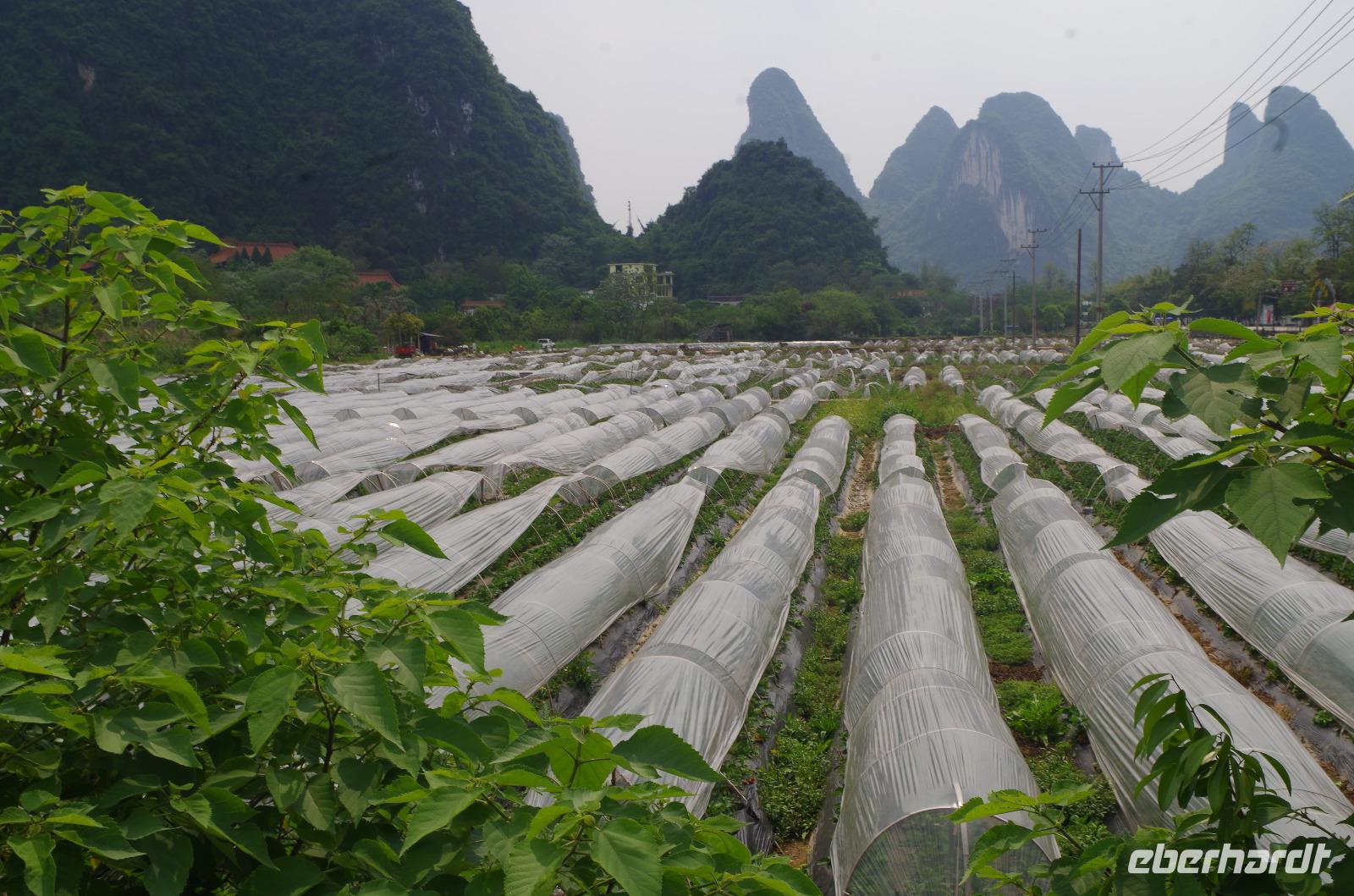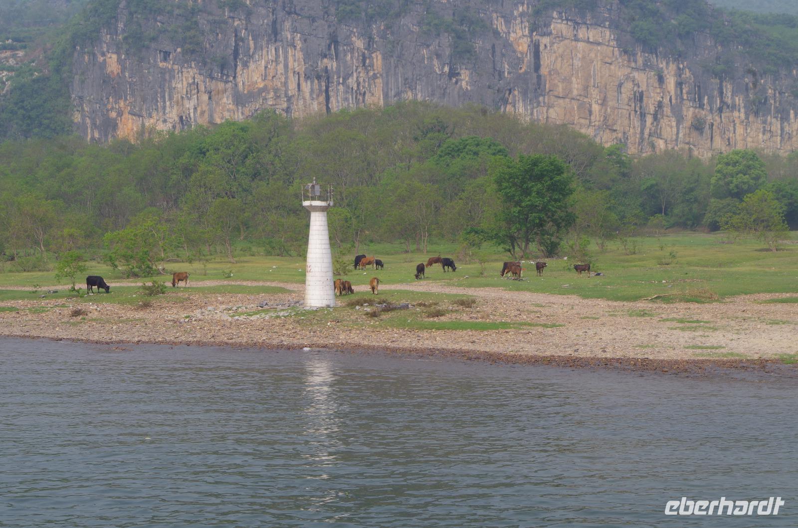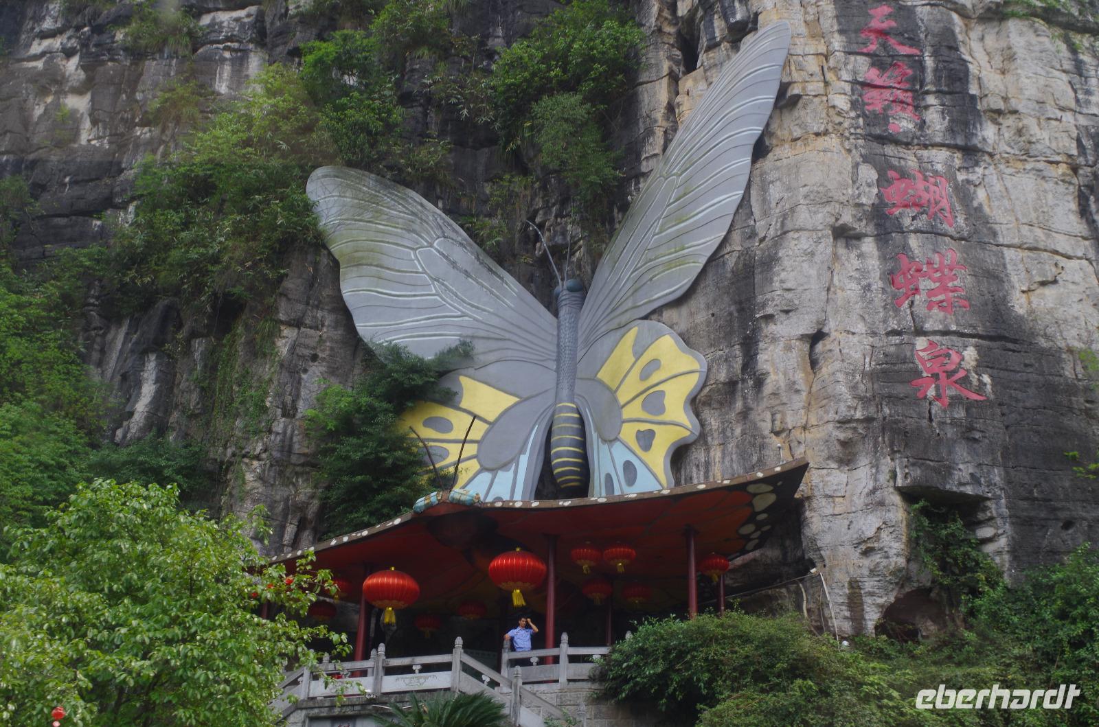 Nach dem Frühstück verlassen wir Guilin und fahren zum Bootsanleger, von wo aus wir den Li-Fluss befahren und hinein in die Gegend der zahlreichen Karstberge eintauchen, die wie aus dem Nichts vor uns aufragen. Auf dem __-Schein der chinesischen Währung sind diese Berge sogar verewigt und wir erfahren nun aus erster Hand, was an dieser Region so besonders ist. Die Berge mit Ihren unterirdischen Höhlen, von welchen wir den ein oder anderen Eingang erspähen, versetzen uns vom Oberdeck des Schiffs in Staunen und so fahren wir in einer Kolonne aus mehreren Schiffen, die hin und wieder kräftig ins Horn blasen auf dem Li-Fluss und durch die Bergwelt hindurch. Hin und wieder erfahren wir von Josef und Lisa etwas über sehr markante Berge und Formationen und auch die vorbeiziehende Tierwelt von Wasserbüffeln, Enten, Adlern und sogar Ziegen versüßen uns neben dem ein oder anderen Wasserfall die Fahrt. Angekommen in Yangshuo und vom Anleger an passieren wir einen großen Basar, auf welchem zahlreiche Souvenirs zu finden sind. Wir fahren mit zwei kleinen Elektrowagen hinein in das Naturgebiet in Yangshuo und mit einem besonderen Hopp-on/Hopp-off-Bus fahren wir in das Gebiet hinein. Wir spazieren hier durch ein kleines Bauerndorf und laufen so Hund, Hahn, Gans und Schwein über den Weg. Heute meint es das Wetter besonders gut mit uns, denn etwa 30°C und strahlender Sonnenschein lassen die umliegenden Felder strahlend grün erstrahlen und die Erdbeeren bereits jetzt reifen. Wir fahren weiter zum Fuß des Mondbergs und erhaschen einen Blick auf die einmalige Formation, bei welcher durch Natureinflüsse ein im Durchmesser 50m breites Loch entstand. Da die Temperaturen den meisten von uns doch etwas zusetzen, machen wir eine Pause in einem nahen Café und kühlen uns mit Softgetränken, Café und Bier etwas ab. Der nun etwas abenteuerliche Part ist die Busfahrt zum heutigen Hotel. Die kleine Lodge abseits der bekannten Pfade ist jedoch jede Anstrengung wert gewesen und in der kleinen Lodge mit dem sehr freundlichen Personal hat man sich direkt heimisch gefühlt. Der kleine Garten mit Hollywood-Schaukel und Blick auf den Fluss lädt zum Verweilen ein; und so bleiben wir hier für eine Nacht.