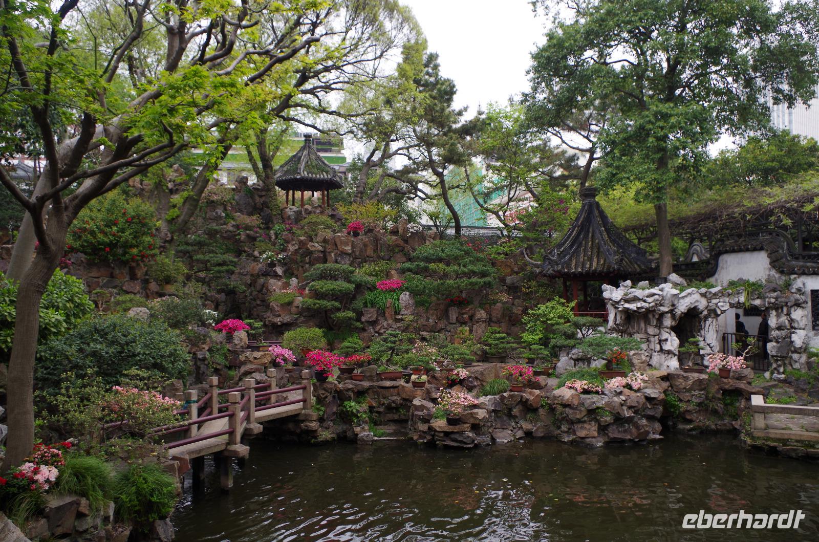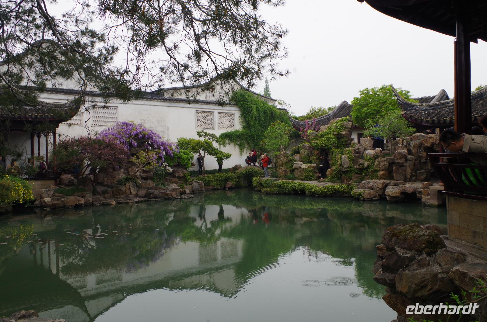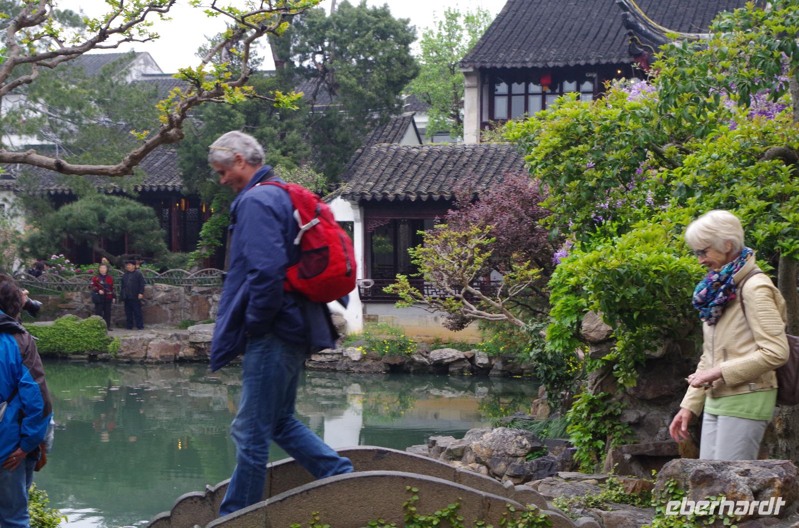 Nach einer erholsamen Nacht und einem guten Frühstück fahren wir vom Hotel ab und zunächst zum Kaiserkanal und zur Anlegestelle in der Nähe der Marco Polo-Brücke. Bei einer Bootsfahrt auf dem Kaiserkanal sehen wir links und rechts zahlreiche schöne Bauten. Suzhou besitzt durch sein weitverzweigtes Kanalsystem über 1.000 Brücken und vom Wasser aus sieht man eine Stadt doch wieder aus ganz anderen Augen. Anschließend fahren wir zum Garten des Meisters der Fischernetze, der seit seiner Errichtung 6-mal den Besitz wechselte. Der verhältnismäßig kleine Garten mit „nur" 0,8 Hektar ist zu 447m² als Wasserfläche angelegt und ein vorbildhaftes Beispiel für chinesische Gartenbaukunst. Die angrenzenden Räume mit den großen Steinstatuen, der hölzerne Pavillon und besonders die „Drei-Schritte-Brücke" stehen in einem tollen Zusammenspiel und spiegeln sich neben blühendem Flieder im Wasser des angelegten Sees. Wir schlendern durch die zahlreichen „Häuser" und lassen uns durch Josef in die Zeit der großen chinesischen Denker zurückversetzen, die ihre Zeit hier zum Schreiben, Arbeiten und auch Entspannen nutzten. Nach unserem Spaziergang durch den Garten fahren wir zu einer Seidenmanufaktur in welcher wir zunächst die verschiedenen Entwicklungsstadien der Seidenraupe sehen können und anschließend die Produktionsstätten besichtigen können, in welcher aus den kleinen Kokons der Raupe die Seide aufgezogen wird um später durch eine Maschine zu Garn gesponnen zu werden und auf einem Webstuhl in die wunderbarsten Motive verwebt werden. Die Herstellung einer Seidendecke erproben wir selbst einmal aus und stellen fest, wieviel Kraft diese Arbeit tatsächlich kostet. Im Werksverkauf können wir anschließend selbst einige Seide-Artikel erwerben und besonders die bunten Tücher sind ein willkommenes Geschenk für uns selbst und die Lieben zu Hause. Im Anschluss fahren wir nach Shanghai weiter, wo wir am Abend ankommen.