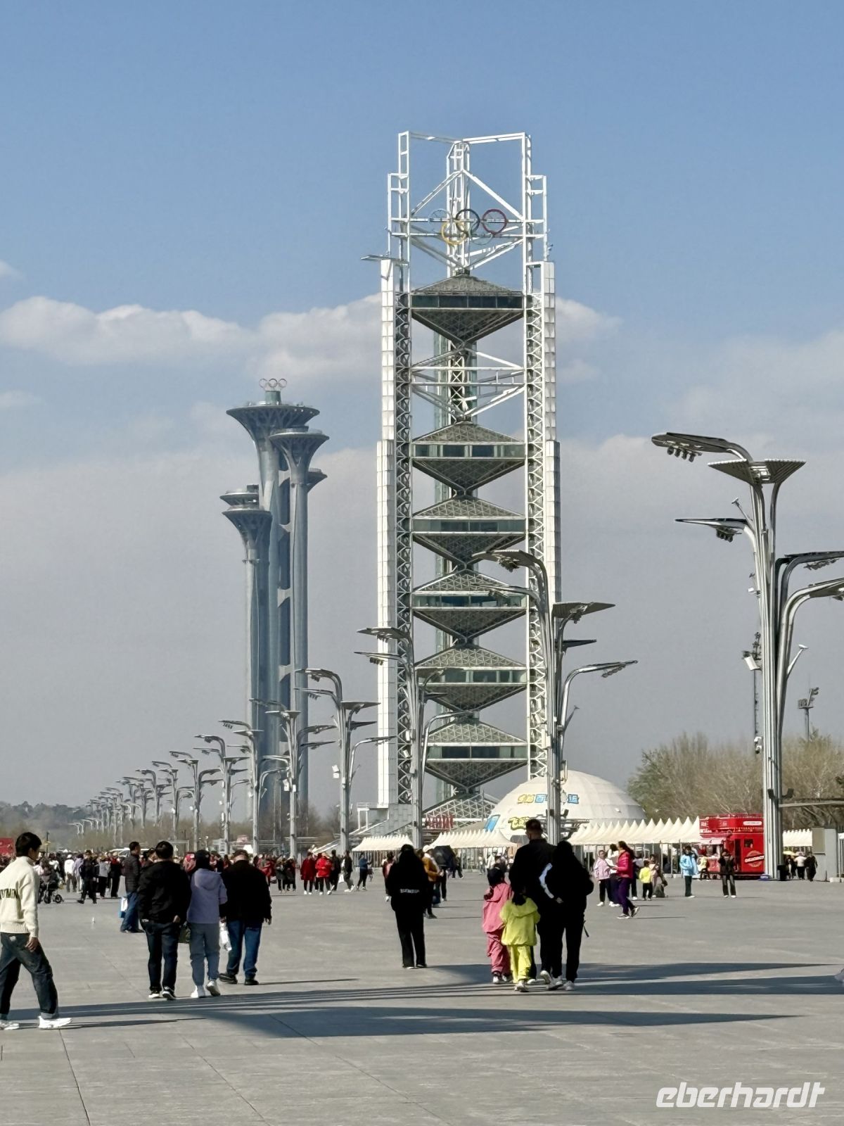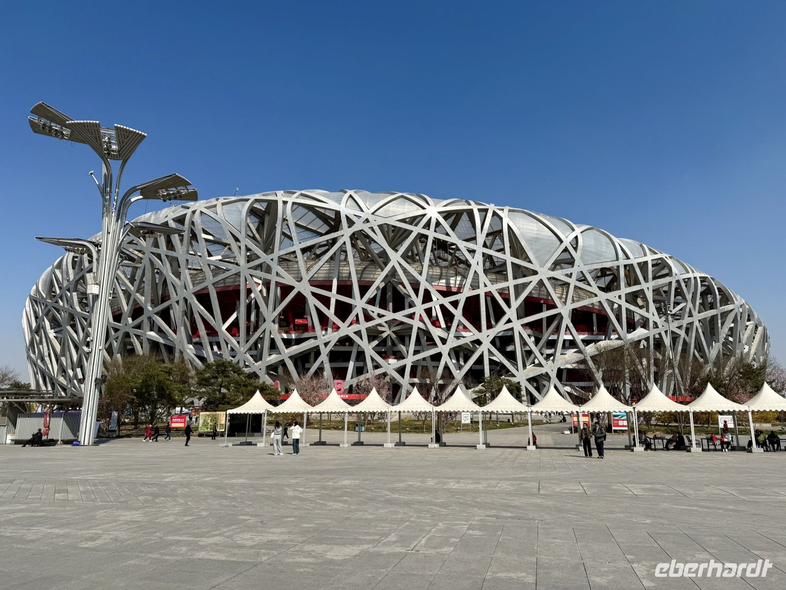 Im Anschluss führte uns unsere Fahrt zum Olympiapark von Peking, der für die Olympischen Sommerspiele 2008 und erneut für die Olympischen Winterspiele 2022 genutzt wurde. Das weitläufige Gelände beeindruckt vor allem durch seine moderne Architektur, allen voran das Nationalstadion — im Volksmund „Vogelnest“ genannt. Mit seiner markanten, geflechtartigen Stahlkonstruktion wurde es zu einem der bekanntesten Bauwerke des modernen Peking. Auch die olympische Flagge und der weiträumige Platz rund um das Stadion erinnerten an die bewegenden Momente der Spiele.