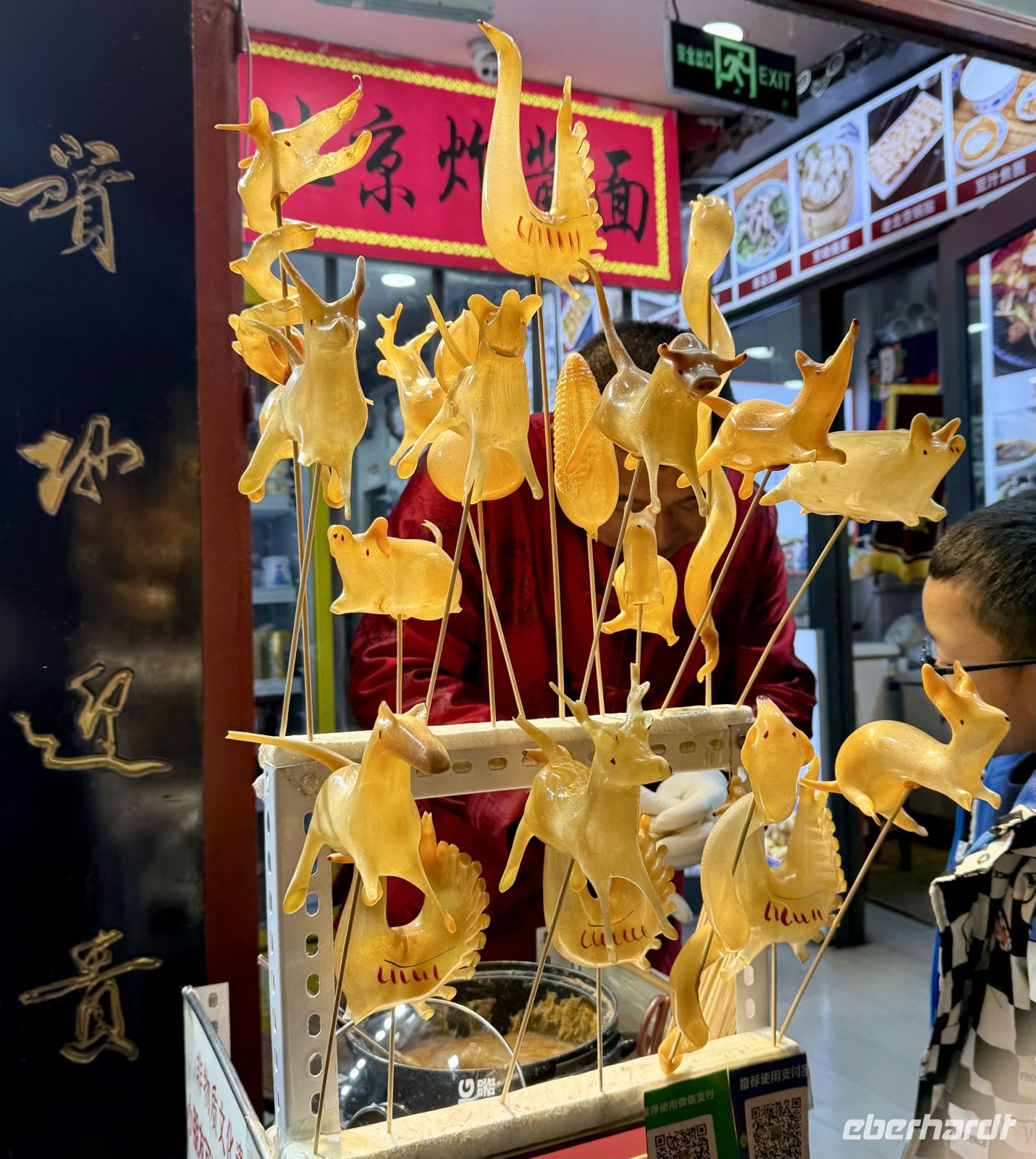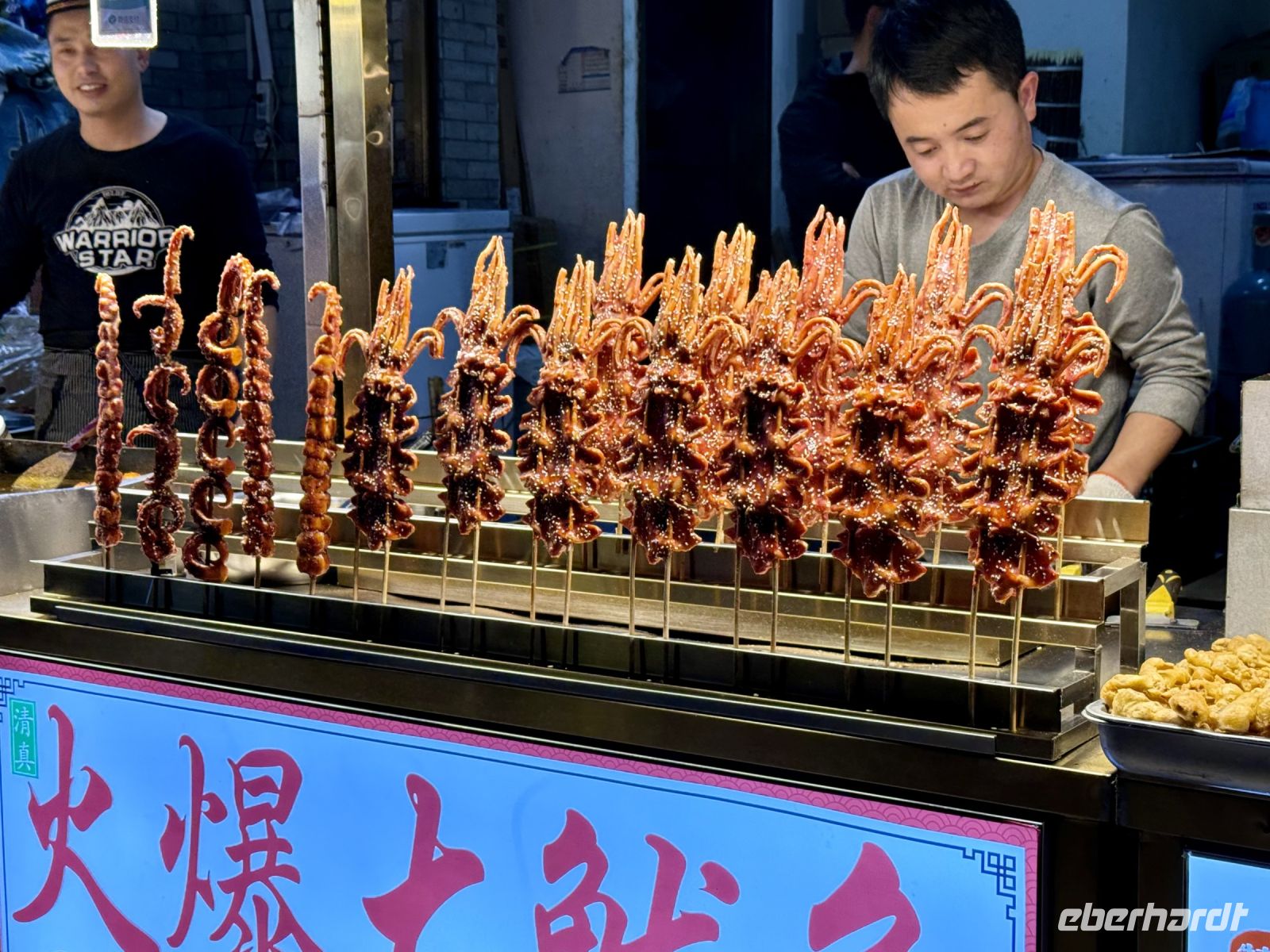 Natürlich ließen wir uns auch den Besuch des bekannten Nachtmarkts im Muslimischen Viertel nicht entgehen. Zwischen den quirligen Gassen reihte sich eine Garküche an die nächste, es duftete nach exotischen Gewürzen und frisch zubereiteten Spezialitäten. Neben Klassikern wie Lammspießen, Sesamfladenbrot, kandierten Früchten und handgezogenen Nudeln probierten einige von uns mutig auch lokale Leckereien, die man in Europa eher selten findet.