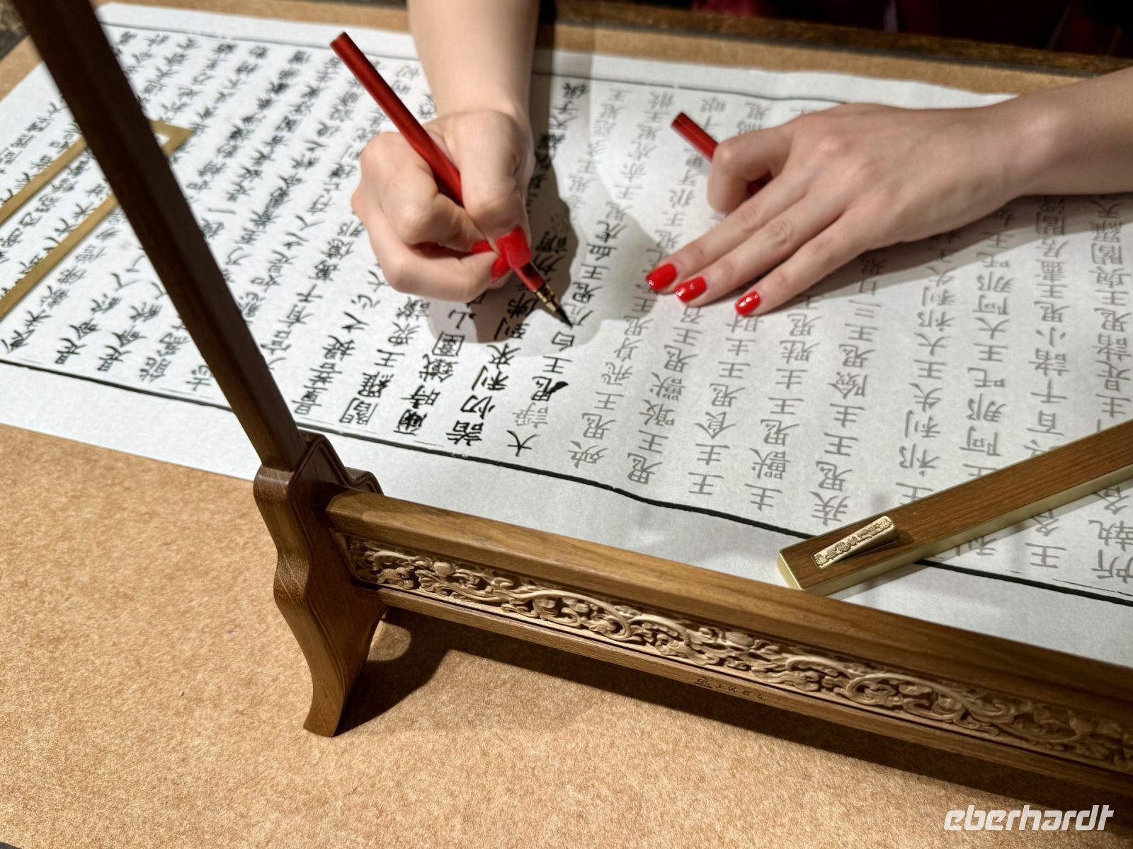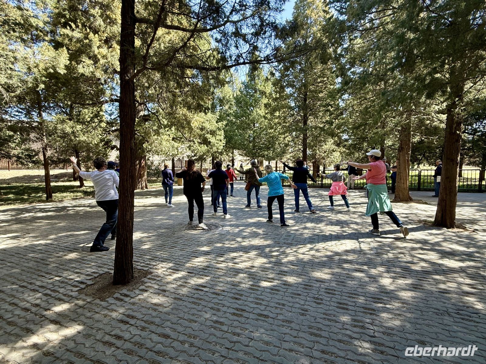 Nach der Besichtigung konnten wir uns selbst sportlich betätigen: Unsere Reiseleiterin Lin führte uns in die Kunst des traditionellen Schattenboxens, auch bekannt als Tai Chi, ein. Diese fließenden, meditativen Bewegungsabläufe, die Körper und Geist in Einklang bringen sollen, werden in China sowohl als Kampfsport als auch zur Förderung von Gesundheit und innerer Ruhe praktiziert. Unter freiem Himmel probierten wir einige der Grundtechniken aus — eine entspannende und gleichzeitig faszinierende Erfahrung.
