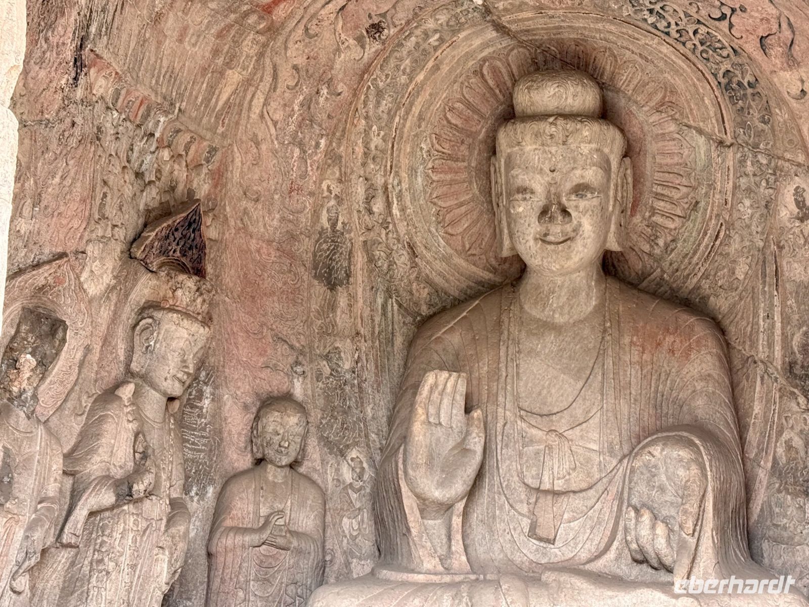 Bei strahlendem Sonnenschein starteten wir heute in Luoyang zu einem der kulturellen Höhepunkte der Region — den Drachentor-Grotten, im Chinesischen „Longmen-Grotten“ genannt. Diese beeindruckende UNESCO-Weltkulturerbestätte zählt zu den bedeutendsten buddhistischen Höhlentempeln Chinas. Die Grotten wurden ab dem späten 5. Jahrhundert in die Kalksteinfelsen entlang des Yi-Flusses gehauen und beherbergen heute über 100.000 Buddha-Statuen, die von wenigen Zentimetern bis zu monumentalen 17 Metern Höhe reichen. Die filigranen Schnitzereien und Statuen spiegeln eindrucksvoll die Entwicklung der chinesischen Steinmetzkunst sowie den kulturellen und religiösen Einfluss des Buddhismus wider.