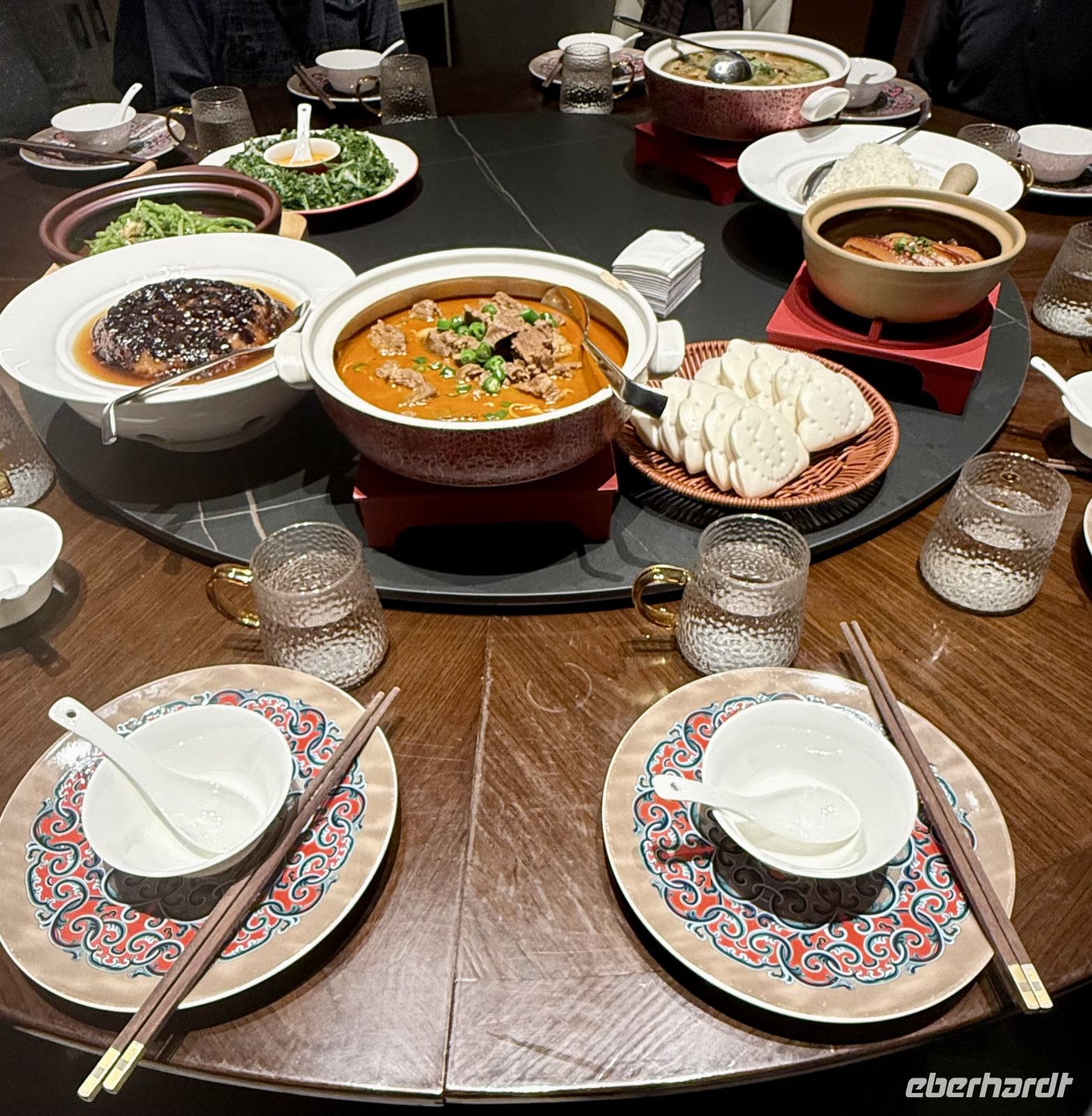 Am Abend bezogen wir unser Hotel und freuten uns auf ein gemeinsames Abendessen. In einem kleinen, traditionellen Restaurant in der Nähe kosteten wir eine bunte Auswahl chinesischer Spezialitäten: frischen Fisch, würzige Auberginen, duftenden Reis, zartes Hühnchen und Schweinefleisch süß-sauer, knusprig gebratenen Tofu, frittierte Pilze und aromatisches Rindfleisch. Dazu wurde klassischer grüner Tee gereicht, der in China zu jeder Mahlzeit gehört.