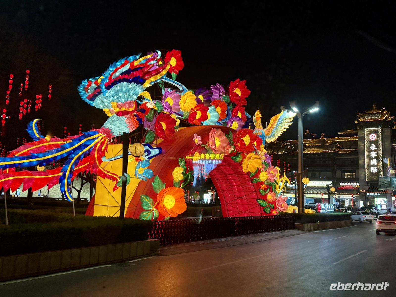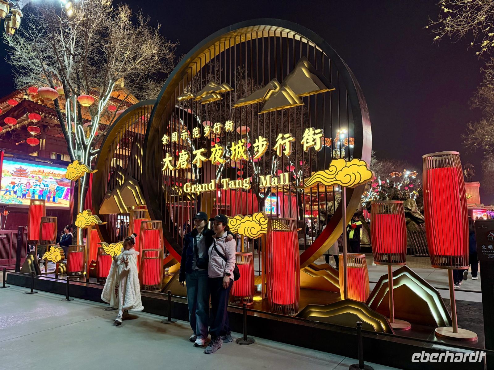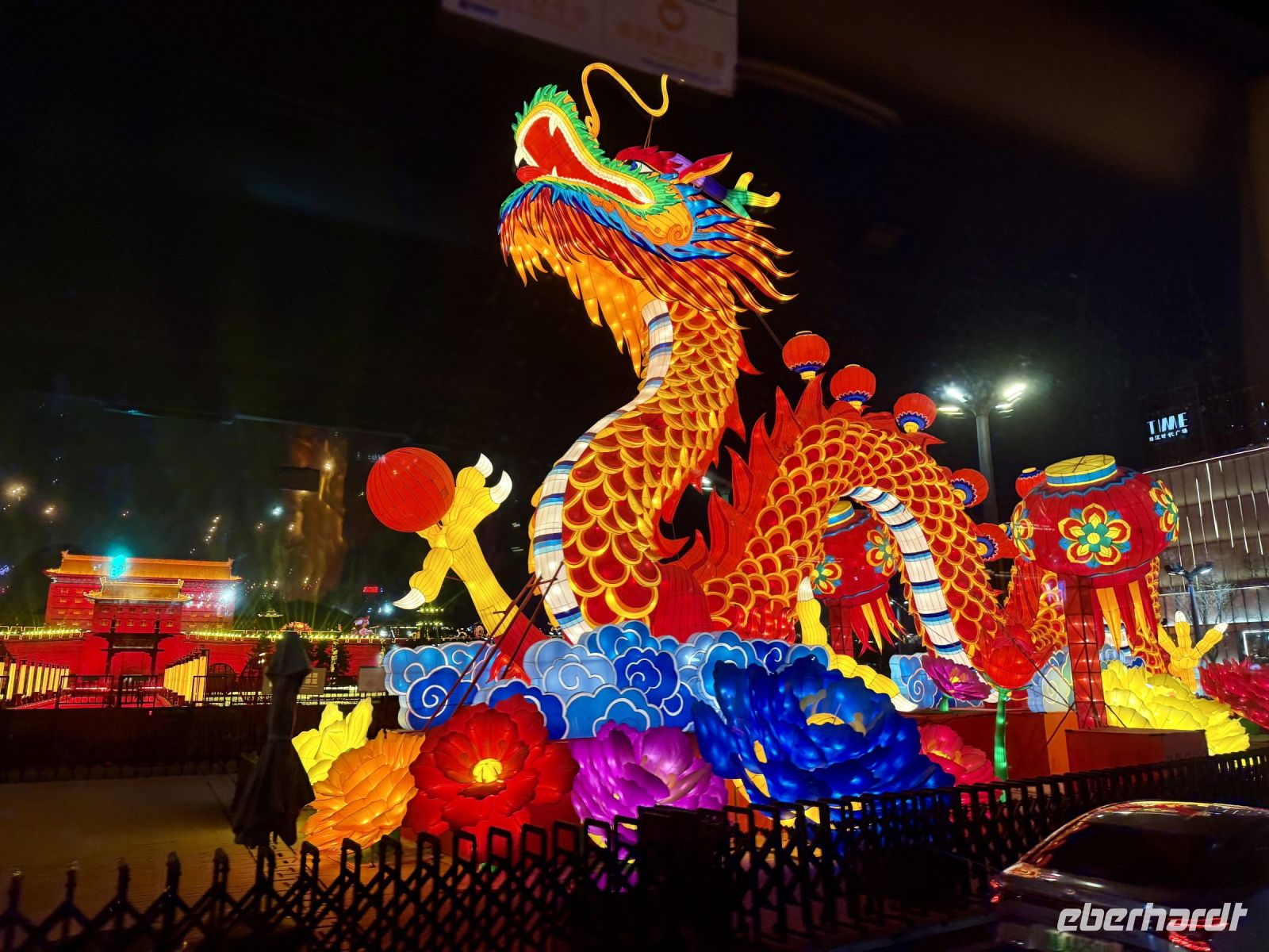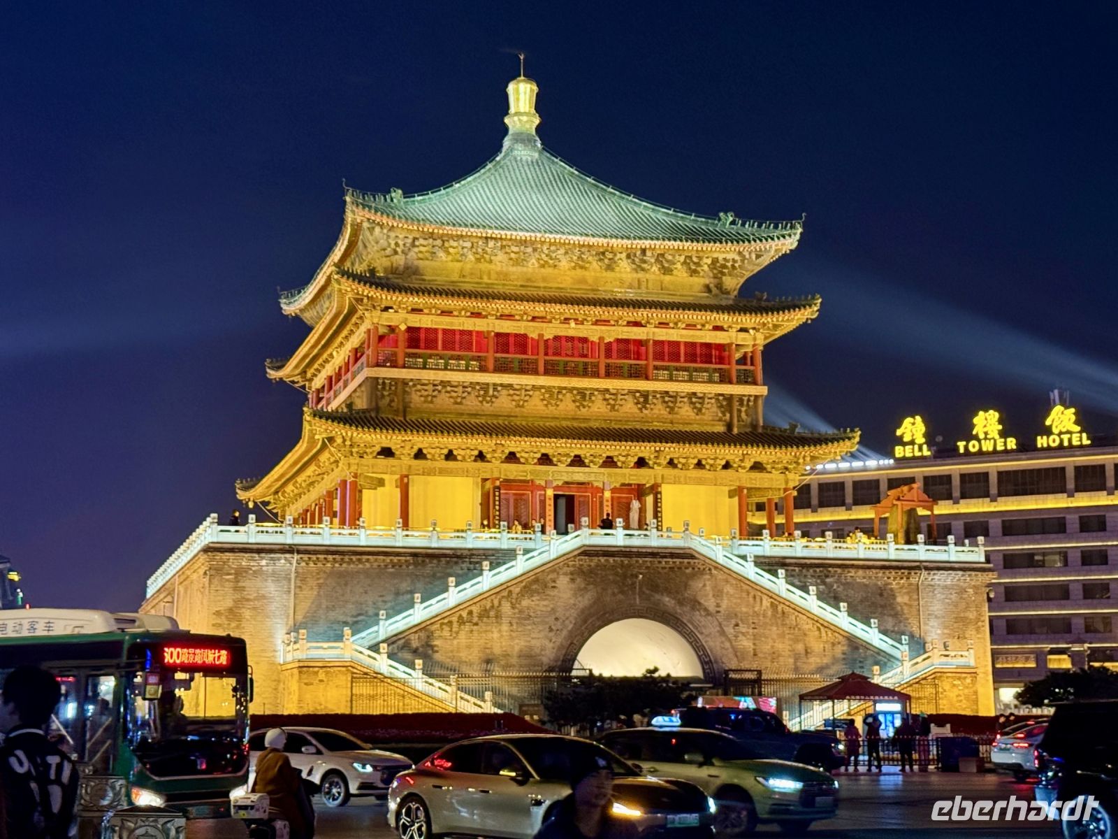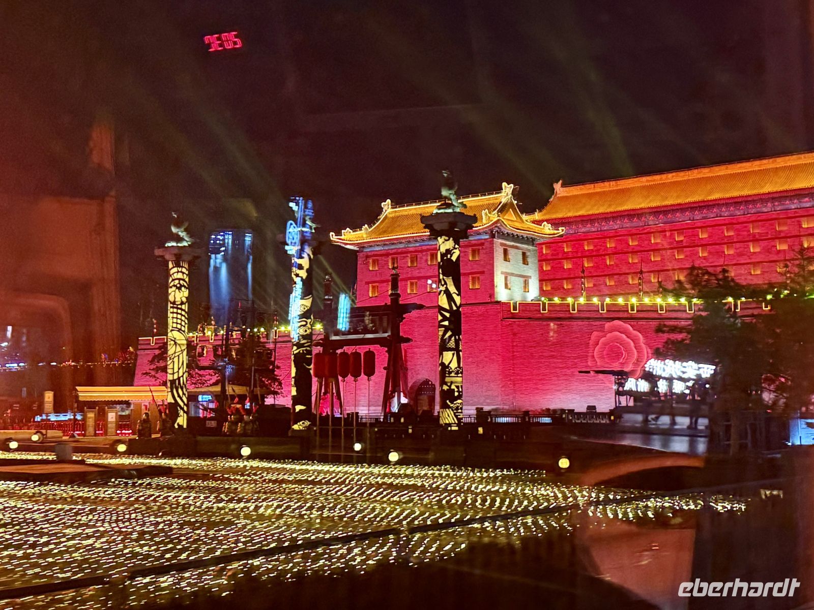 Nach einem ausgiebigen Abendessen wartete noch ein ganz besonderes Erlebnis auf uns: eine nächtliche Lichterfahrt durch Xi’an. Die Stadt, die tagsüber schon beeindruckend wirkte, offenbarte bei Nacht ihren ganz eigenen Zauber. Farbenfroh beleuchtete Stadtmauern, funkelnde Pagoden und modern inszenierte Lichtinstallationen verwandelten Xi’an in ein wahres Lichtermeer. Besonders die historische Stadtmauer, eine der am besten erhaltenen Stadtbefestigungen Chinas, wirkte im Schein der Beleuchtung noch majestätischer.