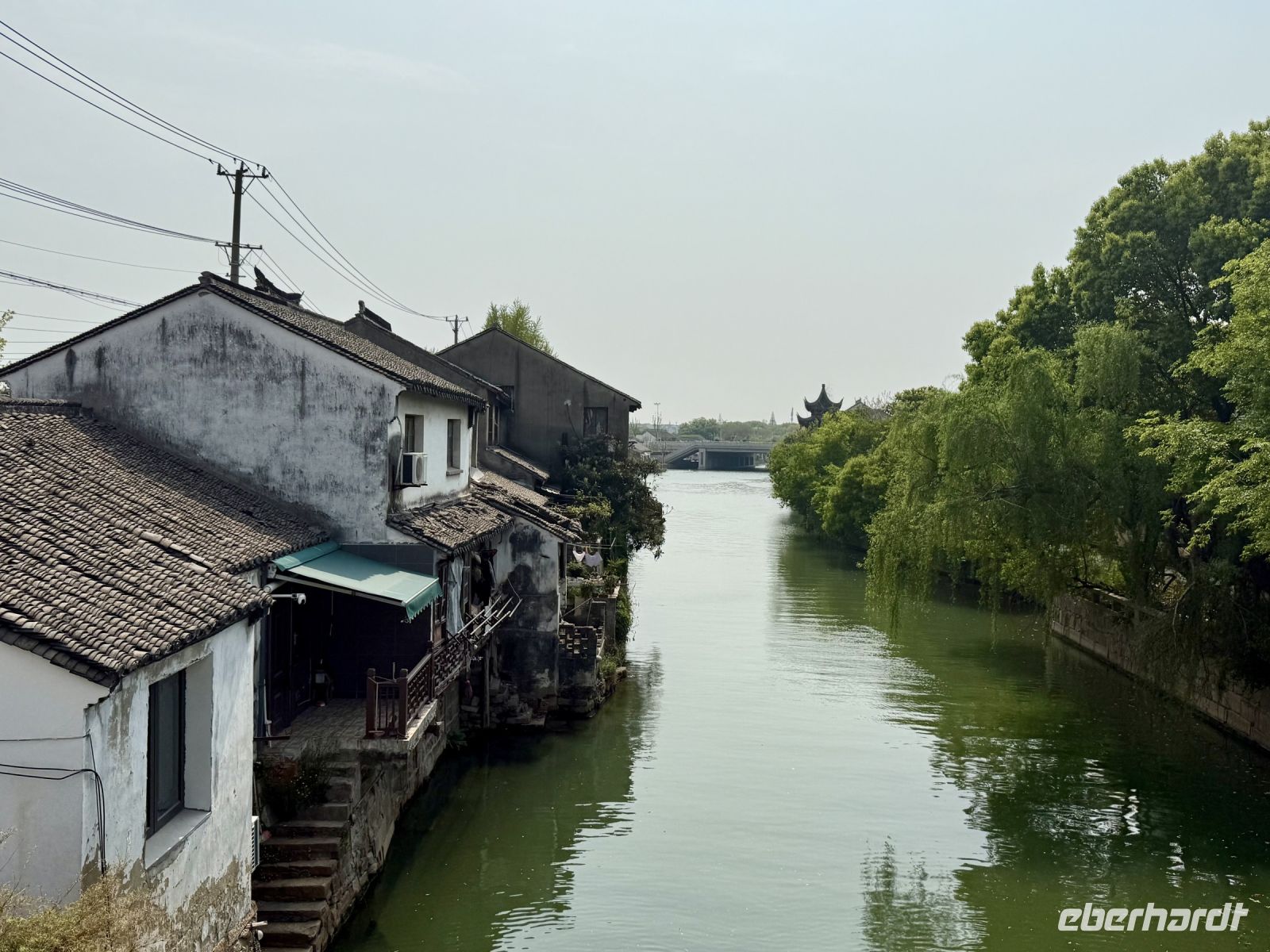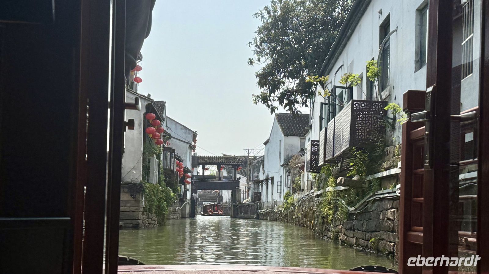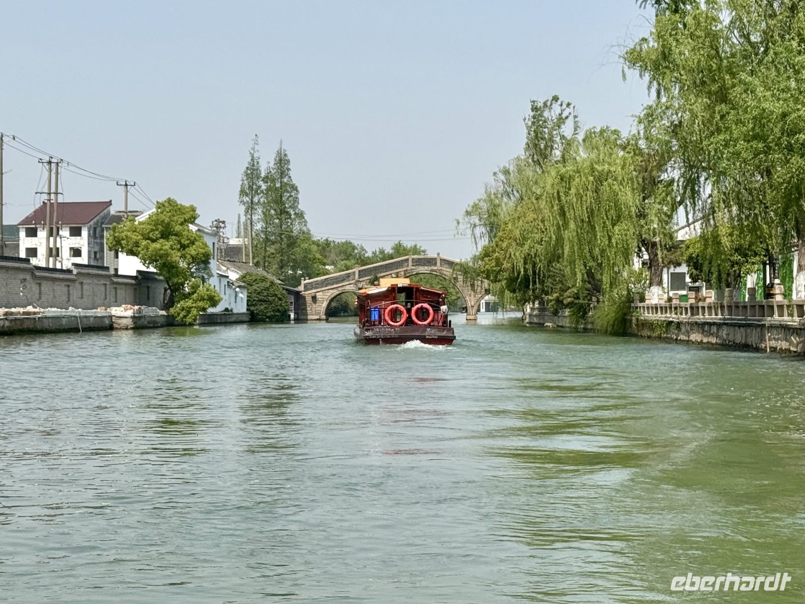 Doch bevor wir die pulsierende Weltstadt erreichten, stand noch ein ruhiger und beschaulicher Programmpunkt auf dem Plan: eine Bootsfahrt auf einem Nebenkanal des Kaiserkanals. Der Kaiserkanal — auch „Großer Kanal“ genannt — ist mit über 1.700 Kilometern die längste von Menschenhand geschaffene Wasserstraße der Welt und verbindet den Norden mit dem Süden Chinas, von Peking bis nach Hangzhou. Unser Abschnitt der Schifffahrt auf dem Nebenkanal umfasste 3,5 Kilometer, aber war dennoch ein wunderschönes Erlebnis. Bei einem gemütlichen Wasserstand von rund 3 Metern glitten wir vorbei an historischen Uferhäusern, kleinen Brücken und sahen dem ruhigen Leben der Einheimischen zu, die dort nach wie vor mit dem Wasser verbunden sind.