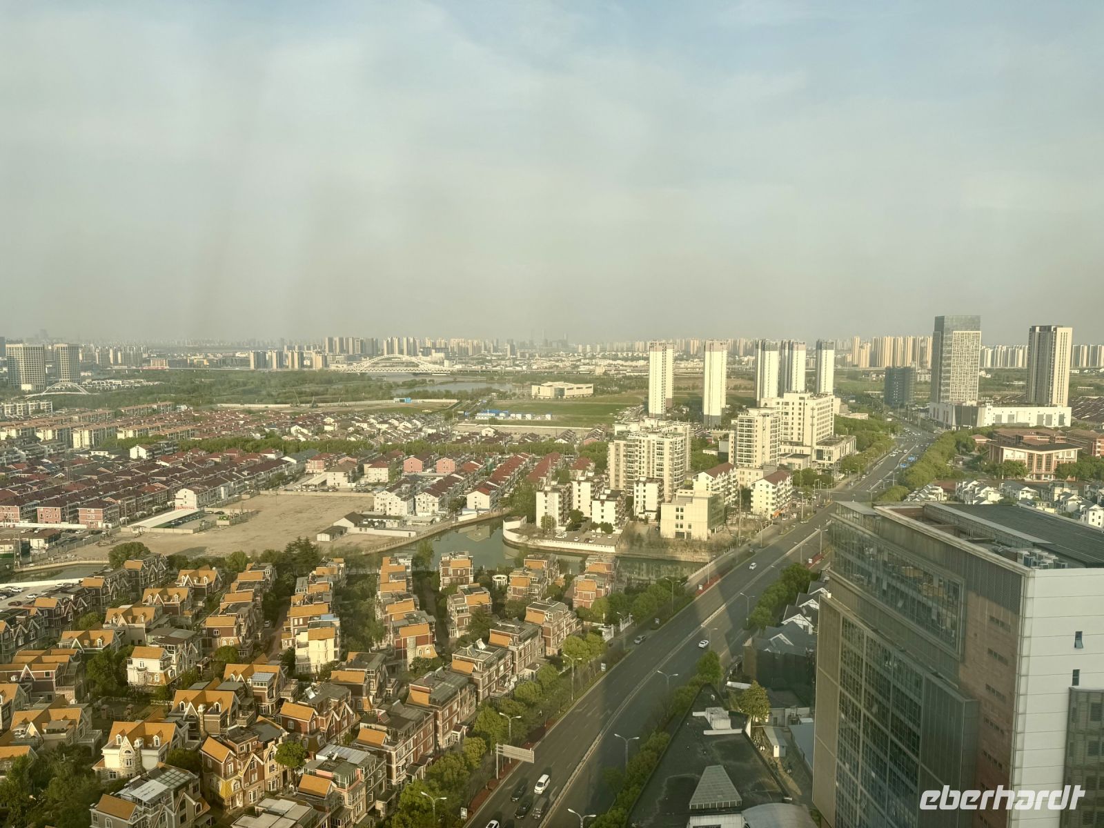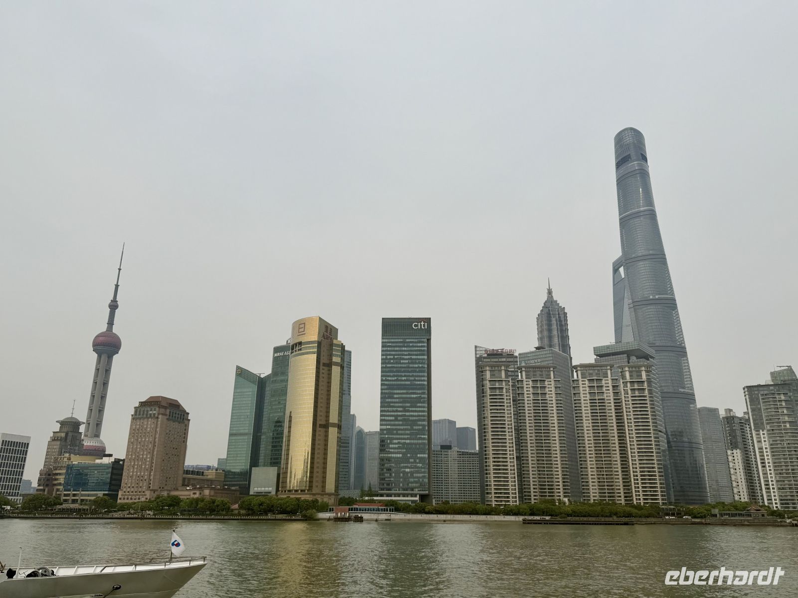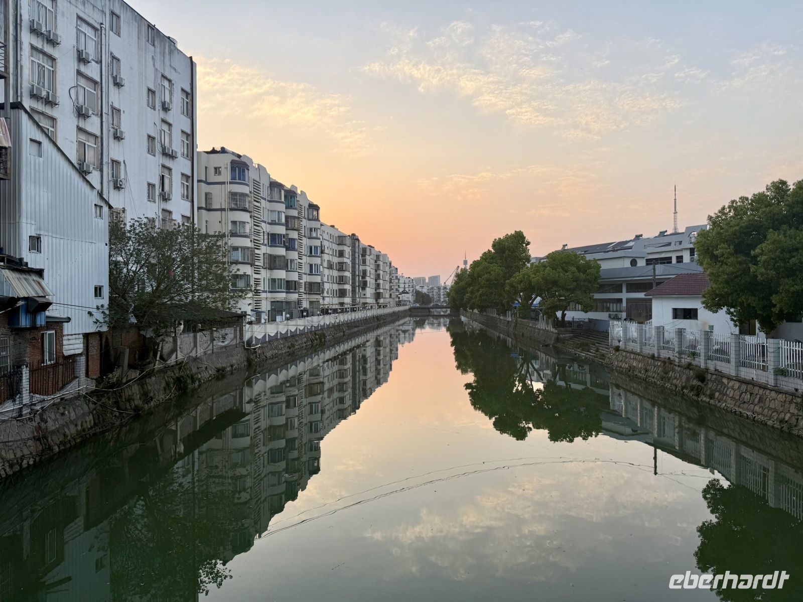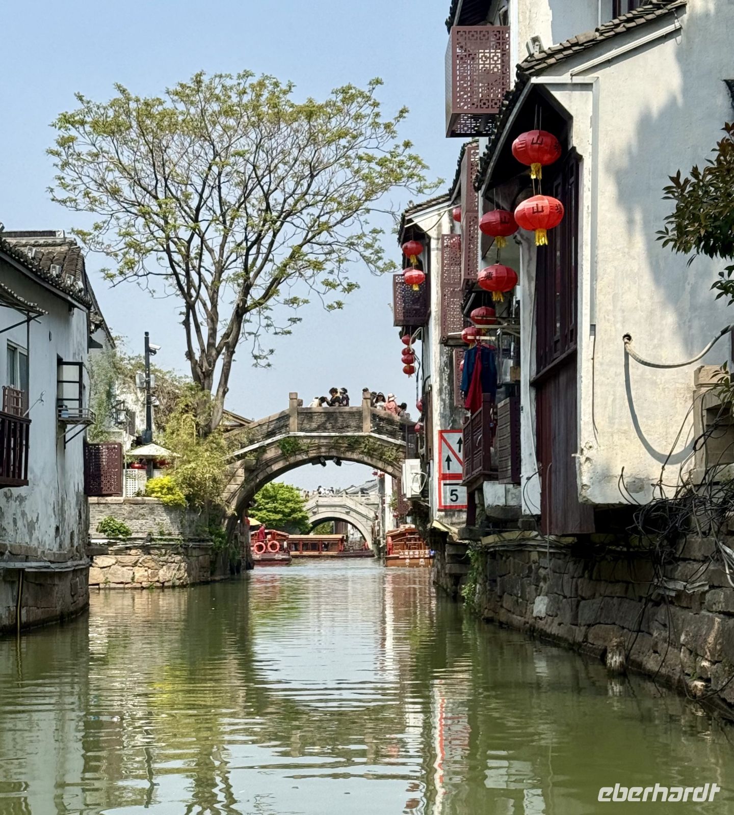 Doch bevor wir die pulsierende Weltstadt erreichten, stand noch ein ruhiger und beschaulicher Programmpunkt auf dem Plan: eine Bootsfahrt auf einem Nebenkanal des Kaiserkanals. Der Kaiserkanal — auch „Großer Kanal“ genannt — ist mit über 1.700 Kilometern die längste von Menschenhand geschaffene Wasserstraße der Welt und verbindet den Norden mit dem Süden Chinas, von Peking bis nach Hangzhou. Unser Abschnitt der Schifffahrt auf dem Nebenkanal umfasste 3,5 Kilometer, aber war dennoch ein wunderschönes Erlebnis. Bei einem gemütlichen Wasserstand von rund 3 Metern glitten wir vorbei an historischen Uferhäusern, kleinen Brücken und sahen dem ruhigen Leben der Einheimischen zu, die dort nach wie vor mit dem Wasser verbunden sind.