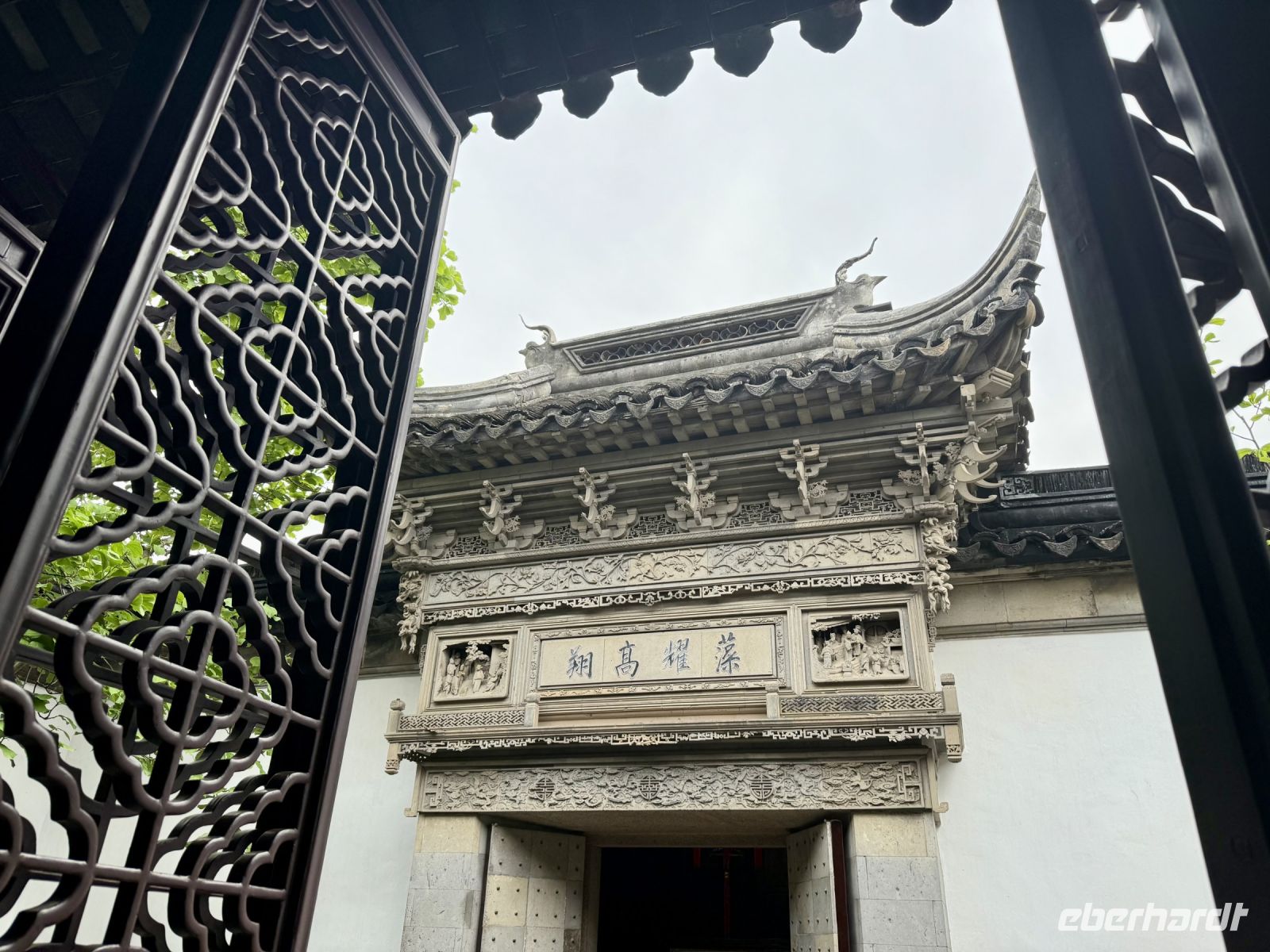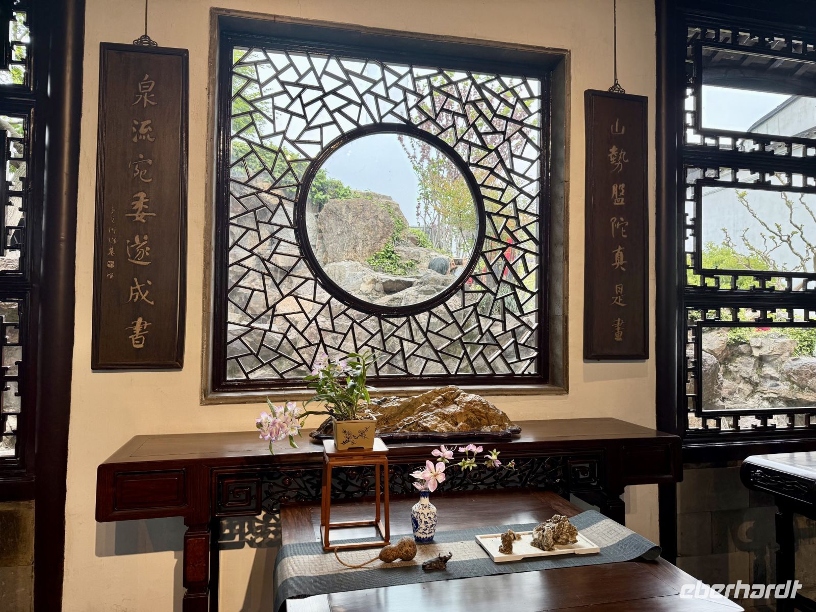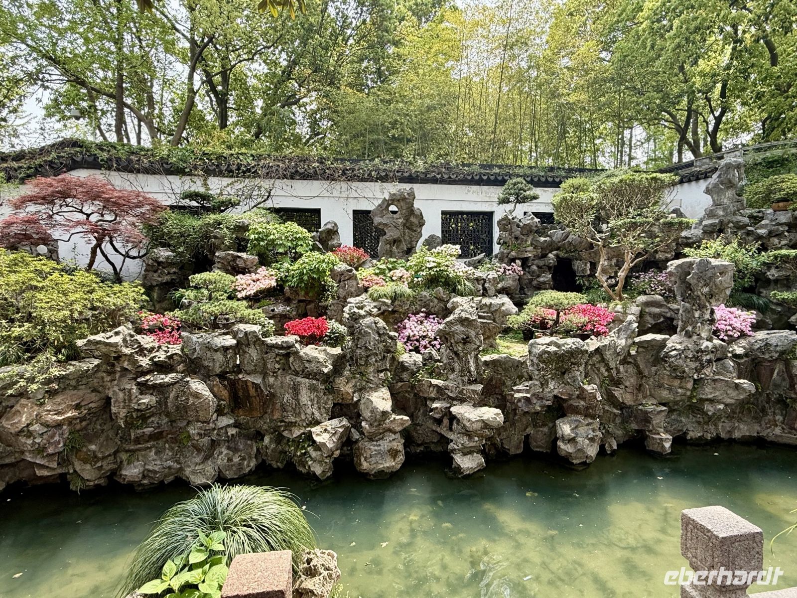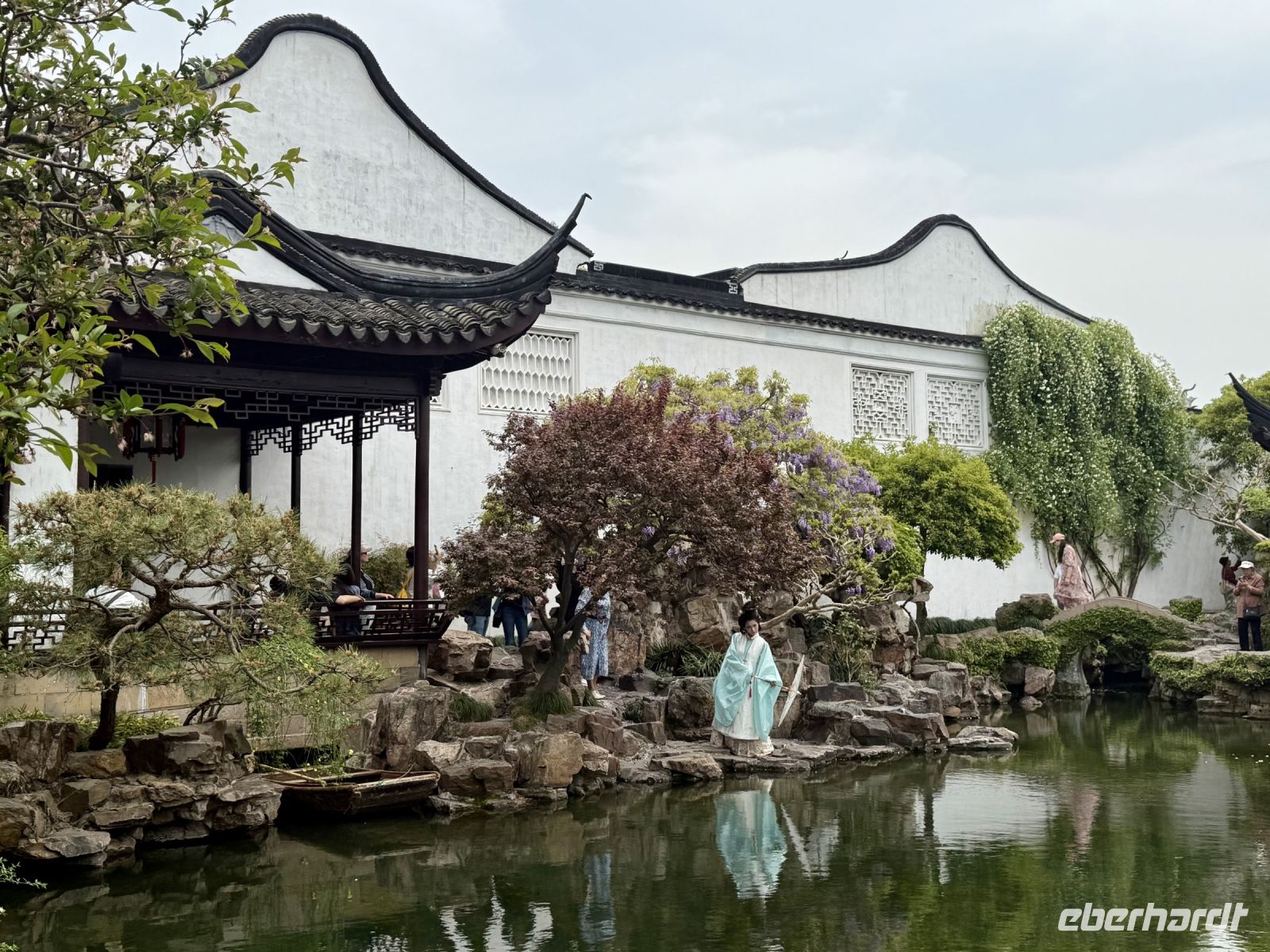 Nach dieser friedlichen Fahrt stand der nächste kulturelle Höhepunkt auf dem Programm: der Besuch des Gartens des Meisters der Fischernetze (chinesisch: Wangshi Yuan) in Suzhou. Dieser Garten gehört zu den bekanntesten Beispielen klassischer chinesischer Gartenkunst und wurde ursprünglich im 12. Jahrhundert während der Song-Dynastie angelegt. Der Garten ist zwar einer der kleineren Suzhou-Gärten, aber seine Gestaltung ist meisterhaft: Mit kunstvoll angelegten Teichen, Pavillons, verwinkelten Stegen und fein gearbeiteten Felsen vermittelt er auf kleinem Raum ein Gefühl von Weite, Harmonie und natürlicher Schönheit. Der Name stammt von der romantischen Vorstellung, dass sich ein pensionierter Beamter hier zur Ruhe setzte, um in beschaulicher Einfachheit als Fischer zu leben.