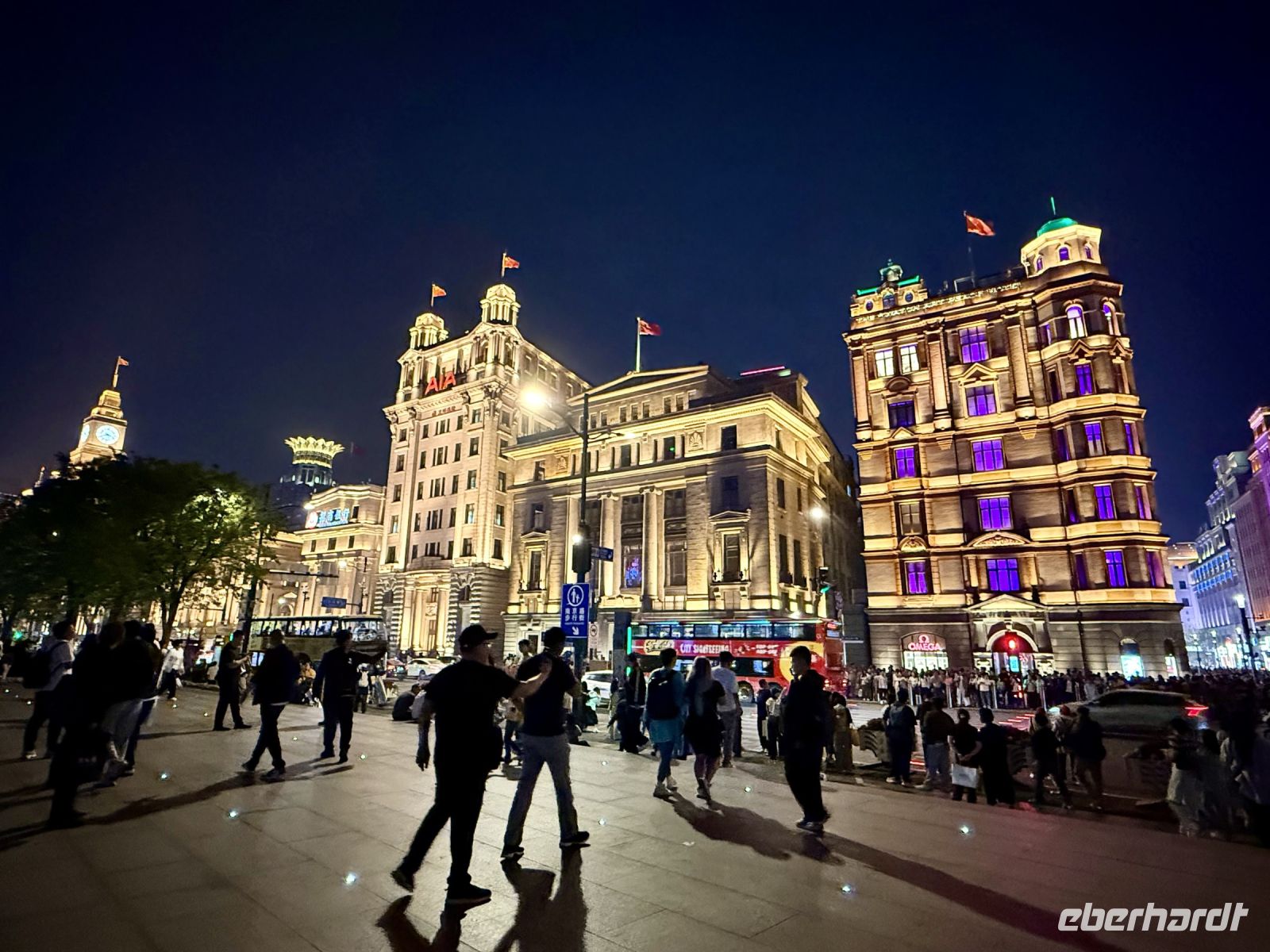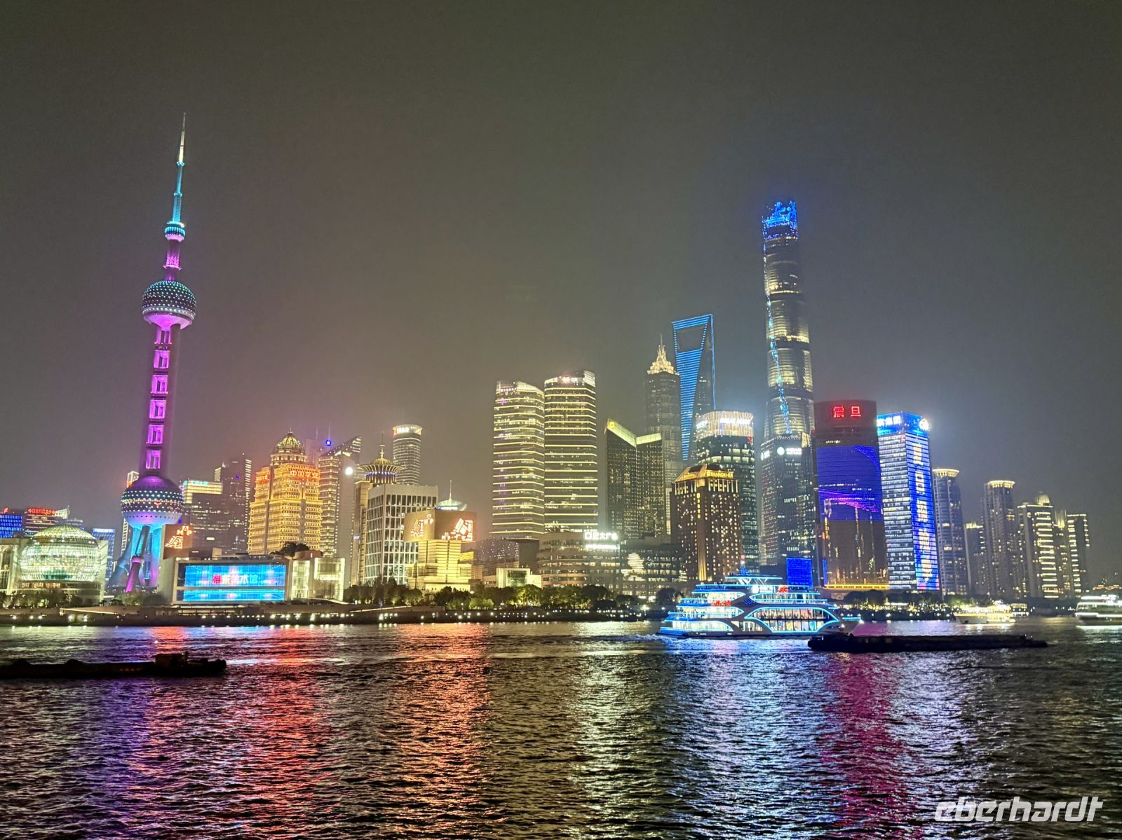 Anschließend ließen wir uns von der atemberaubenden Skyline von Shanghai verzaubern, die im Lichtermeer erstrahlte. Besonders der Blick auf den Stadtteil Pudong mit seinen ikonischen Bauwerken wie dem Shanghai Tower (632 m, zweithöchstes Gebäude der Welt) und dem berühmten Oriental Pearl Tower war ein echtes Highlight. Das Wechselspiel aus Neonlichtern, futuristischer Architektur und der spiegelglatten Wasseroberfläche des Huangpu-Flusses machte diesen Abend zu einem perfekten Abschluss.