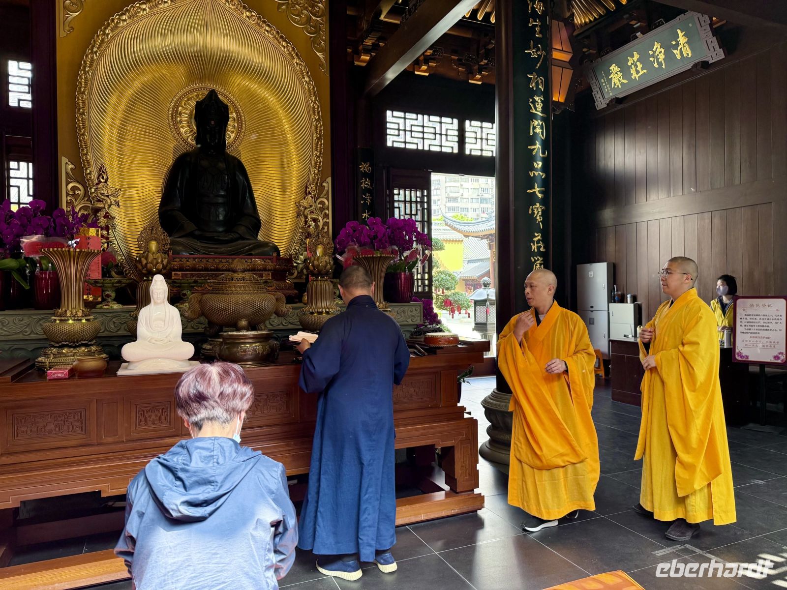 Unser erster Stopp an diesem Tag führte uns zum Jadebuddha-Tempel. Dieser berühmte buddhistische Tempel wurde im Jahr 1882 gegründet und zählt zu den bedeutendsten spirituellen Orten der Stadt. Besonders berühmt ist der Tempel für seine zwei Buddha-Statuen aus reiner weißer Jade, die im 19. Jahrhundert von einem chinesischen Mönch aus Myanmar nach China gebracht wurden. Die größere der beiden Statuen ist über 1,90 Meter hoch und zeigt Buddha in einer sitzenden Meditationshaltung, während die kleinere Figur Buddha liegend darstellt — ein Symbol für das Erreichen des Nirwanas. Die Atmosphäre im Tempel war ruhig und andächtig, der Duft von Räucherstäbchen erfüllte die Luft, und der Besuch war für viele von uns ein besinnlicher Abschluss unserer Begegnungen mit dem Buddhismus auf dieser Reise.