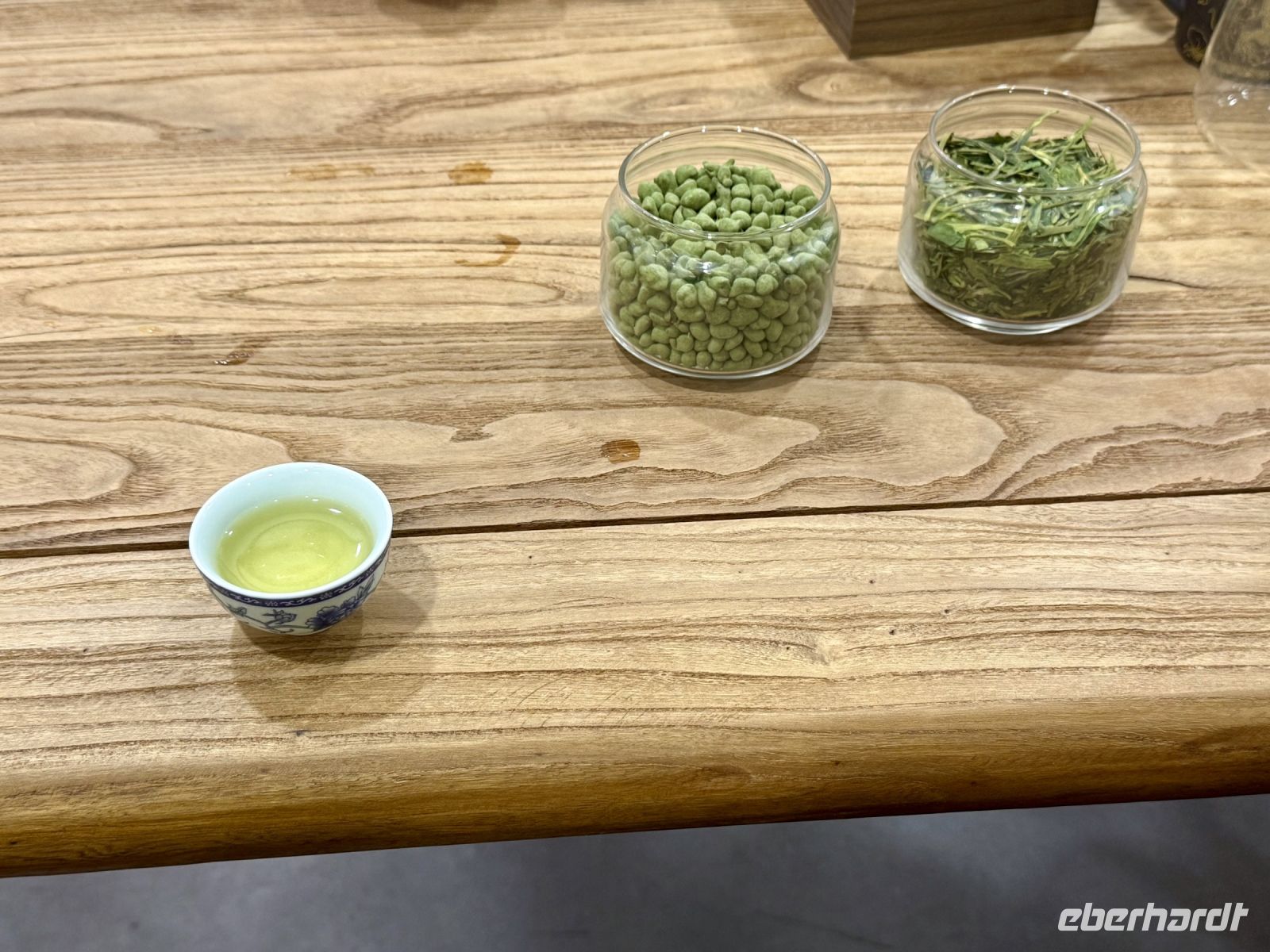 Direkt an der Brücke liegt das bekannte Huxing Ting Teehaus, ein wunderschönes Holzgebäude aus dem Jahr 1784, das auf Stelzen über dem Wasser thront. Es gilt als das älteste Teehaus Shanghais und war früher ein beliebter Treffpunkt von Kaufleuten, Dichtern und Künstlern. Auch heute noch laden die gemütlichen Räume dazu ein, verschiedene Teesorten zu kosten und das bunte Treiben rund um den Yu-Garten zu beobachten. Wir besuchten ganz in der Nähe ein weiteres traditionelles Teehaus und tauchten dort noch tiefer in die jahrhundertealte chinesische Teekultur ein. Die Atmosphäre war ruhig und einladend, der Raum liebevoll dekoriert mit filigranen Teetischen, Bambusmöbeln und den typischen Porzellankännchen, die kunstvoll aufgereiht bereitstanden. Eine Teemeisterin erklärte uns geduldig die verschiedenen Schritte der Zubereitung, angefangen bei der Auswahl des passenden Tees — von aromatischem Oolong über den klassischen grünen Tee. Sie zeigte uns, wie wichtig es ist, das Wasser auf die richtige Temperatur zu erhitzen, da jeder Tee eine andere Wassertemperatur benötigt, um sein volles Aroma zu entfalten. Auch die Ziehzeit spielte eine entscheidende Rolle: Zu lange und der Tee wird bitter, zu kurz und er entfaltet nicht seinen vollen Geschmack. Mit geübten Handgriffen wurde das Teegeschirr gespült und vorgewärmt, bevor die duftenden Teeblätter in die kleine Kanne gefüllt wurden. Die Teemeisterin goss das heiße Wasser über die Blätter, ließ sie nur kurz ziehen und schenkte uns dann die erste Runde in winzige Tassen ein. Während wir den Tee probierten, erklärte sie uns die geschmacklichen Unterschiede der einzelnen Sorten. Neben dem reinen Genuss lernten wir auch, dass Tee in China mehr ist als ein Getränk — er ist ein Ausdruck von Gastfreundschaft, Achtsamkeit und Respekt. Teezeremonien gelten hier als kleine Kunstform, die Ruhe und innere Harmonie vermitteln soll. Es war beeindruckend zu sehen, mit welcher Hingabe und Präzision die Zubereitung ablief, und wir spürten, dass in dieser simplen Handlung eine tiefe kulturelle Bedeutung verborgen liegt. Zum Abschluss durften wir selbst verschiedene Teesorten verkosten und uns sogar ein paar kleine Kostproben für Zuhause aussuchen — ein schönes Andenken an diesen lehrreichen und entspannenden Besuch.