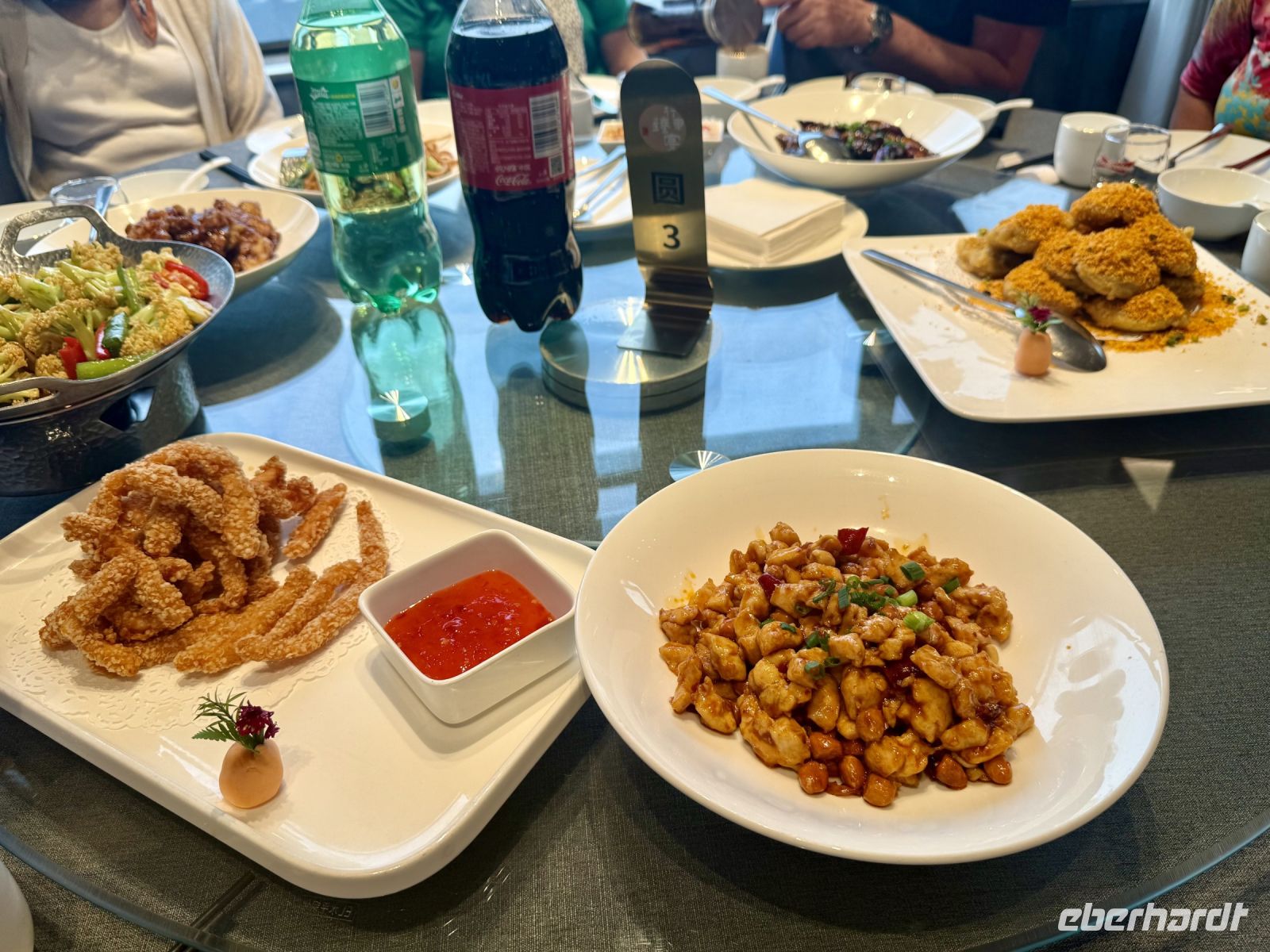 Zum Abendessen wartete dann noch ein besonderes kulinarisches Abenteuer auf uns: Die besonders Mutigen wagten sich an eine der ungewöhnlichsten chinesischen Spezialitäten — die sogenannten 100-jährigen Eier, auch „Pidan“ genannt. Diese schwarz-grünen Eier sehen auf den ersten Blick gewöhnungsbedürftig aus, sind aber in der chinesischen Küche eine echte Delikatesse. Entgegen ihrem Namen sind sie natürlich nicht wirklich 100 Jahre alt, sondern etwa einige Wochen bis Monate gereift, wobei die Eier durch ein spezielles Verfahren mit Kalk, Asche, Tee, Salz und Lehm konserviert werden. Dadurch erhalten sie ihre charakteristische dunkle Farbe, eine geleeartige Konsistenz und ein intensives, leicht erdiges Aroma. Wer es noch abenteuerlicher mochte, konnte auch Hühnerfüße probieren, die in China als Snack und Vorspeise sehr beliebt sind — meist gewürzt, mariniert oder in Sojasauce und Gewürzen geschmort.