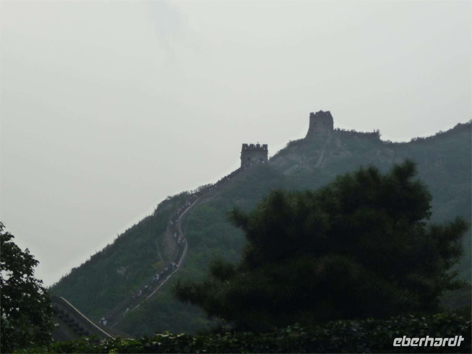 Zunächst spazieren wir entlang der Geisterallee mit den steinernen Figuren, bevor wir eines der Ming-Gräber besichtigen. Heute scheint die Sonne und es ist sehr warm, weshalb wir alle ein wenig zu kämpfen haben. Eigentlich sollte die Fahrt zur Großen Mauer danach nur etwa 30 Minuten dauern, aber wir geraten leider in einen großen Stau gekommen - wie so oft während dieser Reise. Wir haben schon Angst, dass wir die Mauer vielleicht gar nicht mehr besuchen können. Doch wir schaffen es noch und verzichten dann lieber auf den Mittagsimbiss und steigen gleich die steilen Stufen hinauf.