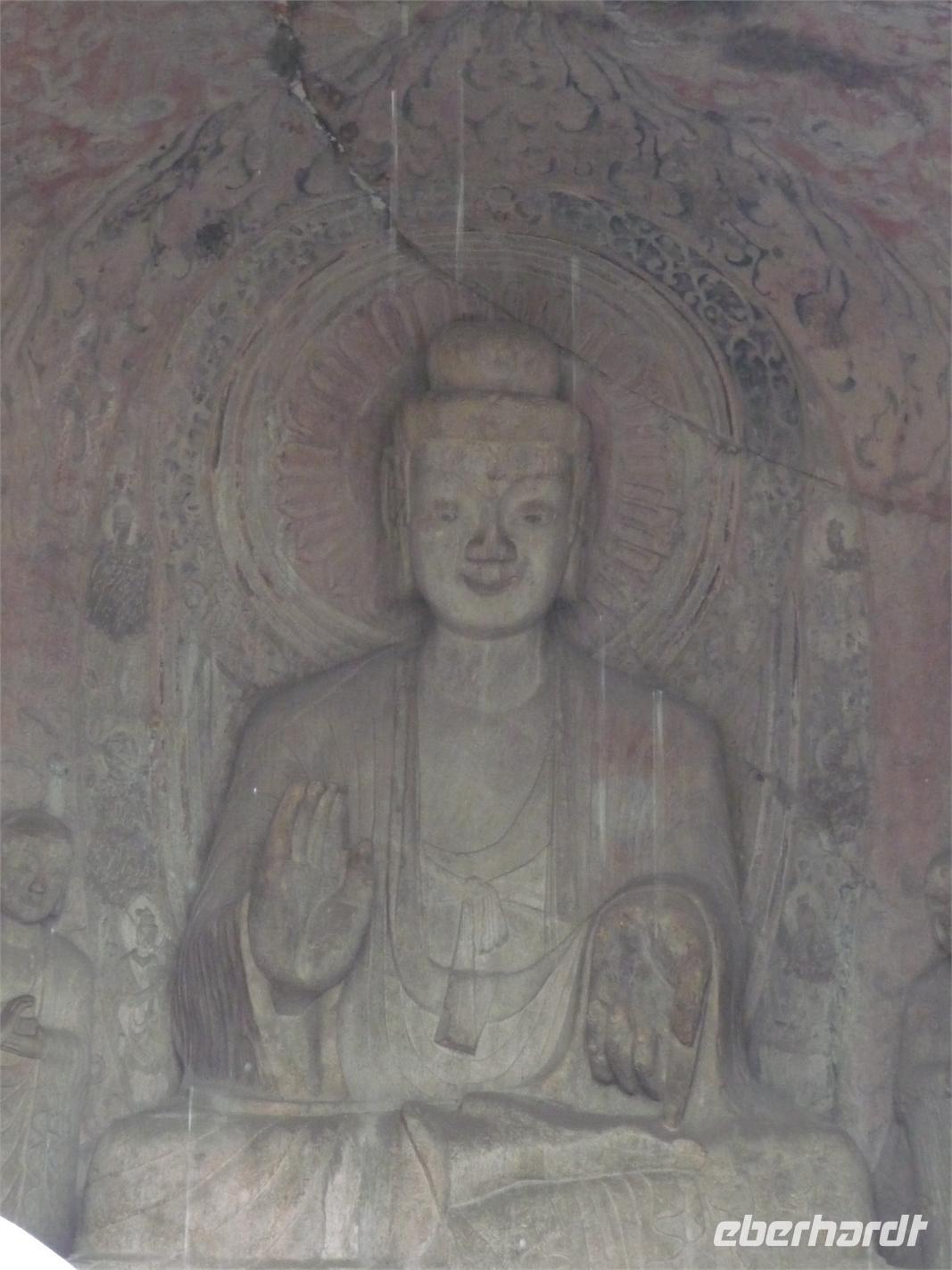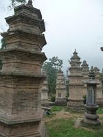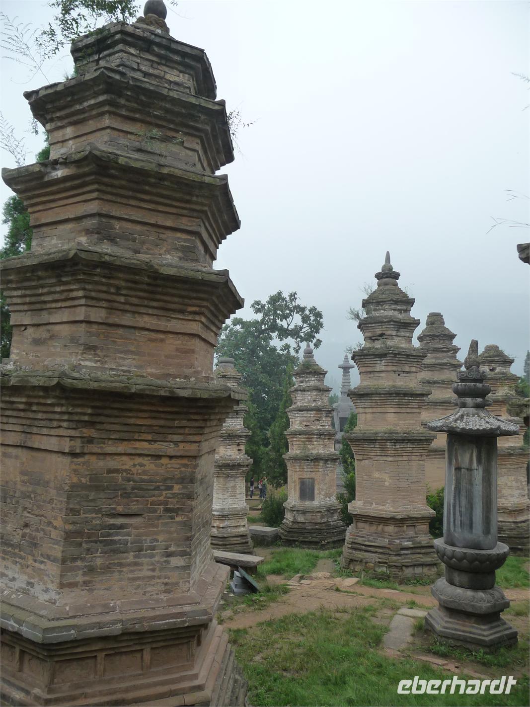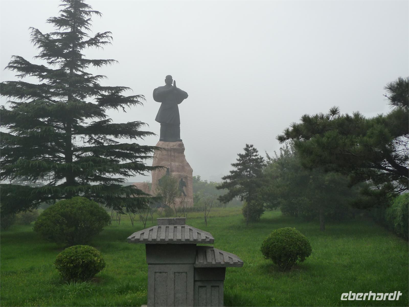 Nach einer relativ kurzen Nacht mit wenig Schlaf erreichen wir gegen 07:00 Uhr am Morgen Luoyang. Leider gibt es hier keine Rolltreppen oder Fahrstühle, da der Bahnhof schon etwas älter ist. So müssen wir unser Gepäck selbst zum Bus tragen. Glücklicherweise fahren wir erst einmal zum Hotel, können dort frühstücken und auch schon unsere Zimmer beziehen und uns frisch machen - nach solch einer Nacht dringend nötig. Nach dieser Pause fahren wir in die Berge der Provinz Henan und besichtigen die heiligen Hallen und den Pagoden-Gräberwald des Shaolinklosters. Der Nebel, der sich zwischen den Bergen festegesetzt hat, verbreitet eine mystische Stimmung.